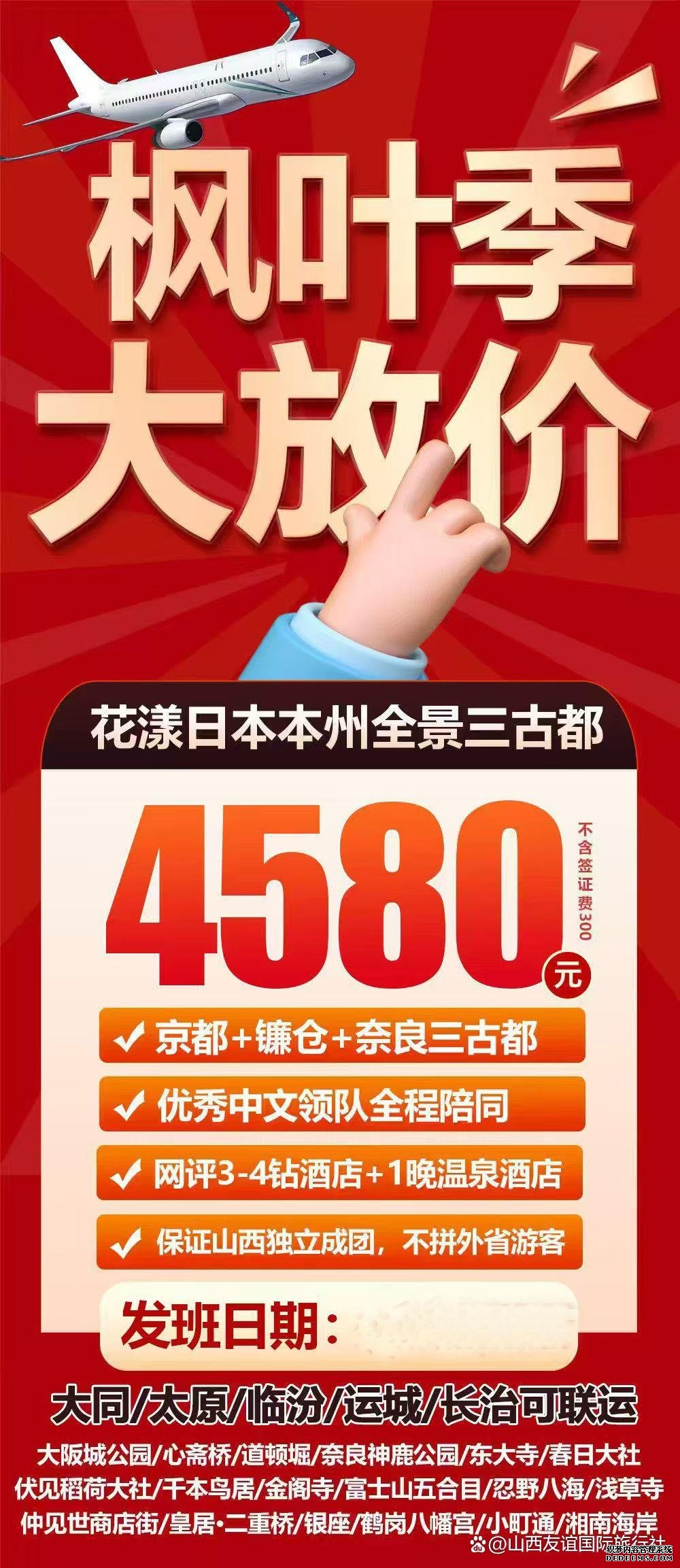 ![]() 花漾日本本州全景太原出发(三古都版) (11月9/15/23/27日,12月电询) ![]() ![]() 山西友谊旅行社 山西本土大型旅行社 ![]() 打开百度APP 立即扫码下载 日本7日游具体行程安排: D1:太原-上海-名古屋 参考航班: 太原——上海 MU2402 07:30——09:40 上海——名古屋 MU719 12:30——16:00(15/23/27号)/MU291 17:25——20:50 早上于指定地点集合搭乘国际航班飞往中部国际机场,抵达后前往酒店办理入住。 早:自理 中:自理 晚:自理 住:中部地区酒店 D2 奈良——大阪 【奈良神鹿公园】(赏枫景点)占地5.25平方公里,范围之大,堪称世界上数一数二的大公园。奈良的所有名胜古迹都在这座公园范围内。公园内巨树丛立,还有历史悠久的古迹、花草、山林及岩石等;另有驯鹿成群,共有1,200多只,散布于山间、林下或寺庙的池畔,是奈良观光的象征。(因枫叶景观受环境影响,如达不到观赏效果请见谅。) 【东大寺】东大寺位于奈良公园北侧,又称大华严寺,于728年由信奉佛教的圣武天皇建立,是日本华严宗大本山,被列入了世界文化遗产。东大寺的大佛殿是世界上大的木造古建筑,殿内供奉着一座约16米高的卢舍那佛像,日本三大佛之一。作为奈良的地标性景点,这里旅行团和来自日本各地的学生络绎不绝。 【春日大社】春日大社是日本神道教的宗教参拜场所,建立于710年,已经被列入世界文化遗产的名录。它供奉的是藤原家的四位守护神灵,如今是全日本重要的祭祀场所。整个神社依靠在春日山山脚下,周围被苍翠秀丽的植被所环抱着,春日山向来禁止砍伐,因此这里的一切都显得自然而古意。 【大阪城公园】(不登城)(赏枫景点)历史悠久的大阪城,系丰臣秀吉于1586年所建,是由雄伟的石墙砌造而成,大阪城公园内城中央耸立着大阪城的主体建筑天守阁,巍峨宏伟,镶铜镀金,十分壮观。登上高五层八阶的天守阁,可以瞭望整个大阪市。如今大阪城已被定为特别史迹。城内的历史博物馆里保存有丰臣秀吉的木像、武器和美术作品等。在西之丸庭园,有一片宽阔的草原和曾遭祝融烧毁并再度重建的外堀、太平门等古迹,是散步休闲大阪城公园的好去处。(因枫叶景观受环境影响,如达不到观赏效果请见谅。) 【抹茶体验】茶道传到日本,并逐渐本土化,到了室町时代中期,足利幕府将军义政的时代,一休禅师的弟子村田珠光在修业期间,悟出了佛法诸像也可从日常茶饭中的茶汤作法中求得,参悟茶禅一味。将茶汤改为“茶之汤”,这便是日本茶道的开始。茶道现在是日本的传统文化代表之一,也是日本传统的表演艺术。 【心斋桥】心斋桥作为大阪的购物区,集中了许多精品屋和专卖店,从早到晚熙熙攘攘,到处是市 民和游客的人流。心斋桥是以带有拱廊设施的心斋桥筋商店街为中心发展起来的。这里大型百货店、百 年老铺、面向平民的各种小店铺鳞次栉比。石板铺就的人行道、英国风格的路灯和成排砖造建筑物的周 防町筋,格调高雅,这一带被人称为欧洲村。 【道顿堀】大阪美食的代表地点。在这里各种美食的招牌每天都招来川流不息的人潮,有名的大螃 蟹招牌更是道顿崛美食街的标志,尤其是当夜晚来临,闪烁的霓虹灯更是诱人。许多著名的小吃像金龙 拉面、章鱼烧、回转寿司、河豚肉等在这都可以吃到。 早:酒店内 中:自理 晚:自理 住:大阪地区酒店 D3:京都 【金阁寺】金阁寺本名是鹿苑寺,由于寺内核心建筑舍利殿的外墙全部贴以金箔装饰,故昵称为“金阁寺”。寺院始建于1397年,原为足利义满将军(即动画《聪明的一休》中利将军的原型)的山庄。 【岚山渡月桥】(赏枫景点)渡月桥别名岚桥,横跨在京都岚山的大堰川上,全长155米,据说是空海的弟子道昌于日本平安时代初期的836年(日本承和三年)整修大堰川时所建。秋季时,在红叶陪衬下的渡月桥融入岚山景致,成为代表京都的明媚景色。以渡月桥为分界,上流称为大堰川,下流则称桂川,是昔日平安都城的贵族们乘舟戏水、欣赏枫叶的热门景点,细致优雅的水流至今不断。此外,享誉全日本、流传千年的捕鱼技巧“鹈饲捕鱼”也在渡月桥附近举行,是每年7月至9月中旬的热门表演。在桥上还可赏岚山四季美景。(因枫叶景观受环境影响,如达不到观赏效果请见谅。) 【嵯峨野竹林】京都嵯峨野位于岚山北方,盘踞在优美的小仓山东麓,曾经是皇室的别墅所在地。竹林与小篱笆环绕的小径十分典雅迷人,从野宫神社到化野念佛寺之间的小径上,有常寂光寺、落柿舍、大觉寺、二尊院等坐落其间,气氛宁静幽雅。 早:酒店内 中:自理 晚:含 住:中部地区酒店 D4 富士山 【富士山五合目】美丽的富士山是日本的象征,海拔3776米,是日本的高山峰,日本人奉它为圣岳、不二山,多少年来一直是日本文学家、艺术家们讴歌的主题。在日本,人们认为登上富士山顶是英雄,这和中国的不到长城非好汉遥相呼应。(如因天气原因未能上五合目,则改为一合目,敬请谅解!) 【忍野八海】是富士山融化的雪水经流经地层过滤而成的八个清澈的淡泉水:御釜池、底无池、 铫子池、浊池、涌池、镜池、菖蒲池和出口池。忍野八海的平均水温约摄氏 13 度,水质清冽甘 甜,被誉为“ 日本九寨沟 ”,是忍野地区指定的国家自然风景区,1985 年入选“ 日本名水百选 ”。 为国家指定天然记念物、名水百选、新富岳百景之一。 【河口湖枫叶回廊】(赏枫景点)河口湖约有400-500颗枫叶树,河口湖