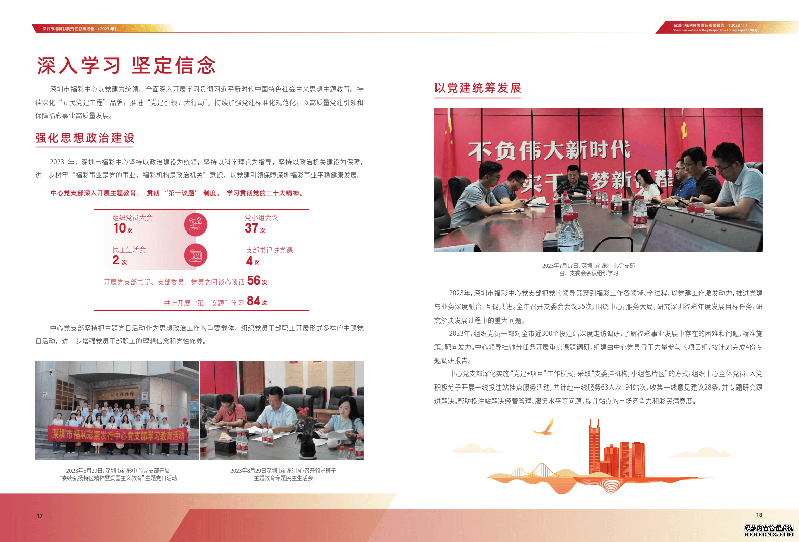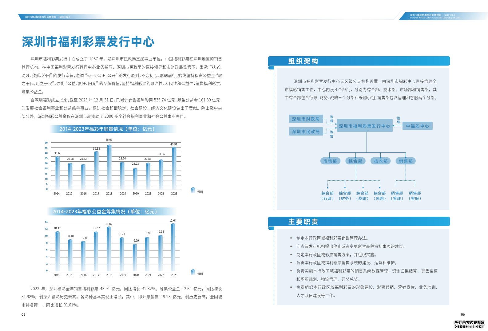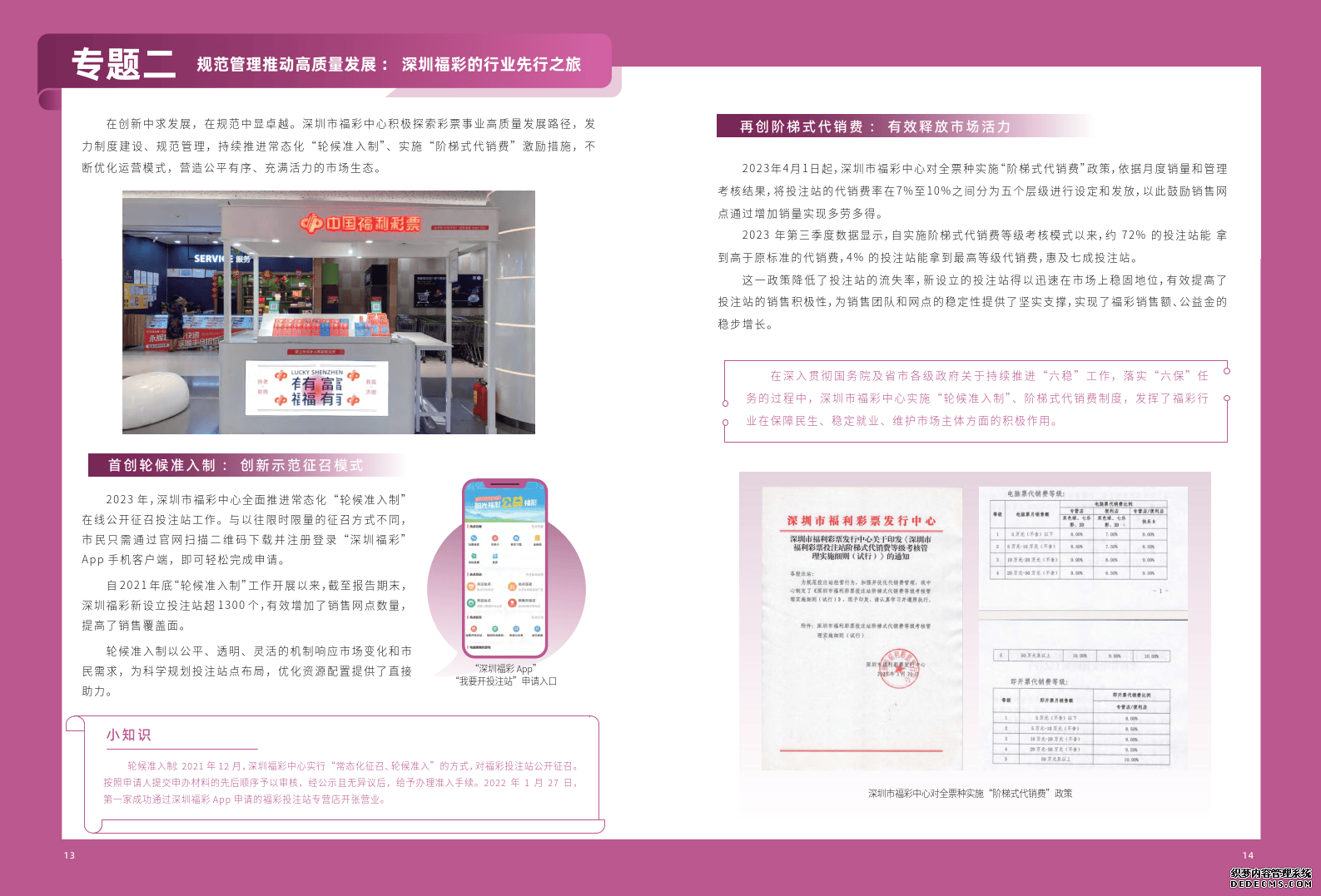 深圳,以其无限的活力和开阔的胸襟,崛起为粤港澳大湾区中的璀璨明珠。作为中国福利彩票发展的综合创新试验区,深圳福彩发扬开放、创新的城市精神,积极投身于福彩事业的开拓与探索。2023年,深圳市福彩中心以党建为统领,深入贯彻全国福彩会议精神,聚焦主责主业,推动福彩事业高质量发展。 2023年,深圳市福彩中心深入落实合规经营,以规范管理驱动发展,积极推动福彩事业与城市发展同步前行。全年销售福利彩票43.91亿元,同比增长42.32%;筹集公益金12.64亿元,同比增长31.98%,创深圳福彩历史新高。秉持“扶老、助残、敕孤、济困”的发行宗旨,通过销售福利彩票、筹集公益金,为民生福社和社会进步贡献福彩力量。 作为数字经济的领军城市,深圳正引领各行业进行数字化转型。顺应这一趋势,深圳市福彩中心积极推进信息化建设,坚持技术先导,立足安全底线,创新研发储备“区块链”、商用密码及“数字人民币”购兑彩技术,以技术为行业增信赋能。 2023年,立足“公益、责任、阳光"品牌价值,深圳市福彩中心推出以深圳福彩公益真实故事改编的公益微电影《星光》和《星火》,举办“双色球20周年,深圳福彩高质量发展再出发”主題活动,参加第十届中国慈展会,连续5年开展“爱心福彩·常回家看看"公益活动,发布年度深圳福彩责任彩票报告,深化品牌形象,增进公众信任。 面向未来,深圳市福彩中心将不忘初心、牢记使命,坚持以政治建设为统领,以人民为中心,坚持福利彩票政治性、人民性、公益性,全力推动新时代福彩事业的高质量发展。 1987年,为缓解社会福利事业发展和资金投入不足的矛,我国发行了社会福利有奖募捐券(即中国福利彩票的前身)。中国福利彩票由党中央、国务院特许发行,以“团结各界热心社会福利事业人士,发扬社会主义人道主义精神,筹集社会福利资金,兴办残疾人、老年人、孤儿福利事业和帮助有困难的人”为初衷,以“扶老、助残、敕孤、济困”为发行宗旨,坚持福利彩票政治性、人民性和公益性,经过不断探索,走出了一条具有中国特色的福利彩票发展之路。目前,中国福利彩票已经逐步成为引领公众奉献爱心、弘扬美德、传播善行的大众公益平台。通过购买福利彩票奉献爱心,也已成为社会公众喜闻乐见的文化生活方式。 来源:中国福利彩票