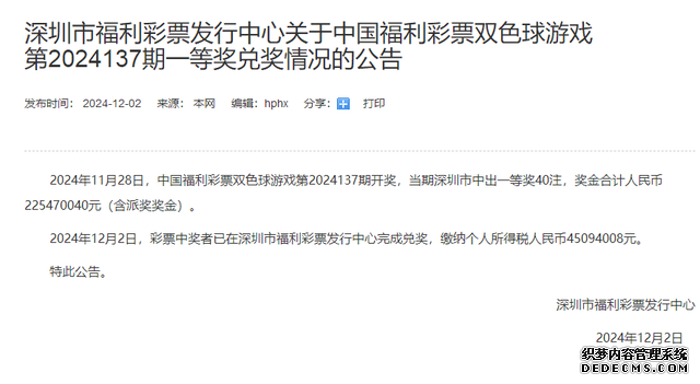 转自:北京日报客户端 12月2日,深圳福彩发公告称,2024年12月2日,彩票中奖者已在深圳市福利彩票发行中心完成兑奖,缴纳个人所得税人民币45094008元。 福彩双色球游戏第2024137期开奖。当期双色球红球号码为04、09、10、19、26、27,蓝球号码为12。全国共中出一等奖70注,其中深圳彩民独中40注一等奖。 ![]() 据深圳福彩官网介绍,深圳彩民中出的40注一等奖出自宝安区新桥街道庄村路70号80铺83023408投注站40注,中奖票为80元自选票。 ![]() 北京日报客户端注意到,今年双色球游戏已开出一等奖1611注。当前,正值双色球12亿派奖期间,深圳购彩者中得2.25亿多元的奖金包含了派奖奖金。 截至发稿时,中国彩市已经诞生了78个亿元大奖,2024年产生了6个亿元大奖。其中一个是时隔12年打破北京朝阳5.7亿元大奖纪录的贵州安顺6.87亿元大奖。 新闻多一点: 彩票中奖者的个人信息能公开吗? 在浏览彩票中奖新闻时,很多人会发现,中奖者多使用“化名”,领奖照片上绝大多数中奖者都戴着面具,并且彩票机构不公布中奖者的姓名等信息。 因此,“彩票大奖都是骗人的”、“彩票中奖是假的”、“从来没人中过大奖”的质疑声、造谣声不绝于耳。 那么,彩票大奖是真的吗?彩票中奖者的个人信息为什么不公开呢? 首先,中国福利彩票是国家为筹集社会公益资金,促进社会公益事业发展而特许发行、依法销售的公益彩票,是以国家公信力为背书的,公平、公正、公开,可信赖、负责任。彩票大奖真实可信。 其次,不能公布彩票大奖得主个人信息的原因,主要有三个方面: 第一,保护中奖者个人信息是彩票机构的法定责任。2009年7月1日之前,财政部有关规定明确要求,对彩票中奖者的相关信息要加以保密。2009年7月1日生效的《彩票管理条例》非常明确地规定“彩票发行机构、彩票销售机构、彩票代销者以及其他因职务或者业务便利知悉彩票中奖者个人信息的人员,应当对彩票中奖者个人信息予以保密”,并在第四十条明确了违反此规定的法律责任。 《彩票管理条例》第四十条第五款规定,彩票发行机构、彩票销售机构有泄露彩票中奖者个人信息的,由财政部门责令改正;有违法所得的,没收违法所得;对直接负责的主管人员和其他直接责任人员,依法给予处分。 第二,彩票中奖者具有隐私权,个人信息受法律严格保护。彩票中奖者的个人信息是自然人的重要个人隐私,受法律保护。我国《中华人民共和国民法典》《中华人民共和国个人信息保护法》均对自然人信息保护规定了保护规范和侵犯责任。《中华人民共和国民法典》第一千零三十四条规定,自然人的个人信息受法律保护,包括自然人的姓名、出生日期、身份证件号码、生物识别信息、住址、电话号码、电子邮箱、健康信息、行踪信息等。 第三,彩票中奖奖金是购彩者合法所得,根据《物权法》的规定,依法享有对其的占有、使用、收益、处分权利,不属于公共事务,不涉及影响或危害公共利益、国家利益和第三人利益,非必须向社会公开事项,公众不用必须知道中奖者个人信息。并且,并不构成隐私权和知情权的冲突,公众的知情权限于对程序、过程和制度的知情和监督,是有限度和边界的,不能影响中奖者的人身安全、生活安宁。同样,为了保护中奖者,匿名领奖也是国际常见做法,即使公布中奖者身份,也是基于中奖者自愿,即便强制,也有完善的保障措施,而且也非绝对必须公开,比如中奖后一定时间后才能公开,或者只公开居所地所在区域等。 划重点:保护中奖者个人信息是彩票发行机构和彩票销售机构的责任和义务,中奖者自愿或者征得中奖者同意,方可公开中奖者个人信息。 综合中国福彩、深圳福彩等 ![]() 海量资讯、精准解读,尽在新浪财经APP