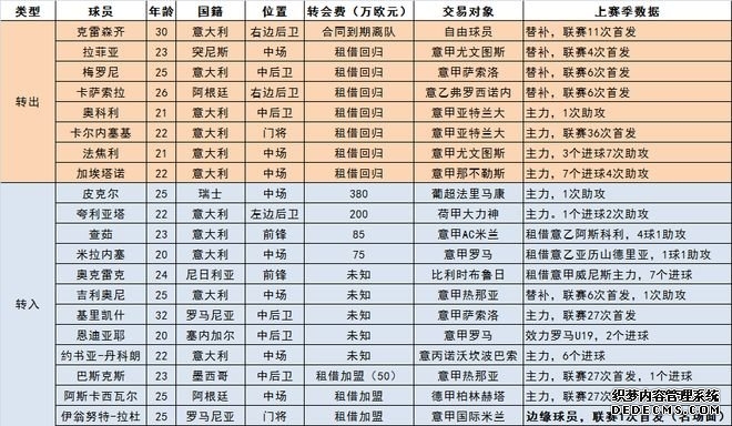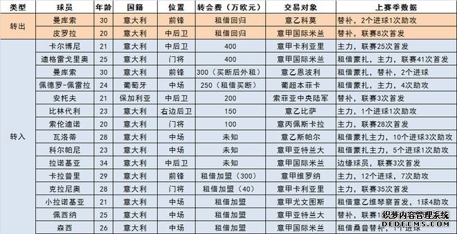 球队现状 目前在德转上球队的总身价为4358万欧元,是三支升班马球队中身价最低的,也是新赛季意甲联赛中身价最低的球队。 球员调整:球队在这个夏天进行了大幅度的人员调整,截至笔者截稿前,球队已经引进了约12名新援,已知的转会费仅700万欧元,对阵容进行了一定的补强。有意思的是,上赛季国际米兰的替补门将拉杜也租借加盟球队,拉杜在上赛季唯一的意甲出场中犯下超级巨大的失误,直接导致球队错失冠军。球队在球员转出方面还未获得收入,3-4名主力球员租借到期回归母队,但大部分主力球员都将留队。目前转会操作中,法兰克福中锋贡萨洛-帕森西亚也接近加盟。