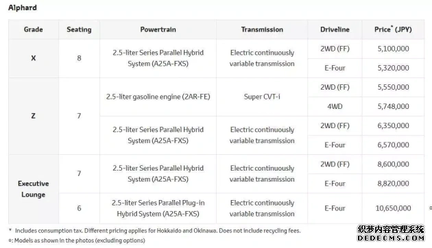 2025款埃尔法海外价格如何? 丰田埃尔法在国内起价较高,而在日本本土市场,起价并不高,入门款的X车型起价为510万日元,采用前置前驱的架构,折合人民币大约24万元,但国内进口的车型并非X,从国产版本车尾的标志就可以看出,属于豪华型号Executive Lounge的四驱版本,在日本市场,7座四驱E-Four车型的价格为882万日元,折合人民币约41.58万元,进入国内后,价格翻倍。