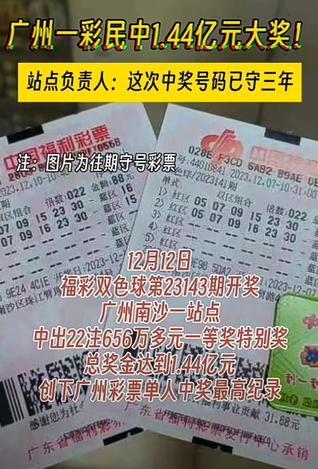 12月12日,福彩双色球第23143期开奖。 据信息时报,广州南沙一站点中出22注656万余元一等奖特别奖,总奖金为1.44亿元,创下广州彩票单人中奖的最高纪录。 据介绍,中奖彩票是一张22倍投注的2注单式票,投注额88元,由南沙区南沙区珠江管理区英贤路4号的44010841销售网点售出。 据信息时报报道,记者12月13日中午赶到该中奖站点,彩票站负责人赵先生称,大奖得主是一名熟客,他一直坚持守号投注,这次中奖的号码已守了3年。 中奖投注站的负责人还向记者展示大奖得主守号的往期彩票。
