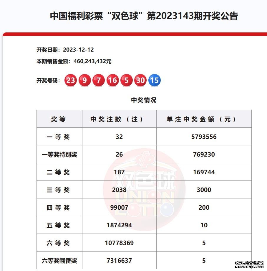 中奖投注站负责人 图片来源:信息时报视频截图 另据中国福彩双色球官网,第2023143期开奖公告发布,中奖号码红球为5,7,9,16,23,30号,蓝球为15号。 ![]() 一等奖中奖情况:江苏3注,浙江1注,湖北1注,广东22注,贵州3注,陕西1注,宁夏1注,共32注。 其中一等奖特别奖为:江苏3注,湖北1注,广东22注。 下期一等奖奖池累计金额:2,625,542,196元 下期一等奖特别奖派奖金额:20,000,000元 下期六等奖翻番奖奖金余额:137,101,255元 官网显示,双色球由中福彩中心发行和组织销售,由各省福彩机构在所辖区域内销售。采用计算机网络系统发行,在各省福彩机构设置的销售网点销售,每周二、周四、周日开奖。 双色球投注区分为红色球号码区和蓝色球号码区,红色球号码区由1-33共三十三个号码组成,蓝色球号码区由1-16共十六个号码组成。投注时选择6个红色球号码和1个蓝色球号码组成一注进行单式投注,每注金额人民币2元。 每日经济新闻综合中国福彩双色球、信息时报 每日经济新闻 举报/反馈 |