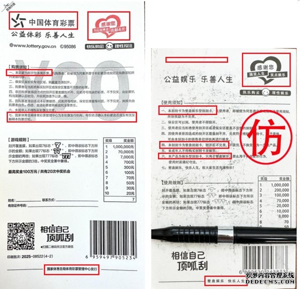 提醒广大购彩者:认准正规渠道,保护自身权益 作为购彩者,在享受购彩乐趣的同时,也需增强防范意识,避免因买到假彩票造成财产损失。教你几招练就火眼金睛,保护自身合法权益。 认准购彩渠道。中国体育彩票目前未授权任何网络平台进行销售,唯一合法购彩渠道为持有正规体彩代销证的线下实体店。请切勿在电商平台、直播平台、非正规摊点等渠道购买所谓“彩票”或“刮刮卡”,谨防上当受骗。 掌握辨别要点。正规的体彩顶呱刮即开票具有多项防伪特征,可通过以下几个方面进行初步识别。票面特征:正规即开票使用环保纸张和油墨,票面印有“体彩+顶呱刮”logo标识及面值金额;防伪纹路:票面印有专属防伪装饰纹,图案完整贯穿覆膜与非覆膜区域;刮开区域:游戏区刮开后可见清晰防伪底纹,游戏符号与奖金标志易辨认;票背信息:彩票背面印有发行机构、公益金贡献金额和官方网址等信息。 莫因贪心上当。对于任何来路不明、号称“包中奖”的彩票,或远低于面值销售的“彩票”,均应保持高度警惕,天上不会掉馅饼,谨防各类诈骗陷阱。 参与社会监督。如果您在购彩过程中发现伪造、变造、仿造彩票的线索,或遭遇假彩票诈骗,请立即保留相关证据,向当地公安机关报案,或拨打体彩官方服务热线95086进行举报。