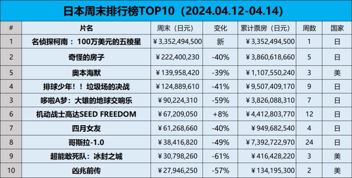 日本市场上周末《名侦探柯南》电影版系列的第27部作品震撼开画,该片刷新系列最佳开画成绩,并推动电影市场热度大幅反弹,周末票房前十作品共收票房约41.55亿日元,较前一周末大涨186%。动画剧场版《名侦探柯南:100万美元的五棱星》开画周末狂砍超33亿日元,较去年的前作提升超6%,创下日本影史第二高开画纪录。本土悬疑惊悚片《奇怪的房子》周末再收票房2.2亿日元,退居周末票房亚军,累计票房已破38亿日元。诺兰作品《奥本海默》次周末再收近1.4亿日元,退居周末票房季军,累计已突破11亿日元。动画剧场版《排球少年!!垃圾场的决战》周末再收超1.2亿日元的成绩,仍居周末榜第四位。动画剧场版《哆啦A梦:大雄的地球交响乐》周末也再收近9000万日元,退居周末榜第五。 ![]() 东宝发行的最新剧场版《名侦探柯南:100万美元的五棱星》上周五正式开画,首周末在全国515家影院起片,首周末三天共吸引227.4万人次捧场,收获票房33.52亿日元,连续第二年刷新系列的最佳开画成绩,比去年的第26部剧场版《黑铁的鱼影》(三天31.46亿日元)提升了6.5%,在影史仅次于《鬼灭之刃:无限列车篇》(三天46.23亿日元)。具体到每一天,《100万美元的五棱星》首周三天票房分别为9.63亿日元、12.4亿日元和11.5亿日元,均高于去年同期,观影人次最高的首周六动员83.91万人次观看,也高于去年前作首周六的82.34万人次。影片首周末平均票价达1474日元,比去年的前作提升了2%。影片首周在50块IMAX银幕收获超150万美元的成绩,创下系列最佳IMAX开画票房成绩,在影史也仅次于《鬼灭之刃:无限列车》。 ![]() 《名侦探柯南:100万美元的五棱星》这次以北海道为舞台,柯南和怪盗基德等人将围绕新选组副长·土方岁三的日本刀展开了战斗推理。第27部剧场版由2019年上映的第23部《名侦探柯南:绀青之拳:和2021年上映的第24部《名侦探柯南:绯色的子弹》的永冈智佳导演,常规配音阵容高山南、山崎和佳奈、小山力也等回归,工藤新一/怪盗基德角色的山口胜平,作为特别客串北海道警察搜查一课的刑警·川添善久角色由大泉洋声演。影片收获了较好的观众口碑,影评网站「Movie Walker」评分高达4.5分,接近去年的前作。影片在次周工作日表现持续领先前作,而且在即将到来的“黄金周”假期将缺乏《超级马力欧》那种级别的竞争对手,预计其最终有望超过《黑铁的鱼影》(最终138.8亿日元),将冲击日本市场2024年度票房冠军。 东宝发行的悬疑恐怖电影《奇怪的房子》在面临《柯南》的震撼冲击下,仍保持比较不错的走势。由石川淳一(《Legal High》系列)执导的这部新作周末三天再吸引16.7万人次捧场,再收票房2.22亿日元,比前一周末下跌40%,退居周末票房亚军。由间宫祥太朗、佐藤二朗、川荣李奈主演的这部恐怖悬疑片上映31天累计票房已超38.6亿日元,累计人次已接近308万名,成为近年表现较好的本土恐怖片之一。影片超过了《午夜凶铃2》(35.7亿日元),改写日本恐怖电影最高票房纪录,预计其最终落点将在40亿日元以上。 刚刚斩获七项奥斯卡奖的诺兰作品《奥本海默》上映第三周末再收获票房1.4亿日元,退居周末票房榜季军。由基里安·墨菲、艾米莉·布朗特等主演的这部传记电影较前一周末下跌39%,在被《柯南》抢占IMAX银幕的情况下,走势仍保持较好,上映17天累计票房已达11.08亿日元,累计人次已达69.74万名。《奥本海默》讲述了美国“原子弹之父”罗伯特·奥本海默在二战期间研制原子弹以及战后遭遇不公正待遇的经历。尽管涉及敏感的“核爆”议题,《奥本海默》在日本市场的表现还算不错,成为第一季度唯一破10亿日元的进口电影。截至目前,其全球累计票房也已超9.7亿美元。 ![]() 动画剧场版《排球少年!!垃圾场决战》周末再收票房1.25亿日元,较前一周下跌41%,反超《哆啦A梦》仍排在周末榜第四。根据漫画家古馆春一创作的运动题材漫画改编的这部作品上映9周累计票房已达95.07亿日元,累计观影人次已达664万名,暂居日本市场2024年度票房冠军,目前已升居日本影史票房第52名。按照目前的势头,影片落点仍锁定100亿日元大关。动画系列新作《哆啦A梦:大雄的地球交响乐》第七个周末再收票房9022万日元,较前一周大跌近60%,退居周末榜第六。由《大雄的金银岛》《大雄的新恐龙》的今井一晓执导的这部续集走势受新片冲击较大,上映45天累计票房已达38.26亿日元,累计人次已超321万名,成绩小幅落后去年的前作(同期累计破40.05亿日元)。按照目前的势头,《哆啦A梦》系列将连续两年突破40亿日元关口。 其他本土老片中,本土科幻动画《机动战士高达SEED FREEDOM》周末再收票房6720万日元,较前一周逆跌8%,回升至周末票房第六;影片上映12周累计票房已达44.12亿日元,累计观影人次已超262万名,继续刷新“高达”系列的单片纪录。由佐藤健、长泽雅美等主演的真人剧情片《四月女友》上映第四周末再收票房6126万日元,较前一周末下跌40%,上映18天累计票房已达9.5亿日元,按照目前的势头,预计最终票房将稳破10亿日元。获得奥斯卡的怪兽电影《哥斯拉-1.0》周末再收票房3840万日元,较前一周下跌49%,仍居周末票房榜第八,上映24周累计票房已达73.92亿日元,目前已升居日本影史票房榜第96名。 两部好莱坞老片仍位列前十。索尼发行的奇幻喜剧《超能敢死队:冰封之城》上映第三周末再收3080万日元的成绩,较前一周末大跌61