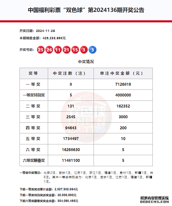 双色球2024136期开出8注一等奖 11月26日晚,中国福利彩票双色球游戏进行第2024136期开奖。本期双色球头奖8注,单注奖金为712万元。