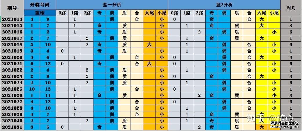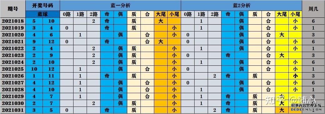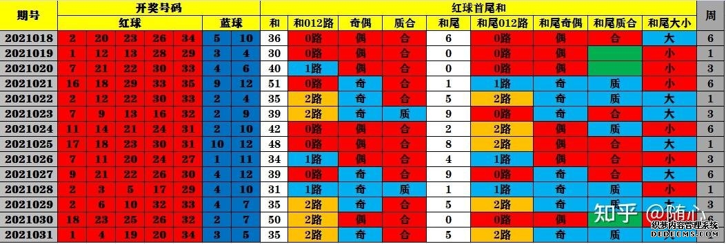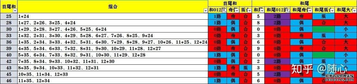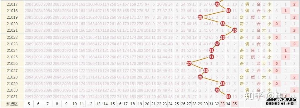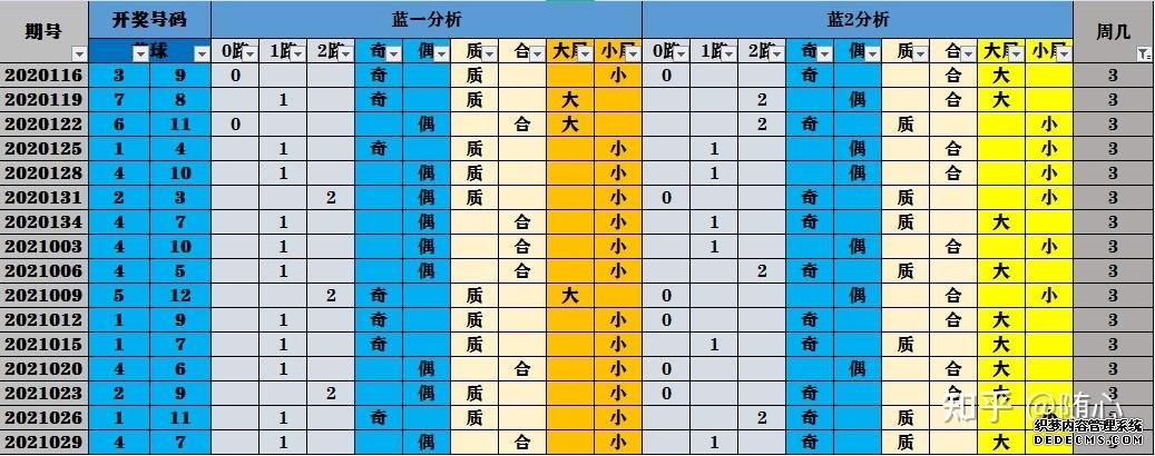 上期精选推荐两组杀码,A组成功杀8红正确,推荐147尾开2-3枚号码,结果开出01及同尾号04 34,龙凤组合命中01+34,但后区蓝03 05没有正确组合在一起,有点失望。上期精选实战如下图所示: ![]() 本期本群有人中出4+2,恭喜中奖的朋友! ![]() 一、开奖回顾 1、开奖号码 大乐透2021031期开奖号码为:01 04 19 20 34 + 03 05 ![]() 2、开奖号码分析 红球属性:本期开奖号码红球和值78,跨度33,奇偶比2:3,大小比3:2,质合比:2:3,开出一组同尾号04 34,开出1组连号19 20。 篮球属性:本期开奖号码篮球开出03 05,跨度为2,和值为8,偶数、合数、大尾。 3、中奖详情 本期开出一等奖27注,单注奖金5391526元,二等奖430注,单注奖金20000元,三等奖390注,单注奖金10000元,各级奖金明细如下表所示: ![]() a、大乐透2021032期红球预测分析 1、红球杀号 本期绝杀红球:01 04 07 08 11 14 18 21 23 26 29 31 33,共计13枚,杀号验证表如下所示: ![]() 注:公式在一定周期内准确率不太理想,大家适当选取! 2、红球首尾 上期首尾和尾35,首尾和最近50期最多连开2期二路,目前已经连开3期了,所以,本期预判首尾和为0路或1路,历史开奖首尾和属性如下表所示: ![]() 首尾和为0路或1路的龙凤组合如下图所示: ![]() 从龙头看,开出横V字型后,下一期龙头的跨度一般不超过5,尤其是最近20期,这个特点比较明显,所以,本期龙头预判为01±00~05,即01 02 03 04 05 06,主看02 03 05 06,龙头历史开奖走势图如下所示: ![]() 错凤尾看,跨度最近15期跨度都不超过4,所以本期继续再追一期,34±0~4,即30 31 32 33 34 35,但31 33是杀号,所以本期凤尾主看30 32 34 35,凤尾历史开奖数据属性如下图所示: ![]() 龙头为02 03 05 06,凤尾为30 32 34 35,且首尾和为0路或2路的龙凤组合有:3+30、2+34、6+30、5+34、5+35、6+34。 b、大乐透2021032期蓝球预测分析 1、后区分析 上期蓝一开出03,质数、小尾,蓝一小尾已经连续开出10期,再开小尾的概率很低,本期蓝一预判为大尾号码:05 06 07 08 09,蓝一历史开奖数据属性如下所示: ![]() 再从周三历史看,0路号码已经遗漏13期,周三历史上最近100期0路号码最多遗漏12期,所以本期蓝一重点关注06 09,周三蓝一历史数据属性如下表所示: ![]() 从蓝二常规历史开奖数据看,最近100期质数最多连开3期,所以本期主看合数,06 08 09 10 12,蓝二历史开奖数据属性如下表所示: ![]() 综上所述,本期篮球推荐06+08,06+10,06+09,06+12,09+10,09+12。 红球杀码:01 04 07 08 11 14 18 21 23 26 29 31 33(注:杀号公式在一定周期内准确率不太理想,大家适当选取!) 红球大底:02 03 05 06 08 09 10 12 13 15 16 17 18 20 21 22 25 28 30 32 34 35(注:由于公式杀号不一定全对,有些虽然是杀号,但看好的号也包含在大底里)。 龙头:02 03 05 06 凤尾:30 32 34 35 龙头凤尾组合推荐:3+30、2+34、6+30、5+34、5+35、6+34 篮球组合推荐:06+08,06+10,06+09,06+12,09+10,09+12 精选推荐: ![]() 各位彩友,以上观点仅供参考,不作为操作依据,请理性看待!多谢你们的关心支持,祝你们好运! (责任编辑:admin) |