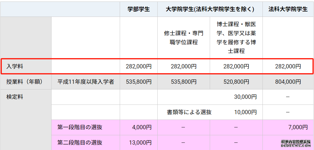 因为入学金是在学校发放考试合格结果后需要缴纳的,一般会限定一个缴纳截止日期,逾期缴纳则视为放弃入学资格。 有些学生同时报考了A和B两所学校,B学校先出结果被录取,要求在X月X日前缴纳报名费,但学生的首选校是A校,A校的结果却要比B校的缴纳截止日期晚出,学生为了先保住B校名额只能先缴纳入学金,后面A校合格,还要再缴纳一次报名费。 ![]() 以国立大学——东京大学为例,入学金和授业料(学费)是分开的。