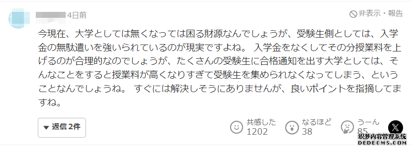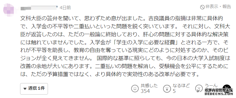 1:目前大学没有入学金的话财政会很困难,但站在考生的角度入学金的支出无疑是浪费的,如果取缔入学金,那学费理所当然就要上涨,学费太高的话也难招到学生,这个问题虽然一时半会儿也解决不了,但是的确是个好议题! ![]() 2:还是取消入学金重复支付比较靠谱,因为入学金已经是约定俗成的事了,以前别说入学金了,连学费都要一起缴纳并且不退费。作为考生只能报考一所志愿校,这种风险很大但是却别无选择。成绩非常优秀的话学校也可以随便选,走推荐入学是更好的做法。不入学的学生的入学金在某种意义上就像保险一样,是宝贵的收入来源,考试费报名费也是如此。如果要完全取缔这些费用那就变化太大了,不仅是大学、专门学校也是这样。 ![]() 3:听了文科大臣的答辩,不由得叹了口气。 吉良议员的指摘非常具体,严厉抨击了入学金不平等和双重支付等问题。 对此,文科大臣的回答,始终只是一般的看法,没有涉及到对关键问题的具体解决方案。入学金被认为是“学生入学所需的经费”,但这助长了不平等,剥夺了教育自由,这些问题如何解决,这个文部大臣完全没有远见。 即使按照国际标准,现在的日本大学入学考试制度也有很大的改善空间。 为了解决双重支付的问题,使报考机会公平,不仅仅是预算措施,还需要更具体、更有实效的改革。 ![]() 对此,大家有什么看法呢?希望以后能有更多议员提出这个问题,也许真能有一天日本能想出好的解决办法,让大家少花冤枉钱! ![]()