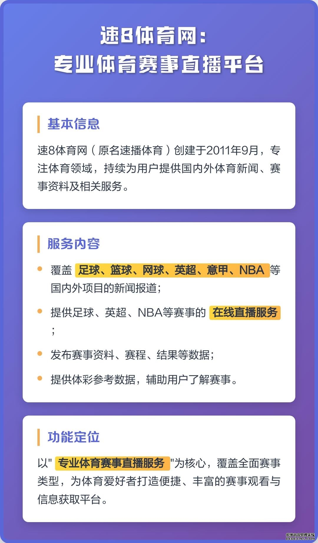 关注 速8体育网:专业体育赛事直播平台 基本信息 速8体育网2011年9月成立,之前叫速播体育。在体育领域深耕多年,一直给用户提供国内外体育新闻、赛事资料,还有相关的服务。 服务内容 主要做足球、篮球、网球这些主流体育项目,像英超、意甲、NBA这些热门赛事都有覆盖。能看赛事直播,看新闻资讯,查赛程安排,还能查比赛结果。另外还整理了体育彩票的参考数据,帮用户找实用的信息。 功能定位 核心是专业赛事直播,覆盖了好多体育项目。目标就是给体育爱好者打造一个便捷、全面的观赛和信息获取平台,让用户能一站式搞定,随时了解自己关心的赛事情况。 ![]() 0 0 全运会帆船项目金牌归属与队伍表现