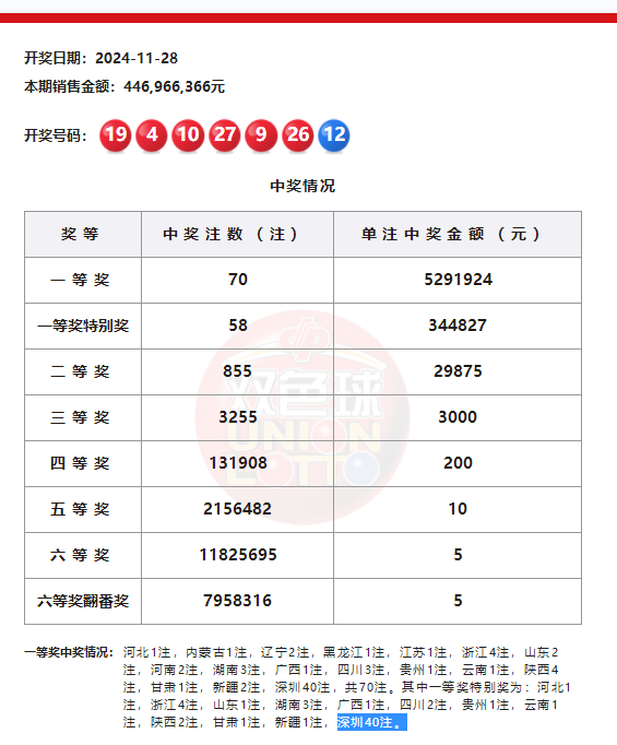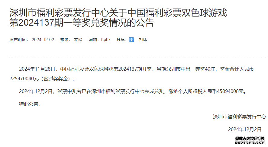 12月2日,深圳福彩发公告称,2024年12月2日,彩票中奖者已在深圳市福利彩票发行中心完成兑奖,缴纳个人所得税人民币45094008元。 福彩双色球游戏第2024137期开奖。当期双色球红球号码为04、09、10、19、26、27,蓝球号码为12。全国共中出一等奖70注,其中深圳彩民独中40注一等奖。