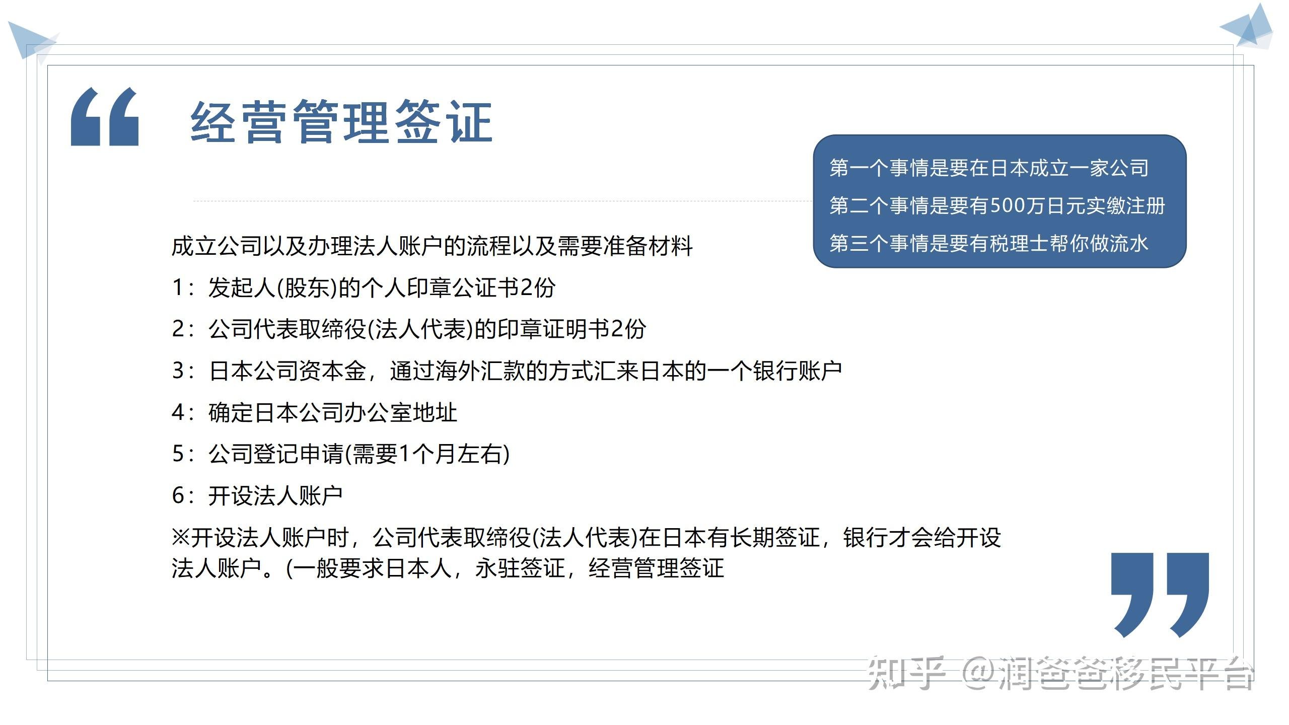 我从来不假设,假设目前有需求,或者有潜在需求的朋友对移民日本的路径都很了解,我很高兴跟大家一起温故知新。 经营管理签证,是目前国内中产家庭前往日本拿到永住最常见,并且最简单的一条路。 经营管理签证,顾名思义,就是你需要登陆日本,做一个小生意,然后通过1+1+3+5的续签的方式,最终获得日本永住者身份。 也就是我们平常所熟悉的绿卡,你也可以这么理解,只是在日本叫作永住。 我们办理费用只需要8万人民币,提交商业计划书,登陆日本开户,直到下签,有专业人士一站式办理。 想要了解更多日本经营管理签证相关信息,添加下方卡片上的微信⬇️⬇️,联系移民老师,免费咨询+评估。日本移民快速咨询通道 主申请人日本注册公司,提供经营计划,便可获得日本经营管理签证,配偶及18周岁以下子女可获得家族滞留签证 1、主申请人: ![]() 1.公司取名,确立经营范围 根据自己的规划,建议添加10-15条相关经营范围,避免后续想添加新业务经营范围的时候,额外增加费用支出 2.在日本共同发起人 大部分申请人都是外国人身份,因此无法开设日本银行账户,因此需要找一位日籍或日本永住身份作为公司的共同发起人。登陆后,日本发起人退出 注意:若没有日本共同发起人,通常是可以委托中介解决 3.准备500万日币的资本金 这笔钱不是给日本政府,只是从个人账号转到新公司的账户,后续可以用于公司开支以及给自己工资等等。 1.准备申请材料 个人材料: 2.提交申请材料:将所有材料递交至入管局,并等待审核,平均审核时间在3个月左右。 3.审核通过后,会收到在留资格认定证明书。 4.持有在留资格认定证明书及其他必要材料(如护照、居住证明等),前往日本驻中国大使馆或领事馆贴签。 5.入境及后续:获批后,3个月内登陆并抵达日本后,前往区役所登记住址。 如果还不清楚自己是否达标能够申请,添加下方卡片上的微信⬇️⬇️,联系移民老师,免费咨询+评估。日本移民快速咨询通道 ![]() 撇开其他的耗材不说,那要看你具体做什么生意,你要先告诉我,我帮你做具体的分析,但是基础以下四个要记好: 1.首先租办公室 如果在东京租一个20平左右的,最便宜的,我们算 5 万日元,那么一年就是 5x12=60 万日元,约人民币3万元。也会有人买个 40-50 万的小空室注册办公室,图省事。 2.然后是各种税金保险 如果按照 300 万的营收流水来算,你的个人所得税,健康保险,国民年金,住民税,雇佣保险,因为你自己是又老板又当员工,那就按两份算一年的,大概是 110 万日元左右,约人民币 4万元。 3.再来就是税理士的花销 差不多是人民币 4.98万左右。 我们暂时抛开其他介入因素,将此数据相加乘以 10 年,(3+4+5)x10=120万,也就是每年约 12万左右。 并不是很高吧,我们说句实话,国内做生意赔的钱,动辄几百万上下。 看到这里,如果大家对经营管理签证有任何不清楚的地方,或想要了解费用构成以及如何减少税费,添加下方卡片上的微信⬇️⬇️,联系移民老师,免费咨询+评估。 日本移民快速咨询通道