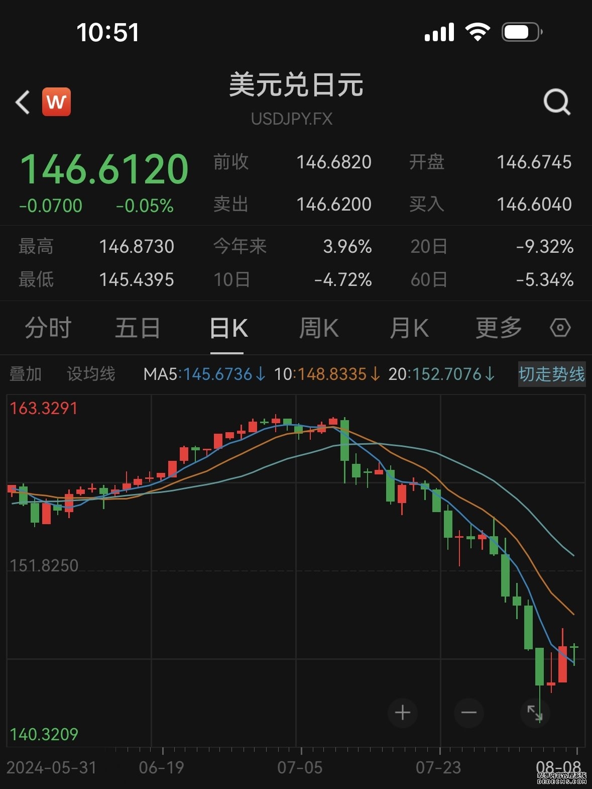 图为8月5日晚上6点多,陈女士账户截图 特别是经过8月5日大涨,陈女士已经赚了。“现在这140万日元已经跑赢国内银行存款利率,我还想再放一放,等涨点再卖,感觉趋势形成的话,不会这么快就结束。”8月5日当天,陈女士向记者表示,大涨之后,又充满了信心,觉得“今年赚到10%应该拿捏”。 38年新低之后急速飙涨 日元发生了什么? 尽管账面上已经赚了,但是陈女士觉得,日元可真不是一般小白能投资的。 自去年年底以来,日元对美元的汇率经历了持续贬值,从大约141一路下滑至最高约162,创下了38年来的新低。即便在日本央行退出负利率政策之后,日元的贬值趋势仍然持续。 日元汇率急速升值从7月31日开始。当天,日本央行宣布加息15个基点,将政策利率上调至0.15%—0.25%,为今年3月份解除负利率政策以来首次加息。同时,日本央行决定在今后的1年至2年内,减少日本国债购买规模,每个季度减少约4000亿日元。 紧接着,7月份美国非农就业数据公布后,市场显著加大了对9月份美联储降息幅度以及年内降息次数的预期,美元指数承压下跌。 此后几天,日元兑美元持续上升。8月5日,日元对美元汇率一度上涨至1美元兑换141日元上方,创下了自今年1月以来的新高。 浙江一家国有银行私行部资深投顾认为,“日本鹰派货币政策直接触发了日元兑美元汇率的大涨行情。”他分析指出,“此前在日本央行长期维持负利率的情况下,日本本土投资者与国际资本纷纷借入低息日元,再兑换成美元等外币投资其他国家高收益金融资产,而现在随着日本与美国之间利差有所缩小,日元套利交易成本上升,吸引力下降,投资者买入日元卖出美元的势头增强。” 日元汇率走向何方? 专家认为日元超贬值时代或已结束 正当陈女士觉得稳操胜券的时候,日元在8月7日又出现重大变数。 当天,日本央行副行长内田真一表示,如果前景展望成为现实,将调整宽松程度。当前需要坚定地维持宽松政策,不会在市场不稳定的时候加息。随后,亚太主要股指全线反弹,日股由跌转涨,日元大幅贬值,美元兑日元先后击穿146、147关口。 从8月5日到8月7日,短短两天,全球资本市场因日元剧烈震荡,日元的走向几乎决定了近期资本市场的涨跌。就在陈女士关心能否赚到10%收益时,全球市场更关心的是:接下去,日元会怎么走?
