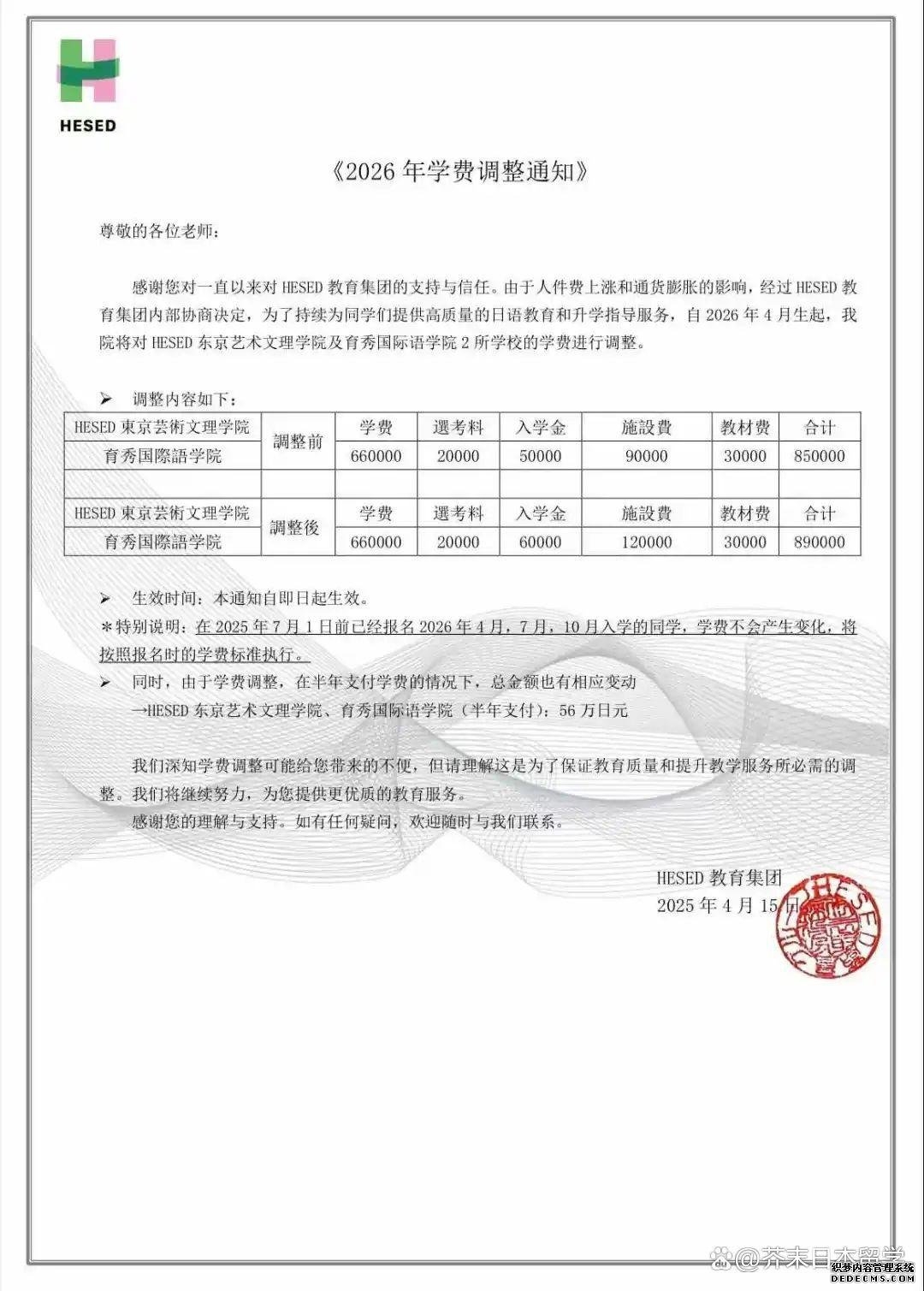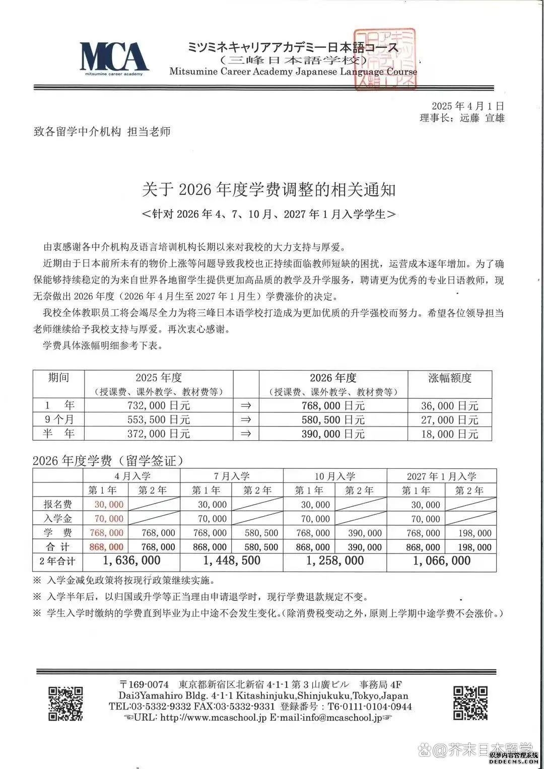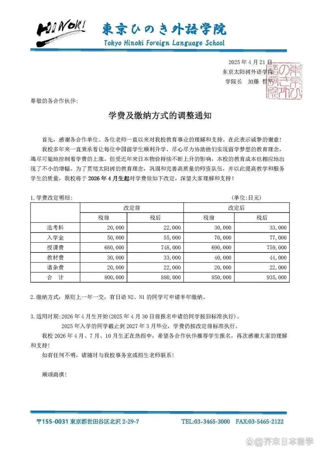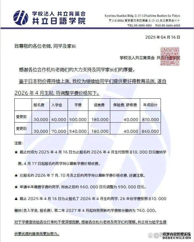 近年来,日本留学方面的各种政策调整就像按了加速键,随着多家语言学校宣布学费突破90万日元大关,普通家庭的留学成本压力陡增。 这场“涨价风暴”的背后,究竟是哪些因素在推动?普通家庭是否还能实现日本留学梦? ////////// 语言学校学费“狂飙” 从70万日元到百万的跨越 01 学费涨幅惊人,东京成“重灾区” 从去年下半年开始,日本多所语言学校发布学费上涨通知,东京地区的学费已普遍进入“90万+”时代。 京进语言学院:26年4月生起学费97.9w日元 东京诺亚日语学校/东京亚细亚学友会 :26年4月生开始,全年学费由76万日元调整到84万日元;仅面向26年4月生,交全年学费的同学享有入学金5万日元减免,实际学费是79万日元。 ARC日本语学校:26年4月生起学费91.6w日元 三峰日本语学校:26年4月生起学费86.8w日元 JCLI日本语学校:26年4月生起商务日语/一般日语学费99w日元,升学/特定技能学费86.9w日元 美都里慕日本语学校:26年4月生起学费88.8w日元 共立日语学院:26年4月生起学费86w日元 (如果在4月16日前报名26年4月生,按照81w日元缴纳学费) hesed东京艺术文理学院:26年4月生起学费89w日元 育秀国际语学院:26年4月生起学费89w日元(2025年7月1日前已经报名26年4月、7月和10月入学的同学,学费不会产生变化,讲按照报名时的学费标准执行) 翼路学园:26年4月生起,日语教育学科学费96.6w-101.1w;一次性缴纳一年,减免2w日元 东京太阳树外语学院:26年4月生起学费93.5w日元(如果在2025年4月30日前报名申请的同学按旧标准执行) ![]() ![]() ![]() ![]() 部分学费上调通知单 02 隐形成本不容忽视 除了学费,学生还需要了解租房和在日生活的费用 (责任编辑:admin) |
