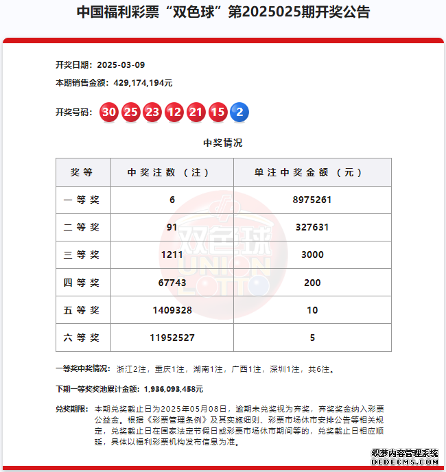![]() 双色球第2025025期 开奖号码公告 ![]() ![]() 03月09日晚,中国福利彩票双色球游戏进行第2025025期开奖。当期双色球红球号码为12、15、21、23、25、30,蓝球号码为02。 当期双色球一等奖6注,单注奖金为897万多元。这6注一等奖花落5地:浙江2注,重庆1注,湖南1注,广西1注,深圳1注 。 二等奖开出91注,单注奖金32万多元。当期末等奖开出1195万多注。 当期全国销量为4.2亿多元。计奖后,双色球奖池金额19亿多元。