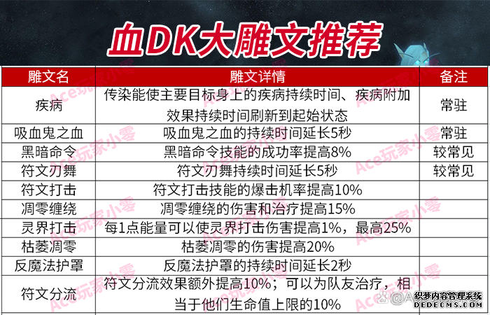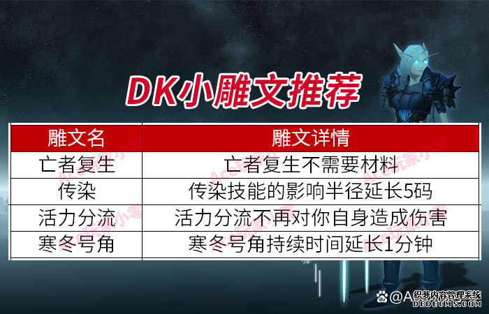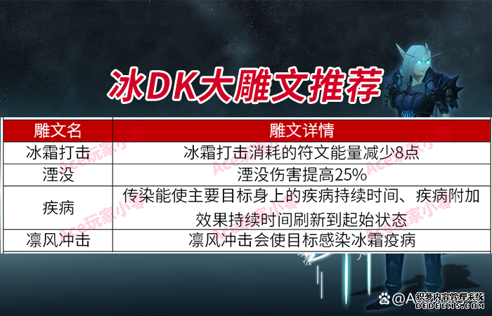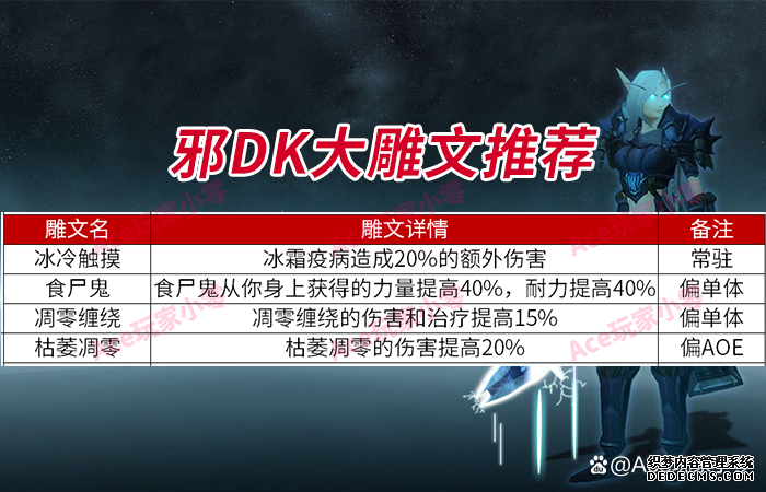 大家好,我是小零~ WLK的雕文系统马上就要上线了,死亡骑士的雕文要怎么选呢?今天小零就来分享一下DK三系的雕文搭配推荐方案。战士和圣骑士的雕文搭配方案请看往期文章,其他职业会陆续更新,有兴趣的玩家们记得关注小零哦。 ![]() DK的小雕文中,“亡者复生雕文”和“传染雕文”是三系通用的固定雕文,而剩下的一个孔可以在“活力分流雕文”和“寒冬号角雕文”中进行选择。一般情况下,“寒冬号角雕文”可能会更受欢迎一些,特别是冰DK的话,应该是要常驻的。至于其他的小雕文都不是很常见,如果有特殊的喜好也可以考虑,但实际的效果应该比不上这4个。 ![]() 其实DK的大雕文也没有太多的争议,只是因为当年的WLK版本中,DK的很多雕文都经历过调整,所以有些玩家可能会出现记忆混乱。那下面,我们就一起来再回顾一下DK三系的主流大雕文吧。 血DK: 血DK有两个几乎固定的大雕文,那就是:“疾病雕文”和“吸血鬼之血雕文”。而剩下的一个就比较随意,一般来说“黑暗命令雕文”和“符文刃舞雕文”是比较常见的选择。如果P1阶段里没有“符文刃舞雕文”,那“符文打击雕文”、“凋零缠绕雕文”和“灵界打击雕文”也是不错的选择。如果是一些特殊的场景,那么“枯萎凋零雕文”和“反魔法护罩雕文”也有不俗的表现。还有“符文分流”雕文,这个雕文在5人本和10人团本里比较有用,能有效地降低治疗的压力。 血DK第三个大雕文的备选项比较多,可以根据不同的场景和个人爱好,搭配出适合自己的一套方案。 ![]() 邪DK: 与血DK一样,邪DK也有两个比较固定的大雕文,分别是:“冰冷触摸雕文”和“食尸鬼雕文”。而且最后一个孔也比较灵活,备选项有“凋零缠绕雕文”和“枯萎凋零雕文”。可能有些玩家会认为,“食尸鬼雕文”的效果并不是很好,所以常常会选择带“冰冷触摸”,加上“凋零缠绕”和“枯萎凋零”。 其实这四个雕文当中,“冰冷触摸雕文”是不可替换的,“枯萎凋零雕文”是偏向于AOE的,而“凋零缠绕雕文”和“食尸鬼雕文”是偏向于单体。而我们在打一个团本的情况下,相比小怪阶段的AOE能力,可能BOSS阶段的单体输出是更加重要的。而且考虑单体伤害的话,“食尸鬼雕文”的伤害会比“凋零缠绕雕文”要高一些,所以小零比较喜欢常驻“食尸鬼雕文”。但如果想要在小怪阶段里,毛一下更多伤害的话,也可以考虑多带一些AOE大雕文。只是到了WLK之后,考核机制肯定跟现在是不一样的,所以到时候看自己的情况而定吧。 ![]() 冰DK: 冰DK的大雕文没有什么好选的,常用的就是:“冰霜打击雕文”、“湮没雕文”和“疾病雕文”。 其中“疾病雕文”应该不用解释,而“湮没雕文”的话,直接提升冰DK核心技能25%的技能伤害,简单粗暴提升明显。而最后的“冰霜打击雕文”主要是有助于冰DK的技能循环。在点满“符文能量掌握”天赋的情况下,冰DK的能量上限会达到130点,在没有插“冰霜打击雕文”的情况下,我们最多能打出3次冰霜打击。而如果插上“冰霜打击雕文”,那满能量时,正好就能打出4次的冰霜打击。这就说明在一个较长的输出循环当中,“冰霜打击雕文”能给予更多的冰霜打击次数,能有效地填补符文空白期。 除了这三个大雕文之外,也可以根据场景的需要,选择“凛风冲击”等雕文,但实际伤害收益肯定没有前面的高。 ![]() 好啦,WLK怀旧服死亡骑士的雕文搭配推荐就是这些啦~如果你有好的搭配推荐,欢迎分享出来啊~ 关注百家号Ace玩家小零,更多精彩内容等着你哟,么么哒~ ![]() 举报/反馈 |