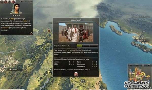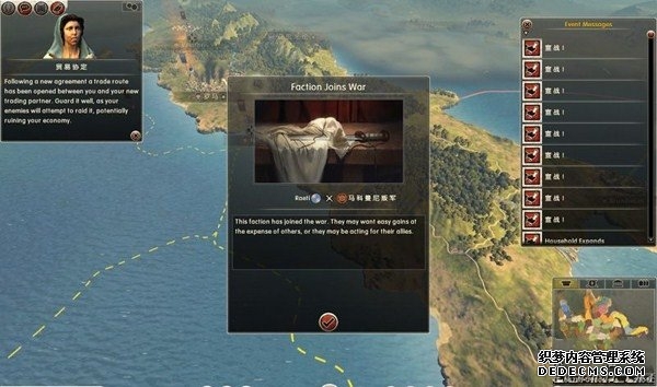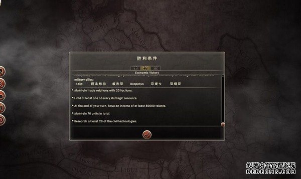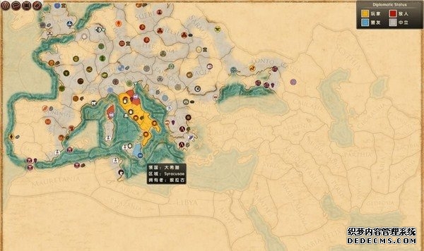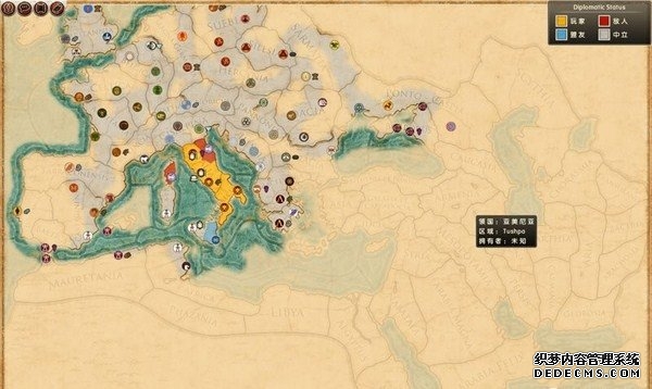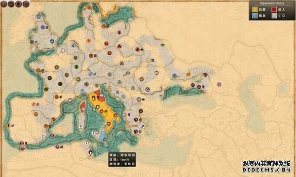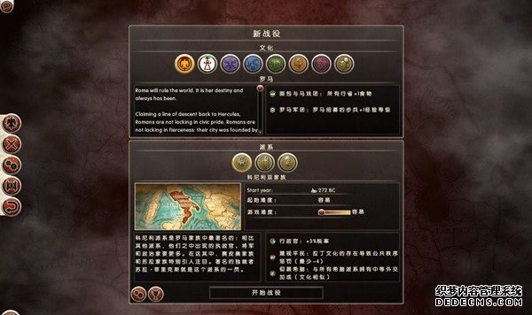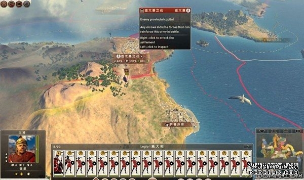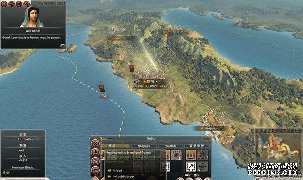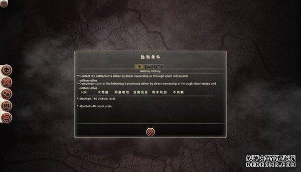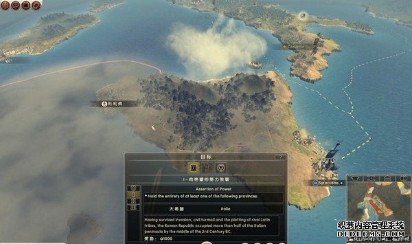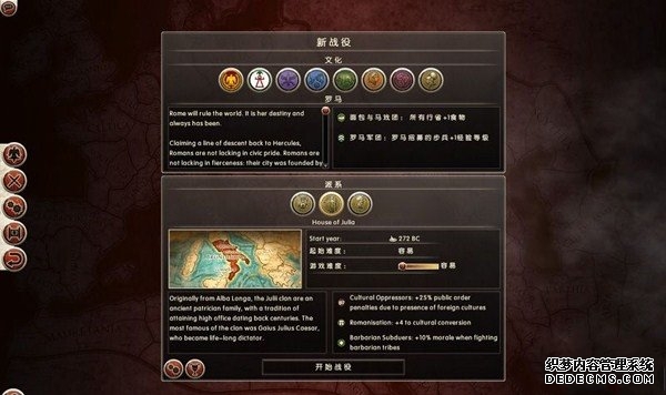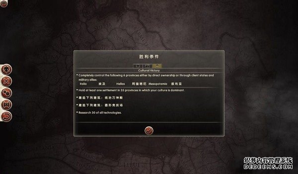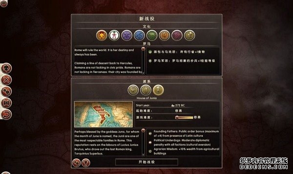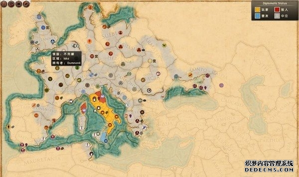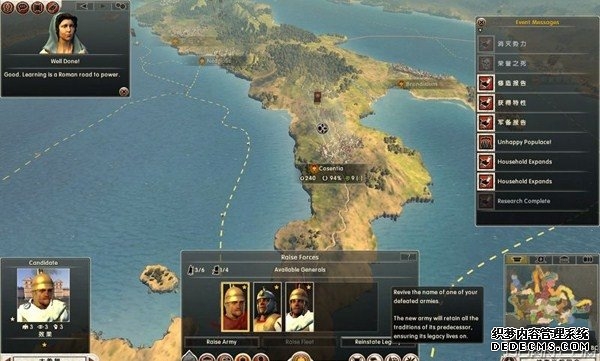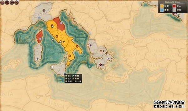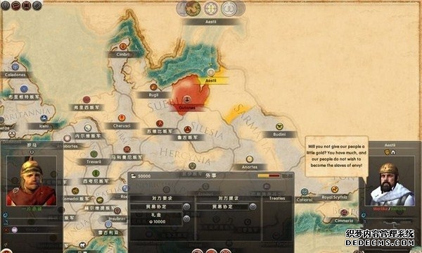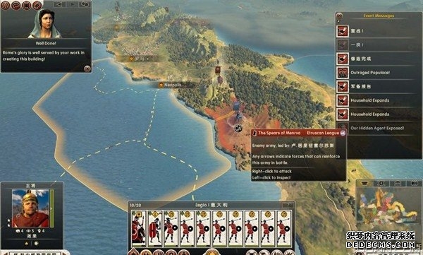 罗马2:全面战争战役图文流程攻略_全文化派系简易战报 一、罗马文化战役 罗马,欧洲文明的里程碑。 罗马,铁与血的荣耀之国! 我们的战役简报,也从这个帝国的建立开始。 罗马文化具有发达的经济基础和军事力量。 所以选择罗马可以使你所有行省的食物量和民众满意度有所提升。 并且所有步兵初始具有+1经验等级,这意味着你的步兵能更快的升级。 派系 罗马文化分为三个派系。 柯尼利亚家族税收收入提高3%,但是民众秩序天然降低至少4点。 不过由于与希腊文化的渊源,柯尼利亚家族在与大希腊相关文化的交流中有外交加成。 朱利亚家族是个民族主义情结浓厚的纯正罗马家族。 他们在国家有外族文化存在时会增加25%民众秩序惩罚。 但是他们的文化转化速度更快,并且面对野蛮民作战时士气更高。 顺便说一句,凯撒就来自这个家族。 琼尼亚家族在拉丁文化存在的情况下会增加公共秩序值。 但是他们对所有的派系都有外交惩罚。 不过,琼尼亚家族可以从所有的农业建筑中获得额外10%收入。 基本上,柯尼利亚家族适合经济发展,朱利亚家族适合军事征服。 而琼尼亚家族肯定是种田派的最爱了。 选好家族后进入罗马战役。 罗马的战役开局较为简单,可以从关系地图中看到。 只有一个敌人(红色)占领了两个行省的部分区域。 周围全部是灰色的中立区域。 如何获得胜利 胜利条件分为三种。第一种为军事胜利,胜利条件为: 1、控制140个定居点。 数量虽然惊人,但是不管是你的还是你的属国或者军事同盟的都算数。 2、控制意大利、大希腊、阿奎塔尼、亚美尼亚、阿非利加和不列颠6个行省。 同样也是属国或者同盟的都算。 3、维持140个陆地单位和40个海军单位。 第二种是经济胜利,其胜利条件为: 1、控制意大利、阿非利加、叙利亚、博斯普鲁斯、贝提卡和亚细亚6大行省。 2、和20个派系维持贸易关系,控制至少一种战略资源。 3、回合结束时获得最少8万收入。 4、维持70个单位并研究至少20项社会科技。 第三种是文化胜利,胜利条件为: 1、控制意大利、埃及、大希腊、阿奎塔尼、美索不达米亚和叙利亚6个行省。 2、建造统治万神殿和圆形竞技场两个奇观。 3、至少在35个行省的中拥有占据文化优势的定居点。 4、至少进行30项研究。 玩家可以选择自己喜欢的方式获得游戏的胜利。 本攻略将选择军事胜利的方向,毕竟,全面战争嘛! 从只探索了一部分的战略地图中就已经可以看到无数的派系势力了。 元老院任务 不过这么多的势力不需要全部征服,我们需要一个战争的规划。 而如何规划进攻方向,我们还可以参考元老院的任务。 元老院在进入游戏时就给予了玩家多个任务。 主任务就是要求完全控制两个行省。 附加任务第一要求完全控制希腊或者意大利。 第二个任务要求征服伊特鲁里亚派系。 最后一个任务是向迦太基开战。 那么我们的第一步征服计划也就出来了,可以完全和元老院的任务贴合。 首先解决掉唯一敌对还占领了罗马行省一个定居点的势力——伊特鲁里亚。 然后向大希腊行省推进,大希腊即是军事胜利目标,也是元老院任务目标。 占领大希腊时,不可避免的会与迦太基开战。 此时就可以尽量占领迦太基控制的地中海中部岛屿和大希腊其余地区。 当战线稳固后,就可以稳步向非洲北部的阿非利加挺进了。 二、意大利战役 战役规划完毕,那就依照计划开始征服计划吧。 首先抵御住意大利本土派系的攻击。 在初期只有3个将军带兵的情况下。 需要先使用两个将军稳守驻防。 剩下一个首先剿灭意大利半岛上四处游荡的敌军。 最终,将伊特鲁里亚势力完全堵在了亚里米伦。 此时可以适当补充兵力,发展下城市建筑科技以便建造高级兵种。 当兵力合适后,可以让一个将军在罗马殿后,其余直接围攻里亚米伦。 在没有攻城部队的情况下,选择围城而不是强攻能有效降低敌方城防并减少己方损失。 当围城进行了一到多个回合后,根据自己兵力,就能够强攻取城了。 攻陷里亚米伦则意味着意大利全境的统一。 你也因为完全控制了一个行省而能够招募6支军队和4支船队了。 以后随着征服的推进,你可以招募的军队会越来越多。 在一场大战役结束后,需要时间修建城市、发展科技和补充兵力。 在回合的间隙收到不少贸易请求。 和对方讨价还价,尽量以更低的成本完成远距离的贸易。 我的策略是,如果对方是近期的攻击目标,那就拒绝,贸易也会给他带来收益的。 回合又收到了各个派系战况的简报。 这个势力陷入战争,迫切需要盟友。 在审时度势后,决定看看能不能与他结盟而获得好处。 首先还是研究城市建设的科技从而能修建高级的战争建筑。 在资金允许的情况下,多线修建提高基础设施水平。 三、大希腊战役 在一切准备妥当后,向大希腊进发。 由于兵力上的优势,很快形成的围城之势。 在激烈战斗了多个回合后,成功占领大希腊行省全岛。 元老院的任务,意大利已经是勾了,这下再添大希腊。 任务完成,奖励到手。 在战斗中还获得了鹰旗。 可以组建更为强大的罗马军团了! 而连续的战斗对民众的生活状况产生了不利影响。 这时通过下方第一个图标调整政策,增加食物供给维持社会秩序。 毕竟后方稳定才能为征伐提供更好的支持! 四、阿非利加战役 此时的罗马帝国已经拥有了比较强大的军事实力。 在进一步兼并了迦太