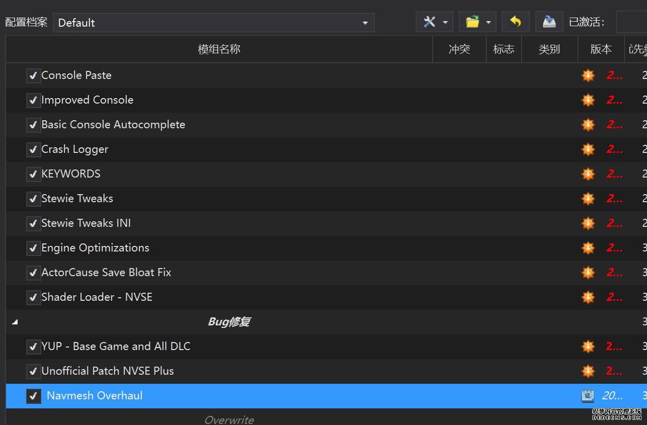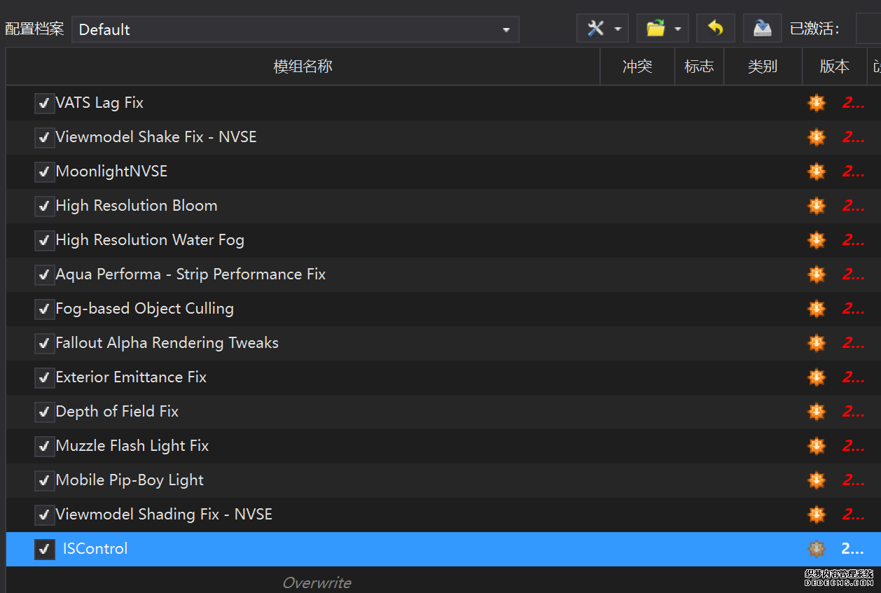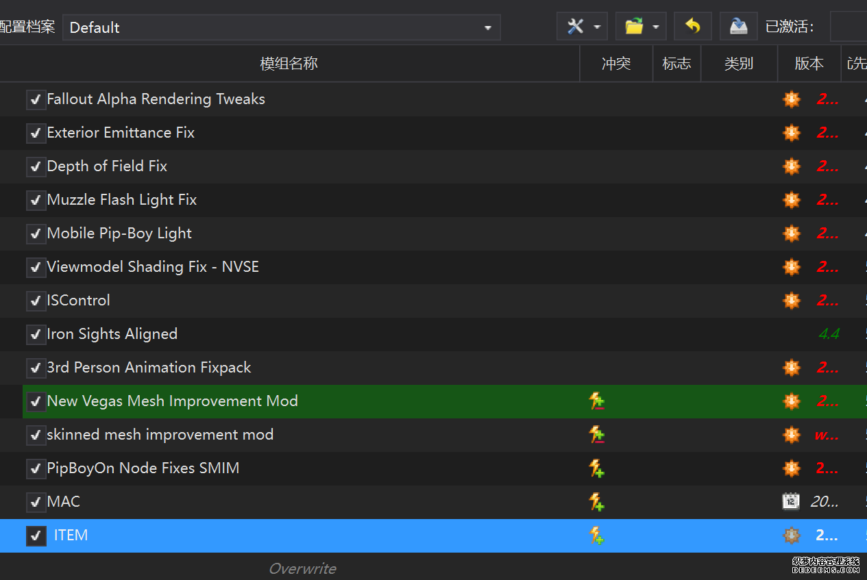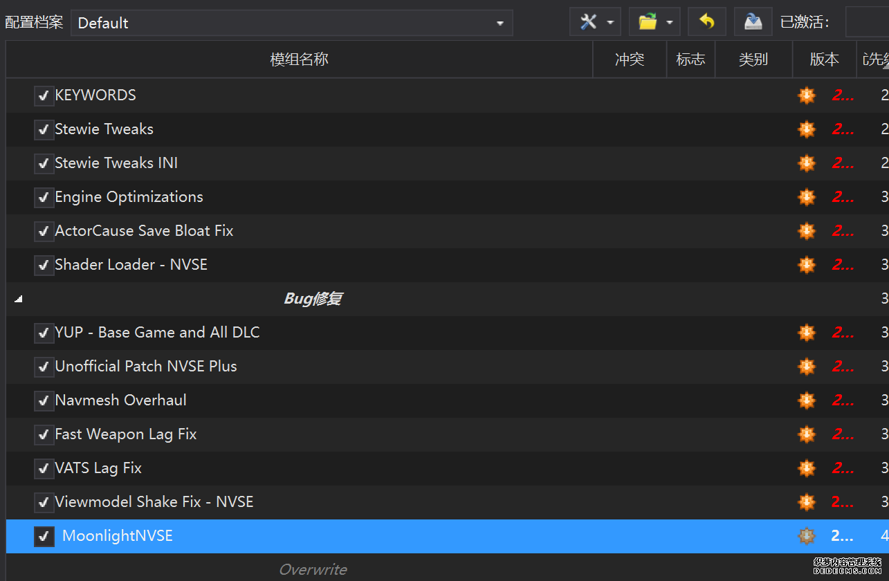有问题首先查看常见问题及解答,如果无法解决则在介绍页面评论或者在q群问,不要在其他页面评论,更不要在知乎私信,很不方便 外挂汉化反馈QQ群:767971031 指南QQ群:761409041,提问前请至少完成基础部分,并确保没有安装不推荐列表中的任何内容 该部分中将对原版游戏存在的一些BUG进行修复,如前所述,这一部分虽然不是100%必须,但还是强烈推荐安装 ![]() 为了分类,在MO2右键-创建分隔符,命名为Bug修复,结果如图所示 新维加斯最大、最新的非官方补丁,对游戏的许多方面进行了修复 原址: https://www.nexusmods.com/newvegas/mods/51664?tab=files 下载主文件:YUP - Base Game and All DLC(第一个) ![]() 在MO2安装并勾选 利用NVSE的功能对一些BUG进行补充修复 原址: Unofficial Patch NVSE Plus 下载主文件:Unofficial Patch NVSE Plus ![]() 在MO2安装并勾选 修改游戏中的导航网格,从而改善AI寻路和战斗 原址: https://www.nexusmods.com/newvegas/mods/81003?tab=files 下载主文件:Navmesh Overhaul ![]() 在MO2安装并勾选 修复敌人生命值变更时1-10ms的固定卡顿 原址: Combat Lag Fix (NVSE) 下载主文件:Fast Weapon Lag Fix ![]() 使用MO2安装并勾选 修复了VATS显示命中率前1-2s的固定延迟 原址: VATS Lag Fix 下载主文件:VATS Lag Fix ![]() 使用MO2安装并勾选 修复浮点数精度丢失导致的机瞄不规则 原作者:WallSoGB 原址:Viewmodel Shake Fix - NVSE 下载主文件:Viewmodel Shake Fix - NVSE ![]() 直接使用MO2安装并勾选 使月亮而不是太阳在晚上充当光源 原址: https://www.nexusmods.com/newvegas/mods/77683?tab=files 下载主文件:MoonlightNVSE ![]() 在MO2中安装、勾选即可 提高泛光分辨率,减少锯齿、提高清晰度 原址: https://www.nexusmods.com/newvegas/mods/77933?tab=files 下载主文件:High Resolution Bloom ![]() 在MO2中安装并勾选 通过提高分辨率改善水中倒影的锯齿问题 原址: High Resolution Water Fog - Water Aliasing Fix 下载主文件:High Resolution Water Fog ![]() 在MO2安装并勾选 该mod和enb不兼容,指南后续也有与enb不兼容的mod,将不再进行提醒 本指南不推荐enb,如安装enb则不要向我求助 新维加斯的enb项目已经被enb作者放弃,因此有大量bug和兼容问题,想要提升视觉效果可以用天气mod、Reshade、NVR代替 通过禁用水LOD提升赌城区性能 原址: Aqua Performa - Strip Performance Fix 下载主文件:Strip Performance Fix ![]() 在MO2中安装并勾选 根据游戏的室外雾调整绘制距离,提高性能 原址: Fog-based Object Culling 下载主文件:Fog-based Object Culling ![]() 在MO2安装并勾选 修复透明渲染问题 原址: https://www.nexusmods.com/newvegas/mods/80316?tab=files 下载主文件:Fallout Alpha Rendering Tweaks ![]() 在MO2安装、勾选即可 修复导致室外粒子效果变黑的错误 原址: External Emittance Fix - NVSE 下载主文件:External Emittance Fix ![]() 在MO2安装、勾选即可 修复游戏中的景深效果问题和位深不足导致的褪色 原址: https://www.nexusmods.com/newvegas/mods/81200?tab=files 下载主文件:Depth of Field Fix ![]() 在MO2安装、勾选即可 修复了枪口火光光源在开火后不消失的问题 原址: https://www.nexusmods.com/newvegas/mods/81201?tab=files 下载主文件:Muzzle Flash Light Fix ![]() 在MO2安装、勾选即可 使哔哔小子灯光随着角色的动作而移动 原址: https://www.nexusmods.com/newvegas/mods/81203?tab=files 下载主文件:Mobile Pip-Boy Light ![]() 在MO2安装并勾选 修复了第一人称模型的镜面照明和枪口火光 原址: Viewmodel Shading Fix - NVSE ![]() 在MO2安装并勾选 对武器机瞄动画进行修复、支持游戏内调整机瞄位置 原址: ISControl Enabler and Ironsights adjuster (now ESPless) 下载主文件:ISControl ![]() 在MO2中安装,ISControl Enabler安装完成。