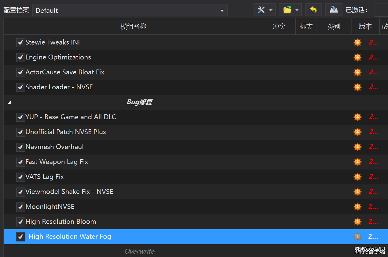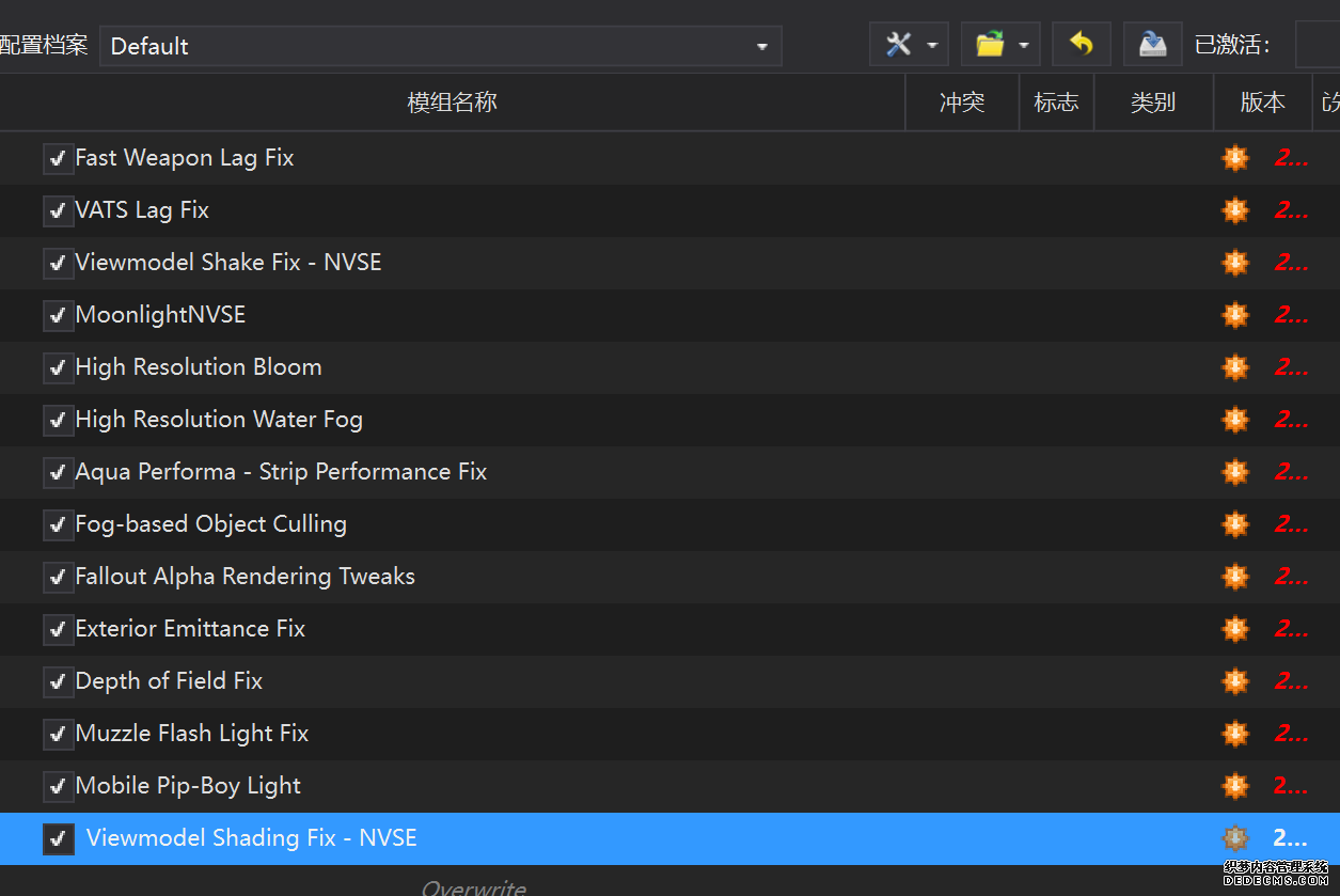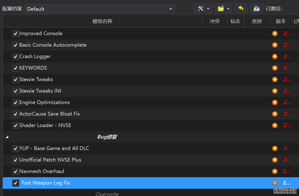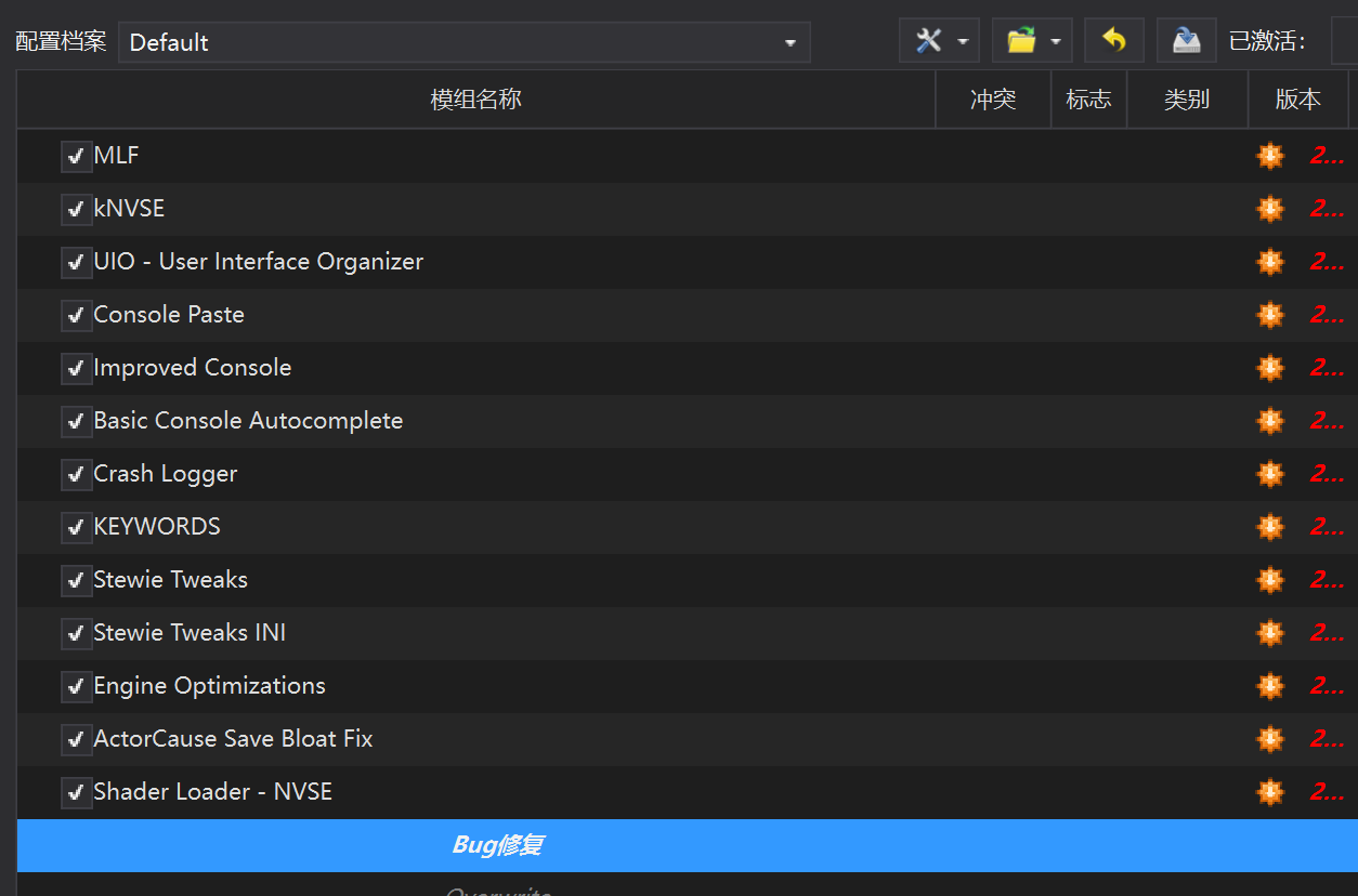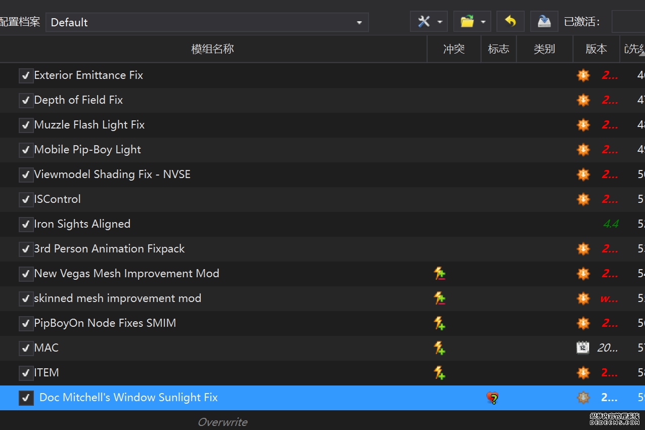 有问题首先查看常见问题及解答,如果无法解决则在介绍页面评论或者在q群问,不要在其他页面评论,更不要在知乎私信,很不方便 外挂汉化反馈QQ群:767971031 指南QQ群:761409041,提问前请至少完成基础部分,并确保没有安装不推荐列表中的任何内容 该部分中将对原版游戏存在的一些BUG进行修复,如前所述,这一部分虽然不是100%必须,但还是强烈推荐安装 ![]() 为了分类,在MO2右键-创建分隔符,命名为Bug修复,结果如图所示 新维加斯最大、最新的非官方补丁,对游戏的许多方面进行了修复 原址: https://www.nexusmods.com/newvegas/mods/51664?tab=files 下载主文件:YUP - Base Game and All DLC(第一个) ![]() 在MO2安装并勾选 利用NVSE的功能对一些BUG进行补充修复 原址: Unofficial Patch NVSE Plus 下载主文件:Unofficial Patch NVSE Plus ![]() 在MO2安装并勾选 修改游戏中的导航网格,从而改善AI寻路和战斗 原址: https://www.nexusmods.com/newvegas/mods/81003?tab=files 下载主文件:Navmesh Overhaul ![]() 在MO2安装并勾选 修复敌人生命值变更时1-10ms的固定卡顿 原址: Combat Lag Fix (NVSE) 下载主文件:Fast Weapon Lag Fix ![]() 使用MO2安装并勾选 修复了VATS显示命中率前1-2s的固定延迟 原址: VATS Lag Fix 下载主文件:VATS Lag Fix ![]() 使用MO2安装并勾选 修复浮点数精度丢失导致的机瞄不规则 原作者:WallSoGB 原址:Viewmodel Shake Fix - NVSE 下载主文件:Viewmodel Shake Fix - NVSE ![]() 直接使用MO2安装并勾选 使月亮而不是太阳在晚上充当光源 原址: https://www.nexusmods.com/newvegas/mods/77683?tab=files 下载主文件:MoonlightNVSE ![]() 在MO2中安装、勾选即可 提高泛光分辨率,减少锯齿、提高清晰度 原址: https://www.nexusmods.com/newvegas/mods/77933?tab=files 下载主文件:High Resolution Bloom ![]() 在MO2中安装并勾选 通过提高分辨率改善水中倒影的锯齿问题 原址: High Resolution Water Fog - Water Aliasing Fix 下载主文件:High Resolution Water Fog ![]() 在MO2安装并勾选 该mod和enb不兼容,指南后续也有与enb不兼容的mod,将不再进行提醒 本指南不推荐enb,如安装enb则不要向我求助 新维加斯的enb项目已经被enb作者放弃,因此有大量bug和兼容问题,想要提升视觉效果可以用天气mod、Reshade、NVR代替 通过禁用水LOD提升赌城区性能 原址: Aqua Performa - Strip Performance Fix 下载主文件:Strip Performance Fix ![]() 在MO2中安装并勾选 根据游戏的室外雾调整绘制距离,提高性能 原址: Fog-based Object Culling 下载主文件:Fog-based Object Culling ![]() 在MO2安装并勾选 修复透明渲染问题 原址: https://www.nexusmods.com/newvegas/mods/80316?tab=files 下载主文件:Fallout Alpha Rendering Tweaks ![]() 在MO2安装、勾选即可 修复导致室外粒子效果变黑的错误 原址: External Emittance Fix - NVSE 下载主文件:External Emittance Fix ![]() 在MO2安装、勾选即可 修复游戏中的景深效果问题和位深不足导致的褪色 原址: https://www.nexusmods.com/newvegas/mods/81200?tab=files 下载主文件:Depth of Field Fix ![]() 在MO2安装、勾选即可 修复了枪口火光光源在开火后不消失的问题 原址: https://www.nexusmods.com/newvegas/mods/81201?tab=files 下载主文件:Muzzle Flash Light Fix ![]() 在MO2安装、勾选即可 使哔哔小子灯光随着角色的动作而移动 原址: https://www.nexusmods.com/newvegas/mods/81203?tab=files 下载主文件:Mobile Pip-Boy Light ![]() 在MO2安装并勾选 修复了第一人称模型的镜面照明和枪口火光 原址: Viewmodel Shading Fix - NVSE ![]() 在MO2安装并勾选 对武器机瞄动画进行修复、支持游戏内调整机瞄位置 原址: ISControl Enabler and Ironsights adjuster (now ESPless) 下载主文件:ISControl ![]() 在MO2中安装,ISControl Enabler安装完成。