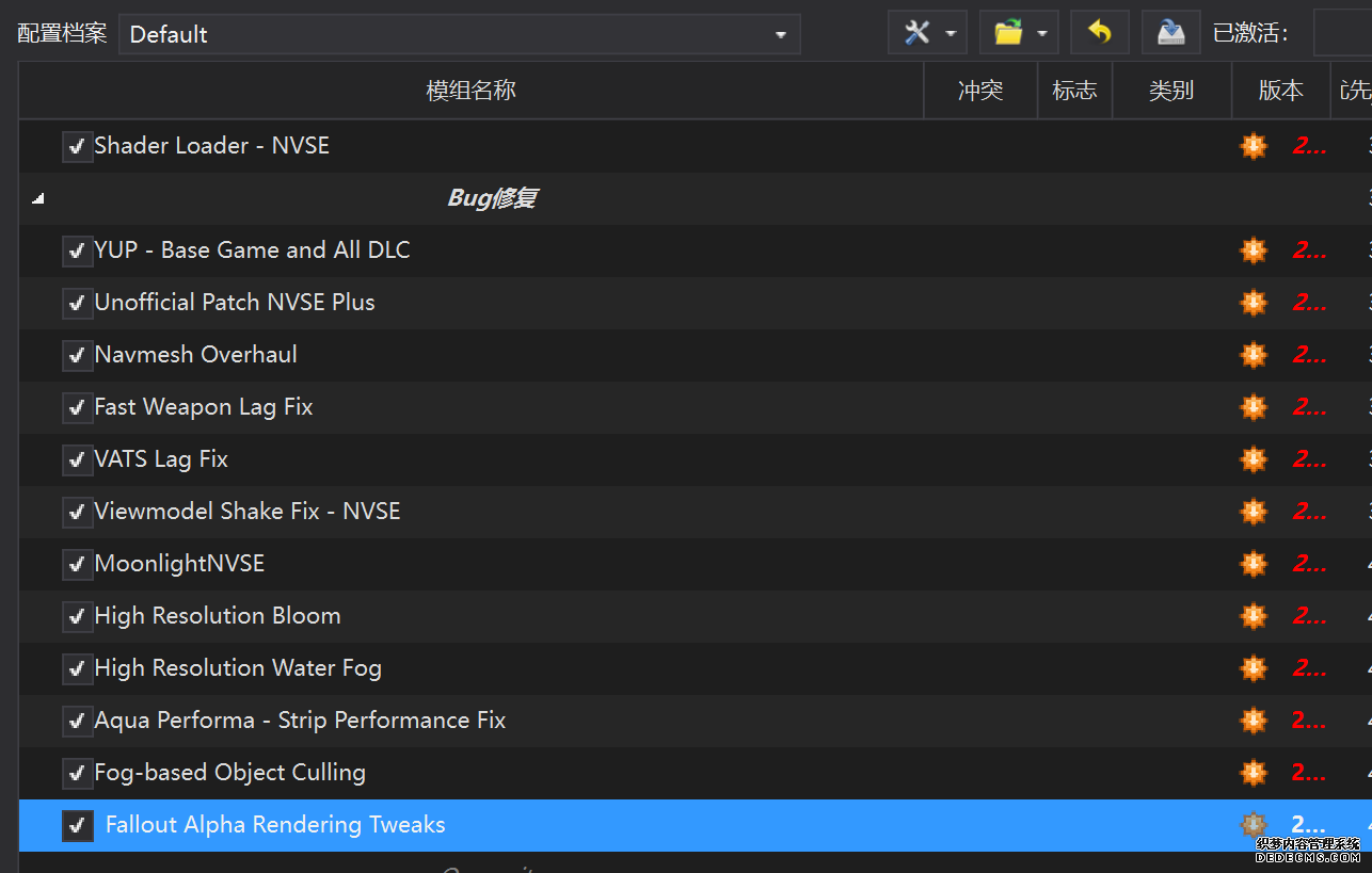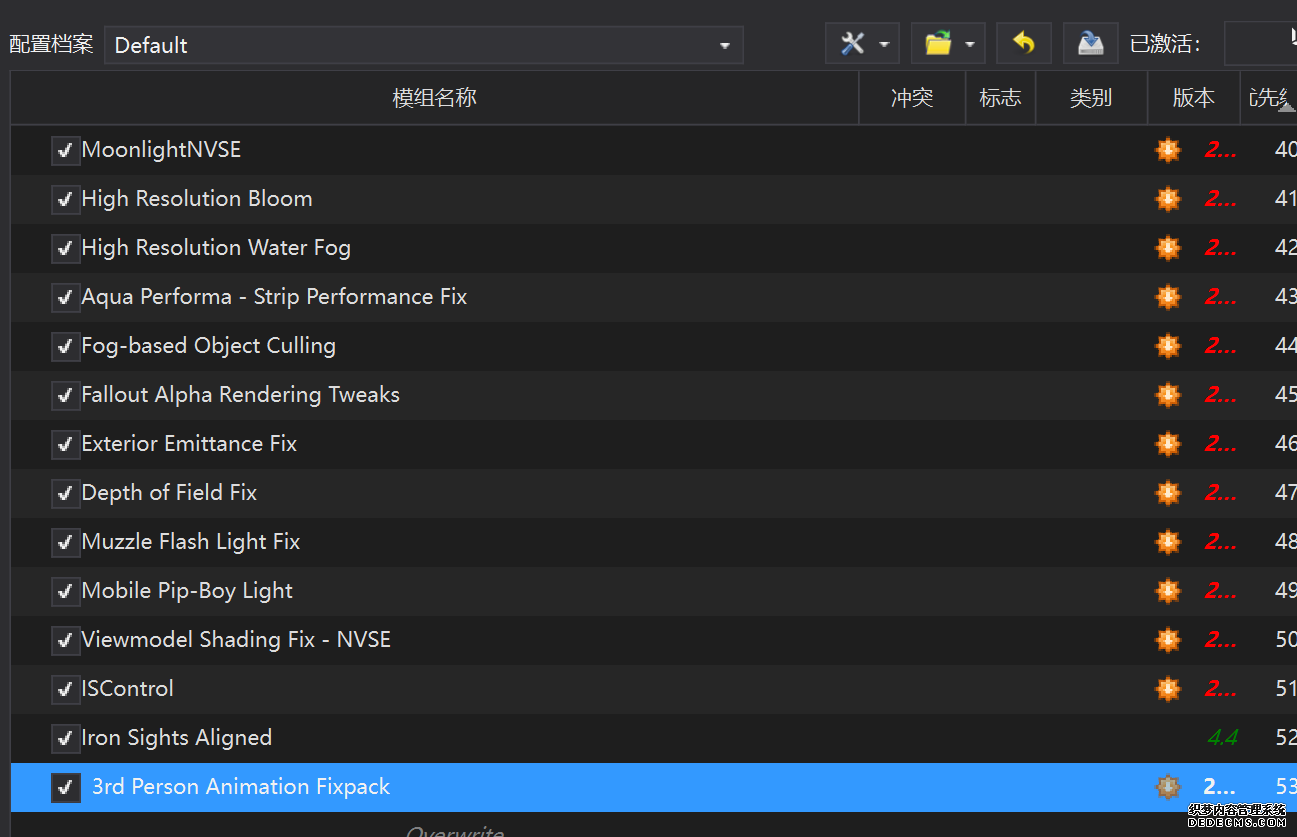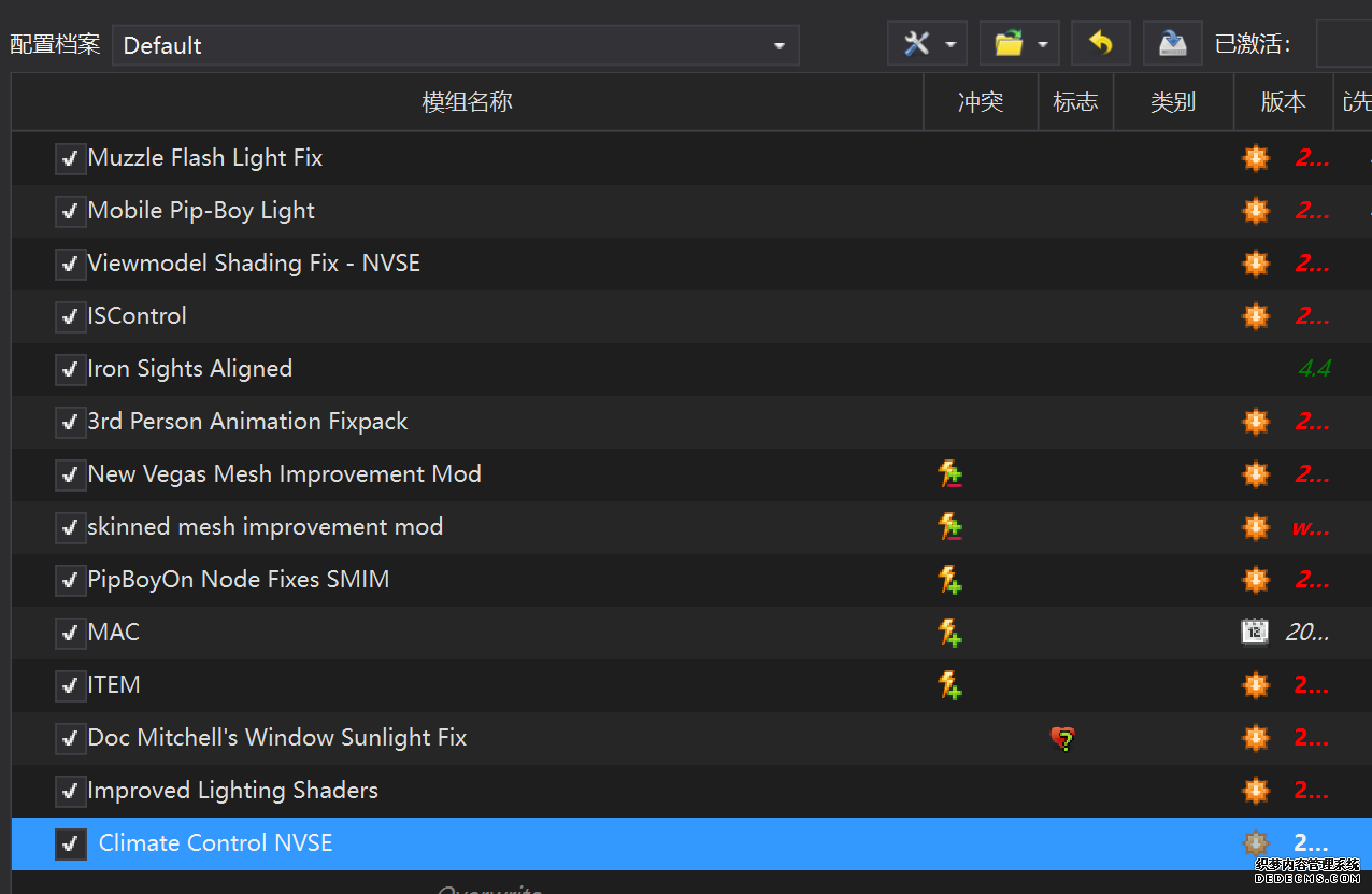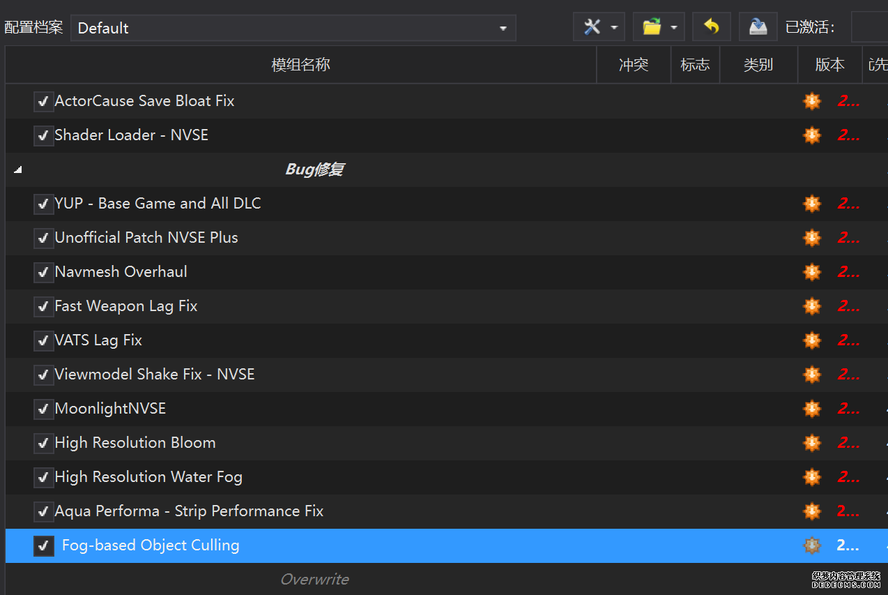 有问题首先查看常见问题及解答,如果无法解决则在介绍页面评论或者在q群问,不要在其他页面评论,更不要在知乎私信,很不方便 外挂汉化反馈QQ群:767971031 指南QQ群:761409041,提问前请至少完成基础部分,并确保没有安装不推荐列表中的任何内容 该部分中将对原版游戏存在的一些BUG进行修复,如前所述,这一部分虽然不是100%必须,但还是强烈推荐安装 ![]() 为了分类,在MO2右键-创建分隔符,命名为Bug修复,结果如图所示 新维加斯最大、最新的非官方补丁,对游戏的许多方面进行了修复 原址: https://www.nexusmods.com/newvegas/mods/51664?tab=files 下载主文件:YUP - Base Game and All DLC(第一个) ![]() 在MO2安装并勾选 利用NVSE的功能对一些BUG进行补充修复 原址: Unofficial Patch NVSE Plus 下载主文件:Unofficial Patch NVSE Plus ![]() 在MO2安装并勾选 修改游戏中的导航网格,从而改善AI寻路和战斗 原址: https://www.nexusmods.com/newvegas/mods/81003?tab=files 下载主文件:Navmesh Overhaul ![]() 在MO2安装并勾选 修复敌人生命值变更时1-10ms的固定卡顿 原址: Combat Lag Fix (NVSE) 下载主文件:Fast Weapon Lag Fix ![]() 使用MO2安装并勾选 修复了VATS显示命中率前1-2s的固定延迟 原址: VATS Lag Fix 下载主文件:VATS Lag Fix ![]() 使用MO2安装并勾选 修复浮点数精度丢失导致的机瞄不规则 原作者:WallSoGB 原址:Viewmodel Shake Fix - NVSE 下载主文件:Viewmodel Shake Fix - NVSE ![]() 直接使用MO2安装并勾选 使月亮而不是太阳在晚上充当光源 原址: https://www.nexusmods.com/newvegas/mods/77683?tab=files 下载主文件:MoonlightNVSE ![]() 在MO2中安装、勾选即可 提高泛光分辨率,减少锯齿、提高清晰度 原址: https://www.nexusmods.com/newvegas/mods/77933?tab=files 下载主文件:High Resolution Bloom ![]() 在MO2中安装并勾选 通过提高分辨率改善水中倒影的锯齿问题 原址: High Resolution Water Fog - Water Aliasing Fix 下载主文件:High Resolution Water Fog ![]() 在MO2安装并勾选 该mod和enb不兼容,指南后续也有与enb不兼容的mod,将不再进行提醒 本指南不推荐enb,如安装enb则不要向我求助 新维加斯的enb项目已经被enb作者放弃,因此有大量bug和兼容问题,想要提升视觉效果可以用天气mod、Reshade、NVR代替 通过禁用水LOD提升赌城区性能 原址: Aqua Performa - Strip Performance Fix 下载主文件:Strip Performance Fix ![]() 在MO2中安装并勾选 根据游戏的室外雾调整绘制距离,提高性能 原址: Fog-based Object Culling 下载主文件:Fog-based Object Culling ![]() 在MO2安装并勾选 修复透明渲染问题 原址: https://www.nexusmods.com/newvegas/mods/80316?tab=files 下载主文件:Fallout Alpha Rendering Tweaks ![]() 在MO2安装、勾选即可 修复导致室外粒子效果变黑的错误 原址: External Emittance Fix - NVSE 下载主文件:External Emittance Fix ![]() 在MO2安装、勾选即可 修复游戏中的景深效果问题和位深不足导致的褪色 原址: https://www.nexusmods.com/newvegas/mods/81200?tab=files 下载主文件:Depth of Field Fix ![]() 在MO2安装、勾选即可 修复了枪口火光光源在开火后不消失的问题 原址: https://www.nexusmods.com/newvegas/mods/81201?tab=files 下载主文件:Muzzle Flash Light Fix ![]() 在MO2安装、勾选即可 使哔哔小子灯光随着角色的动作而移动 原址: https://www.nexusmods.com/newvegas/mods/81203?tab=files 下载主文件:Mobile Pip-Boy Light ![]() 在MO2安装并勾选 修复了第一人称模型的镜面照明和枪口火光 原址: Viewmodel Shading Fix - NVSE ![]() 在MO2安装并勾选 对武器机瞄动画进行修复、支持游戏内调整机瞄位置 原址: ISControl Enabler and Ironsights adjuster (now ESPless) 下载主文件:ISControl ![]() 在MO2中安装,ISControl Enabler安装完成。