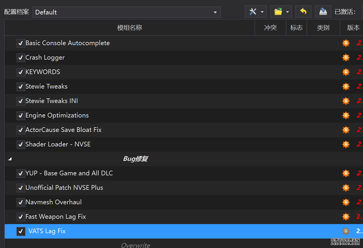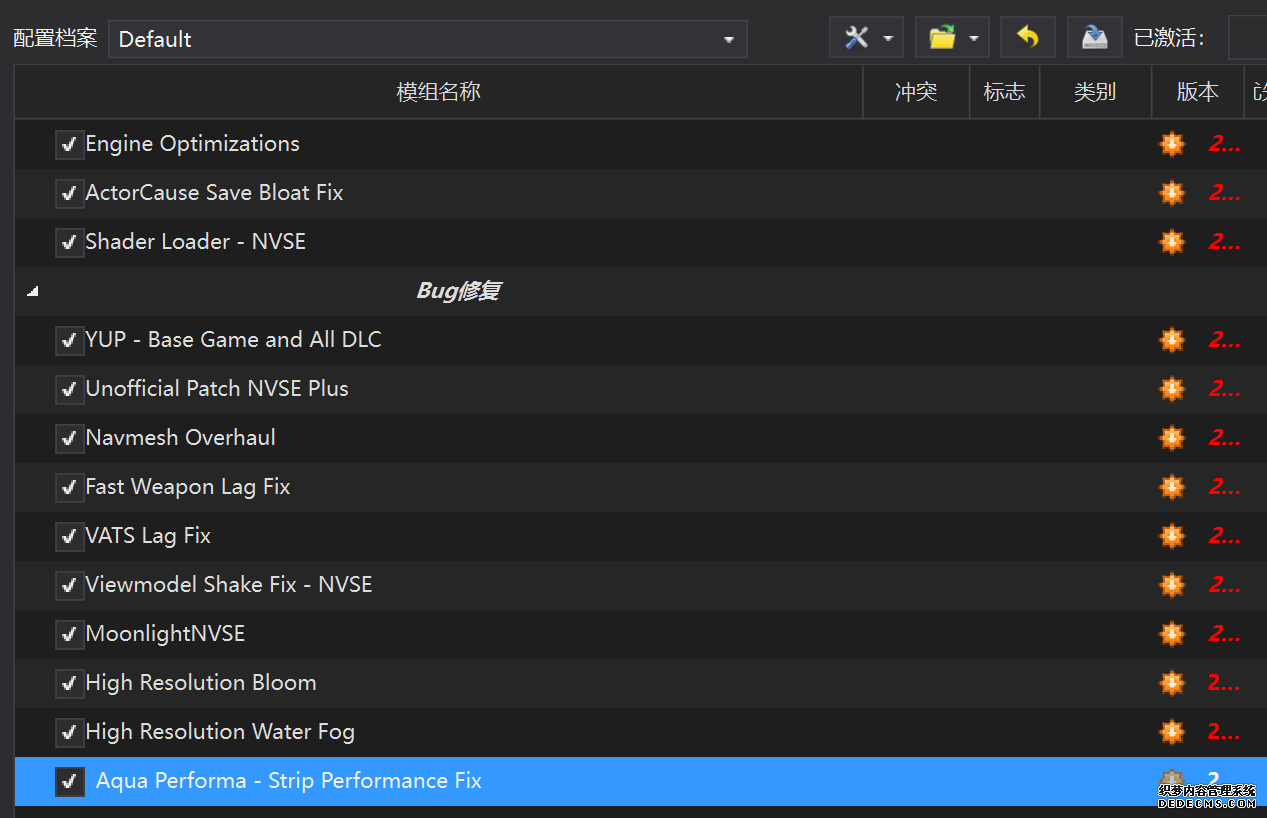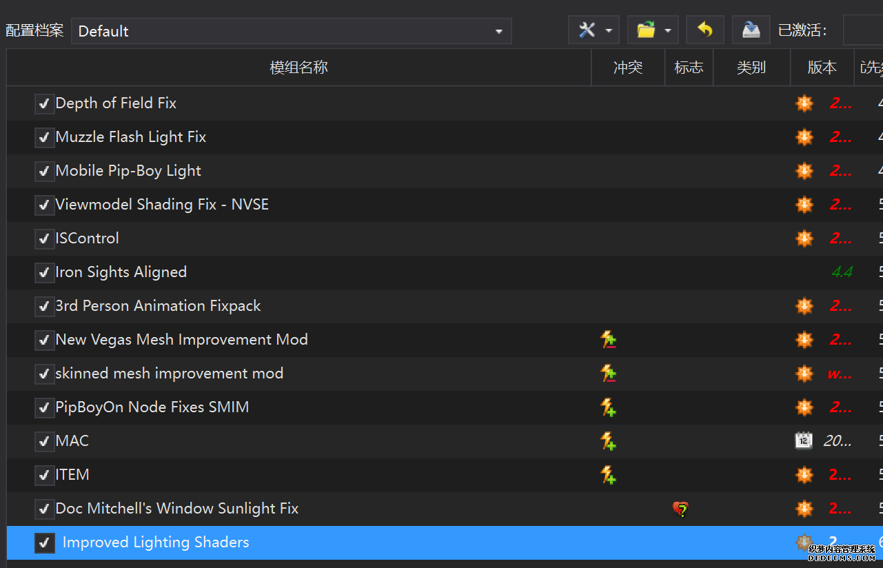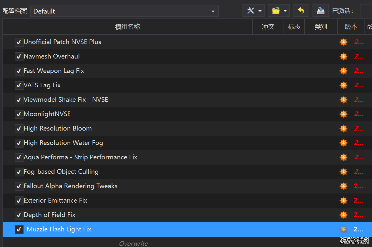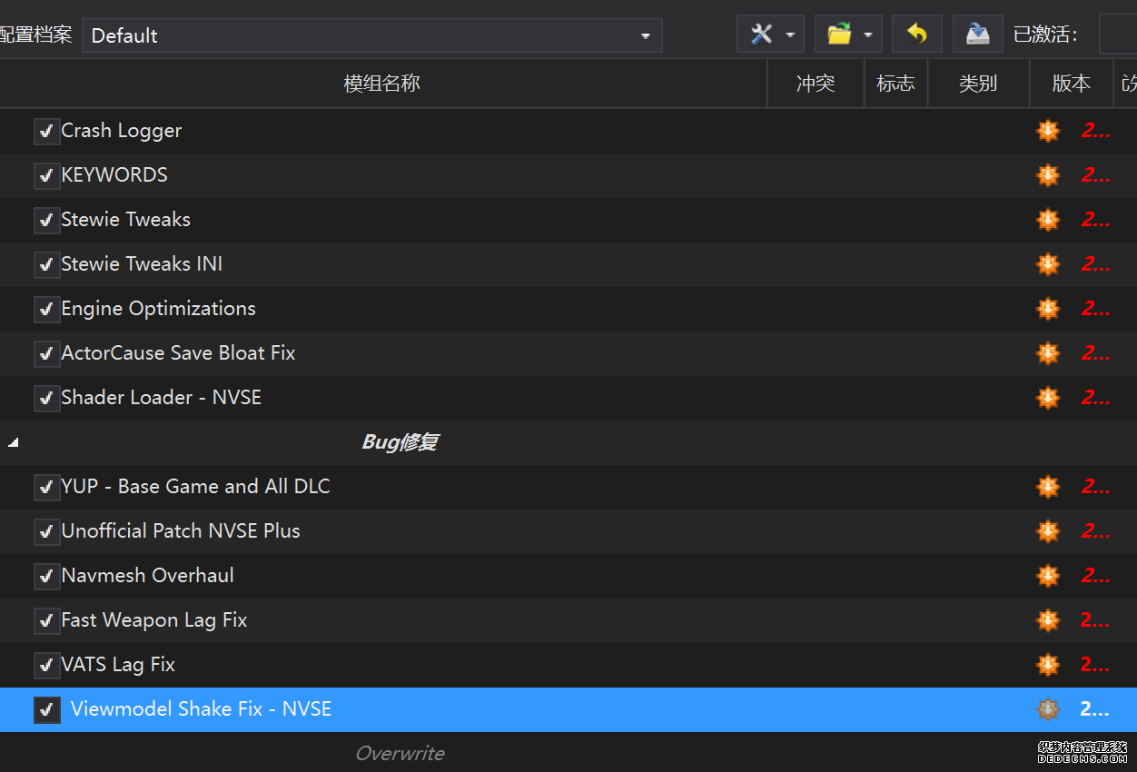 有问题首先查看常见问题及解答,如果无法解决则在介绍页面评论或者在q群问,不要在其他页面评论,更不要在知乎私信,很不方便 外挂汉化反馈QQ群:767971031 指南QQ群:761409041,提问前请至少完成基础部分,并确保没有安装不推荐列表中的任何内容 该部分中将对原版游戏存在的一些BUG进行修复,如前所述,这一部分虽然不是100%必须,但还是强烈推荐安装 ![]() 为了分类,在MO2右键-创建分隔符,命名为Bug修复,结果如图所示 新维加斯最大、最新的非官方补丁,对游戏的许多方面进行了修复 原址: https://www.nexusmods.com/newvegas/mods/51664?tab=files 下载主文件:YUP - Base Game and All DLC(第一个) ![]() 在MO2安装并勾选 利用NVSE的功能对一些BUG进行补充修复 原址: Unofficial Patch NVSE Plus 下载主文件:Unofficial Patch NVSE Plus ![]() 在MO2安装并勾选 修改游戏中的导航网格,从而改善AI寻路和战斗 原址: https://www.nexusmods.com/newvegas/mods/81003?tab=files 下载主文件:Navmesh Overhaul ![]() 在MO2安装并勾选 修复敌人生命值变更时1-10ms的固定卡顿 原址: Combat Lag Fix (NVSE) 下载主文件:Fast Weapon Lag Fix ![]() 使用MO2安装并勾选 修复了VATS显示命中率前1-2s的固定延迟 原址: VATS Lag Fix 下载主文件:VATS Lag Fix ![]() 使用MO2安装并勾选 修复浮点数精度丢失导致的机瞄不规则 原作者:WallSoGB 原址:Viewmodel Shake Fix - NVSE 下载主文件:Viewmodel Shake Fix - NVSE ![]() 直接使用MO2安装并勾选 使月亮而不是太阳在晚上充当光源 原址: https://www.nexusmods.com/newvegas/mods/77683?tab=files 下载主文件:MoonlightNVSE ![]() 在MO2中安装、勾选即可 提高泛光分辨率,减少锯齿、提高清晰度 原址: https://www.nexusmods.com/newvegas/mods/77933?tab=files 下载主文件:High Resolution Bloom ![]() 在MO2中安装并勾选 通过提高分辨率改善水中倒影的锯齿问题 原址: High Resolution Water Fog - Water Aliasing Fix 下载主文件:High Resolution Water Fog ![]() 在MO2安装并勾选 该mod和enb不兼容,指南后续也有与enb不兼容的mod,将不再进行提醒 本指南不推荐enb,如安装enb则不要向我求助 新维加斯的enb项目已经被enb作者放弃,因此有大量bug和兼容问题,想要提升视觉效果可以用天气mod、Reshade、NVR代替 通过禁用水LOD提升赌城区性能 原址: Aqua Performa - Strip Performance Fix 下载主文件:Strip Performance Fix ![]() 在MO2中安装并勾选 根据游戏的室外雾调整绘制距离,提高性能 原址: Fog-based Object Culling 下载主文件:Fog-based Object Culling ![]() 在MO2安装并勾选 修复透明渲染问题 原址: https://www.nexusmods.com/newvegas/mods/80316?tab=files 下载主文件:Fallout Alpha Rendering Tweaks ![]() 在MO2安装、勾选即可 修复导致室外粒子效果变黑的错误 原址: External Emittance Fix - NVSE 下载主文件:External Emittance Fix ![]() 在MO2安装、勾选即可 修复游戏中的景深效果问题和位深不足导致的褪色 原址: https://www.nexusmods.com/newvegas/mods/81200?tab=files 下载主文件:Depth of Field Fix ![]() 在MO2安装、勾选即可 修复了枪口火光光源在开火后不消失的问题 原址: https://www.nexusmods.com/newvegas/mods/81201?tab=files 下载主文件:Muzzle Flash Light Fix ![]() 在MO2安装、勾选即可 使哔哔小子灯光随着角色的动作而移动 原址: https://www.nexusmods.com/newvegas/mods/81203?tab=files 下载主文件:Mobile Pip-Boy Light ![]() 在MO2安装并勾选 修复了第一人称模型的镜面照明和枪口火光 原址: Viewmodel Shading Fix - NVSE ![]() 在MO2安装并勾选 对武器机瞄动画进行修复、支持游戏内调整机瞄位置 原址: ISControl Enabler and Ironsights adjuster (now ESPless) 下载主文件:ISControl ![]() 在MO2中安装,ISControl Enabler安装完成。