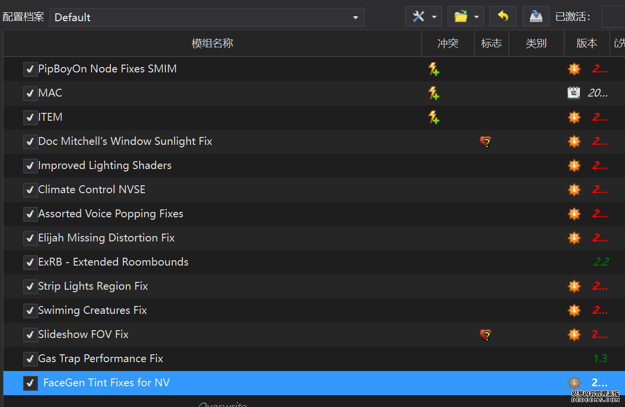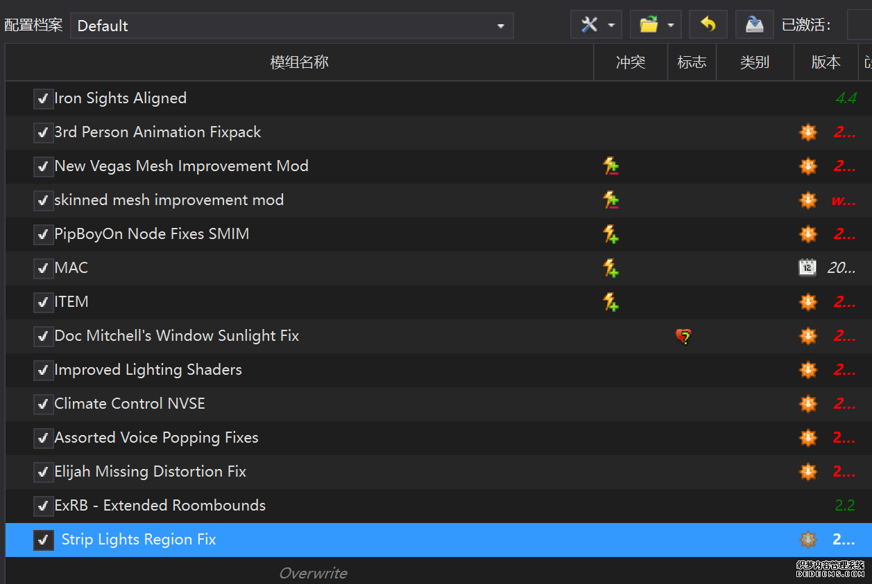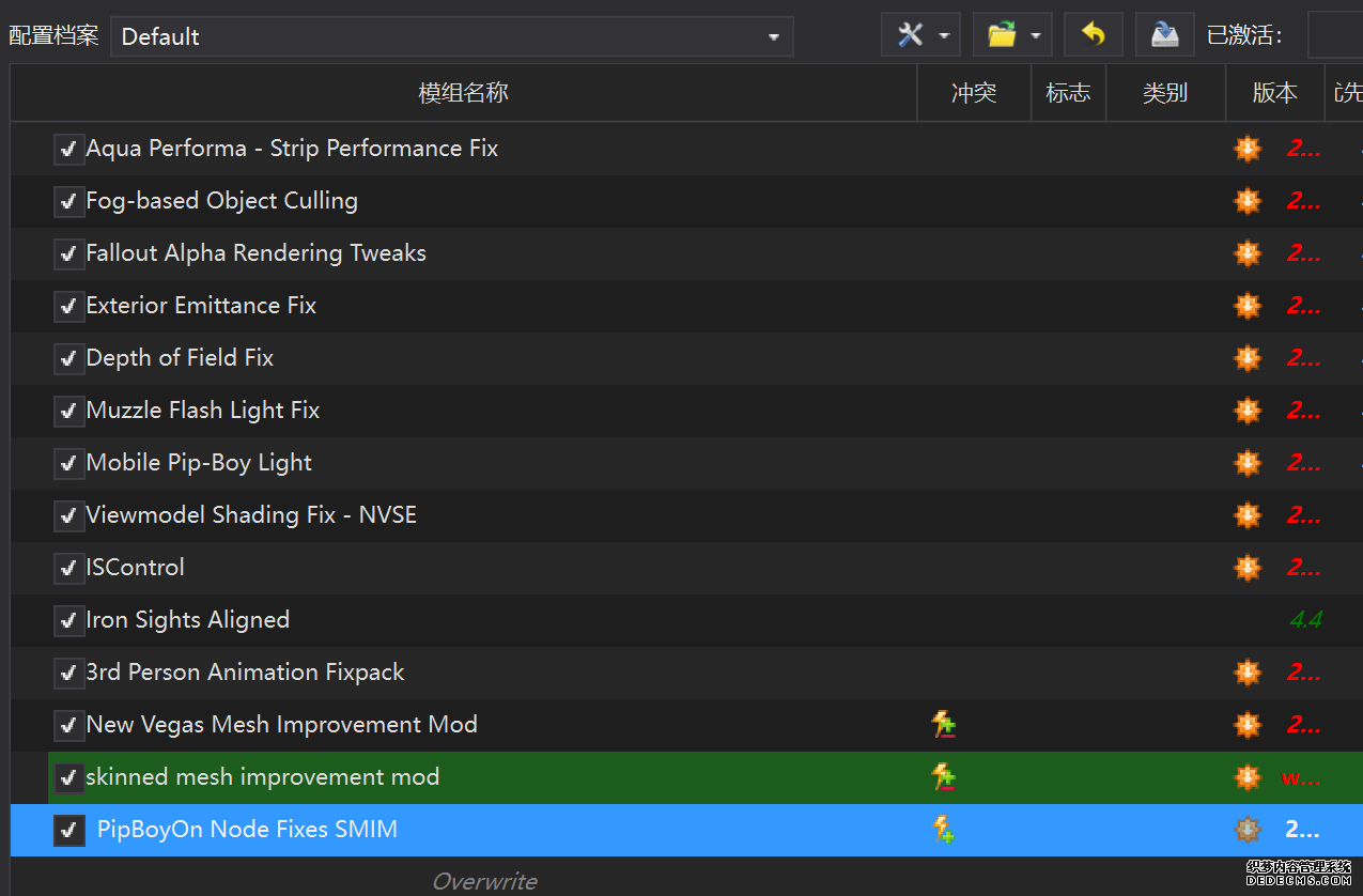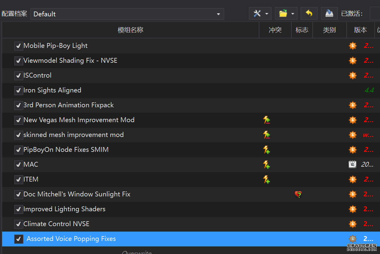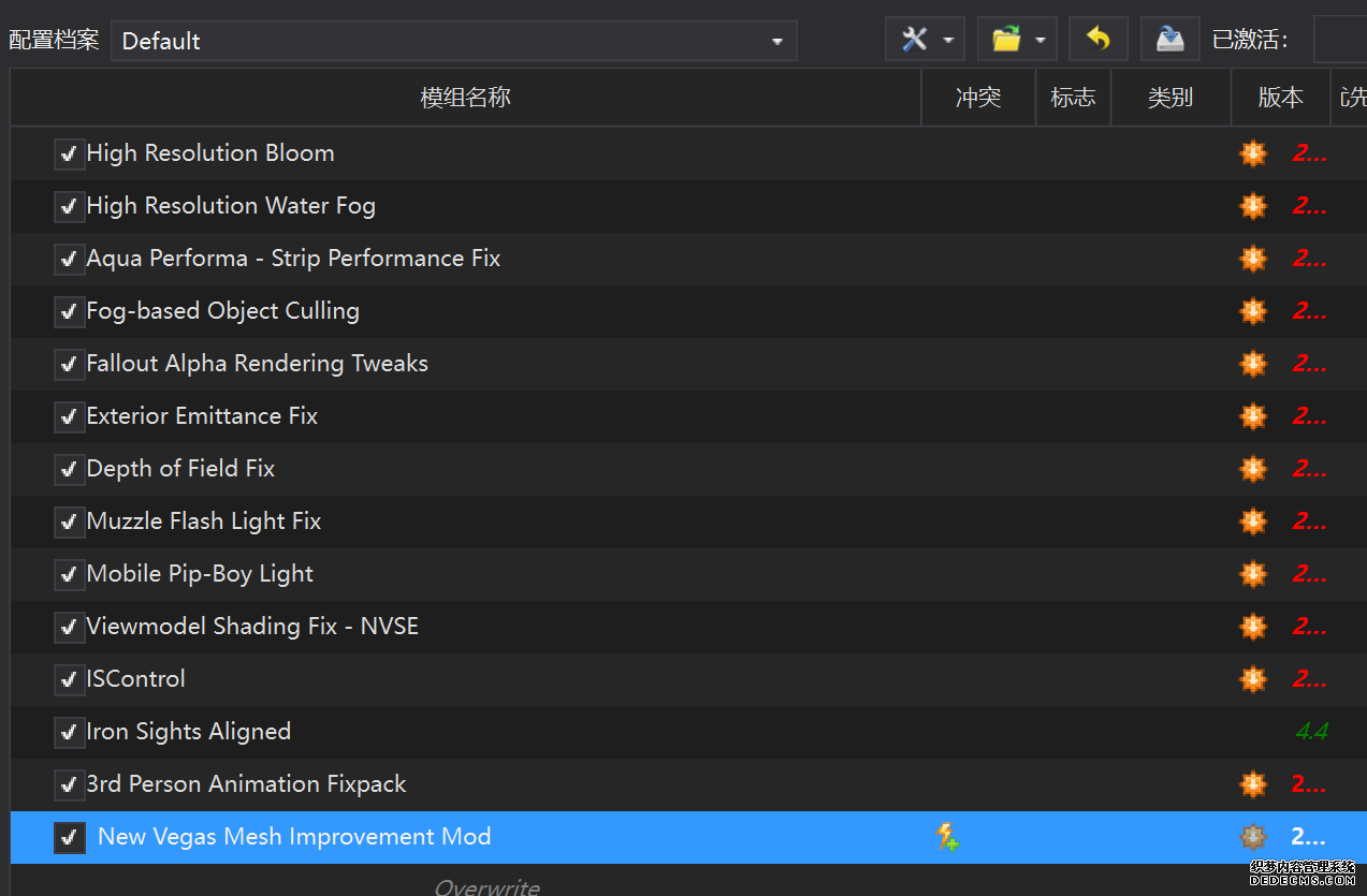 利用ISControl的功能使机瞄位置正确校准 原址: https://www.nexusmods.com/newvegas/mods/81933?tab=files 下载主文件:Iron Sights Aligned ![]() 使用MO2打开,直接点击安装 ![]() 在MO2勾选即可 当前安装配置针对无动画包安装的情况,指南后半部分安装动画包或自行安装动画包需要再次安装该mod-调整安装配置-选择覆盖原mod 修复原版第三人称动画的一些问题 原址: https://www.nexusmods.com/newvegas/mods/85198?tab=files 安装主文件:3rd Person Animation Fixpack ![]() 在MO2安装并勾选 对游戏内的许多网格模型进行修复 原址: New Vegas Mesh Improvement Mod - NVMIM 下载主文件:New Vegas Mesh Improvement Mod ![]() 使用MO2安装并勾选 对一系列生物模型进行改进 原址: skinned mesh improvement mod - redone redux remake retry revengeance retopology refridgerator 下载主文件:skinne d mesh improvement mod ![]() 用MO2打开,直接点击安装 ![]() 勾选即可 修复Pip-boy视角下部分装甲的视觉错误 原址: PipBoyOn Node Fixes 下载主文件:PipBoyOn Node Fixes SMIM(不是PipBoyOn Node Fixes NV) ![]() 在MO2安装、勾选即可 修复网格、碰撞箱 原址: https://www.nexusmods.com/newvegas/mods/83815?tab=files 下载主文件:MAC-10 ![]() 在MO2安装、勾选即可 修复摆动物品浮空等问题 原址: https://www.nexusmods.com/newvegas/mods/85622?tab=files 下载主文件:ITEM ![]() MO2安装、勾选即可 修复了开局场景中的一个视觉错误 原址: https://www.nexusmods.com/newvegas/mods/86437?tab=files 下载主文件:Doc Mitchell's Window Sunlight Fix ![]() MO2安装、勾选即可 对原版照明Bug进行修复、提高同时渲染的最大光源数量 原址: Improved Lighting Shaders 下载主文件:Improved Lighting Shaders ![]() 使用MO2安装并勾选 修复室内天气问题并为天气Mod提供扩展 原址: Climate Control NVSE 下载主文件:Climate Control NVSE ![]() 在MO2中安装并勾选 修复部分音频的爆音问题 原址: Misc Audio Tweaks and Fixes 下载主文件:Assorted Voice Popping Fixes 下载主文件:Elijah Missing Distortion Fix ![]() ![]() 在MO2分别安装、勾选即可 通过利用原版的roombounds功能提供更好的室内功能 原址: ExRB - Extended Roombounds 下载主文件:ExRB ![]() 用MO2打开,确认已经选中Full (YUP),点击下一步 ![]() 直接点击安装 ![]() 在MO2勾选即可 使赌城区的灯光在更远的地方可见 原址: https://www.nexusmods.com/newvegas/mods/73596?tab=files 下载主文件:Strip Lights Region Fix ![]() 在MO2安装并勾选 为部分生物启用不知为何已存在但被禁用的游泳动画 原址: https://www.nexusmods.com/newvegas/mods/83094?tab=files 下载主文件:Swiming Creatures Fix ![]() 在MO2安装、勾选即可 修复自定义FOV在幻灯片播放时的问题 原址: Slideshow FOV Fix - ESPLess 下载主文件:Slideshow FOV Fix ![]() 在MO2安装并勾选 修复气体陷阱导致的性能问题 原址: https://www.nexusmods.com/newvegas/mods/88587?tab=files 下载主文件:Gas Trap Performance Fix ![]() 用MO2打开,直接点击安装 ![]() 在MO2勾选即可 修复角色脸上的奇怪绿色 原址: https://www.nexusmods.com/newvegas/mods/71577?tab=files 下载主文件:FaceGen Tint Fixes for NV ![]() 在MO2安装并勾选 修复血液贴花在特定条件下的闪烁问题 原址: https://www.nexusmods.com/newvegas/mods/87830?tab=files 下载主文件:Blood Decal Flashing Fix ![]() 在MO2安装并勾选 减轻地形材质造成的接缝问题 原址: https://www.nexusmods.com/newvegas/mods/83425?tab=files ![]() 选择FNV,并点击下一步 ![]() 只勾选YUP Patch,并点击安装 ![]() 出现该错误是正常的,直接点击确定即可 ![]() 在MO2勾选 至此,Bug修复部分完成 有能力的建议阅读此指南:Fallout New Vegas Performance and Stability Guide,使新维加斯的性能最大化 由于不同玩家口味不同,本指南分为两部分