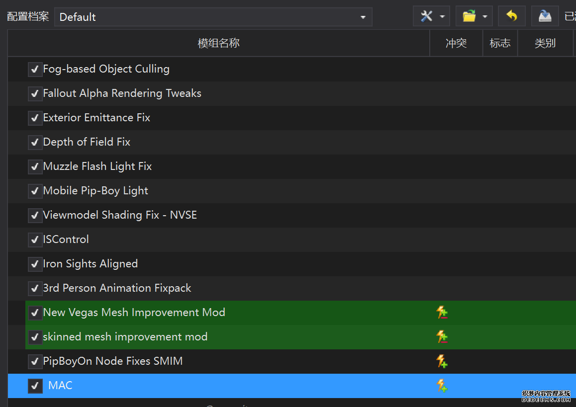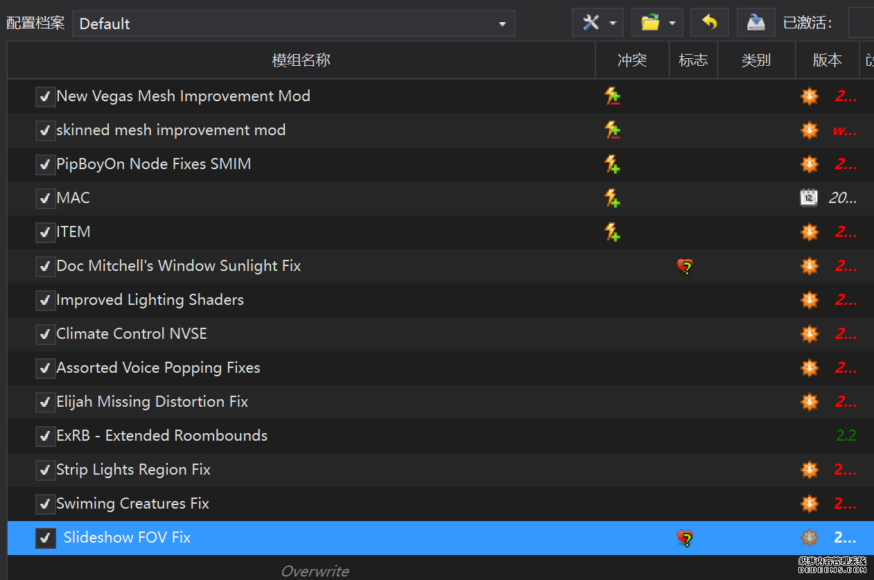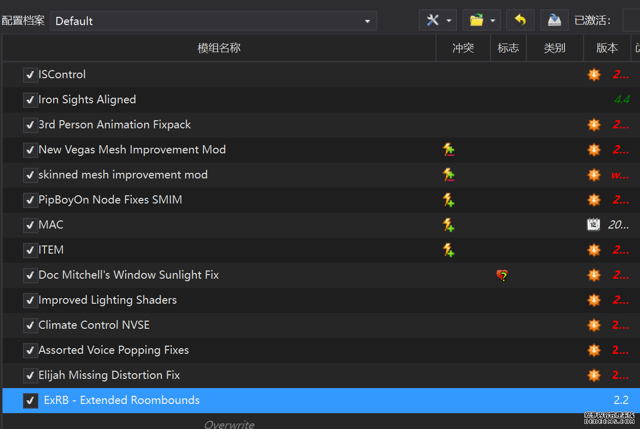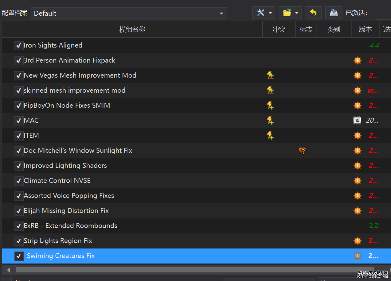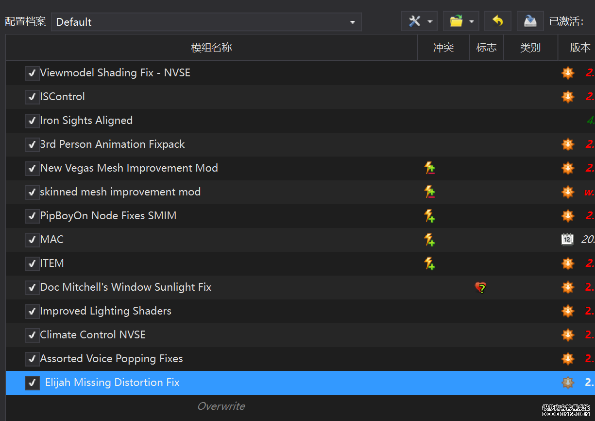 利用ISControl的功能使机瞄位置正确校准 原址: https://www.nexusmods.com/newvegas/mods/81933?tab=files 下载主文件:Iron Sights Aligned ![]() 使用MO2打开,直接点击安装 ![]() 在MO2勾选即可 当前安装配置针对无动画包安装的情况,指南后半部分安装动画包或自行安装动画包需要再次安装该mod-调整安装配置-选择覆盖原mod 修复原版第三人称动画的一些问题 原址: https://www.nexusmods.com/newvegas/mods/85198?tab=files 安装主文件:3rd Person Animation Fixpack ![]() 在MO2安装并勾选 对游戏内的许多网格模型进行修复 原址: New Vegas Mesh Improvement Mod - NVMIM 下载主文件:New Vegas Mesh Improvement Mod ![]() 使用MO2安装并勾选 对一系列生物模型进行改进 原址: skinned mesh improvement mod - redone redux remake retry revengeance retopology refridgerator 下载主文件:skinne d mesh improvement mod ![]() 用MO2打开,直接点击安装 ![]() 勾选即可 修复Pip-boy视角下部分装甲的视觉错误 原址: PipBoyOn Node Fixes 下载主文件:PipBoyOn Node Fixes SMIM(不是PipBoyOn Node Fixes NV) ![]() 在MO2安装、勾选即可 修复网格、碰撞箱 原址: https://www.nexusmods.com/newvegas/mods/83815?tab=files 下载主文件:MAC-10 ![]() 在MO2安装、勾选即可 修复摆动物品浮空等问题 原址: https://www.nexusmods.com/newvegas/mods/85622?tab=files 下载主文件:ITEM ![]() MO2安装、勾选即可 修复了开局场景中的一个视觉错误 原址: https://www.nexusmods.com/newvegas/mods/86437?tab=files 下载主文件:Doc Mitchell's Window Sunlight Fix ![]() MO2安装、勾选即可 对原版照明Bug进行修复、提高同时渲染的最大光源数量 原址: Improved Lighting Shaders 下载主文件:Improved Lighting Shaders ![]() 使用MO2安装并勾选 修复室内天气问题并为天气Mod提供扩展 原址: Climate Control NVSE 下载主文件:Climate Control NVSE ![]() 在MO2中安装并勾选 修复部分音频的爆音问题 原址: Misc Audio Tweaks and Fixes 下载主文件:Assorted Voice Popping Fixes 下载主文件:Elijah Missing Distortion Fix ![]() ![]() 在MO2分别安装、勾选即可 通过利用原版的roombounds功能提供更好的室内功能 原址: ExRB - Extended Roombounds 下载主文件:ExRB ![]() 用MO2打开,确认已经选中Full (YUP),点击下一步 ![]() 直接点击安装 ![]() 在MO2勾选即可 使赌城区的灯光在更远的地方可见 原址: https://www.nexusmods.com/newvegas/mods/73596?tab=files 下载主文件:Strip Lights Region Fix ![]() 在MO2安装并勾选 为部分生物启用不知为何已存在但被禁用的游泳动画 原址: https://www.nexusmods.com/newvegas/mods/83094?tab=files 下载主文件:Swiming Creatures Fix ![]() 在MO2安装、勾选即可 修复自定义FOV在幻灯片播放时的问题 原址: Slideshow FOV Fix - ESPLess 下载主文件:Slideshow FOV Fix ![]() 在MO2安装并勾选 修复气体陷阱导致的性能问题 原址: https://www.nexusmods.com/newvegas/mods/88587?tab=files 下载主文件:Gas Trap Performance Fix ![]() 用MO2打开,直接点击安装 ![]() 在MO2勾选即可 修复角色脸上的奇怪绿色 原址: https://www.nexusmods.com/newvegas/mods/71577?tab=files 下载主文件:FaceGen Tint Fixes for NV ![]() 在MO2安装并勾选 修复血液贴花在特定条件下的闪烁问题 原址: https://www.nexusmods.com/newvegas/mods/87830?tab=files 下载主文件:Blood Decal Flashing Fix ![]() 在MO2安装并勾选 减轻地形材质造成的接缝问题 原址: https://www.nexusmods.com/newvegas/mods/83425?tab=files ![]() 选择FNV,并点击下一步 ![]() 只勾选YUP Patch,并点击安装 ![]() 出现该错误是正常的,直接点击确定即可 ![]() 在MO2勾选 至此,Bug修复部分完成 有能力的建议阅读此指南:Fallout New Vegas Performance and Stability Guide,使新维加斯的性能最大化 由于不同玩家口味不同,本指南分为两部分