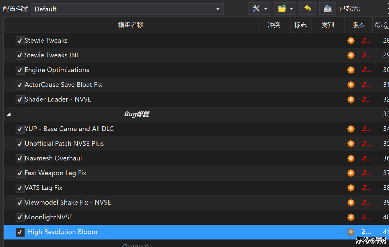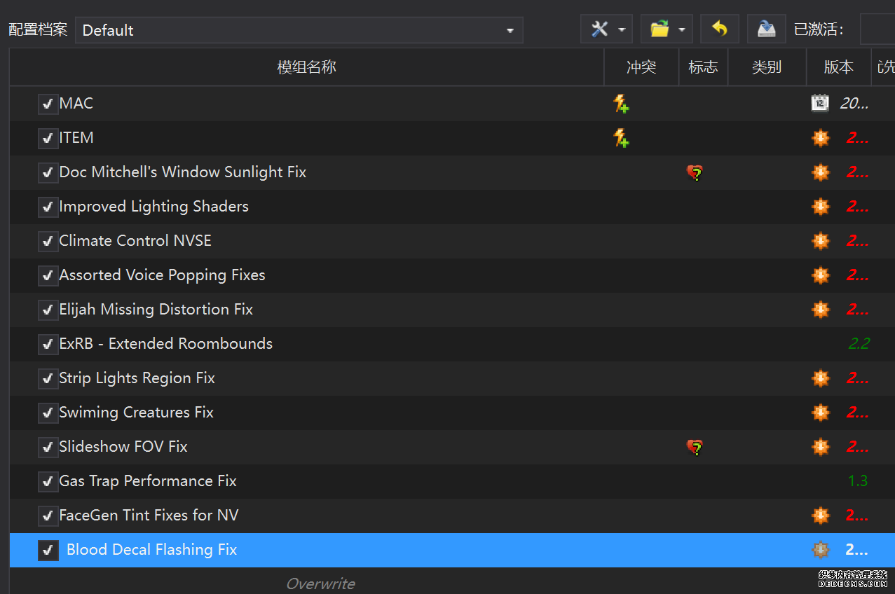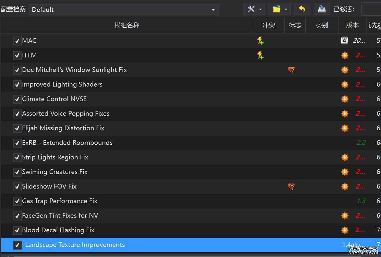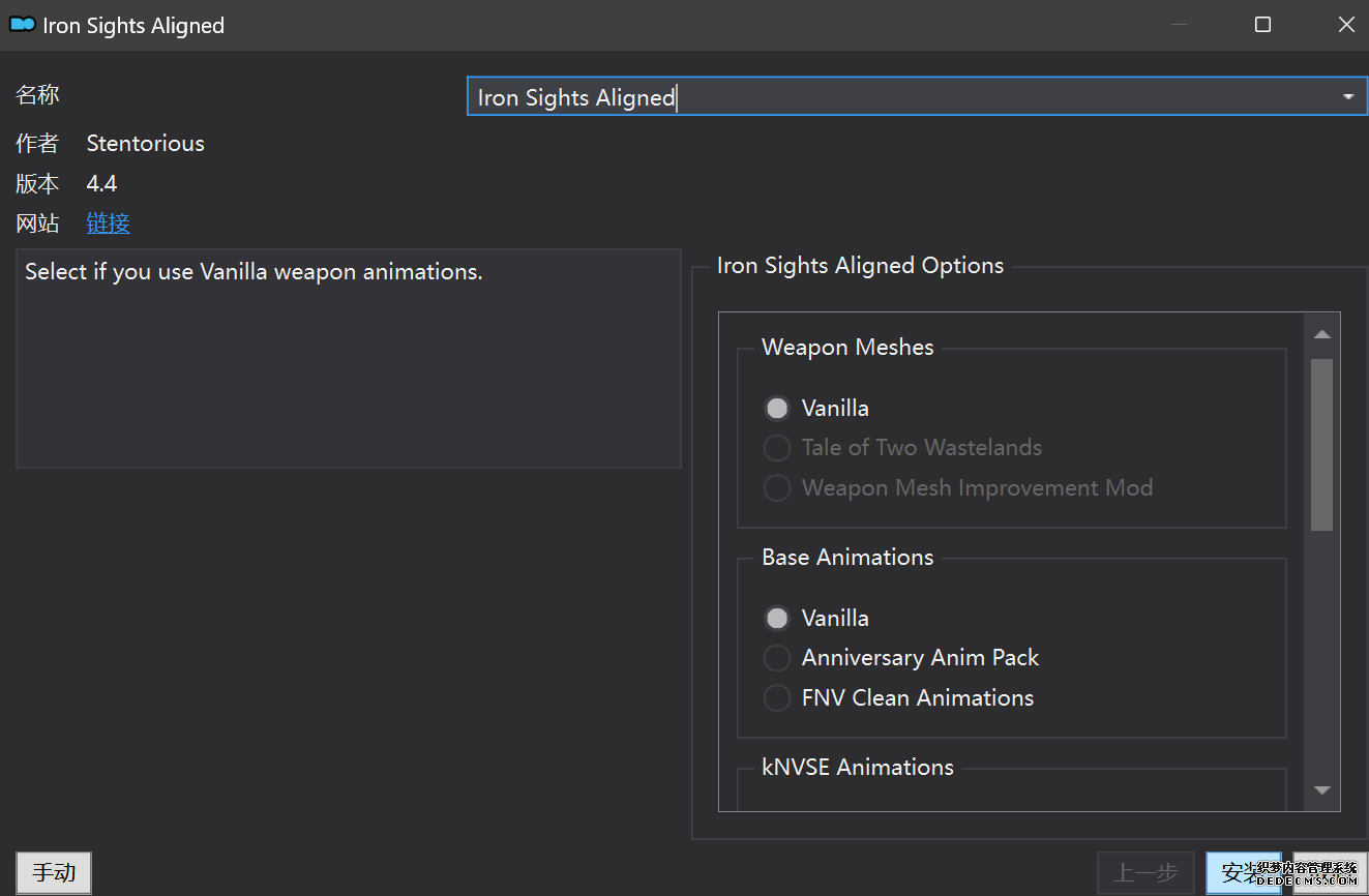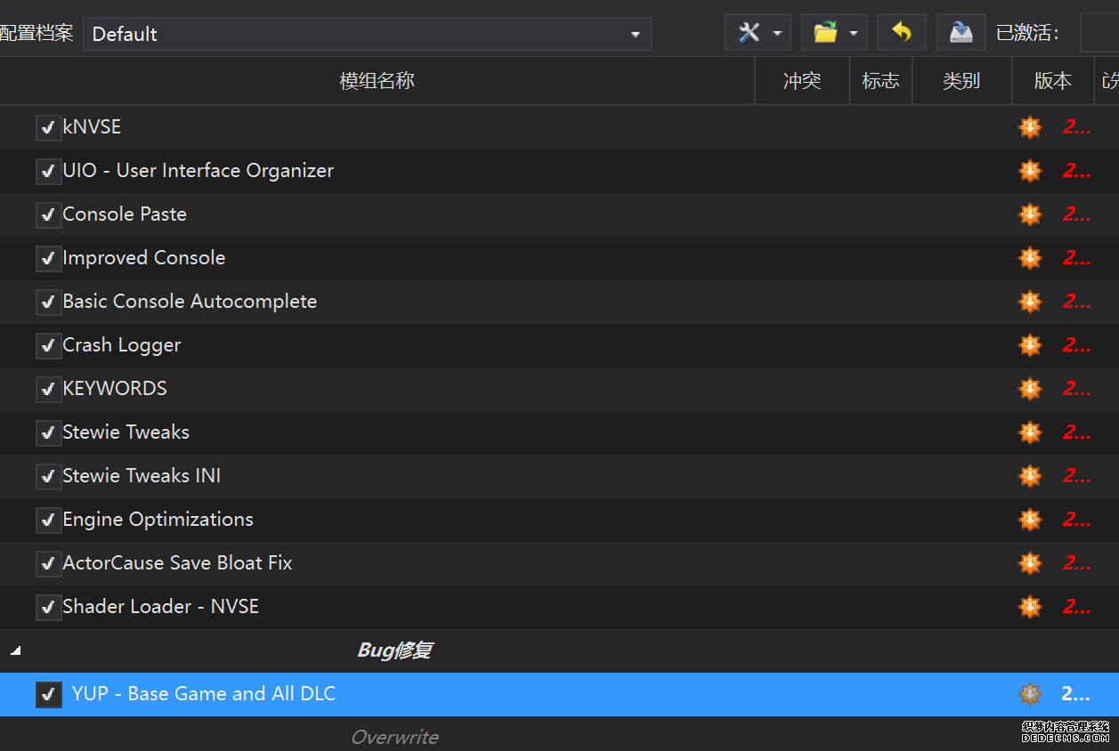 利用ISControl的功能使机瞄位置正确校准 原址: https://www.nexusmods.com/newvegas/mods/81933?tab=files 下载主文件:Iron Sights Aligned ![]() 使用MO2打开,直接点击安装 ![]() 在MO2勾选即可 当前安装配置针对无动画包安装的情况,指南后半部分安装动画包或自行安装动画包需要再次安装该mod-调整安装配置-选择覆盖原mod 修复原版第三人称动画的一些问题 原址: https://www.nexusmods.com/newvegas/mods/85198?tab=files 安装主文件:3rd Person Animation Fixpack ![]() 在MO2安装并勾选 对游戏内的许多网格模型进行修复 原址: New Vegas Mesh Improvement Mod - NVMIM 下载主文件:New Vegas Mesh Improvement Mod ![]() 使用MO2安装并勾选 对一系列生物模型进行改进 原址: skinned mesh improvement mod - redone redux remake retry revengeance retopology refridgerator 下载主文件:skinne d mesh improvement mod ![]() 用MO2打开,直接点击安装 ![]() 勾选即可 修复Pip-boy视角下部分装甲的视觉错误 原址: PipBoyOn Node Fixes 下载主文件:PipBoyOn Node Fixes SMIM(不是PipBoyOn Node Fixes NV) ![]() 在MO2安装、勾选即可 修复网格、碰撞箱 原址: https://www.nexusmods.com/newvegas/mods/83815?tab=files 下载主文件:MAC-10 ![]() 在MO2安装、勾选即可 修复摆动物品浮空等问题 原址: https://www.nexusmods.com/newvegas/mods/85622?tab=files 下载主文件:ITEM ![]() MO2安装、勾选即可 修复了开局场景中的一个视觉错误 原址: https://www.nexusmods.com/newvegas/mods/86437?tab=files 下载主文件:Doc Mitchell's Window Sunlight Fix ![]() MO2安装、勾选即可 对原版照明Bug进行修复、提高同时渲染的最大光源数量 原址: Improved Lighting Shaders 下载主文件:Improved Lighting Shaders ![]() 使用MO2安装并勾选 修复室内天气问题并为天气Mod提供扩展 原址: Climate Control NVSE 下载主文件:Climate Control NVSE ![]() 在MO2中安装并勾选 修复部分音频的爆音问题 原址: Misc Audio Tweaks and Fixes 下载主文件:Assorted Voice Popping Fixes 下载主文件:Elijah Missing Distortion Fix ![]() ![]() 在MO2分别安装、勾选即可 通过利用原版的roombounds功能提供更好的室内功能 原址: ExRB - Extended Roombounds 下载主文件:ExRB ![]() 用MO2打开,确认已经选中Full (YUP),点击下一步 ![]() 直接点击安装 ![]() 在MO2勾选即可 使赌城区的灯光在更远的地方可见 原址: https://www.nexusmods.com/newvegas/mods/73596?tab=files 下载主文件:Strip Lights Region Fix ![]() 在MO2安装并勾选 为部分生物启用不知为何已存在但被禁用的游泳动画 原址: https://www.nexusmods.com/newvegas/mods/83094?tab=files 下载主文件:Swiming Creatures Fix ![]() 在MO2安装、勾选即可 修复自定义FOV在幻灯片播放时的问题 原址: Slideshow FOV Fix - ESPLess 下载主文件:Slideshow FOV Fix ![]() 在MO2安装并勾选 修复气体陷阱导致的性能问题 原址: https://www.nexusmods.com/newvegas/mods/88587?tab=files 下载主文件:Gas Trap Performance Fix ![]() 用MO2打开,直接点击安装 ![]() 在MO2勾选即可 修复角色脸上的奇怪绿色 原址: https://www.nexusmods.com/newvegas/mods/71577?tab=files 下载主文件:FaceGen Tint Fixes for NV ![]() 在MO2安装并勾选 修复血液贴花在特定条件下的闪烁问题 原址: https://www.nexusmods.com/newvegas/mods/87830?tab=files 下载主文件:Blood Decal Flashing Fix ![]() 在MO2安装并勾选 减轻地形材质造成的接缝问题 原址: https://www.nexusmods.com/newvegas/mods/83425?tab=files ![]() 选择FNV,并点击下一步 ![]() 只勾选YUP Patch,并点击安装 ![]() 出现该错误是正常的,直接点击确定即可 ![]() 在MO2勾选 至此,Bug修复部分完成 有能力的建议阅读此指南:Fallout New Vegas Performance and Stability Guide,使新维加斯的性能最大化 由于不同玩家口味不同,本指南分为两部分