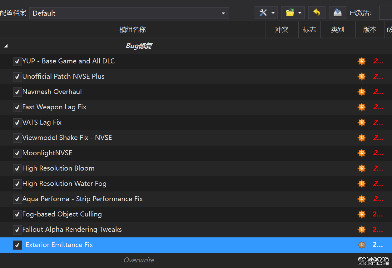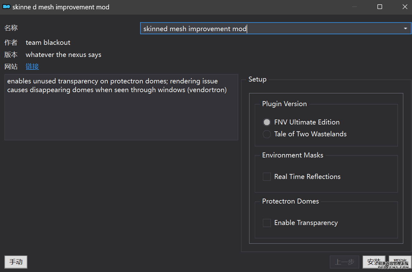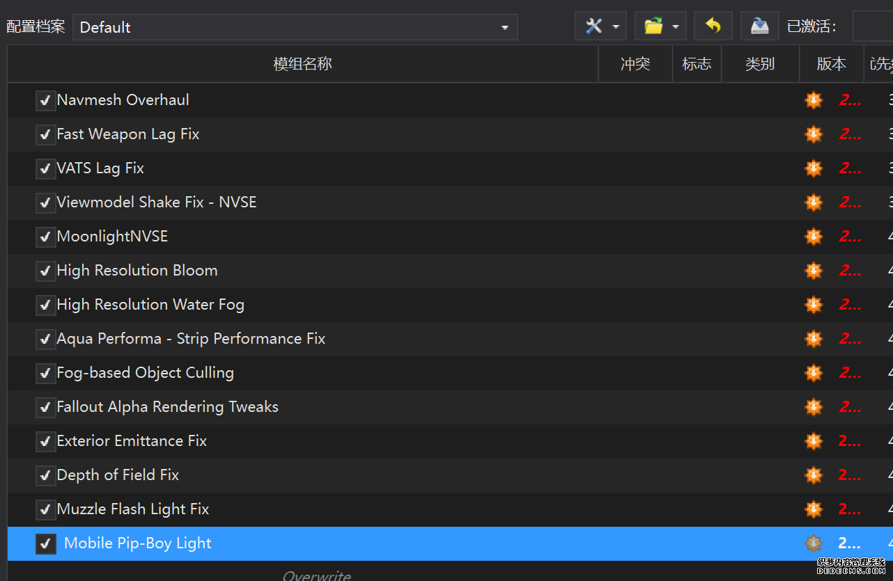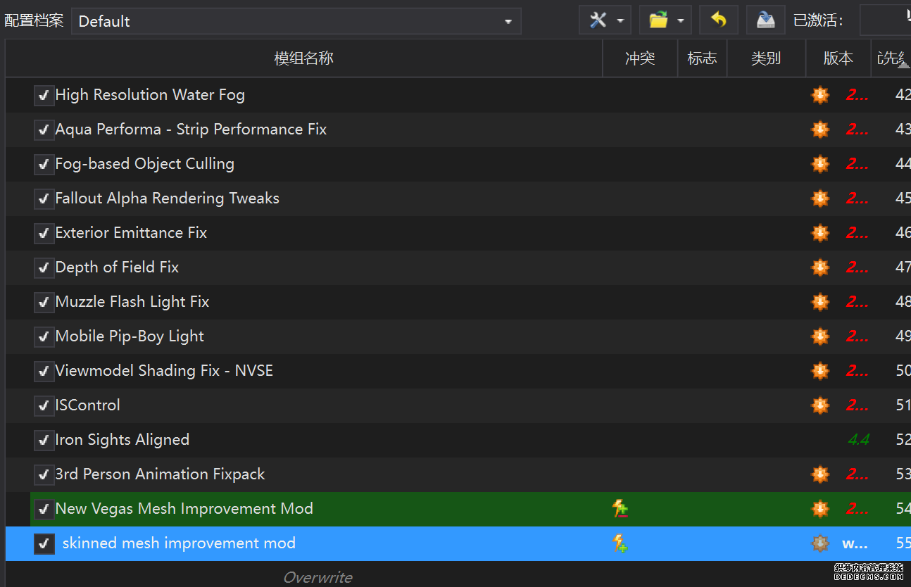 利用ISControl的功能使机瞄位置正确校准 原址: https://www.nexusmods.com/newvegas/mods/81933?tab=files 下载主文件:Iron Sights Aligned ![]() 使用MO2打开,直接点击安装 ![]() 在MO2勾选即可 当前安装配置针对无动画包安装的情况,指南后半部分安装动画包或自行安装动画包需要再次安装该mod-调整安装配置-选择覆盖原mod 修复原版第三人称动画的一些问题 原址: https://www.nexusmods.com/newvegas/mods/85198?tab=files 安装主文件:3rd Person Animation Fixpack ![]() 在MO2安装并勾选 对游戏内的许多网格模型进行修复 原址: New Vegas Mesh Improvement Mod - NVMIM 下载主文件:New Vegas Mesh Improvement Mod ![]() 使用MO2安装并勾选 对一系列生物模型进行改进 原址: skinned mesh improvement mod - redone redux remake retry revengeance retopology refridgerator 下载主文件:skinne d mesh improvement mod ![]() 用MO2打开,直接点击安装 ![]() 勾选即可 修复Pip-boy视角下部分装甲的视觉错误 原址: PipBoyOn Node Fixes 下载主文件:PipBoyOn Node Fixes SMIM(不是PipBoyOn Node Fixes NV) ![]() 在MO2安装、勾选即可 修复网格、碰撞箱 原址: https://www.nexusmods.com/newvegas/mods/83815?tab=files 下载主文件:MAC-10 ![]() 在MO2安装、勾选即可 修复摆动物品浮空等问题 原址: https://www.nexusmods.com/newvegas/mods/85622?tab=files 下载主文件:ITEM ![]() MO2安装、勾选即可 修复了开局场景中的一个视觉错误 原址: https://www.nexusmods.com/newvegas/mods/86437?tab=files 下载主文件:Doc Mitchell's Window Sunlight Fix ![]() MO2安装、勾选即可 对原版照明Bug进行修复、提高同时渲染的最大光源数量 原址: Improved Lighting Shaders 下载主文件:Improved Lighting Shaders ![]() 使用MO2安装并勾选 修复室内天气问题并为天气Mod提供扩展 原址: Climate Control NVSE 下载主文件:Climate Control NVSE ![]() 在MO2中安装并勾选 修复部分音频的爆音问题 原址: Misc Audio Tweaks and Fixes 下载主文件:Assorted Voice Popping Fixes 下载主文件:Elijah Missing Distortion Fix ![]() ![]() 在MO2分别安装、勾选即可 通过利用原版的roombounds功能提供更好的室内功能 原址: ExRB - Extended Roombounds 下载主文件:ExRB ![]() 用MO2打开,确认已经选中Full (YUP),点击下一步 ![]() 直接点击安装 ![]() 在MO2勾选即可 使赌城区的灯光在更远的地方可见 原址: https://www.nexusmods.com/newvegas/mods/73596?tab=files 下载主文件:Strip Lights Region Fix ![]() 在MO2安装并勾选 为部分生物启用不知为何已存在但被禁用的游泳动画 原址: https://www.nexusmods.com/newvegas/mods/83094?tab=files 下载主文件:Swiming Creatures Fix ![]() 在MO2安装、勾选即可 修复自定义FOV在幻灯片播放时的问题 原址: Slideshow FOV Fix - ESPLess 下载主文件:Slideshow FOV Fix ![]() 在MO2安装并勾选 修复气体陷阱导致的性能问题 原址: https://www.nexusmods.com/newvegas/mods/88587?tab=files 下载主文件:Gas Trap Performance Fix ![]() 用MO2打开,直接点击安装 ![]() 在MO2勾选即可 修复角色脸上的奇怪绿色 原址: https://www.nexusmods.com/newvegas/mods/71577?tab=files 下载主文件:FaceGen Tint Fixes for NV ![]() 在MO2安装并勾选 修复血液贴花在特定条件下的闪烁问题 原址: https://www.nexusmods.com/newvegas/mods/87830?tab=files 下载主文件:Blood Decal Flashing Fix ![]() 在MO2安装并勾选 减轻地形材质造成的接缝问题 原址: https://www.nexusmods.com/newvegas/mods/83425?tab=files ![]() 选择FNV,并点击下一步 ![]() 只勾选YUP Patch,并点击安装 ![]() 出现该错误是正常的,直接点击确定即可 ![]() 在MO2勾选 至此,Bug修复部分完成 有能力的建议阅读此指南:Fallout New Vegas Performance and Stability Guide,使新维加斯的性能最大化 由于不同玩家口味不同,本指南分为两部分