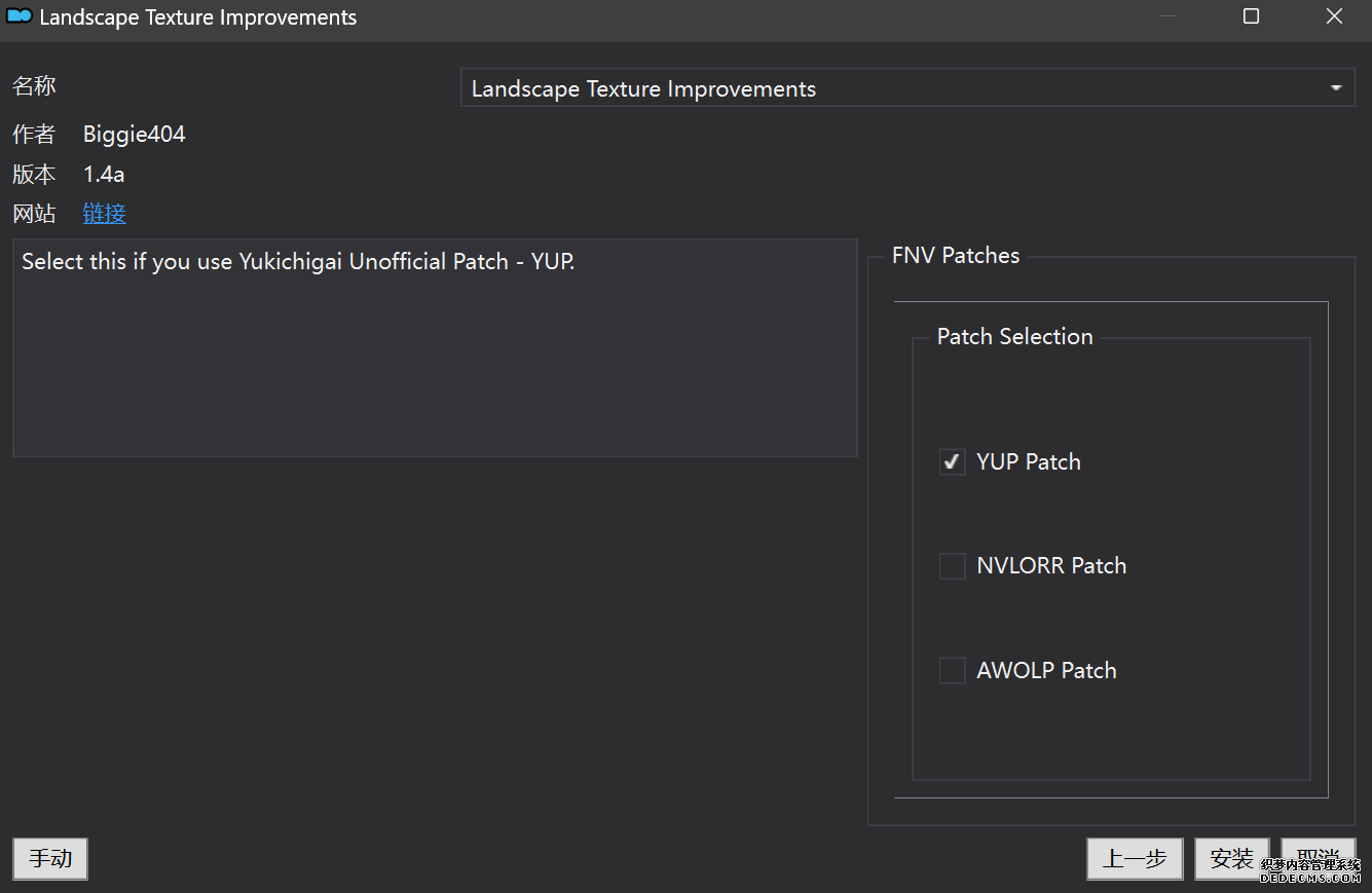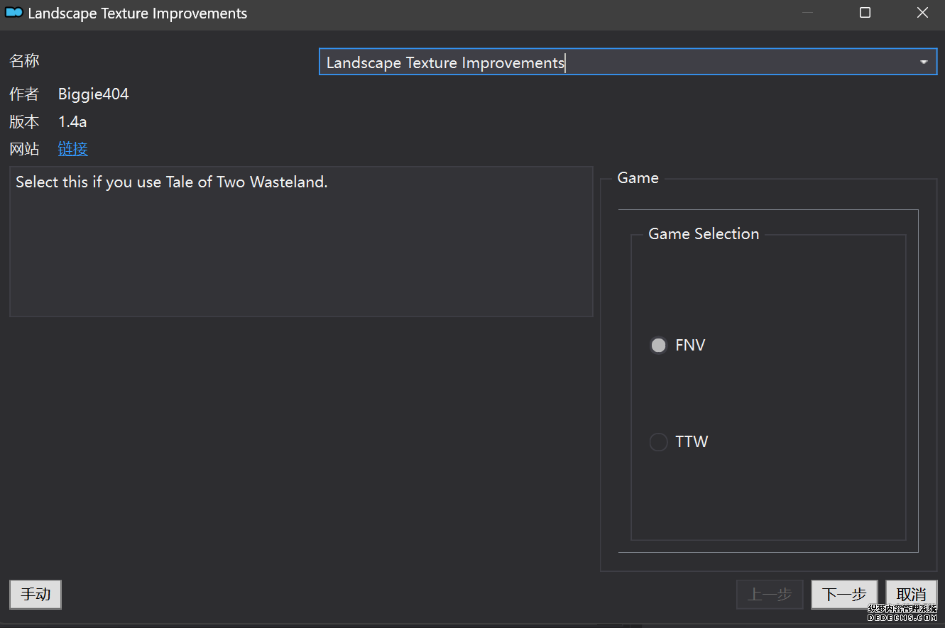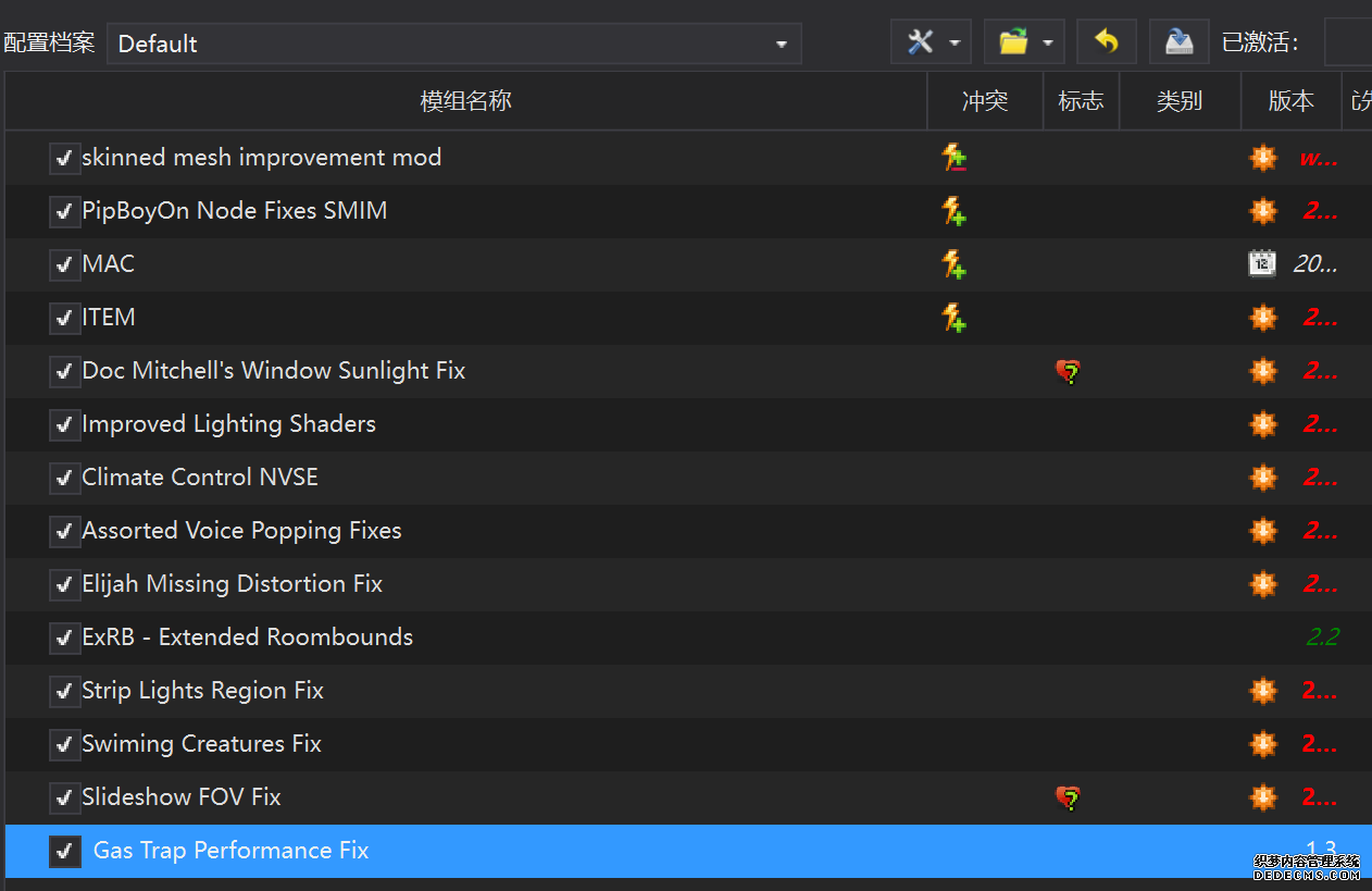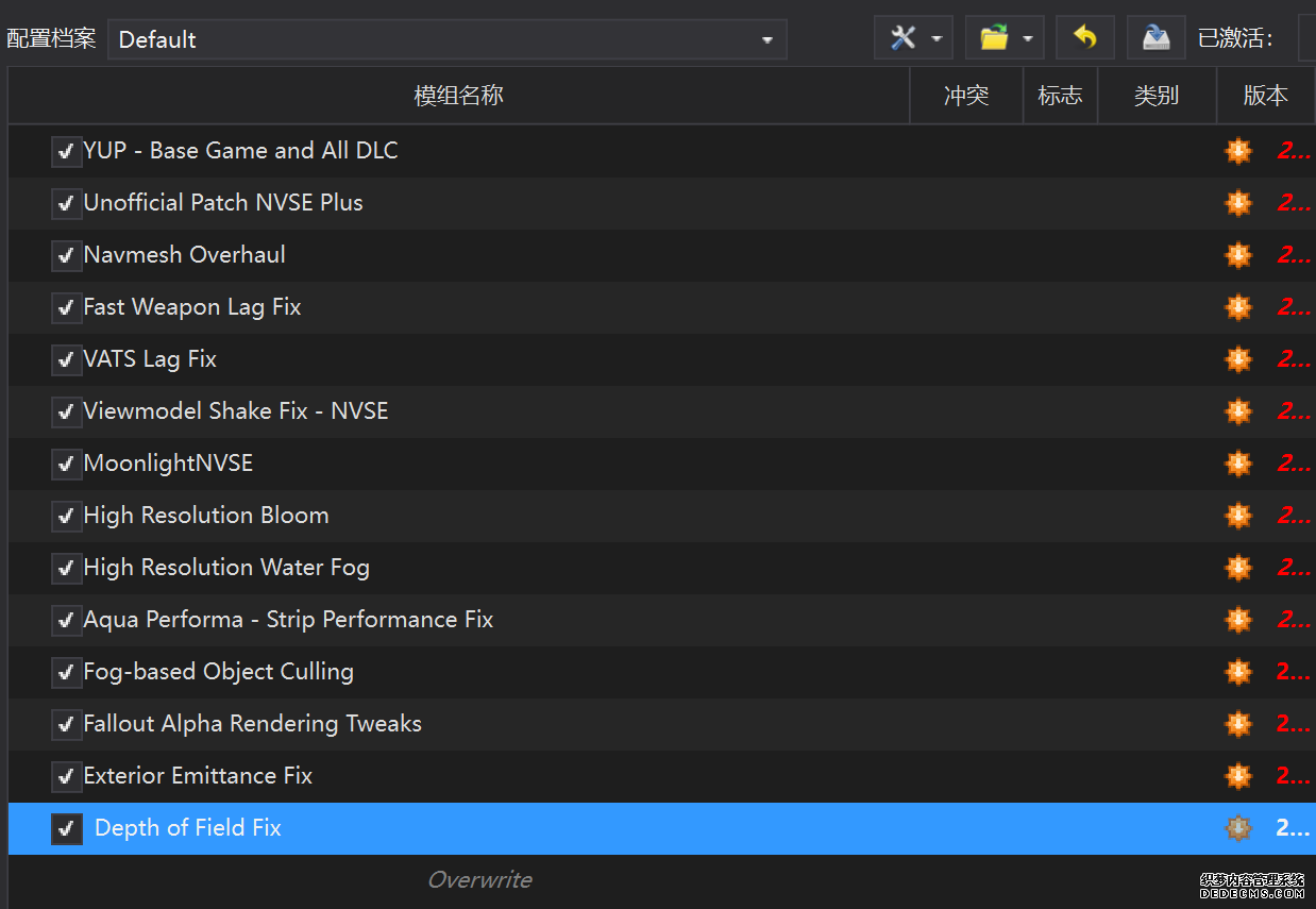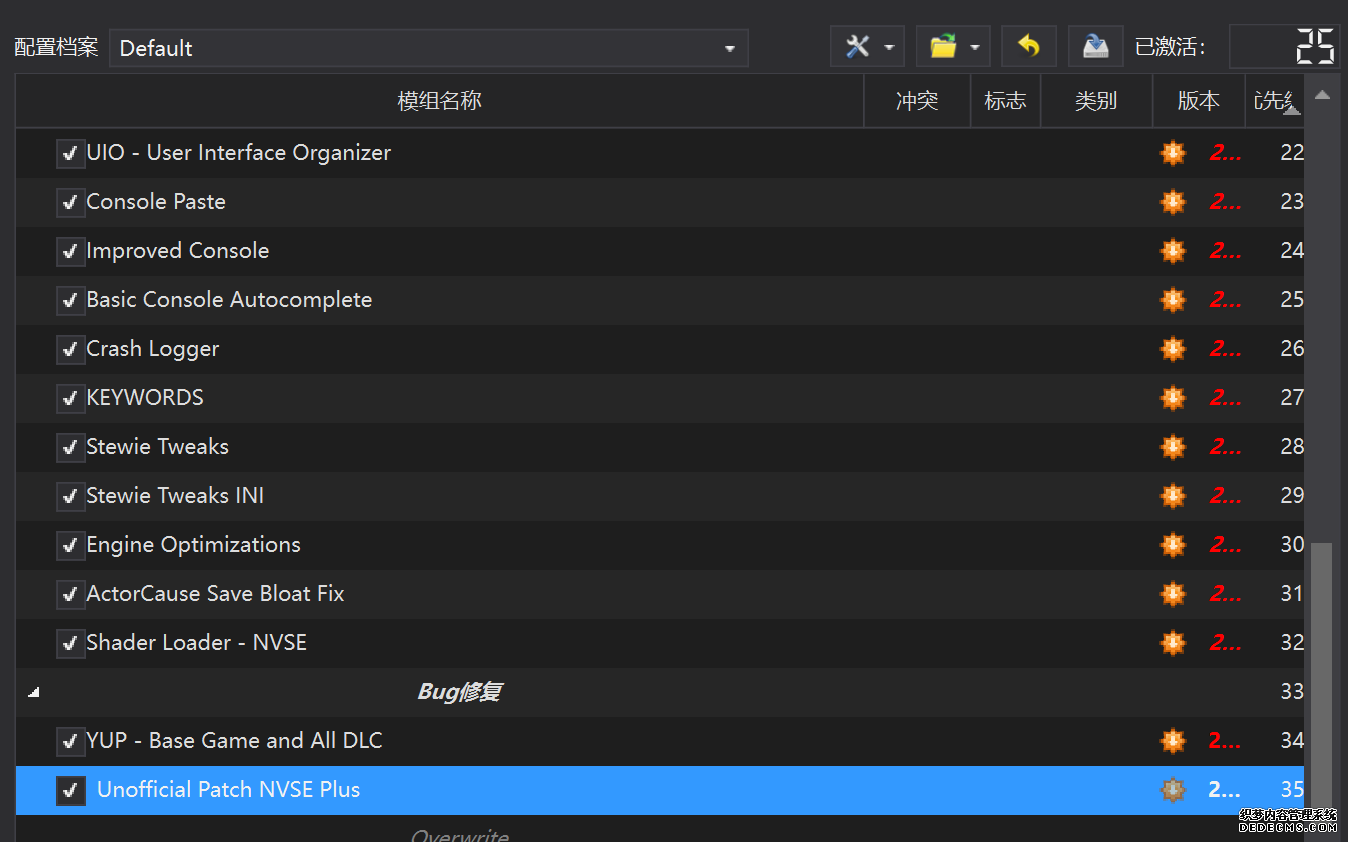 利用ISControl的功能使机瞄位置正确校准 原址: https://www.nexusmods.com/newvegas/mods/81933?tab=files 下载主文件:Iron Sights Aligned ![]() 使用MO2打开,直接点击安装 ![]() 在MO2勾选即可 当前安装配置针对无动画包安装的情况,指南后半部分安装动画包或自行安装动画包需要再次安装该mod-调整安装配置-选择覆盖原mod 修复原版第三人称动画的一些问题 原址: https://www.nexusmods.com/newvegas/mods/85198?tab=files 安装主文件:3rd Person Animation Fixpack ![]() 在MO2安装并勾选 对游戏内的许多网格模型进行修复 原址: New Vegas Mesh Improvement Mod - NVMIM 下载主文件:New Vegas Mesh Improvement Mod ![]() 使用MO2安装并勾选 对一系列生物模型进行改进 原址: skinned mesh improvement mod - redone redux remake retry revengeance retopology refridgerator 下载主文件:skinne d mesh improvement mod ![]() 用MO2打开,直接点击安装 ![]() 勾选即可 修复Pip-boy视角下部分装甲的视觉错误 原址: PipBoyOn Node Fixes 下载主文件:PipBoyOn Node Fixes SMIM(不是PipBoyOn Node Fixes NV) ![]() 在MO2安装、勾选即可 修复网格、碰撞箱 原址: https://www.nexusmods.com/newvegas/mods/83815?tab=files 下载主文件:MAC-10 ![]() 在MO2安装、勾选即可 修复摆动物品浮空等问题 原址: https://www.nexusmods.com/newvegas/mods/85622?tab=files 下载主文件:ITEM ![]() MO2安装、勾选即可 修复了开局场景中的一个视觉错误 原址: https://www.nexusmods.com/newvegas/mods/86437?tab=files 下载主文件:Doc Mitchell's Window Sunlight Fix ![]() MO2安装、勾选即可 对原版照明Bug进行修复、提高同时渲染的最大光源数量 原址: Improved Lighting Shaders 下载主文件:Improved Lighting Shaders ![]() 使用MO2安装并勾选 修复室内天气问题并为天气Mod提供扩展 原址: Climate Control NVSE 下载主文件:Climate Control NVSE ![]() 在MO2中安装并勾选 修复部分音频的爆音问题 原址: Misc Audio Tweaks and Fixes 下载主文件:Assorted Voice Popping Fixes 下载主文件:Elijah Missing Distortion Fix ![]() ![]() 在MO2分别安装、勾选即可 通过利用原版的roombounds功能提供更好的室内功能 原址: ExRB - Extended Roombounds 下载主文件:ExRB ![]() 用MO2打开,确认已经选中Full (YUP),点击下一步 ![]() 直接点击安装 ![]() 在MO2勾选即可 使赌城区的灯光在更远的地方可见 原址: https://www.nexusmods.com/newvegas/mods/73596?tab=files 下载主文件:Strip Lights Region Fix ![]() 在MO2安装并勾选 为部分生物启用不知为何已存在但被禁用的游泳动画 原址: https://www.nexusmods.com/newvegas/mods/83094?tab=files 下载主文件:Swiming Creatures Fix ![]() 在MO2安装、勾选即可 修复自定义FOV在幻灯片播放时的问题 原址: Slideshow FOV Fix - ESPLess 下载主文件:Slideshow FOV Fix ![]() 在MO2安装并勾选 修复气体陷阱导致的性能问题 原址: https://www.nexusmods.com/newvegas/mods/88587?tab=files 下载主文件:Gas Trap Performance Fix ![]() 用MO2打开,直接点击安装 ![]() 在MO2勾选即可 修复角色脸上的奇怪绿色 原址: https://www.nexusmods.com/newvegas/mods/71577?tab=files 下载主文件:FaceGen Tint Fixes for NV ![]() 在MO2安装并勾选 修复血液贴花在特定条件下的闪烁问题 原址: https://www.nexusmods.com/newvegas/mods/87830?tab=files 下载主文件:Blood Decal Flashing Fix ![]() 在MO2安装并勾选 减轻地形材质造成的接缝问题 原址: https://www.nexusmods.com/newvegas/mods/83425?tab=files ![]() 选择FNV,并点击下一步 ![]() 只勾选YUP Patch,并点击安装 ![]() 出现该错误是正常的,直接点击确定即可 ![]() 在MO2勾选 至此,Bug修复部分完成 有能力的建议阅读此指南:Fallout New Vegas Performance and Stability Guide,使新维加斯的性能最大化 由于不同玩家口味不同,本指南分为两部分