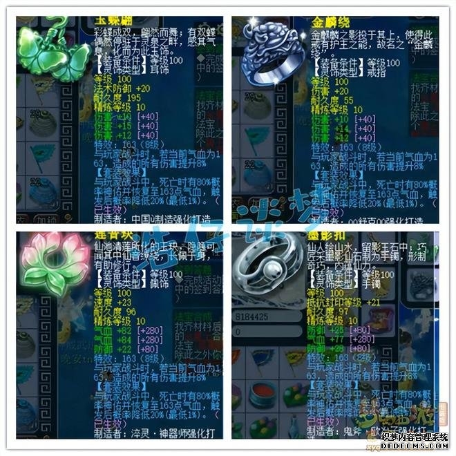 戒指和耳饰凑齐了七伤害,佩饰下排双气血一防御,手镯下排双防御一气血,全部打了10锻星辉石,特效8级163。