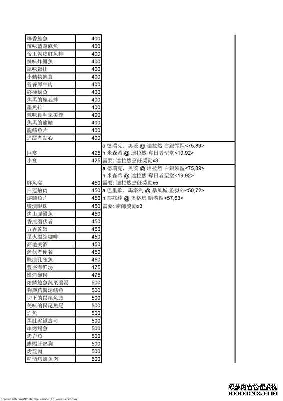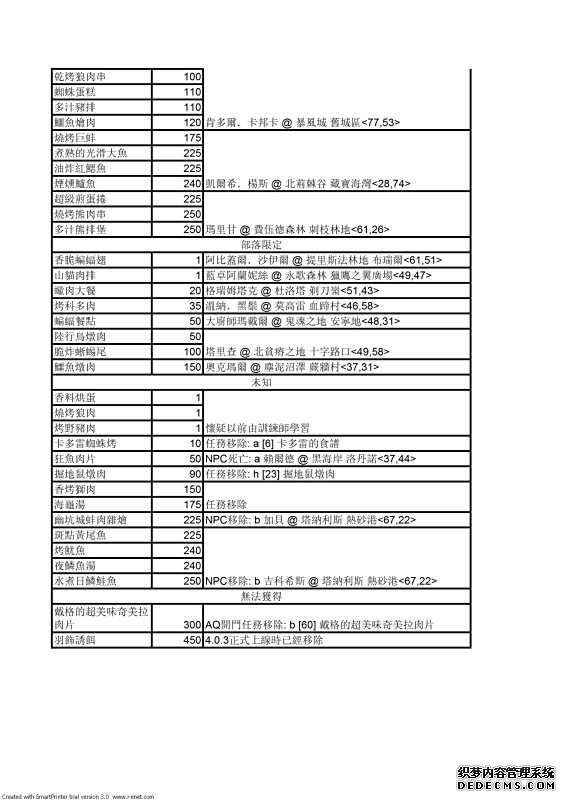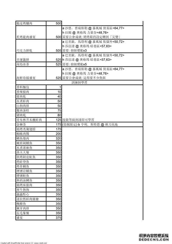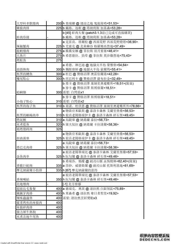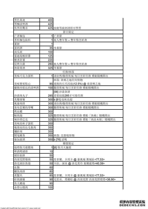 食谱:辣椒蟹肉,225,-,-,嫩螃蟹肉+辣椒(2), 尤索克/荆棘谷<32,29>-格罗姆高, 巴纳拉什/悲伤沼泽<45,57>-斯通纳德, 克雷贡?塔尔松/西部荒野<36,90>-海岸南端