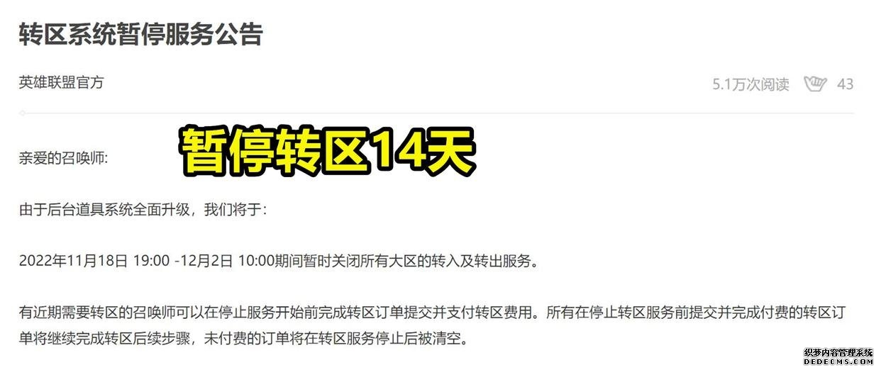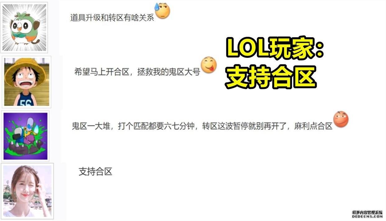 委实说,看到LOL官方撰写的标题“转区系统暂停服务公告”时,笔者是感到很开心的,因为LOL如果关闭了转区系统,就意味着将要迎来合区了。 LOL官方公告但当看到实际内容时,才发现这波是真正的暂停,仅仅暂停14天,之后还会再开启转区系统。 LOL转区系统目前还可以点进去,一度以为公告的时间不准。但经过简单测试发现,转区界面虽然正常,但的确暂时没法转区了。 “暂不提供转区服务”和笔者一样想法的LOL玩家不在少数,许多玩家都被这个标题“唬”到了。一些玩家猜测: