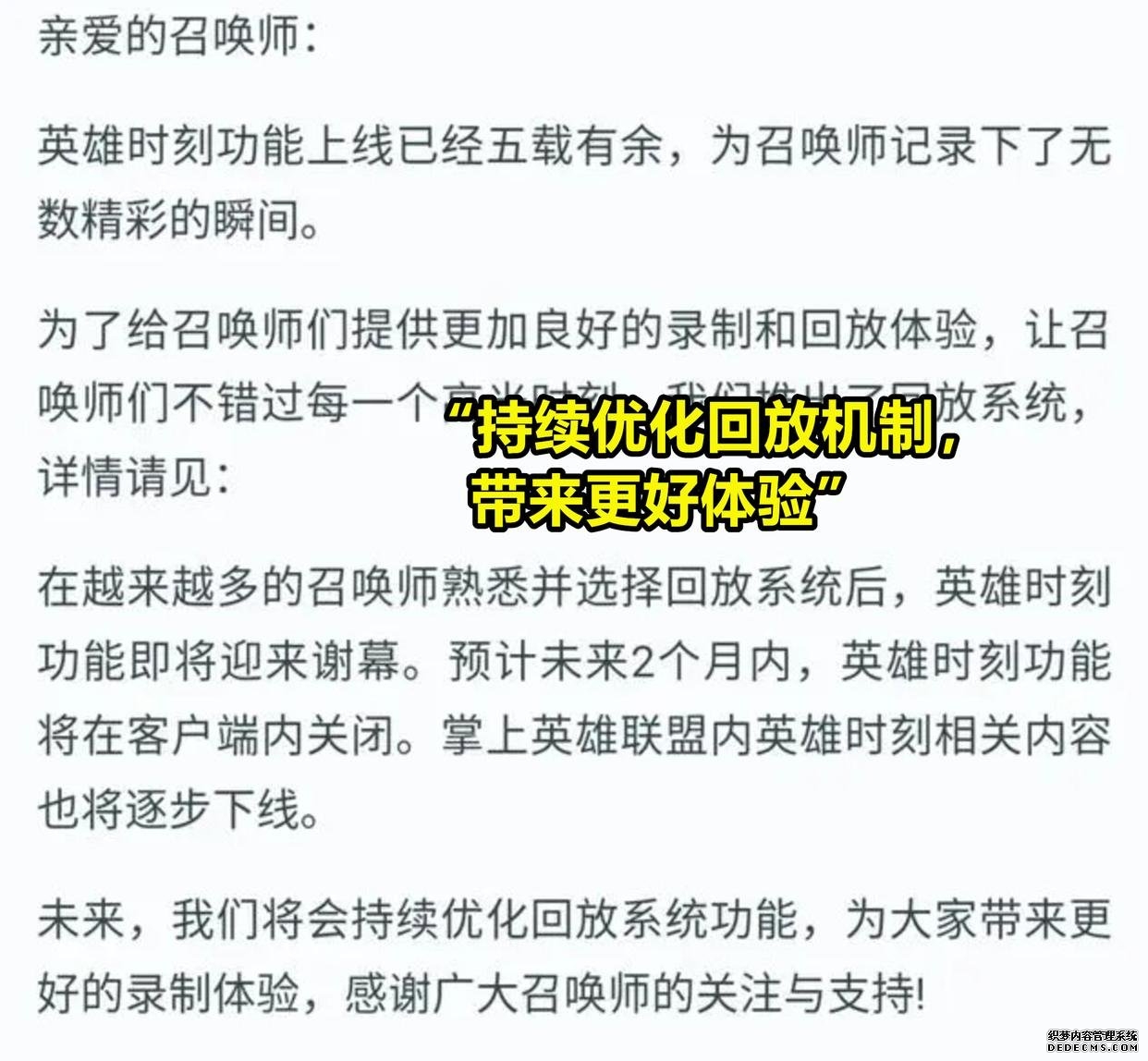 相信看到这篇文章的大伙儿,大多数都不是游戏萌新了,对于游戏中的许多操作和运营方式,许多玩家也能猜出个八九不离十。譬如当游戏出现什么节奏的时候,以前的游戏官方往往会尽力去处理,现在大多数热门游戏得话,只要节奏不是很大,都会装作不知道,用“冷处理”的方式去处理。而当游戏公告要“优化某个功能,暂时将该功能下线”的时候,许多玩家也能猜到,这里的“优化”大概率并非真正的优化——毕竟优化是不会将其下线的。在“因为优化而将某个功能下线”之后,该功能很可能永远都不会再回归游戏当中了。 LOL英雄时刻非萌新玩家应该都知道,LOL以前是有游戏内的录制功能的。每次进入游戏时,都会听到系统女声提示: