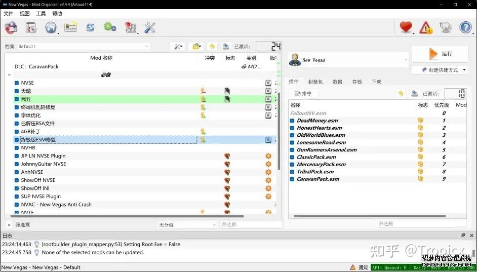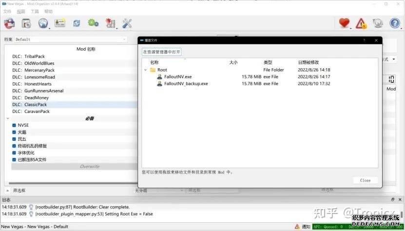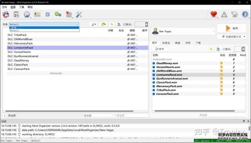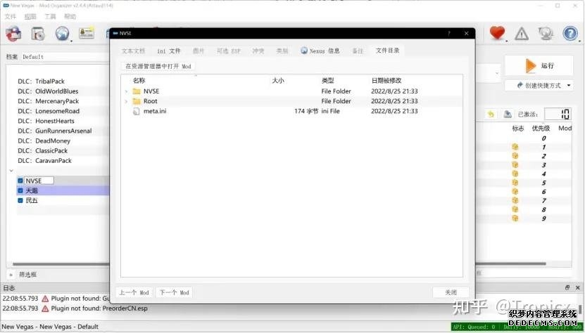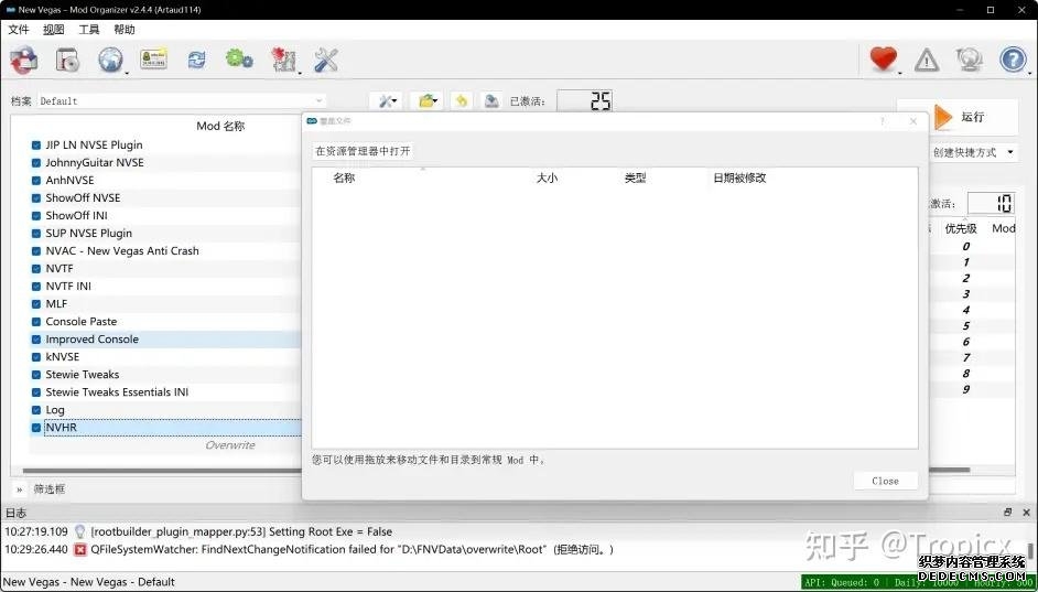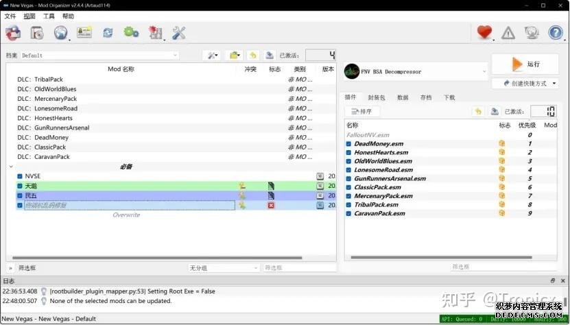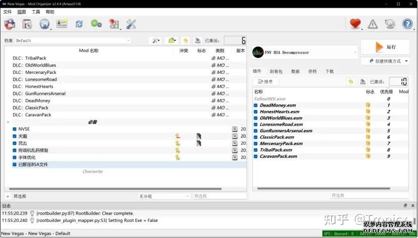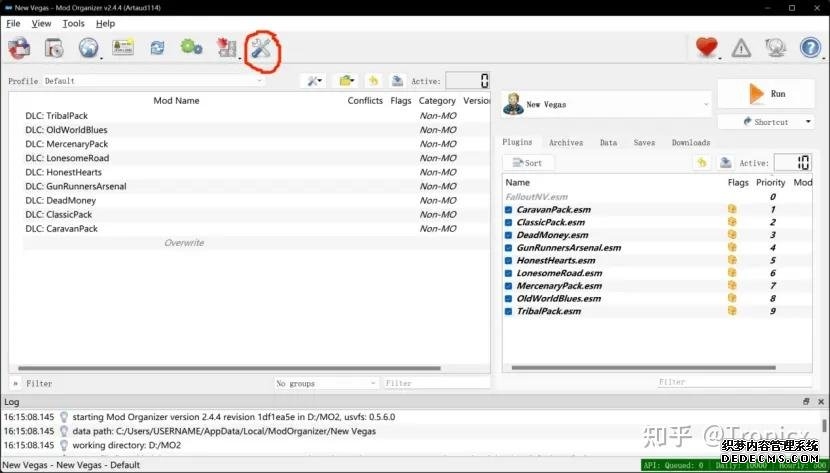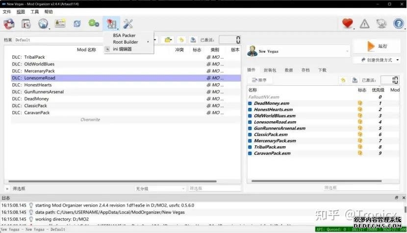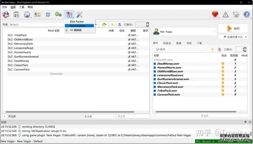 ![]() 确保游戏完全卸载后即可下载、安装游戏,强烈推荐将游戏安装在C盘之外。游戏安装完成后,在Steam启动游戏或双击FalloutNVLauncher.exe(即游戏启动器),此时应该弹出这一窗口。 ![]() 首先点击“确定”,游戏将自动生成配置文件并提示,只需再次点击“确定”。随后点击“OPTIONS”,启动器将弹出这一窗口。(如果没有弹出窗口,请确保已删除我的文档\My Games内的FalloutNV文件夹) 在此处首先点击“Ultra”(如果电脑配置较低则选择“High”,但不要选择“Low”)。随后将Resolution一栏即分辨率改为适合的数值(推荐与桌面分辨率相同),点击OK并点击EXIT退出,不要更改其他选项(尤其不要取消勾选Vertical Sync即垂直同步或取消选择HDR)。游戏本体安装的部分就此结束。 本教程将要使用大量来自N网(即nexusmods,B社游戏最大的Mod托管网站)的资源,接下来将介绍N网使用的基本方法,已熟悉N网者可跳过。 ![]() 想要下载N网资源,首先需要有一个N网账号。进入N网(Nexus Mods :: Home),点击右上角Register字样。 ![]() 填写邮箱、验证邮箱、创建账号,出现该页时直接点击右上角CLOSE字样,下载Mod不需要付费。 ![]() 注册完成后回到主页,此时右上角应如图所示,代表注册已完成。 ![]() 接下来介绍Mod下载步骤,以下面即将下载的MO2为例,打开Mod页面后应如图所示,注意中间的DESCRIPTION,FILES等栏目。本教程涉及的MOD只需按教程说明进行下载即可。 (如要安装教程外MOD,请仔细阅读DESCRIPTION页面及FILES页面文件注释,同时注意POSTS页面红框置顶评论!) ![]() 打开FILES一栏,可能会有不同文件分类(MAIN FILES即主文件,UPDATE FILES即升级文件 OPTIONAL FILES即选装文件 MISCELLANEOUSL FILES即杂项文件),按教程说明选择文件,点击MANUAL DOWNLOAD。 ![]() 点击SLOW DOWNLOAD,读秒完成后即可开始下载,推荐使用IDM等下载工具。 MO2 MOD管理器只推荐使用Mod Organizer 2即MO2(不推荐使用Vortex,因为其缺少本教程所用的插件;不要!!!使用NMM、FOMM,否则出现问题时将难以排查、恢复,简单来说就是麻烦,不用),使用其他Mod管理器的问题我将不会回复。 首先下载MO2并安装最新版。如果你此前已经使用过MO2,可以跳过该步骤。 原址: Mod Organizer 2 下载主文件:Mod Organizer 2 ![]() 打开MO2,此时应该出现一个名为“Creating an instance”的窗口,只需点击Next,随后将出现这一窗口。(如果已安装MO2,则点击左上角第一个大按钮,点击Create New instance/创建新实例),点击“Create a global instance”(中文版则为创建全局实例),来到下一个窗口。 ![]() 检查此处的“New Vegas”选项是否与游戏的安装目录相符合,如符合则选择该选项,如不符合则点击“Browse...”手动选择游戏目录(Steam可右击游戏-管理-浏览本地文件查看) ![]() 保持此处的实例名称栏目不动,点击Next。 ![]() 在一个非C盘、仍有较多空间的磁盘建立名为FNVData的空文件夹(不要把实例创建在MO2文件夹或游戏文件夹里!!!),在此处窗口的Location一栏中选择该文件夹,结果应如图所示。无视Warning,点击Next。 ![]() 点击Finish,MO2将自动启动。此时如弹出“Show tutorial?”窗口,选择“No”;如弹出“Register?”窗口,选择“No”。 ![]() 此时MO2应如图所示,点击被红圈圈中的按钮打开设置页面。 ![]() 在此处的Language一栏中选择“Chinese(Simplified)”,点击OK切换为简体中文。 ![]() ![]() 在左侧插件一栏中,拖动可改变插件加载顺序,请确保插件排列为此顺序,无论如何都不要变更,日后添加新插件只能排列在此之下。如果此处还有一个名为“FalloutNV_lang.esp”的插件,需要手动到游戏的根目录即安装目录内,打开Data文件夹并删除FalloutNV_lang.esp文件。 经验原理(与操作无关,可跳过) ![]() 随后点击档案的Default字样,点击管理,将弹出新窗口。 ![]() 在新窗口中,点击勾选自动封装包,这一步非常重要,如果用MO2管理的新维加斯档案未勾选这一选项,许多Mod安装将出现问题。同时,保持勾选使用档案专属ini文档,点击关闭。 ![]() 如弹出这一窗口,则选“记住我的选择”并“允许写入一次”。 ![]() 随后点击左上倒数第二个按钮即插件按钮,选择ini编辑器,此时将弹出ini编辑窗口。 ![]() 选择第三项falloutcustom.ini,此时该项应该为空白。粘贴以下内容: [General] 点击保存并关闭该窗口,并关闭MO2管理器。 Root Builder 随后下载MO2的Root Builder插件 特别感谢原作者Kezyma允许我分流该插件,请到原址支持他! 原址(对,这插件上传在滚5版,但新维加斯一样能用): Kezyma's Root Builder for Mod Organizer 下载主文件:Root Builder 4.4.0 Github: https://github.com/Kezyma/ModOrganizer-Plugins/releases/tag/rootbuilder 分流: https://pan.baidu.com/s/1Oe7UNIMARQPPv37cZ850iw?pwd=453p ![]() 下载完成后将rootbuilder文件夹解压到MO2安装目录下的plugins文件夹内 ![]() 打开MO2后在插件按钮里将会有Root Builder选项。 这是管理mod的重要工具,让你无需改动根目录即可完成ENB、Reshade等mod的安装,接下来一些mod的安装也要用到这个插件,它的使用方法会在后面讲到。Root Builder安装结束后,MO2管理器的配置就完成了。 原作者:xNVSE组 有了MO2和Root Builder插件,所有Mod都将可以使用MO2安装(据我所知没有例外)。下面我们将安装正常游玩和安装其他Mod必备的前置Mod。 MO2安装Mod的一般方法:点击左上角第二个大按钮,选择Mod的压缩包并安装。用到Root Builder的安装则要在安装时多做一部处理,下面第一个Mod xNVSE就将用到这种处理,xNVSE是NVSE的最新版本,也是许多Mod正常运行所需的框架