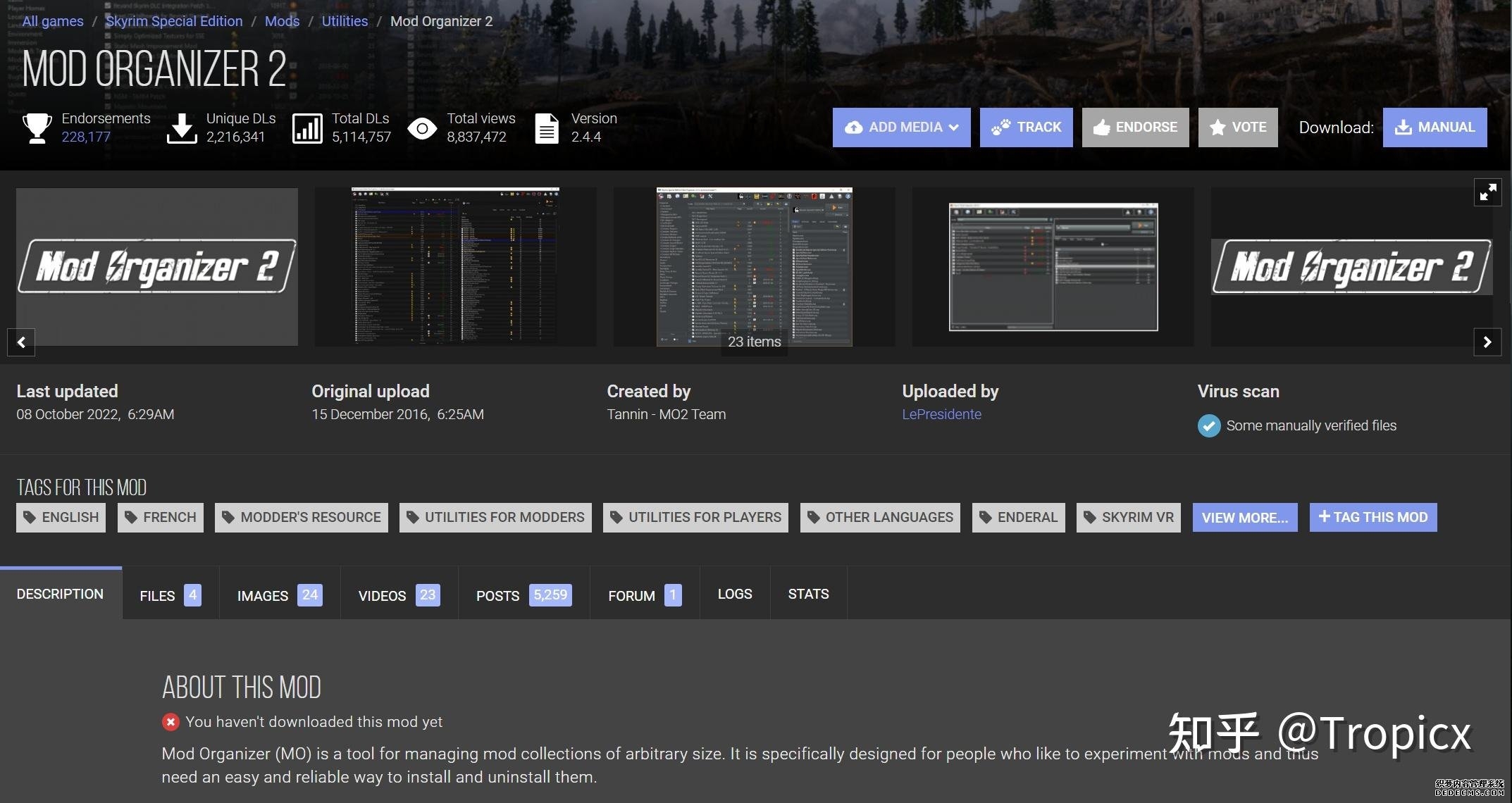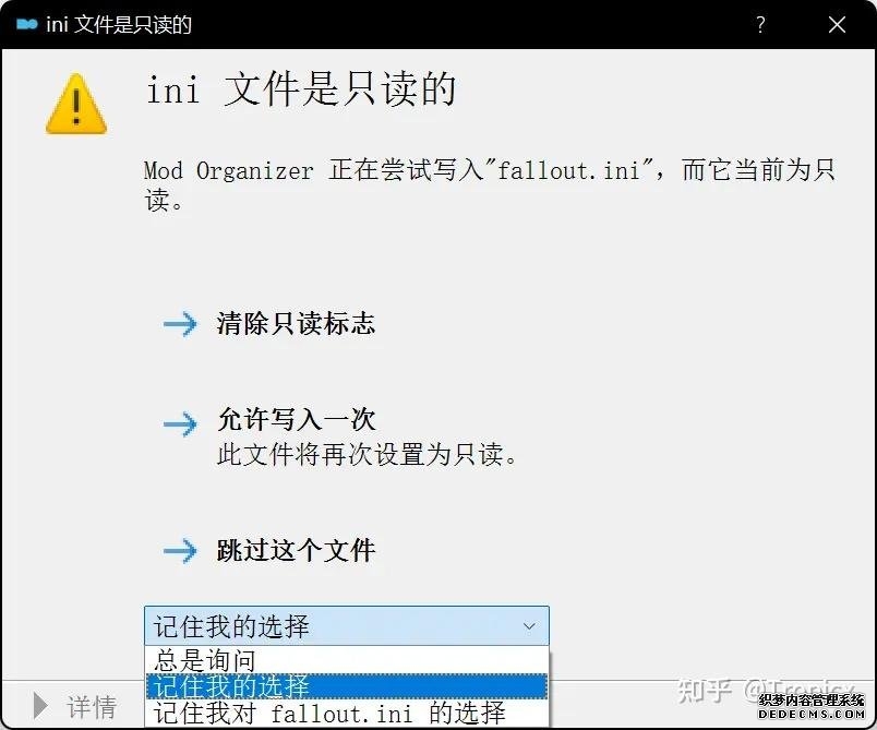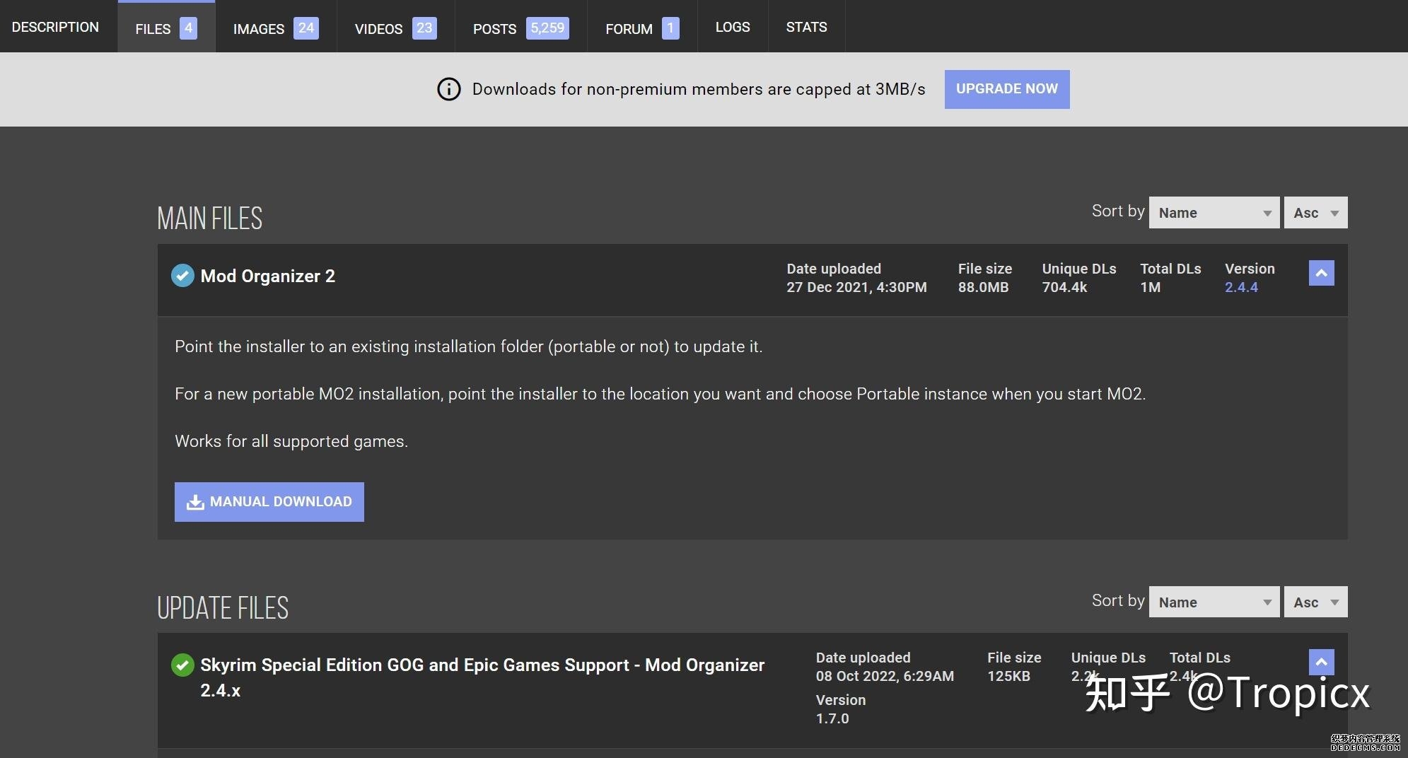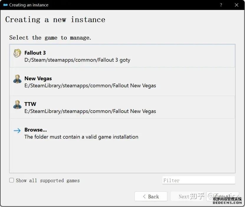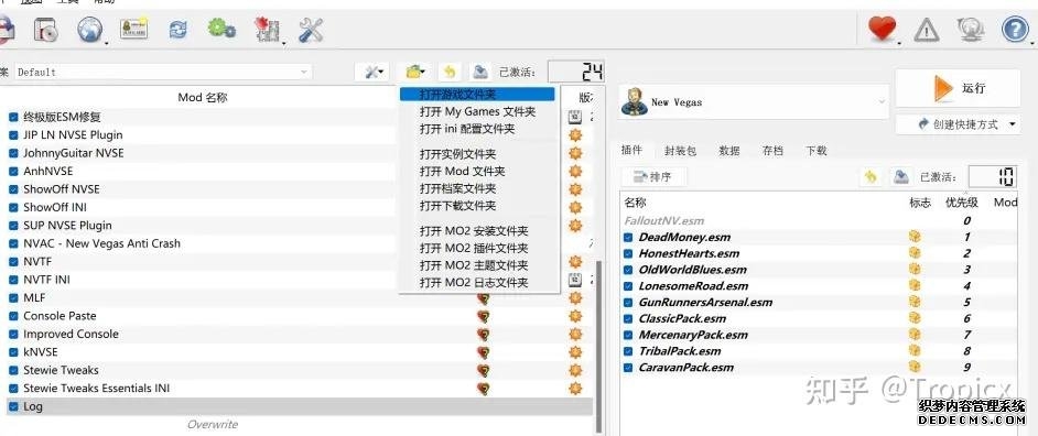 ![]() 确保游戏完全卸载后即可下载、安装游戏,强烈推荐将游戏安装在C盘之外。游戏安装完成后,在Steam启动游戏或双击FalloutNVLauncher.exe(即游戏启动器),此时应该弹出这一窗口。 ![]() 首先点击“确定”,游戏将自动生成配置文件并提示,只需再次点击“确定”。随后点击“OPTIONS”,启动器将弹出这一窗口。(如果没有弹出窗口,请确保已删除我的文档\My Games内的FalloutNV文件夹) 在此处首先点击“Ultra”(如果电脑配置较低则选择“High”,但不要选择“Low”)。随后将Resolution一栏即分辨率改为适合的数值(推荐与桌面分辨率相同),点击OK并点击EXIT退出,不要更改其他选项(尤其不要取消勾选Vertical Sync即垂直同步或取消选择HDR)。游戏本体安装的部分就此结束。 本教程将要使用大量来自N网(即nexusmods,B社游戏最大的Mod托管网站)的资源,接下来将介绍N网使用的基本方法,已熟悉N网者可跳过。 ![]() 想要下载N网资源,首先需要有一个N网账号。进入N网(Nexus Mods :: Home),点击右上角Register字样。 ![]() 填写邮箱、验证邮箱、创建账号,出现该页时直接点击右上角CLOSE字样,下载Mod不需要付费。 ![]() 注册完成后回到主页,此时右上角应如图所示,代表注册已完成。 ![]() 接下来介绍Mod下载步骤,以下面即将下载的MO2为例,打开Mod页面后应如图所示,注意中间的DESCRIPTION,FILES等栏目。本教程涉及的MOD只需按教程说明进行下载即可。 (如要安装教程外MOD,请仔细阅读DESCRIPTION页面及FILES页面文件注释,同时注意POSTS页面红框置顶评论!) ![]() 打开FILES一栏,可能会有不同文件分类(MAIN FILES即主文件,UPDATE FILES即升级文件 OPTIONAL FILES即选装文件 MISCELLANEOUSL FILES即杂项文件),按教程说明选择文件,点击MANUAL DOWNLOAD。 ![]() 点击SLOW DOWNLOAD,读秒完成后即可开始下载,推荐使用IDM等下载工具。 MO2 MOD管理器只推荐使用Mod Organizer 2即MO2(不推荐使用Vortex,因为其缺少本教程所用的插件;不要!!!使用NMM、FOMM,否则出现问题时将难以排查、恢复,简单来说就是麻烦,不用),使用其他Mod管理器的问题我将不会回复。 首先下载MO2并安装最新版。如果你此前已经使用过MO2,可以跳过该步骤。 原址: Mod Organizer 2 下载主文件:Mod Organizer 2 ![]() 打开MO2,此时应该出现一个名为“Creating an instance”的窗口,只需点击Next,随后将出现这一窗口。(如果已安装MO2,则点击左上角第一个大按钮,点击Create New instance/创建新实例),点击“Create a global instance”(中文版则为创建全局实例),来到下一个窗口。 ![]() 检查此处的“New Vegas”选项是否与游戏的安装目录相符合,如符合则选择该选项,如不符合则点击“Browse...”手动选择游戏目录(Steam可右击游戏-管理-浏览本地文件查看) ![]() 保持此处的实例名称栏目不动,点击Next。 ![]() 在一个非C盘、仍有较多空间的磁盘建立名为FNVData的空文件夹(不要把实例创建在MO2文件夹或游戏文件夹里!!!),在此处窗口的Location一栏中选择该文件夹,结果应如图所示。无视Warning,点击Next。 ![]() 点击Finish,MO2将自动启动。此时如弹出“Show tutorial?”窗口,选择“No”;如弹出“Register?”窗口,选择“No”。 ![]() 此时MO2应如图所示,点击被红圈圈中的按钮打开设置页面。 ![]() 在此处的Language一栏中选择“Chinese(Simplified)”,点击OK切换为简体中文。 ![]() ![]() 在左侧插件一栏中,拖动可改变插件加载顺序,请确保插件排列为此顺序,无论如何都不要变更,日后添加新插件只能排列在此之下。如果此处还有一个名为“FalloutNV_lang.esp”的插件,需要手动到游戏的根目录即安装目录内,打开Data文件夹并删除FalloutNV_lang.esp文件。 经验原理(与操作无关,可跳过) ![]() 随后点击档案的Default字样,点击管理,将弹出新窗口。 ![]() 在新窗口中,点击勾选自动封装包,这一步非常重要,如果用MO2管理的新维加斯档案未勾选这一选项,许多Mod安装将出现问题。同时,保持勾选使用档案专属ini文档,点击关闭。 ![]() 如弹出这一窗口,则选“记住我的选择”并“允许写入一次”。 ![]() 随后点击左上倒数第二个按钮即插件按钮,选择ini编辑器,此时将弹出ini编辑窗口。 ![]() 选择第三项falloutcustom.ini,此时该项应该为空白。粘贴以下内容: [General] 点击保存并关闭该窗口,并关闭MO2管理器。 Root Builder 随后下载MO2的Root Builder插件 特别感谢原作者Kezyma允许我分流该插件,请到原址支持他! 原址(对,这插件上传在滚5版,但新维加斯一样能用): Kezyma's Root Builder for Mod Organizer 下载主文件:Root Builder 4.4.0 Github: https://github.com/Kezyma/ModOrganizer-Plugins/releases/tag/rootbuilder 分流: https://pan.baidu.com/s/1Oe7UNIMARQPPv37cZ850iw?pwd=453p ![]() 下载完成后将rootbuilder文件夹解压到MO2安装目录下的plugins文件夹内 ![]() 打开MO2后在插件按钮里将会有Root Builder选项。 这是管理mod的重要工具,让你无需改动根目录即可完成ENB、Reshade等mod的安装,接下来一些mod的安装也要用到这个插件,它的使用方法会在后面讲到。Root Builder安装结束后,MO2管理器的配置就完成了。 原作者:xNVSE组 有了MO2和Root Builder插件,所有Mod都将可以使用MO2安装(据我所知没有例外)。下面我们将安装正常游玩和安装其他Mod必备的前置Mod。 MO2安装Mod的一般方法:点击左上角第二个大按钮,选择Mod的压缩包并安装。用到Root Builder的安装则要在安装时多做一部处理,下面第一个Mod xNVSE就将用到这种处理,xNVSE是NVSE的最新版本,也是许多Mod正常运行所需的框架