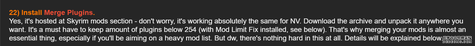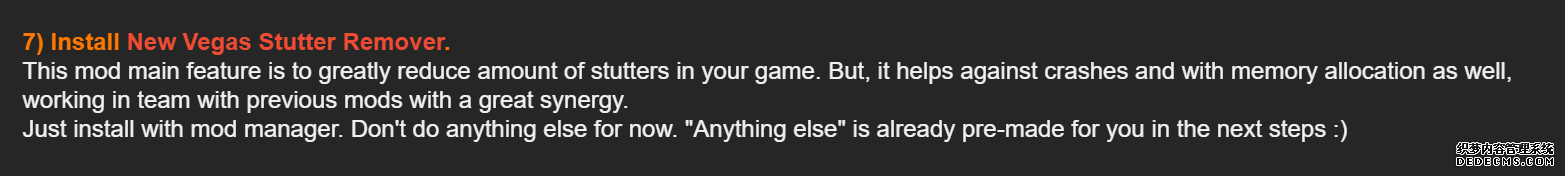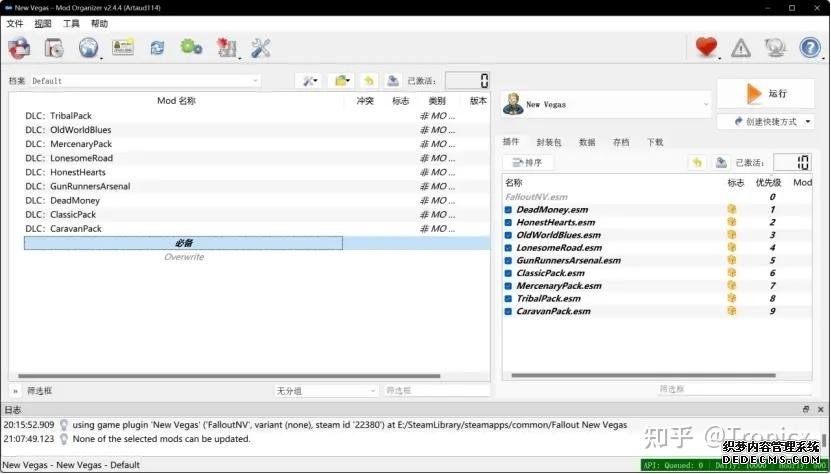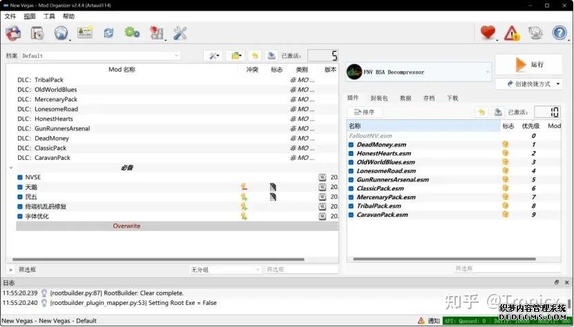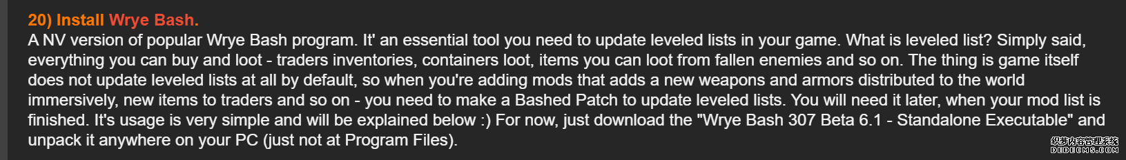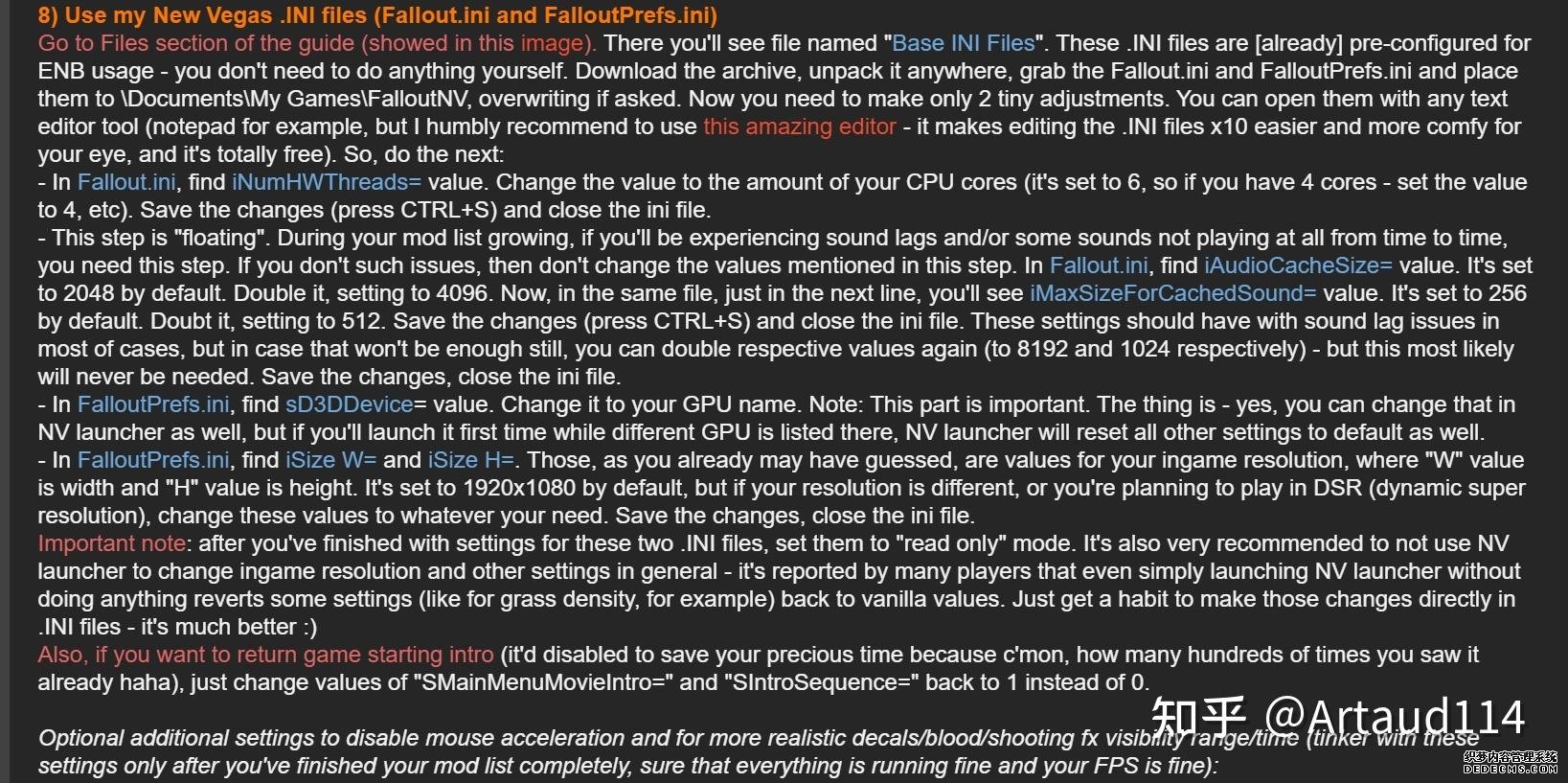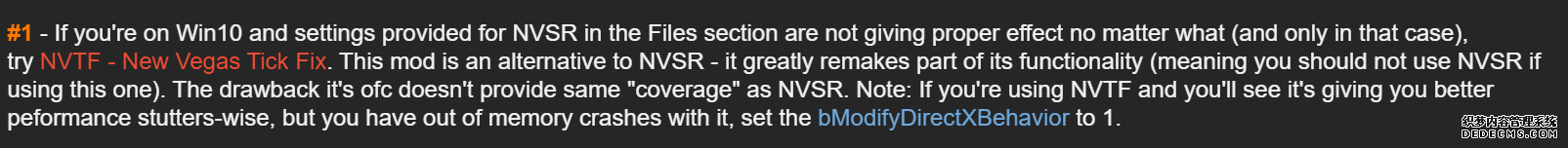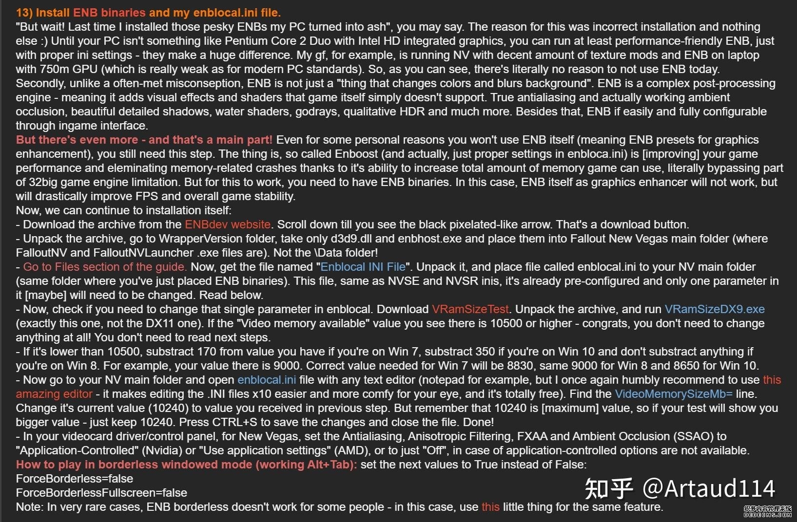 如一切正常,则以上部分安装完成。 基础部分暂时完成。 (未完,编写中) 你们以前可能就听说过Sinitar的新维加斯终极指南(Fallout New Vegas U.L.T.I.M.A.T.E.,下文简称终极指南),我明确反对该终极指南,并且对遵循该指南安装的游戏只有一个建议:全部删掉重来。 原因如下: 一、终极指南对Mod安装细节的强调完全不足(尤其是用来堆数量的小Mod,只放个链接加句话,有时连话都不加) ![]() 这样实际上是称不上指南的,而应该称为Mod推荐列表。很不幸的是,这个推荐列表里面的Mod完全没有经过挑选,如果完全按照终极指南安装将会出现严重问题。 以终极指南第一部分即稳定性和必要Bug修复为例,一开始的Mod管理器他居然推荐了NMM(理由是简单且高效???) ![]() NMM不同于MO2,它没有虚拟文件系统,每个Mod都直接装进游戏根目录,这就导致处理Mod之间的覆盖极其麻烦(相信用过的都深有体会),而在MO2里这只是拖动鼠标的事。他对NMM的评价一句都不要信,NMM相比于MO2在安装大量Mod时使用起来非常麻烦,不要用NMM!!! ![]() LOOT没有这么神。“LOOT很智能并且有自己的数据库,所以几乎在所有情况下自动排序就够了”——这绝对是错的,每一个完整的指南或整合包都会在安装所有Mod后提供一个排序文件而不是让人走一遍LOOT,因为手动排序对于安装大量Mod的游戏是必要的,而且必须要用FNVedit作参考。 ![]() ![]() 指南里还推荐了NVSR即New Vegas Stutter Remover,反而把更加先进的替代品NVTF作为备选项,与他说的正相反,目前NVTF的功能远强于NVSR(包括在60帧以上游玩),很多关于win10玩不了新维加斯的传言恐怕就是因为安装了NVSR,不要安装NVSR,用NVTF。 ![]() Sinitar对游戏INI做了许多完全不必要甚至可能有害的更改(如iNumHWThreads),改渲染设备名称、贴花渲染最大数量真的没什么意义。 ![]() 怎么能指望一个快10年没更新的半成品Enb来优化,尤其是有这么多更好的选择?如果你要安装Enb,不要开启Enboost,也就是说enblocal.ini里的speedhack请设置为false,这对汉化的电台字幕也很重要;另外也不要使用Enb的无边框功能,改为使用Onetweak。 ![]() 不要安装Wrye Bash,它除了把游戏目录弄乱对一般玩家几乎起不到作用,当前最好的修改等级列表的方式是脚本注入,因为不覆盖原列表所以不会造成兼容问题,而老一点的直接覆盖的方式也可以用FNVedit轻松做兼容,在Wrye Bash里乱来还可能导致mod缺失母esp,使游戏完全无法启动。 ![]() 不要使用Merge Plugins合并esp,如需合并请只使用FNVedit,自动合并可能导致脚本问题,后果自负。 下面部分还有The Weapon Mod Menu已被同在终极指南中的lStewieAl's Tweak完全替代等问题,此处不一一列举,总之终极指南列举的Mod不具有参考性,如果自行安装Mod,切勿盲目相信Sinitar、在终极指南中随意挑选安装,而是仔细阅读n网mod介绍及Post区、做好测试,终极指南连Mod推荐列表的功能都无法正常发挥。 你可能会想参考终极指南的材质部分,但是我得说明:终极指南的材质部分做得也很烂,比如里面列出的这个Conor's Cool Doctor's Bag医生包材质,这个医生包的网格是这样的 ![]() 再比如Hall Of Equipment,这个AI升级衣服材质的Mod质量还不如VNV点名批评的Charges那个;Blackwolf24s HD Clutter pack这个材质包里香烟的尺寸不规则(不是2的乘方),可能会导致游戏直接崩溃,Sinitar完全没有提到;武器方面WMX的问题也不多谈。 哔哔小子部分还推荐了Readius等手持Mod,但是没有加上手持修复,进入/退出哔哔小子过快会导致武器偏移 ![]() ![]() 如果你想改模型贴图,参考TTW and Fallout New Vegas Texture Guide — salamand3r这个指南,里面的Mod不仅挑选过,还有详细的安装说明避雷,比Sinitar的好多了 二、终极指南里有很多误导性描述,与本指南及其他许多指南(如Viva New Vegas及Wasteland Survive Guide)的理念严重相悖 首先,我不会推荐安装Enb(尽管也不反对),的确Enb的视觉效果很好,但是新维加斯的Enb完全是半成品,会导致不可避免的性能严重下降、抗锯齿效果糟糕、物体发光异常等问题,而且其发挥的许多功能有更好的替代品(不喜欢屎黄色滤镜,可以安装沙漠自然天气等天气Mod、使用Reshade;想要SSAO可以使用New Vegas Reloaded等)。 我建议遵循Fallout New Vegas Performance and Stability Guide这个性能指南优化游戏(使用N卡并且显示器支持HDR的强烈建议阅读该性能指南),我个人目前使用DXVK+n卡DXGI转换、Special K调整HDR输出+Reshade+New Vegas Reloaded 4.0beta,不仅游戏帧数远比Enb稳定,而且画面效果也不输Enb。 其次,新维加斯的Mod安装不是看哪个Mod喜欢就乱塞,如果你在Mod安装时不仔细挑选、细心阅读说明、做好调试,只会付出更多的精力进行排错,而且安装的Mod越多就越是如此。如果不想在一次又一次排错中丧失耐心、放弃Mod安装,要么就完全遵循一个可靠的指南(终极指南绝对不在此列),要么就在自己安装Mod的时候小心些。 还有,Mod间的兼容永远无法只依靠程序自动进行,像Sinitar那样搞个所谓的安装顺序LOOT走一遍、建个Bashed Patch再合并一下就搞定了的想法是严重错误的!完全按照终极指南来操作,你的游戏永远也不可能像他声称的那样“即使有数百个Mod,也不会出现崩溃、卡顿和内存问题”,而是会彻底烂掉,无法启动 如果你打了很多Mod,别人做的兼容补丁也不能完全解决问题,必须自己使用FNVedit排查冲突、做必要兼容。如果你想游戏稳定些、不要整天崩溃闪退跳出,但又想打一大堆Mod(对,这两个是可以兼顾的),那么