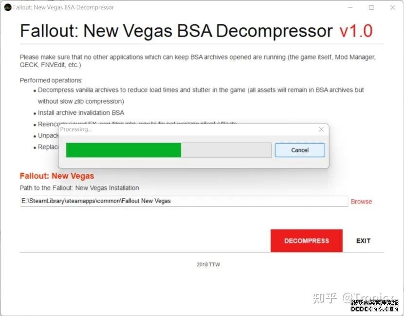 本指南旨在为PC上的《辐射:新维加斯》提供一个从下载游戏到正常游玩的详细操作指导,并分享进一步的Mod安装经验,其中包含所有必要Mod的安装说明、能够优化游戏的设置操作、Mod安装的经验分享。指南内容仅代表个人理解,如有错误还请不吝指正。 该指南的基础部分为必要设置,也是进一步安装Mod的基础,如果你跳过某一部分,出现问题时我将无法提供帮助。后半部分为拓展部分(编写中),可视个人口味选择。教程正处于不断更新中,请以最新版本为准。 QQ群:761409041,提问前请阅读全篇教程 (仅向想体验原汁原味游戏的玩家说明,想打内容Mod的可跳过)如果只想玩原版游戏,是否意味着就不用打Mod了呢?我的看法是,可以但不推荐。适当打一些基础、修复Mod,能在不更改任何游戏内容的情况下减少闪退和卡顿、修复恶性Bug,从而有效改善游戏体验。简单来说:不打Mod可以,但打了能够更好。 ![]() 详细解释在指南正文之后 该部分中我们将对游戏进行一系列处理,为正常游玩和后续Mod安装打下坚实的基础。需要注意的是,在基础部分彻底完成之前,游戏将无法正常运行,不要尝试在基础部分安装中途打开游戏本体。 购买 对想要入正的玩家,只推荐购买Steam或GOG上的年度版(全DLC版),使用其他游戏平台的版本或缺少DLC将严重影响必要Mod的安装。对尚未入正但想要游玩的玩家,请确保下载的游戏版本是具有全部9个DLC的纯净英文版,并已注入游戏注册表。 安装 如果之前以任何方式安装过游戏,需要先确保游戏完全卸载。步骤如下: