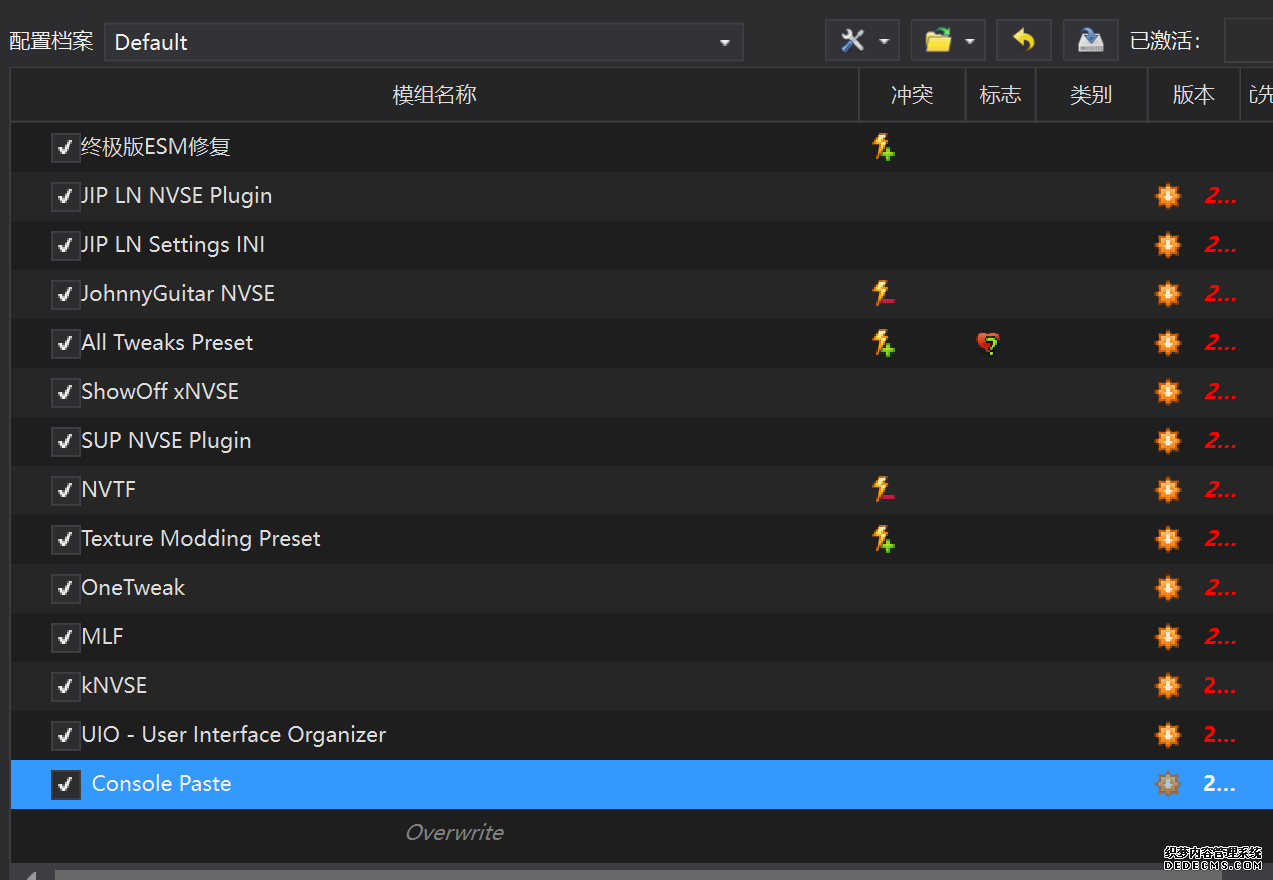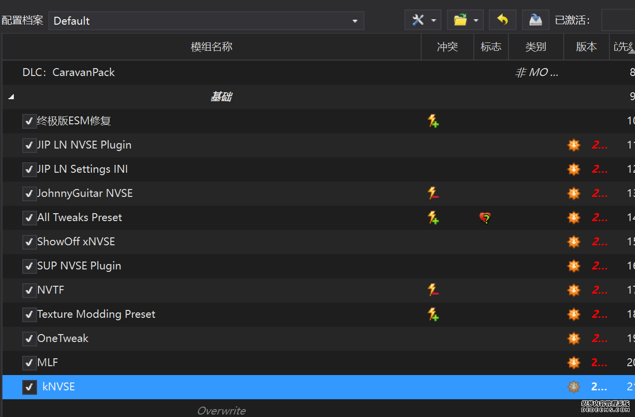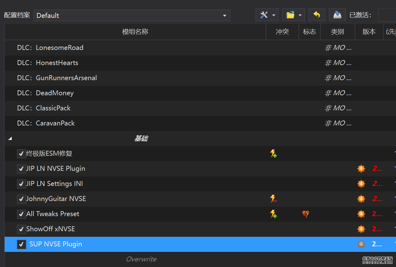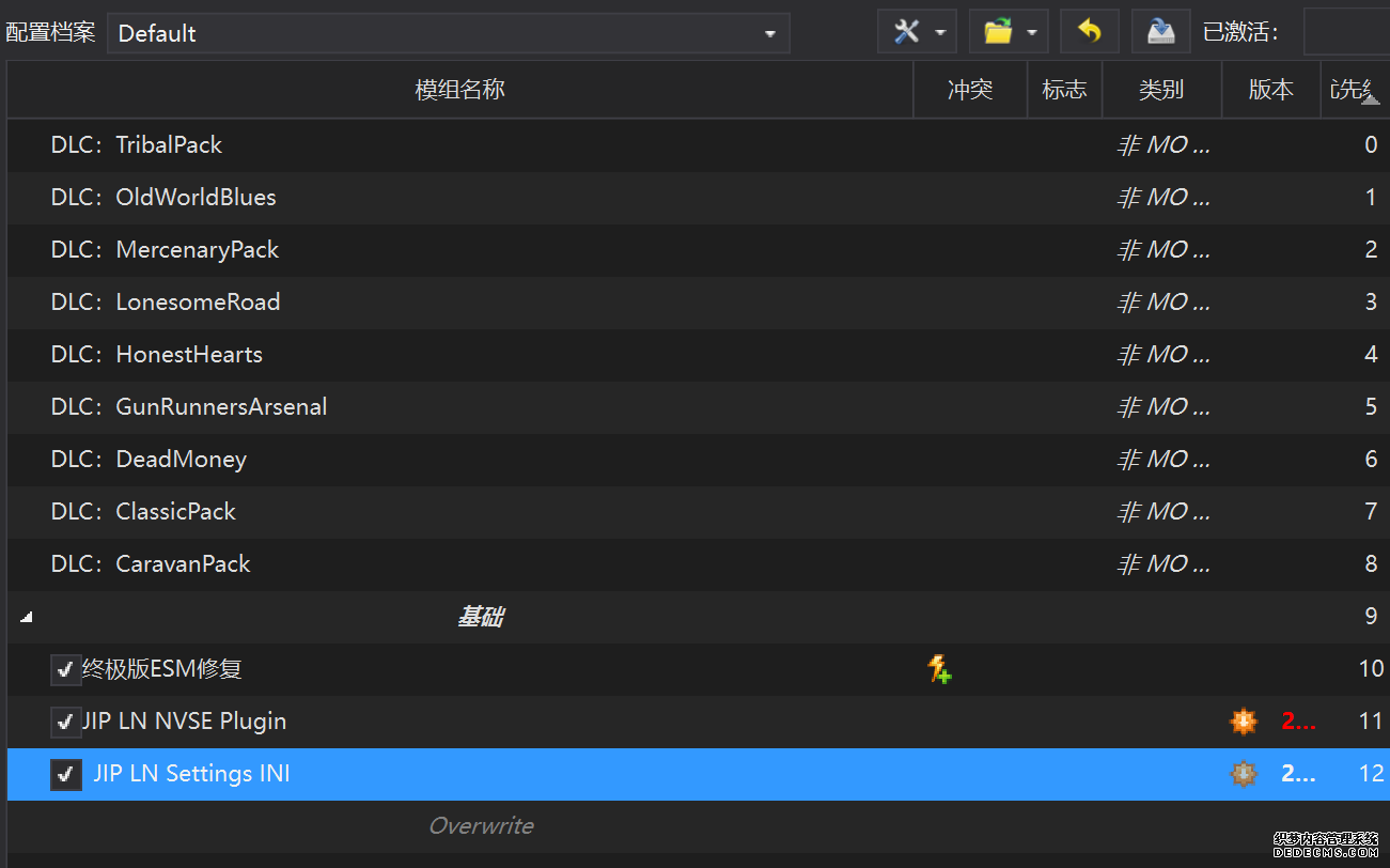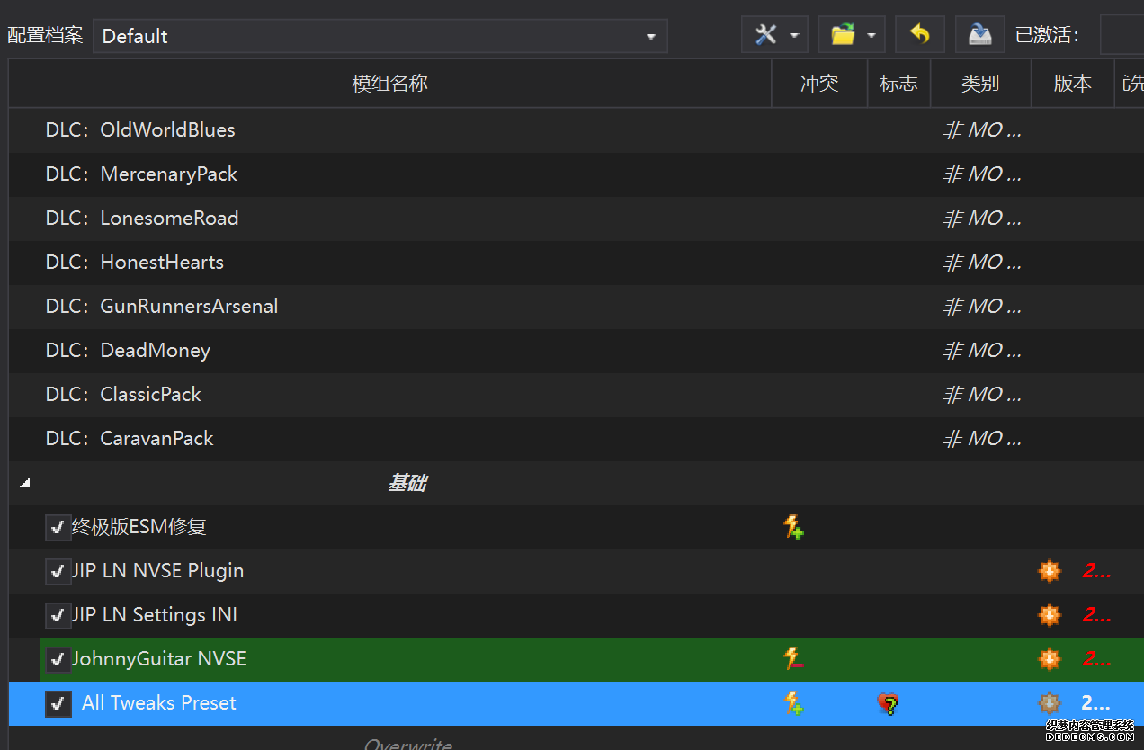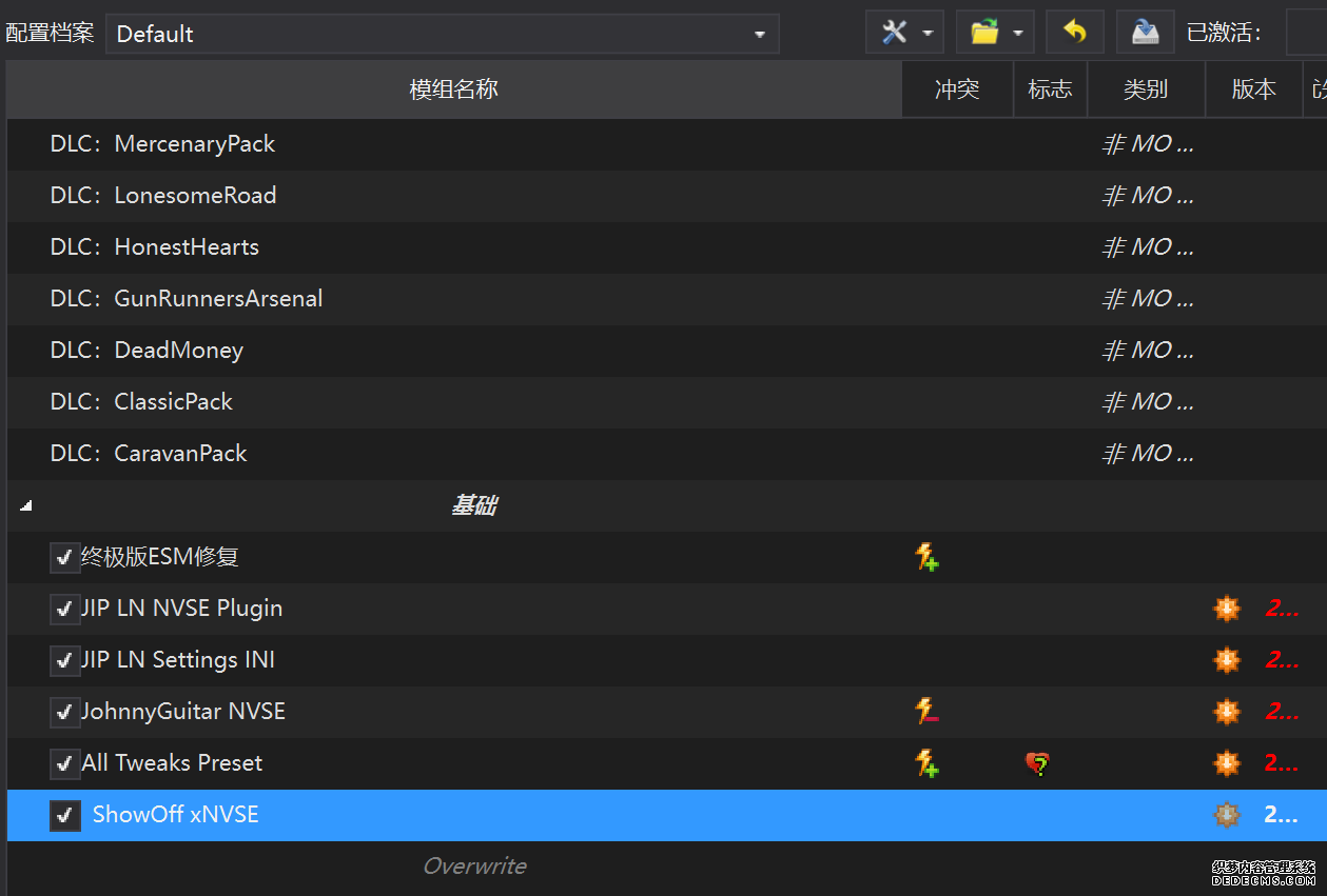 确保已安装全部VC++运行库的最新版(尤其是这三个里最后一个链接): https://aka.ms/vs/17/release/vc_redist.x64.exe https://aka.ms/vs/17/release/vc_redist.x86.exe https://www.techpowerup.com/downloa 另外也要确保已安装.NET Framework 4运行库: https://www.microsoft.com/zh-cn/download/details.aspx?id=17851 在游戏平台安装,安装前确认已拥有全部DLC,并将游戏安装在C盘等系统盘之外 ![]() 游戏安装完成后,在游戏平台启动游戏或双击FalloutNVLauncher.exe(即游戏启动器),此时应该弹出这一窗口 如果没有弹出窗口,请确保已删除我的文档\My Games内的FalloutNV文件夹 ![]() 首先点击“确定”,游戏将自动生成配置文件并提示,只需再次点击“确定” ![]() 随后点击“OPTIONS”,启动器将弹出这一窗口 ![]() 首先在Detail一栏点击“Ultra”(如果电脑配置真的非常、非常、非常低,可以选择Medium代替),弹出如图所示的窗口,点击确定 ![]() 然后在Resolution一栏选择屏幕的原生分辨率(我的屏幕是16:10的2560x1600) 不要忽略这一步骤,否则游戏分辨率将出现问题 ![]() 随后点击OK并点击EXIT退出,不要更改其他选项(尤其不要取消选择HDR,即使屏幕不是HDR也得选择HDR),游戏本体安装的部分就此结束 本教程将要使用大量来自N网(即nexusmods,B社游戏最大的Mod托管网站)的资源,接下来将介绍N网使用的基本方法 ![]() 想要下载N网资源,首先需要有一个N网账号。进入N网(Nexus Mods :: Home),点击右上角Register字样 ![]() 填写邮箱、验证邮箱、创建账号,出现该页时直接点击右上角CLOSE字样,下载Mod不需要付费 ![]() 注册完成后回到主页,此时右上角应如图所示,代表注册已完成 ![]() 接下来介绍Mod下载步骤,以下面即将下载的MO2为例,打开Mod页面后应如图所示,注意中间的DESCRIPTION,FILES等栏目。本教程涉及的MOD只需按教程说明进行下载即可。 (如要安装教程外MOD,请仔细阅读DESCRIPTION页面及FILES页面文件注释,同时注意POSTS页面红框置顶评论!) ![]() 打开FILES一栏,可能会有不同文件分类(MAIN FILES即主文件,UPDATE FILES即升级文件 OPTIONAL FILES即选装文件 MISCELLANEOUSL FILES即杂项文件),按教程说明选择文件,点击MANUAL DOWNLOAD ![]() 点击SLOW DOWNLOAD,读秒完成后即可开始下载,推荐使用IDM等多线程下载工具,对N网的简单介绍到此结束 MOD管理器只推荐使用Mod Organizer 2即MO2[1] 首先下载MO2。如果你此前已经使用过MO2,可以跳过该步骤。 原址: Mod Organizer 2 下载主文件:Mod Organizer 2 本指南只支持最新版MO2(2.5.2及以上),请自行检查版本!!! ![]() 下载完成后打开安装exe,选择同意协议、Next ![]() 选择安装位置,注意把安装位置从默认的C盘目录更改到其他盘内,点击Next ![]() 安装配置不需要更改,直接点击Next ![]() 创建一个桌面快捷方式方便打开,点Next ![]() 再次确认安装目录位于系统盘之外,点Install安装 ![]() 安装完成后点Finish,自动启动MO2 ![]() MO2启动,此时应该出现一个名为“Creating an instance”的窗口。(如果已安装MO2,则点击左上角第一个大按钮,点击Create New instance/创建新实例),点击“Create a global instance”(中文版则为创建全局实例),来到下一个窗口 ![]() 检查此处的“New Vegas”选项是否与游戏的安装目录相符合,如符合则选择该选项,如不符合则点击“Browse...”手动选择游戏目录(Steam可右击游戏-管理-浏览本地文件查看) ![]() 选择对应游戏版本,此处我用的是GOG版所以选GOG,Steam版选Steam,Epic版选Epic Games ![]() 保持此处的实例名称栏目不动,点击Next ![]() 此处全部勾选,开启实例专用INI、实例专用INI存档、封装包无效化,点击Next ![]() 在一个非C盘、仍有较多空间的磁盘建立名为FNVData的空文件夹(不要把实例创建在MO2文件夹或游戏文件夹里!!!),在此处窗口的Location一栏中选择该文件夹,结果应如图所示。(如有Warning则无视)点击Next ![]() 点击Finish ![]() 如此时弹出该窗口,则先选择"Remember my choice" 再选择"Clear the read-only flag",无则忽略 ![]() 若出现此窗口则选择"Do Nothing" ![]() 如继续弹出该窗口,选择“No,don`t ask again”,无则忽略(如弹出“Show tutorial?”窗口,选择“No”,无则忽略) ![]() 进入MO2后,首先点击被红圈圈中的该按钮打开设置 ![]() 在此处的Language一栏中选择“Chinese(Simplified)”,切换为简体中文 ![]() 在Theme一栏的Style可选择自己喜欢的主题,我用的是最下面的vs15 Dark,点击OK保存 ![]() MO2界面下方Log一栏没有什么重要信息,可以直接关掉 ![]() MO2管理器主界面说明,来自KYK的Fallout:New Vegas一站式问题解决教程(里面有些mod目前不推荐安装) ![]() 在右侧插件一栏中,拖动可改变插件加载顺序,请确保游戏本体的插件排列始终保持该顺序,无论如何都不要变更,日后添加新插件只能排列在此之下。 如果你像我一样,在底下多了一个名为“FalloutNV_lang.esp”[2]的插件,需要按照以下步骤手动删除(没有则忽略): ![]() 点击该按钮,打开游戏根目录文件夹 ![]() 找到与FalloutNV.exe处于同一文件夹内的Data子文件夹,打开 ![]() 找到FalloutNV_lang.esp,删除 ![]() 回到MO2按F5刷新,可以看到FalloutNV_lang.esp已经被删除 ![]() 随后点击档案的Default字样,点击管理,将弹出新窗口 ![]() 在新窗口中,确保下面使用专属存档、使用专属INI、自动去封装包核验[3](也就是材质无效化,以后不需要额外进行材质无效化操作)三项均已勾选,点击关闭 ![]() 随后点击左上倒数第二个按钮即插件按钮,选择ini编辑器,此时将弹出ini编辑窗口 ![]() 选择第三项falloutcustom.ini(此时该项应该为空