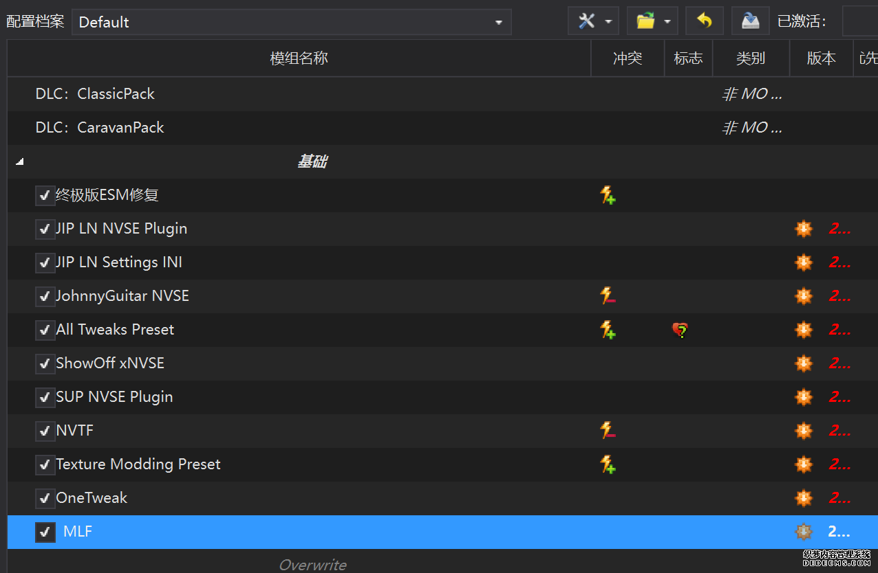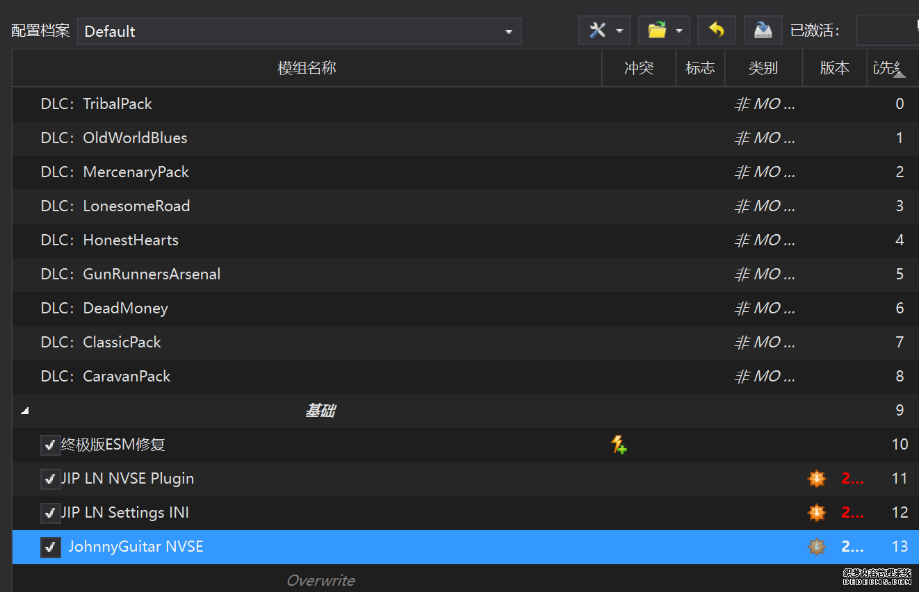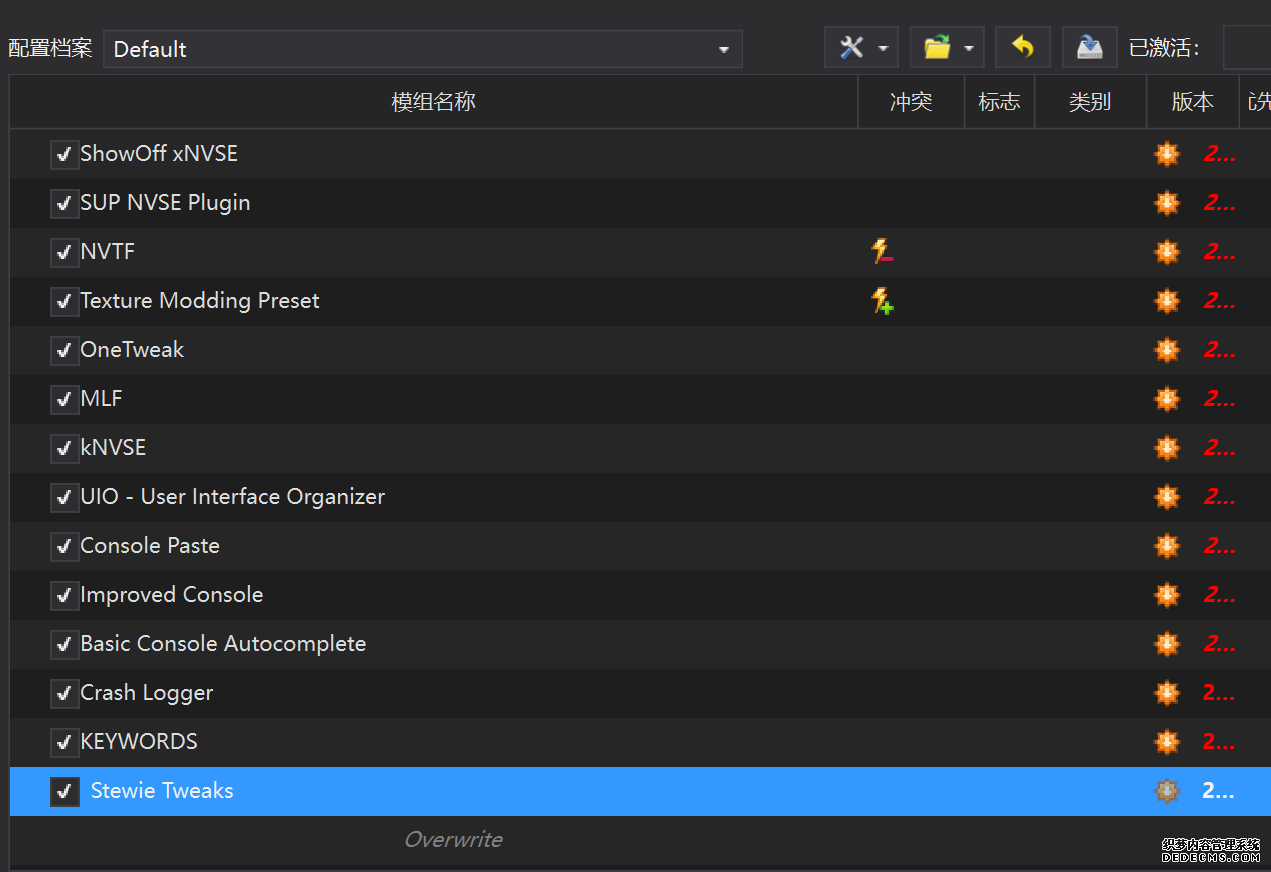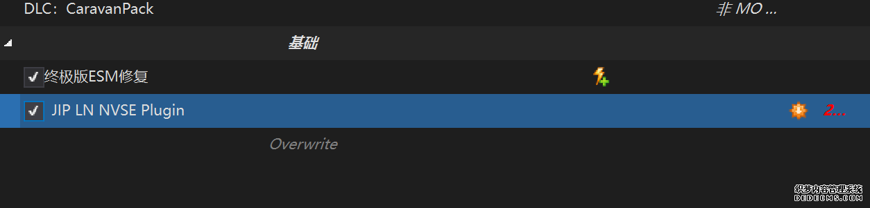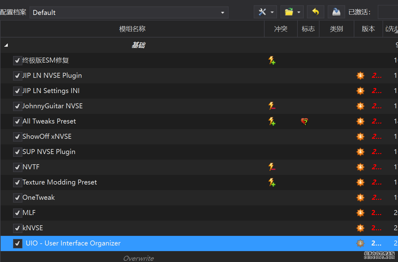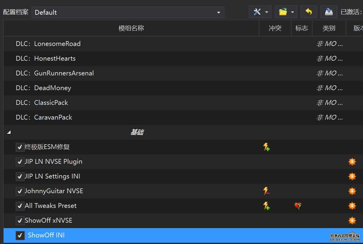确保已安装全部VC++运行库的最新版(尤其是这三个里最后一个链接): https://aka.ms/vs/17/release/vc_redist.x64.exe https://aka.ms/vs/17/release/vc_redist.x86.exe https://www.techpowerup.com/downloa 另外也要确保已安装.NET Framework 4运行库: https://www.microsoft.com/zh-cn/download/details.aspx?id=17851 在游戏平台安装,安装前确认已拥有全部DLC,并将游戏安装在C盘等系统盘之外 ![]() 游戏安装完成后,在游戏平台启动游戏或双击FalloutNVLauncher.exe(即游戏启动器),此时应该弹出这一窗口 如果没有弹出窗口,请确保已删除我的文档\My Games内的FalloutNV文件夹 ![]() 首先点击“确定”,游戏将自动生成配置文件并提示,只需再次点击“确定” ![]() 随后点击“OPTIONS”,启动器将弹出这一窗口 ![]() 首先在Detail一栏点击“Ultra”(如果电脑配置真的非常、非常、非常低,可以选择Medium代替),弹出如图所示的窗口,点击确定 ![]() 然后在Resolution一栏选择屏幕的原生分辨率(我的屏幕是16:10的2560x1600) 不要忽略这一步骤,否则游戏分辨率将出现问题 ![]() 随后点击OK并点击EXIT退出,不要更改其他选项(尤其不要取消选择HDR,即使屏幕不是HDR也得选择HDR),游戏本体安装的部分就此结束 本教程将要使用大量来自N网(即nexusmods,B社游戏最大的Mod托管网站)的资源,接下来将介绍N网使用的基本方法 ![]() 想要下载N网资源,首先需要有一个N网账号。进入N网(Nexus Mods :: Home),点击右上角Register字样 ![]() 填写邮箱、验证邮箱、创建账号,出现该页时直接点击右上角CLOSE字样,下载Mod不需要付费 ![]() 注册完成后回到主页,此时右上角应如图所示,代表注册已完成 ![]() 接下来介绍Mod下载步骤,以下面即将下载的MO2为例,打开Mod页面后应如图所示,注意中间的DESCRIPTION,FILES等栏目。本教程涉及的MOD只需按教程说明进行下载即可。 (如要安装教程外MOD,请仔细阅读DESCRIPTION页面及FILES页面文件注释,同时注意POSTS页面红框置顶评论!) ![]() 打开FILES一栏,可能会有不同文件分类(MAIN FILES即主文件,UPDATE FILES即升级文件 OPTIONAL FILES即选装文件 MISCELLANEOUSL FILES即杂项文件),按教程说明选择文件,点击MANUAL DOWNLOAD ![]() 点击SLOW DOWNLOAD,读秒完成后即可开始下载,推荐使用IDM等多线程下载工具,对N网的简单介绍到此结束 MOD管理器只推荐使用Mod Organizer 2即MO2[1] 首先下载MO2。如果你此前已经使用过MO2,可以跳过该步骤。 原址: Mod Organizer 2 下载主文件:Mod Organizer 2 本指南只支持最新版MO2(2.5.2及以上),请自行检查版本!!! ![]() 下载完成后打开安装exe,选择同意协议、Next ![]() 选择安装位置,注意把安装位置从默认的C盘目录更改到其他盘内,点击Next ![]() 安装配置不需要更改,直接点击Next ![]() 创建一个桌面快捷方式方便打开,点Next ![]() 再次确认安装目录位于系统盘之外,点Install安装 ![]() 安装完成后点Finish,自动启动MO2 ![]() MO2启动,此时应该出现一个名为“Creating an instance”的窗口。(如果已安装MO2,则点击左上角第一个大按钮,点击Create New instance/创建新实例),点击“Create a global instance”(中文版则为创建全局实例),来到下一个窗口 ![]() 检查此处的“New Vegas”选项是否与游戏的安装目录相符合,如符合则选择该选项,如不符合则点击“Browse...”手动选择游戏目录(Steam可右击游戏-管理-浏览本地文件查看) ![]() 选择对应游戏版本,此处我用的是GOG版所以选GOG,Steam版选Steam,Epic版选Epic Games ![]() 保持此处的实例名称栏目不动,点击Next ![]() 此处全部勾选,开启实例专用INI、实例专用INI存档、封装包无效化,点击Next ![]() 在一个非C盘、仍有较多空间的磁盘建立名为FNVData的空文件夹(不要把实例创建在MO2文件夹或游戏文件夹里!!!),在此处窗口的Location一栏中选择该文件夹,结果应如图所示。(如有Warning则无视)点击Next ![]() 点击Finish ![]() 如此时弹出该窗口,则先选择"Remember my choice" 再选择"Clear the read-only flag",无则忽略 ![]() 若出现此窗口则选择"Do Nothing" ![]() 如继续弹出该窗口,选择“No,don`t ask again”,无则忽略(如弹出“Show tutorial?”窗口,选择“No”,无则忽略) ![]() 进入MO2后,首先点击被红圈圈中的该按钮打开设置 ![]() 在此处的Language一栏中选择“Chinese(Simplified)”,切换为简体中文 ![]() 在Theme一栏的Style可选择自己喜欢的主题,我用的是最下面的vs15 Dark,点击OK保存 ![]() MO2界面下方Log一栏没有什么重要信息,可以直接关掉 ![]() MO2管理器主界面说明,来自KYK的Fallout:New Vegas一站式问题解决教程(里面有些mod目前不推荐安装) ![]() 在右侧插件一栏中,拖动可改变插件加载顺序,请确保游戏本体的插件排列始终保持该顺序,无论如何都不要变更,日后添加新插件只能排列在此之下。 如果你像我一样,在底下多了一个名为“FalloutNV_lang.esp”[2]的插件,需要按照以下步骤手动删除(没有则忽略): ![]() 点击该按钮,打开游戏根目录文件夹 ![]() 找到与FalloutNV.exe处于同一文件夹内的Data子文件夹,打开 ![]() 找到FalloutNV_lang.esp,删除 ![]() 回到MO2按F5刷新,可以看到FalloutNV_lang.esp已经被删除 ![]() 随后点击档案的Default字样,点击管理,将弹出新窗口 ![]() 在新窗口中,确保下面使用专属存档、使用专属INI、自动去封装包核验[3](也就是材质无效化,以后不需要额外进行材质无效化操作)三项均已勾选,点击关闭 ![]() 随后点击左上倒数第二个按钮即插件按钮,选择ini编辑器,此时将弹出ini编辑窗口 ![]() 选择第三项falloutcustom.ini(此时该项应该为空