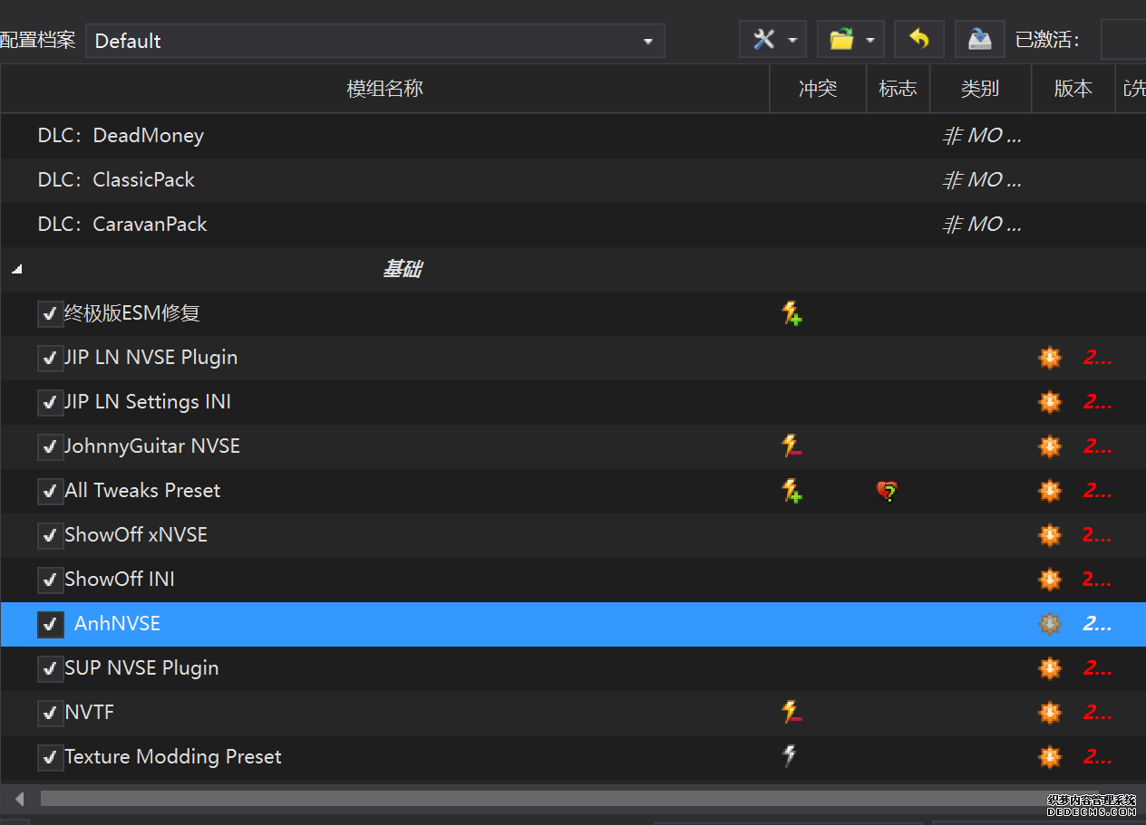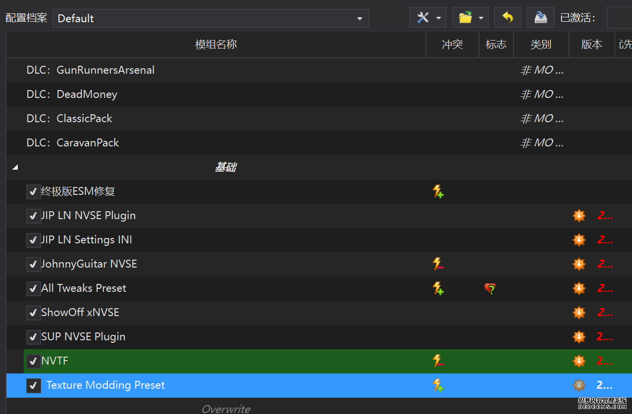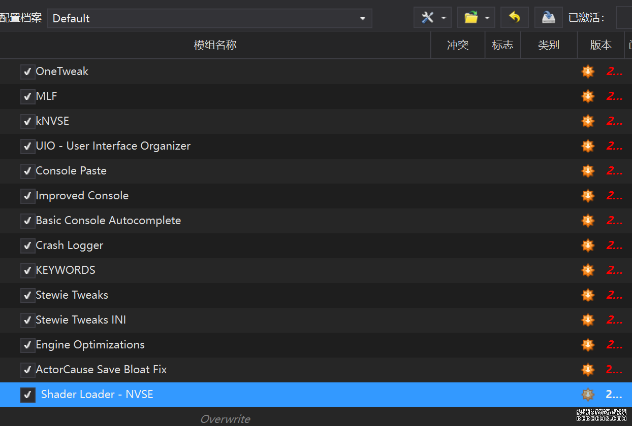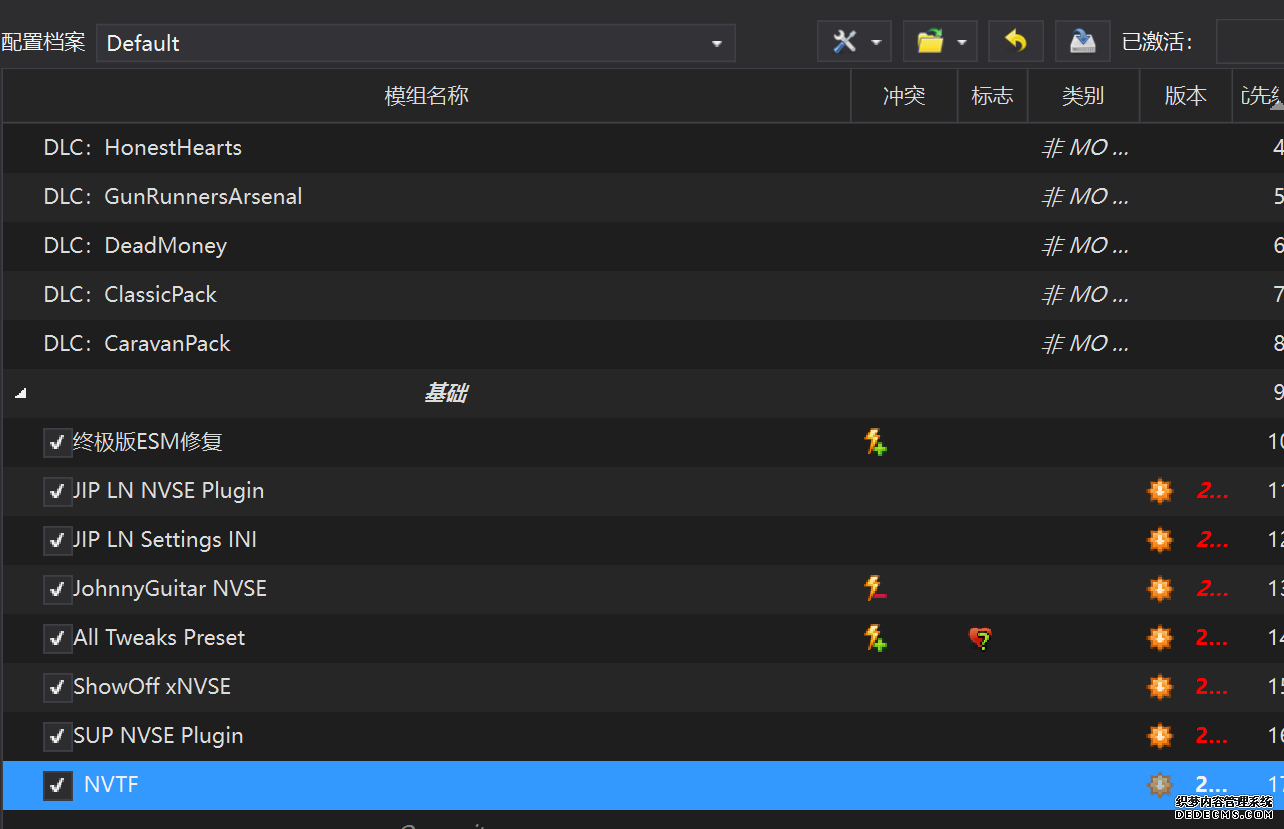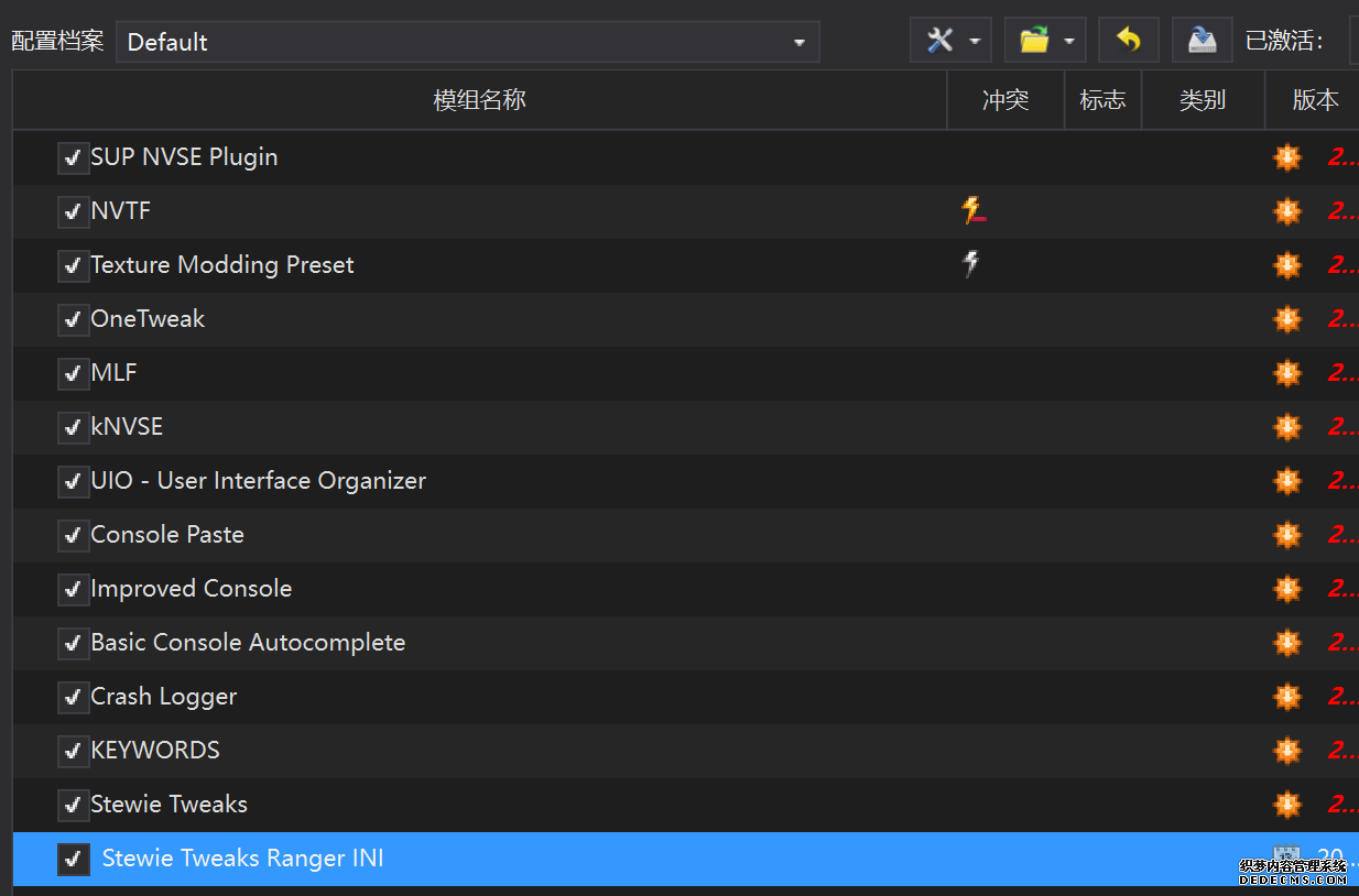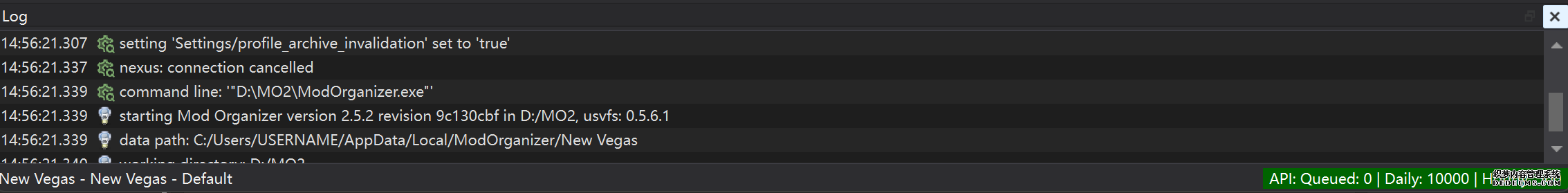 确保已安装全部VC++运行库的最新版(尤其是这三个里最后一个链接): https://aka.ms/vs/17/release/vc_redist.x64.exe https://aka.ms/vs/17/release/vc_redist.x86.exe https://www.techpowerup.com/downloa 另外也要确保已安装.NET Framework 4运行库: https://www.microsoft.com/zh-cn/download/details.aspx?id=17851 在游戏平台安装,安装前确认已拥有全部DLC,并将游戏安装在C盘等系统盘之外 ![]() 游戏安装完成后,在游戏平台启动游戏或双击FalloutNVLauncher.exe(即游戏启动器),此时应该弹出这一窗口 如果没有弹出窗口,请确保已删除我的文档\My Games内的FalloutNV文件夹 ![]() 首先点击“确定”,游戏将自动生成配置文件并提示,只需再次点击“确定” ![]() 随后点击“OPTIONS”,启动器将弹出这一窗口 ![]() 首先在Detail一栏点击“Ultra”(如果电脑配置真的非常、非常、非常低,可以选择Medium代替),弹出如图所示的窗口,点击确定 ![]() 然后在Resolution一栏选择屏幕的原生分辨率(我的屏幕是16:10的2560x1600) 不要忽略这一步骤,否则游戏分辨率将出现问题 ![]() 随后点击OK并点击EXIT退出,不要更改其他选项(尤其不要取消选择HDR,即使屏幕不是HDR也得选择HDR),游戏本体安装的部分就此结束 本教程将要使用大量来自N网(即nexusmods,B社游戏最大的Mod托管网站)的资源,接下来将介绍N网使用的基本方法 ![]() 想要下载N网资源,首先需要有一个N网账号。进入N网(Nexus Mods :: Home),点击右上角Register字样 ![]() 填写邮箱、验证邮箱、创建账号,出现该页时直接点击右上角CLOSE字样,下载Mod不需要付费 ![]() 注册完成后回到主页,此时右上角应如图所示,代表注册已完成 ![]() 接下来介绍Mod下载步骤,以下面即将下载的MO2为例,打开Mod页面后应如图所示,注意中间的DESCRIPTION,FILES等栏目。本教程涉及的MOD只需按教程说明进行下载即可。 (如要安装教程外MOD,请仔细阅读DESCRIPTION页面及FILES页面文件注释,同时注意POSTS页面红框置顶评论!) ![]() 打开FILES一栏,可能会有不同文件分类(MAIN FILES即主文件,UPDATE FILES即升级文件 OPTIONAL FILES即选装文件 MISCELLANEOUSL FILES即杂项文件),按教程说明选择文件,点击MANUAL DOWNLOAD ![]() 点击SLOW DOWNLOAD,读秒完成后即可开始下载,推荐使用IDM等多线程下载工具,对N网的简单介绍到此结束 MOD管理器只推荐使用Mod Organizer 2即MO2[1] 首先下载MO2。如果你此前已经使用过MO2,可以跳过该步骤。 原址: Mod Organizer 2 下载主文件:Mod Organizer 2 本指南只支持最新版MO2(2.5.2及以上),请自行检查版本!!! ![]() 下载完成后打开安装exe,选择同意协议、Next ![]() 选择安装位置,注意把安装位置从默认的C盘目录更改到其他盘内,点击Next ![]() 安装配置不需要更改,直接点击Next ![]() 创建一个桌面快捷方式方便打开,点Next ![]() 再次确认安装目录位于系统盘之外,点Install安装 ![]() 安装完成后点Finish,自动启动MO2 ![]() MO2启动,此时应该出现一个名为“Creating an instance”的窗口。(如果已安装MO2,则点击左上角第一个大按钮,点击Create New instance/创建新实例),点击“Create a global instance”(中文版则为创建全局实例),来到下一个窗口 ![]() 检查此处的“New Vegas”选项是否与游戏的安装目录相符合,如符合则选择该选项,如不符合则点击“Browse...”手动选择游戏目录(Steam可右击游戏-管理-浏览本地文件查看) ![]() 选择对应游戏版本,此处我用的是GOG版所以选GOG,Steam版选Steam,Epic版选Epic Games ![]() 保持此处的实例名称栏目不动,点击Next ![]() 此处全部勾选,开启实例专用INI、实例专用INI存档、封装包无效化,点击Next ![]() 在一个非C盘、仍有较多空间的磁盘建立名为FNVData的空文件夹(不要把实例创建在MO2文件夹或游戏文件夹里!!!),在此处窗口的Location一栏中选择该文件夹,结果应如图所示。(如有Warning则无视)点击Next ![]() 点击Finish ![]() 如此时弹出该窗口,则先选择"Remember my choice" 再选择"Clear the read-only flag",无则忽略 ![]() 若出现此窗口则选择"Do Nothing" ![]() 如继续弹出该窗口,选择“No,don`t ask again”,无则忽略(如弹出“Show tutorial?”窗口,选择“No”,无则忽略) ![]() 进入MO2后,首先点击被红圈圈中的该按钮打开设置 ![]() 在此处的Language一栏中选择“Chinese(Simplified)”,切换为简体中文 ![]() 在Theme一栏的Style可选择自己喜欢的主题,我用的是最下面的vs15 Dark,点击OK保存 ![]() MO2界面下方Log一栏没有什么重要信息,可以直接关掉 ![]() MO2管理器主界面说明,来自KYK的Fallout:New Vegas一站式问题解决教程(里面有些mod目前不推荐安装) ![]() 在右侧插件一栏中,拖动可改变插件加载顺序,请确保游戏本体的插件排列始终保持该顺序,无论如何都不要变更,日后添加新插件只能排列在此之下。 如果你像我一样,在底下多了一个名为“FalloutNV_lang.esp”[2]的插件,需要按照以下步骤手动删除(没有则忽略): ![]() 点击该按钮,打开游戏根目录文件夹 ![]() 找到与FalloutNV.exe处于同一文件夹内的Data子文件夹,打开 ![]() 找到FalloutNV_lang.esp,删除 ![]() 回到MO2按F5刷新,可以看到FalloutNV_lang.esp已经被删除 ![]() 随后点击档案的Default字样,点击管理,将弹出新窗口 ![]() 在新窗口中,确保下面使用专属存档、使用专属INI、自动去封装包核验[3](也就是材质无效化,以后不需要额外进行材质无效化操作)三项均已勾选,点击关闭 ![]() 随后点击左上倒数第二个按钮即插件按钮,选择ini编辑器,此时将弹出ini编辑窗口 ![]() 选择第三项falloutcustom.ini(此时该项应该为空