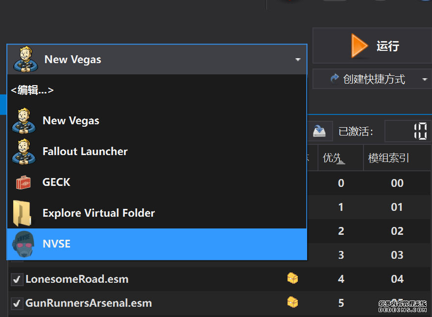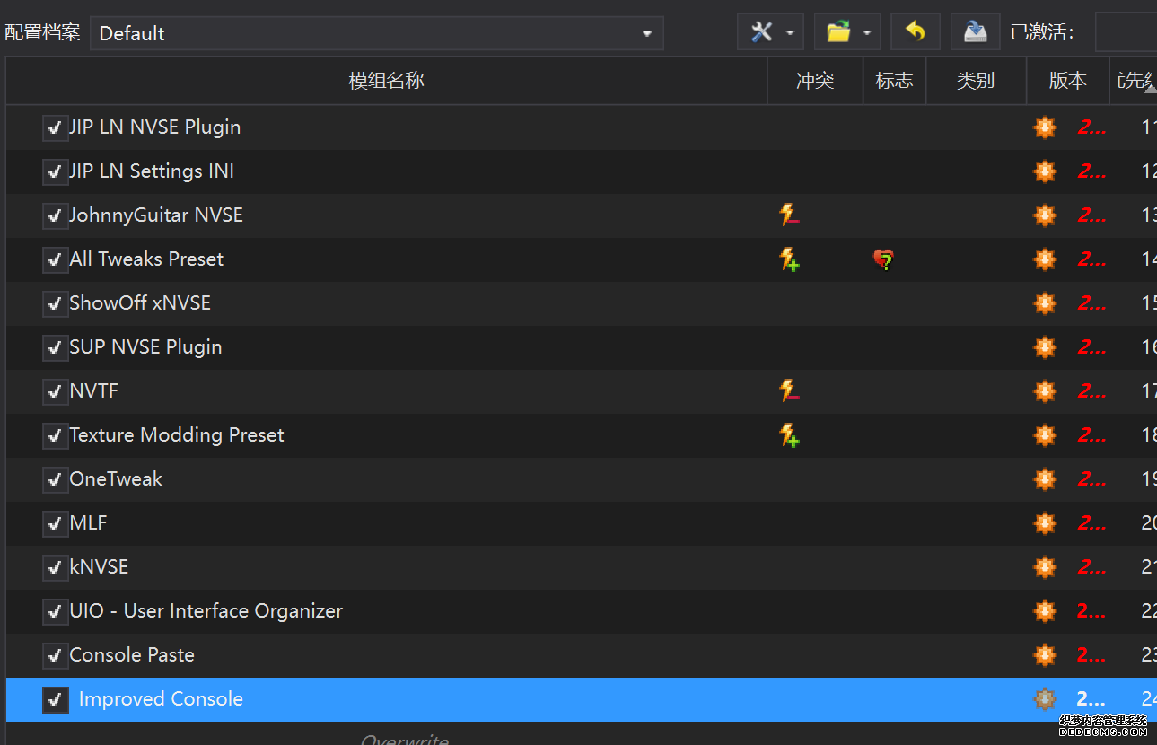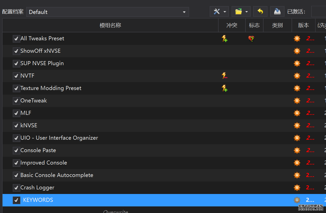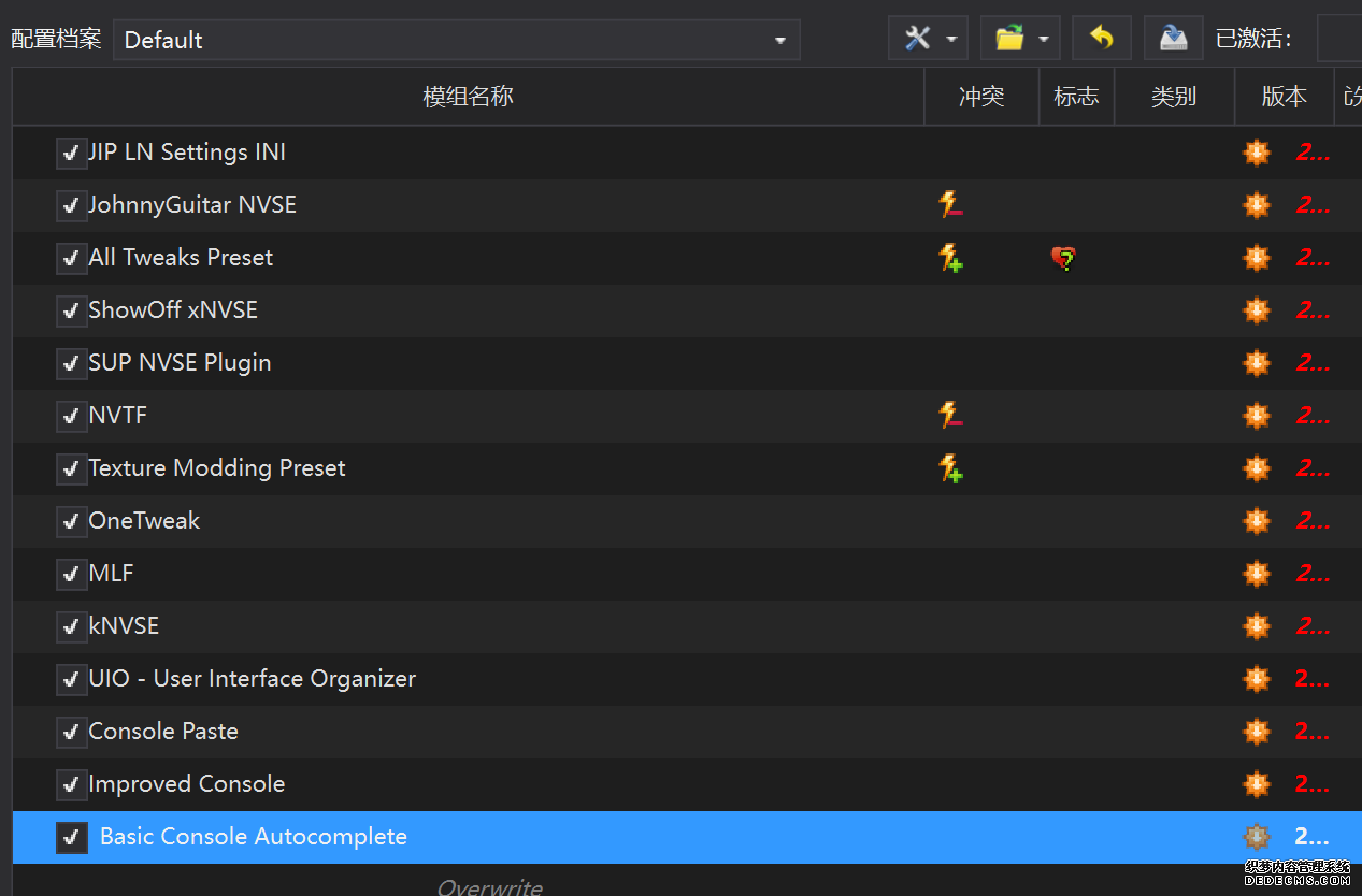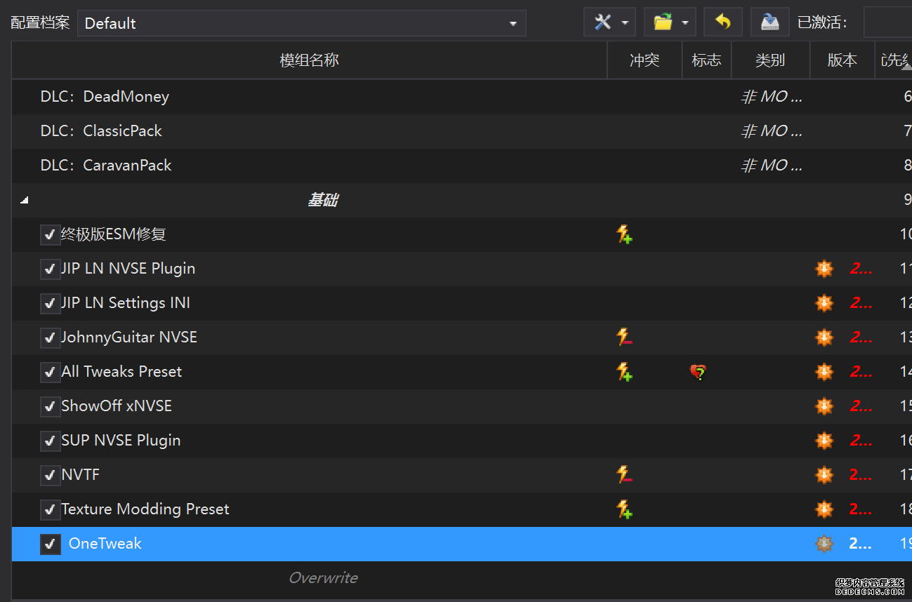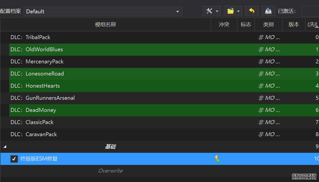 确保已安装全部VC++运行库的最新版(尤其是这三个里最后一个链接): https://aka.ms/vs/17/release/vc_redist.x64.exe https://aka.ms/vs/17/release/vc_redist.x86.exe https://www.techpowerup.com/downloa 另外也要确保已安装.NET Framework 4运行库: https://www.microsoft.com/zh-cn/download/details.aspx?id=17851 在游戏平台安装,安装前确认已拥有全部DLC,并将游戏安装在C盘等系统盘之外 ![]() 游戏安装完成后,在游戏平台启动游戏或双击FalloutNVLauncher.exe(即游戏启动器),此时应该弹出这一窗口 如果没有弹出窗口,请确保已删除我的文档\My Games内的FalloutNV文件夹 ![]() 首先点击“确定”,游戏将自动生成配置文件并提示,只需再次点击“确定” ![]() 随后点击“OPTIONS”,启动器将弹出这一窗口 ![]() 首先在Detail一栏点击“Ultra”(如果电脑配置真的非常、非常、非常低,可以选择Medium代替),弹出如图所示的窗口,点击确定 ![]() 然后在Resolution一栏选择屏幕的原生分辨率(我的屏幕是16:10的2560x1600) 不要忽略这一步骤,否则游戏分辨率将出现问题 ![]() 随后点击OK并点击EXIT退出,不要更改其他选项(尤其不要取消选择HDR,即使屏幕不是HDR也得选择HDR),游戏本体安装的部分就此结束 本教程将要使用大量来自N网(即nexusmods,B社游戏最大的Mod托管网站)的资源,接下来将介绍N网使用的基本方法 ![]() 想要下载N网资源,首先需要有一个N网账号。进入N网(Nexus Mods :: Home),点击右上角Register字样 ![]() 填写邮箱、验证邮箱、创建账号,出现该页时直接点击右上角CLOSE字样,下载Mod不需要付费 ![]() 注册完成后回到主页,此时右上角应如图所示,代表注册已完成 ![]() 接下来介绍Mod下载步骤,以下面即将下载的MO2为例,打开Mod页面后应如图所示,注意中间的DESCRIPTION,FILES等栏目。本教程涉及的MOD只需按教程说明进行下载即可。 (如要安装教程外MOD,请仔细阅读DESCRIPTION页面及FILES页面文件注释,同时注意POSTS页面红框置顶评论!) ![]() 打开FILES一栏,可能会有不同文件分类(MAIN FILES即主文件,UPDATE FILES即升级文件 OPTIONAL FILES即选装文件 MISCELLANEOUSL FILES即杂项文件),按教程说明选择文件,点击MANUAL DOWNLOAD ![]() 点击SLOW DOWNLOAD,读秒完成后即可开始下载,推荐使用IDM等多线程下载工具,对N网的简单介绍到此结束 MOD管理器只推荐使用Mod Organizer 2即MO2[1] 首先下载MO2。如果你此前已经使用过MO2,可以跳过该步骤。 原址: Mod Organizer 2 下载主文件:Mod Organizer 2 本指南只支持最新版MO2(2.5.2及以上),请自行检查版本!!! ![]() 下载完成后打开安装exe,选择同意协议、Next ![]() 选择安装位置,注意把安装位置从默认的C盘目录更改到其他盘内,点击Next ![]() 安装配置不需要更改,直接点击Next ![]() 创建一个桌面快捷方式方便打开,点Next ![]() 再次确认安装目录位于系统盘之外,点Install安装 ![]() 安装完成后点Finish,自动启动MO2 ![]() MO2启动,此时应该出现一个名为“Creating an instance”的窗口。(如果已安装MO2,则点击左上角第一个大按钮,点击Create New instance/创建新实例),点击“Create a global instance”(中文版则为创建全局实例),来到下一个窗口 ![]() 检查此处的“New Vegas”选项是否与游戏的安装目录相符合,如符合则选择该选项,如不符合则点击“Browse...”手动选择游戏目录(Steam可右击游戏-管理-浏览本地文件查看) ![]() 选择对应游戏版本,此处我用的是GOG版所以选GOG,Steam版选Steam,Epic版选Epic Games ![]() 保持此处的实例名称栏目不动,点击Next ![]() 此处全部勾选,开启实例专用INI、实例专用INI存档、封装包无效化,点击Next ![]() 在一个非C盘、仍有较多空间的磁盘建立名为FNVData的空文件夹(不要把实例创建在MO2文件夹或游戏文件夹里!!!),在此处窗口的Location一栏中选择该文件夹,结果应如图所示。(如有Warning则无视)点击Next ![]() 点击Finish ![]() 如此时弹出该窗口,则先选择"Remember my choice" 再选择"Clear the read-only flag",无则忽略 ![]() 若出现此窗口则选择"Do Nothing" ![]() 如继续弹出该窗口,选择“No,don`t ask again”,无则忽略(如弹出“Show tutorial?”窗口,选择“No”,无则忽略) ![]() 进入MO2后,首先点击被红圈圈中的该按钮打开设置 ![]() 在此处的Language一栏中选择“Chinese(Simplified)”,切换为简体中文 ![]() 在Theme一栏的Style可选择自己喜欢的主题,我用的是最下面的vs15 Dark,点击OK保存 ![]() MO2界面下方Log一栏没有什么重要信息,可以直接关掉 ![]() MO2管理器主界面说明,来自KYK的Fallout:New Vegas一站式问题解决教程(里面有些mod目前不推荐安装) ![]() 在右侧插件一栏中,拖动可改变插件加载顺序,请确保游戏本体的插件排列始终保持该顺序,无论如何都不要变更,日后添加新插件只能排列在此之下。 如果你像我一样,在底下多了一个名为“FalloutNV_lang.esp”[2]的插件,需要按照以下步骤手动删除(没有则忽略): ![]() 点击该按钮,打开游戏根目录文件夹 ![]() 找到与FalloutNV.exe处于同一文件夹内的Data子文件夹,打开 ![]() 找到FalloutNV_lang.esp,删除 ![]() 回到MO2按F5刷新,可以看到FalloutNV_lang.esp已经被删除 ![]() 随后点击档案的Default字样,点击管理,将弹出新窗口 ![]() 在新窗口中,确保下面使用专属存档、使用专属INI、自动去封装包核验[3](也就是材质无效化,以后不需要额外进行材质无效化操作)三项均已勾选,点击关闭 ![]() 随后点击左上倒数第二个按钮即插件按钮,选择ini编辑器,此时将弹出ini编辑窗口 ![]() 选择第三项falloutcustom.ini(此时该项应该为空