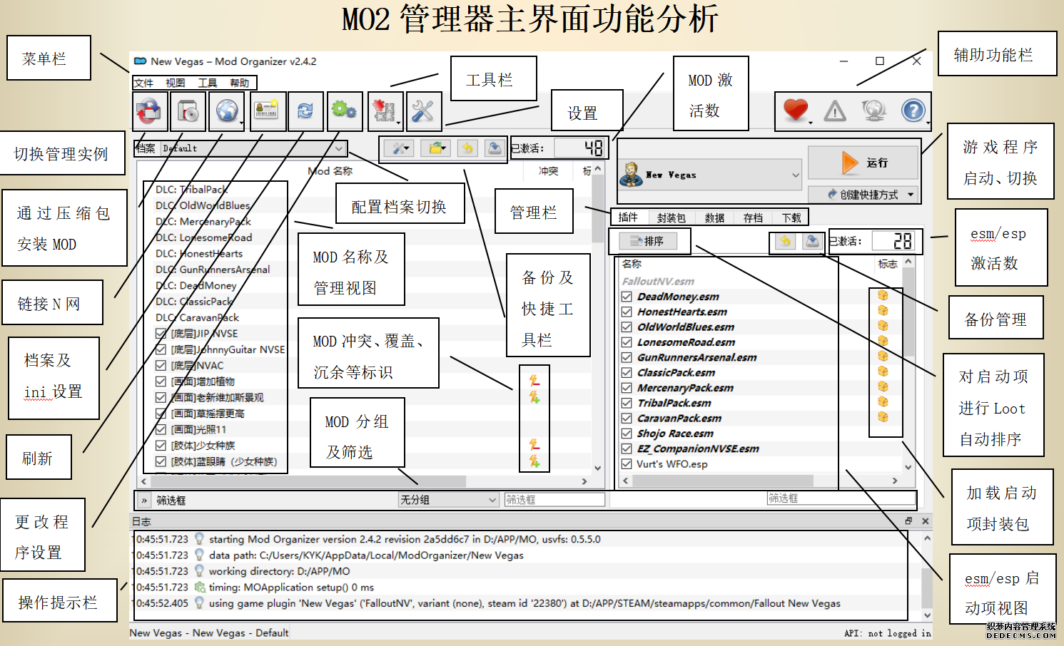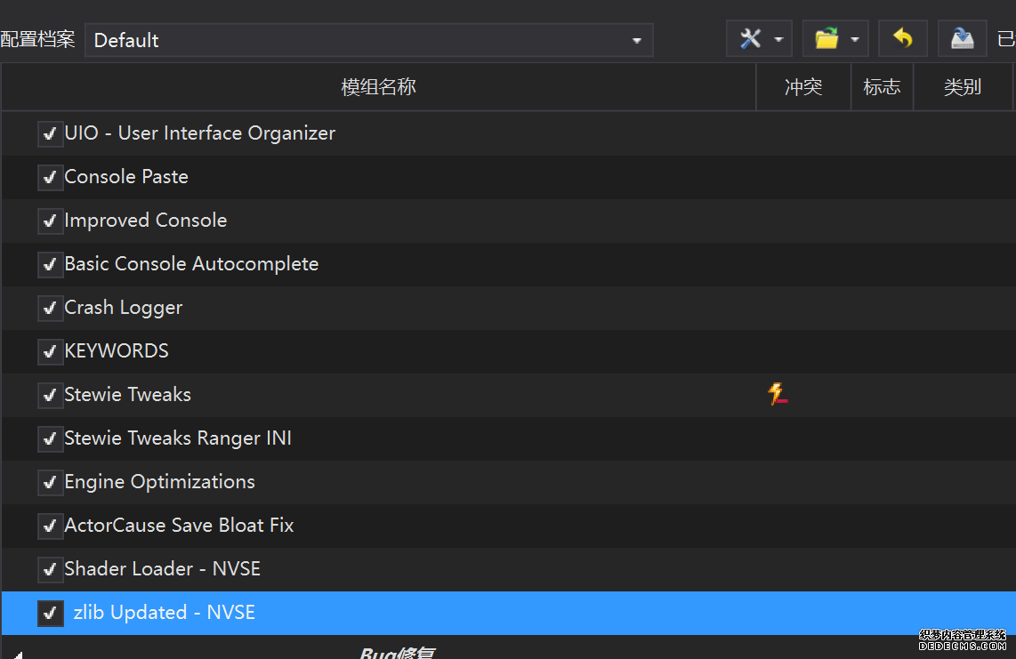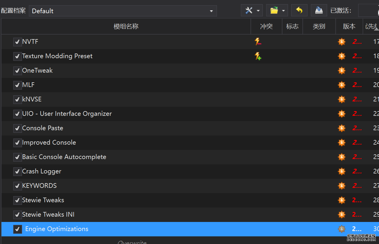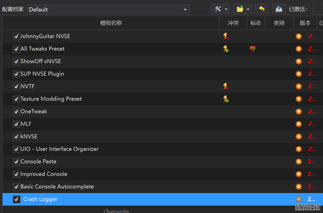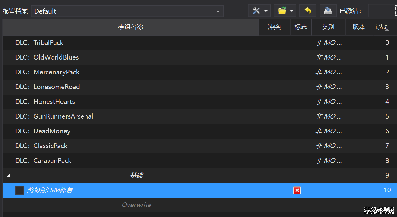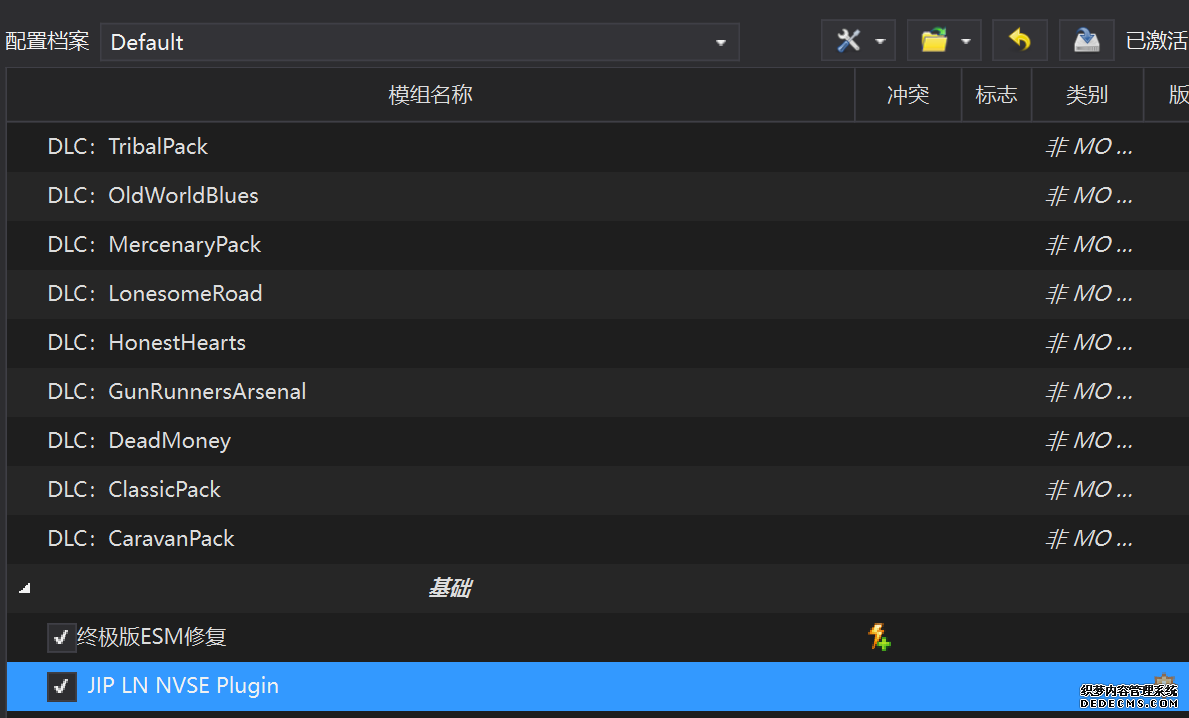确保已安装全部VC++运行库的最新版(尤其是这三个里最后一个链接): https://aka.ms/vs/17/release/vc_redist.x64.exe https://aka.ms/vs/17/release/vc_redist.x86.exe https://www.techpowerup.com/downloa 另外也要确保已安装.NET Framework 4运行库: https://www.microsoft.com/zh-cn/download/details.aspx?id=17851 在游戏平台安装,安装前确认已拥有全部DLC,并将游戏安装在C盘等系统盘之外 ![]() 游戏安装完成后,在游戏平台启动游戏或双击FalloutNVLauncher.exe(即游戏启动器),此时应该弹出这一窗口 如果没有弹出窗口,请确保已删除我的文档\My Games内的FalloutNV文件夹 ![]() 首先点击“确定”,游戏将自动生成配置文件并提示,只需再次点击“确定” ![]() 随后点击“OPTIONS”,启动器将弹出这一窗口 ![]() 首先在Detail一栏点击“Ultra”(如果电脑配置真的非常、非常、非常低,可以选择Medium代替),弹出如图所示的窗口,点击确定 ![]() 然后在Resolution一栏选择屏幕的原生分辨率(我的屏幕是16:10的2560x1600) 不要忽略这一步骤,否则游戏分辨率将出现问题 ![]() 随后点击OK并点击EXIT退出,不要更改其他选项(尤其不要取消选择HDR,即使屏幕不是HDR也得选择HDR),游戏本体安装的部分就此结束 本教程将要使用大量来自N网(即nexusmods,B社游戏最大的Mod托管网站)的资源,接下来将介绍N网使用的基本方法 ![]() 想要下载N网资源,首先需要有一个N网账号。进入N网(Nexus Mods :: Home),点击右上角Register字样 ![]() 填写邮箱、验证邮箱、创建账号,出现该页时直接点击右上角CLOSE字样,下载Mod不需要付费 ![]() 注册完成后回到主页,此时右上角应如图所示,代表注册已完成 ![]() 接下来介绍Mod下载步骤,以下面即将下载的MO2为例,打开Mod页面后应如图所示,注意中间的DESCRIPTION,FILES等栏目。本教程涉及的MOD只需按教程说明进行下载即可。 (如要安装教程外MOD,请仔细阅读DESCRIPTION页面及FILES页面文件注释,同时注意POSTS页面红框置顶评论!) ![]() 打开FILES一栏,可能会有不同文件分类(MAIN FILES即主文件,UPDATE FILES即升级文件 OPTIONAL FILES即选装文件 MISCELLANEOUSL FILES即杂项文件),按教程说明选择文件,点击MANUAL DOWNLOAD ![]() 点击SLOW DOWNLOAD,读秒完成后即可开始下载,推荐使用IDM等多线程下载工具,对N网的简单介绍到此结束 MOD管理器只推荐使用Mod Organizer 2即MO2[1] 首先下载MO2。如果你此前已经使用过MO2,可以跳过该步骤。 原址: Mod Organizer 2 下载主文件:Mod Organizer 2 本指南只支持最新版MO2(2.5.2及以上),请自行检查版本!!! ![]() 下载完成后打开安装exe,选择同意协议、Next ![]() 选择安装位置,注意把安装位置从默认的C盘目录更改到其他盘内,点击Next ![]() 安装配置不需要更改,直接点击Next ![]() 创建一个桌面快捷方式方便打开,点Next ![]() 再次确认安装目录位于系统盘之外,点Install安装 ![]() 安装完成后点Finish,自动启动MO2 ![]() MO2启动,此时应该出现一个名为“Creating an instance”的窗口。(如果已安装MO2,则点击左上角第一个大按钮,点击Create New instance/创建新实例),点击“Create a global instance”(中文版则为创建全局实例),来到下一个窗口 ![]() 检查此处的“New Vegas”选项是否与游戏的安装目录相符合,如符合则选择该选项,如不符合则点击“Browse...”手动选择游戏目录(Steam可右击游戏-管理-浏览本地文件查看) ![]() 选择对应游戏版本,此处我用的是GOG版所以选GOG,Steam版选Steam,Epic版选Epic Games ![]() 保持此处的实例名称栏目不动,点击Next ![]() 此处全部勾选,开启实例专用INI、实例专用INI存档、封装包无效化,点击Next ![]() 在一个非C盘、仍有较多空间的磁盘建立名为FNVData的空文件夹(不要把实例创建在MO2文件夹或游戏文件夹里!!!),在此处窗口的Location一栏中选择该文件夹,结果应如图所示。(如有Warning则无视)点击Next ![]() 点击Finish ![]() 如此时弹出该窗口,则先选择"Remember my choice" 再选择"Clear the read-only flag",无则忽略 ![]() 若出现此窗口则选择"Do Nothing" ![]() 如继续弹出该窗口,选择“No,don`t ask again”,无则忽略(如弹出“Show tutorial?”窗口,选择“No”,无则忽略) ![]() 进入MO2后,首先点击被红圈圈中的该按钮打开设置 ![]() 在此处的Language一栏中选择“Chinese(Simplified)”,切换为简体中文 ![]() 在Theme一栏的Style可选择自己喜欢的主题,我用的是最下面的vs15 Dark,点击OK保存 ![]() MO2界面下方Log一栏没有什么重要信息,可以直接关掉 ![]() MO2管理器主界面说明,来自KYK的Fallout:New Vegas一站式问题解决教程(里面有些mod目前不推荐安装) ![]() 在右侧插件一栏中,拖动可改变插件加载顺序,请确保游戏本体的插件排列始终保持该顺序,无论如何都不要变更,日后添加新插件只能排列在此之下。 如果你像我一样,在底下多了一个名为“FalloutNV_lang.esp”[2]的插件,需要按照以下步骤手动删除(没有则忽略): ![]() 点击该按钮,打开游戏根目录文件夹 ![]() 找到与FalloutNV.exe处于同一文件夹内的Data子文件夹,打开 ![]() 找到FalloutNV_lang.esp,删除 ![]() 回到MO2按F5刷新,可以看到FalloutNV_lang.esp已经被删除 ![]() 随后点击档案的Default字样,点击管理,将弹出新窗口 ![]() 在新窗口中,确保下面使用专属存档、使用专属INI、自动去封装包核验[3](也就是材质无效化,以后不需要额外进行材质无效化操作)三项均已勾选,点击关闭 ![]() 随后点击左上倒数第二个按钮即插件按钮,选择ini编辑器,此时将弹出ini编辑窗口 ![]() 选择第三项falloutcustom.ini(此时该项应该为空