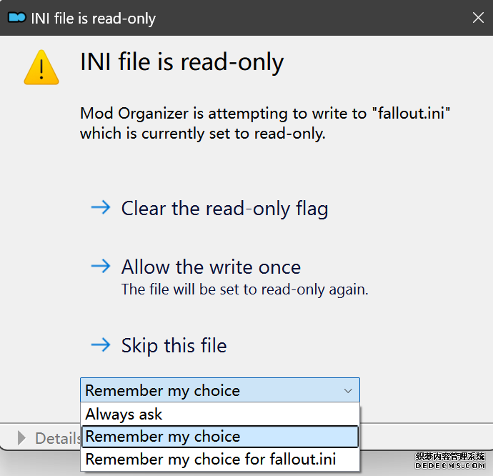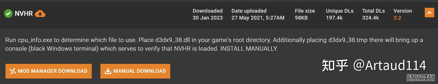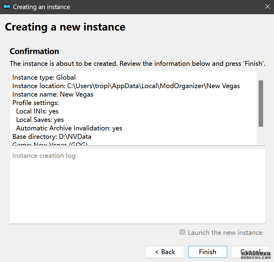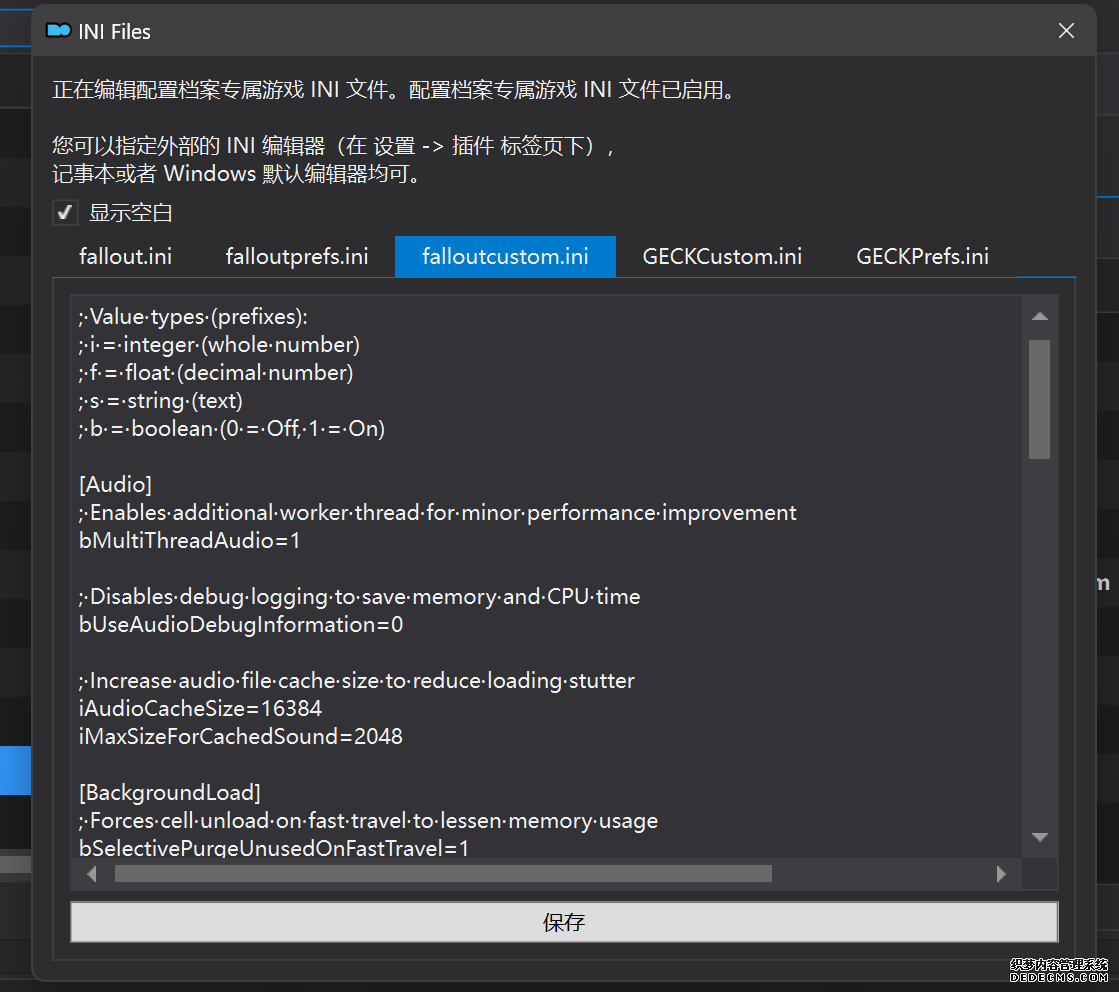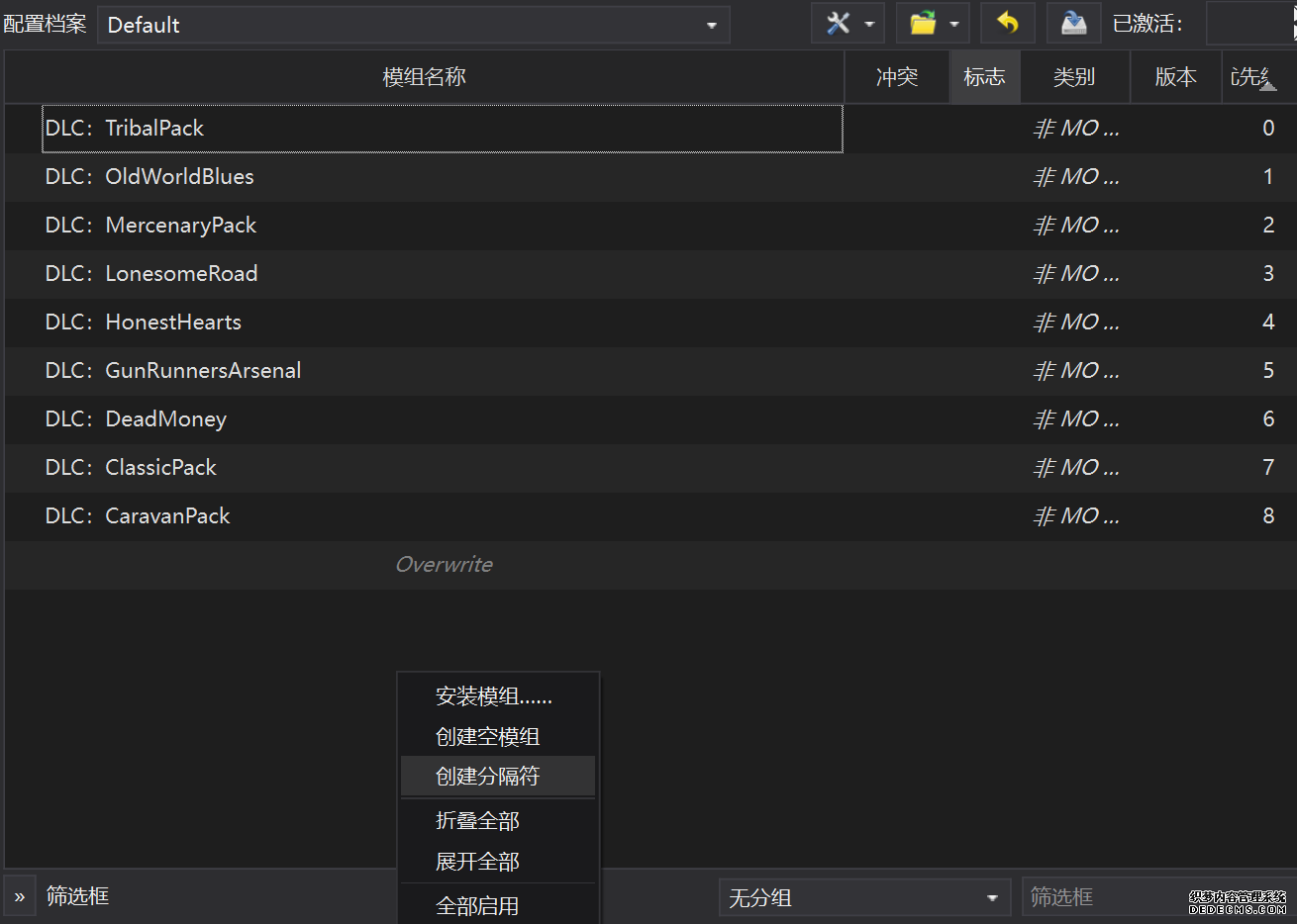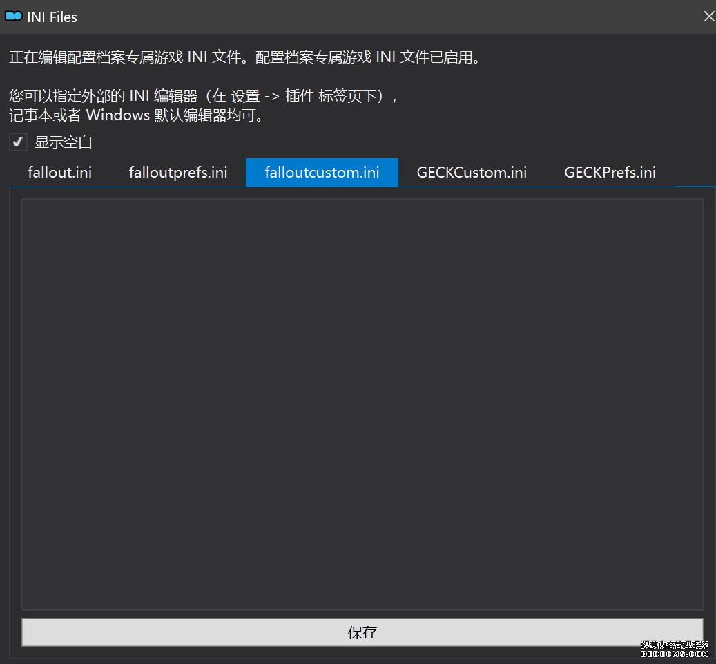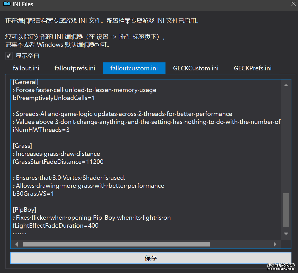 确保已安装全部VC++运行库的最新版(尤其是这三个里最后一个链接): https://aka.ms/vs/17/release/vc_redist.x64.exe https://aka.ms/vs/17/release/vc_redist.x86.exe https://www.techpowerup.com/downloa 另外也要确保已安装.NET Framework 4运行库: https://www.microsoft.com/zh-cn/download/details.aspx?id=17851 在游戏平台安装,安装前确认已拥有全部DLC,并将游戏安装在C盘等系统盘之外 ![]() 游戏安装完成后,在游戏平台启动游戏或双击FalloutNVLauncher.exe(即游戏启动器),此时应该弹出这一窗口 如果没有弹出窗口,请确保已删除我的文档\My Games内的FalloutNV文件夹 ![]() 首先点击“确定”,游戏将自动生成配置文件并提示,只需再次点击“确定” ![]() 随后点击“OPTIONS”,启动器将弹出这一窗口 ![]() 首先在Detail一栏点击“Ultra”(如果电脑配置真的非常、非常、非常低,可以选择Medium代替),弹出如图所示的窗口,点击确定 ![]() 然后在Resolution一栏选择屏幕的原生分辨率(我的屏幕是16:10的2560x1600) 不要忽略这一步骤,否则游戏分辨率将出现问题 ![]() 随后点击OK并点击EXIT退出,不要更改其他选项(尤其不要取消选择HDR,即使屏幕不是HDR也得选择HDR),游戏本体安装的部分就此结束 本教程将要使用大量来自N网(即nexusmods,B社游戏最大的Mod托管网站)的资源,接下来将介绍N网使用的基本方法 ![]() 想要下载N网资源,首先需要有一个N网账号。进入N网(Nexus Mods :: Home),点击右上角Register字样 ![]() 填写邮箱、验证邮箱、创建账号,出现该页时直接点击右上角CLOSE字样,下载Mod不需要付费 ![]() 注册完成后回到主页,此时右上角应如图所示,代表注册已完成 ![]() 接下来介绍Mod下载步骤,以下面即将下载的MO2为例,打开Mod页面后应如图所示,注意中间的DESCRIPTION,FILES等栏目。本教程涉及的MOD只需按教程说明进行下载即可。 (如要安装教程外MOD,请仔细阅读DESCRIPTION页面及FILES页面文件注释,同时注意POSTS页面红框置顶评论!) ![]() 打开FILES一栏,可能会有不同文件分类(MAIN FILES即主文件,UPDATE FILES即升级文件 OPTIONAL FILES即选装文件 MISCELLANEOUSL FILES即杂项文件),按教程说明选择文件,点击MANUAL DOWNLOAD ![]() 点击SLOW DOWNLOAD,读秒完成后即可开始下载,推荐使用IDM等多线程下载工具,对N网的简单介绍到此结束 MOD管理器只推荐使用Mod Organizer 2即MO2[1] 首先下载MO2。如果你此前已经使用过MO2,可以跳过该步骤。 原址: Mod Organizer 2 下载主文件:Mod Organizer 2 本指南只支持最新版MO2(2.5.2及以上),请自行检查版本!!! ![]() 下载完成后打开安装exe,选择同意协议、Next ![]() 选择安装位置,注意把安装位置从默认的C盘目录更改到其他盘内,点击Next ![]() 安装配置不需要更改,直接点击Next ![]() 创建一个桌面快捷方式方便打开,点Next ![]() 再次确认安装目录位于系统盘之外,点Install安装 ![]() 安装完成后点Finish,自动启动MO2 ![]() MO2启动,此时应该出现一个名为“Creating an instance”的窗口。(如果已安装MO2,则点击左上角第一个大按钮,点击Create New instance/创建新实例),点击“Create a global instance”(中文版则为创建全局实例),来到下一个窗口 ![]() 检查此处的“New Vegas”选项是否与游戏的安装目录相符合,如符合则选择该选项,如不符合则点击“Browse...”手动选择游戏目录(Steam可右击游戏-管理-浏览本地文件查看) ![]() 选择对应游戏版本,此处我用的是GOG版所以选GOG,Steam版选Steam,Epic版选Epic Games ![]() 保持此处的实例名称栏目不动,点击Next ![]() 此处全部勾选,开启实例专用INI、实例专用INI存档、封装包无效化,点击Next ![]() 在一个非C盘、仍有较多空间的磁盘建立名为FNVData的空文件夹(不要把实例创建在MO2文件夹或游戏文件夹里!!!),在此处窗口的Location一栏中选择该文件夹,结果应如图所示。(如有Warning则无视)点击Next ![]() 点击Finish ![]() 如此时弹出该窗口,则先选择"Remember my choice" 再选择"Clear the read-only flag",无则忽略 ![]() 若出现此窗口则选择"Do Nothing" ![]() 如继续弹出该窗口,选择“No,don`t ask again”,无则忽略(如弹出“Show tutorial?”窗口,选择“No”,无则忽略) ![]() 进入MO2后,首先点击被红圈圈中的该按钮打开设置 ![]() 在此处的Language一栏中选择“Chinese(Simplified)”,切换为简体中文 ![]() 在Theme一栏的Style可选择自己喜欢的主题,我用的是最下面的vs15 Dark,点击OK保存 ![]() MO2界面下方Log一栏没有什么重要信息,可以直接关掉 ![]() MO2管理器主界面说明,来自KYK的Fallout:New Vegas一站式问题解决教程(里面有些mod目前不推荐安装) ![]() 在右侧插件一栏中,拖动可改变插件加载顺序,请确保游戏本体的插件排列始终保持该顺序,无论如何都不要变更,日后添加新插件只能排列在此之下。 如果你像我一样,在底下多了一个名为“FalloutNV_lang.esp”[2]的插件,需要按照以下步骤手动删除(没有则忽略): ![]() 点击该按钮,打开游戏根目录文件夹 ![]() 找到与FalloutNV.exe处于同一文件夹内的Data子文件夹,打开 ![]() 找到FalloutNV_lang.esp,删除 ![]() 回到MO2按F5刷新,可以看到FalloutNV_lang.esp已经被删除 ![]() 随后点击档案的Default字样,点击管理,将弹出新窗口 ![]() 在新窗口中,确保下面使用专属存档、使用专属INI、自动去封装包核验[3](也就是材质无效化,以后不需要额外进行材质无效化操作)三项均已勾选,点击关闭 ![]() 随后点击左上倒数第二个按钮即插件按钮,选择ini编辑器,此时将弹出ini编辑窗口 ![]() 选择第三项falloutcustom.ini(此时该项应该为空