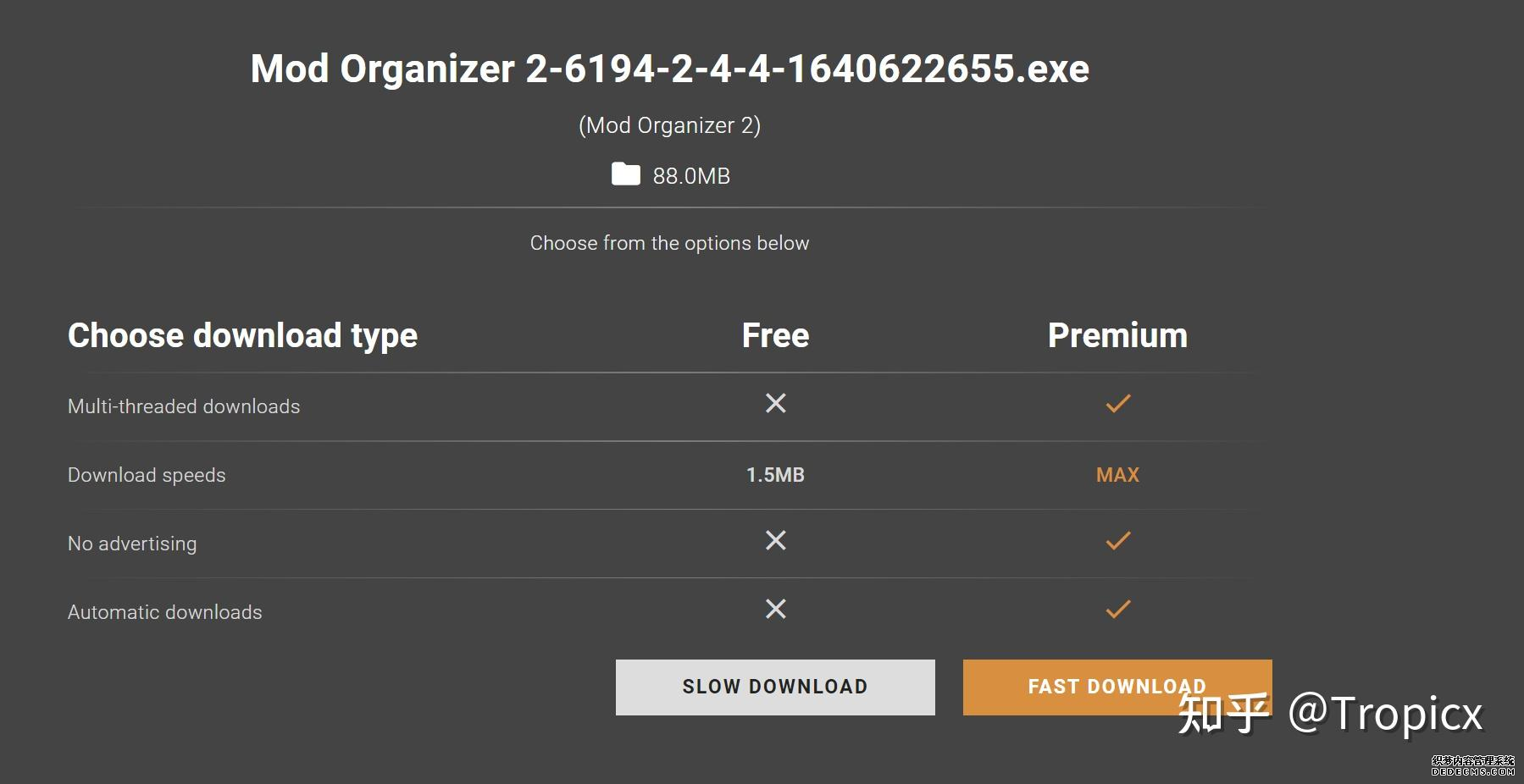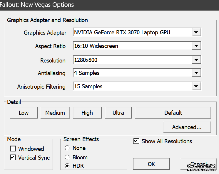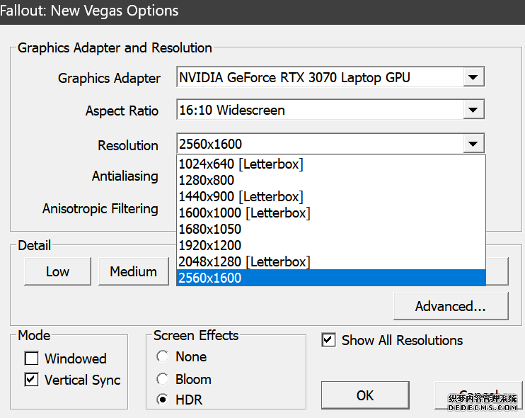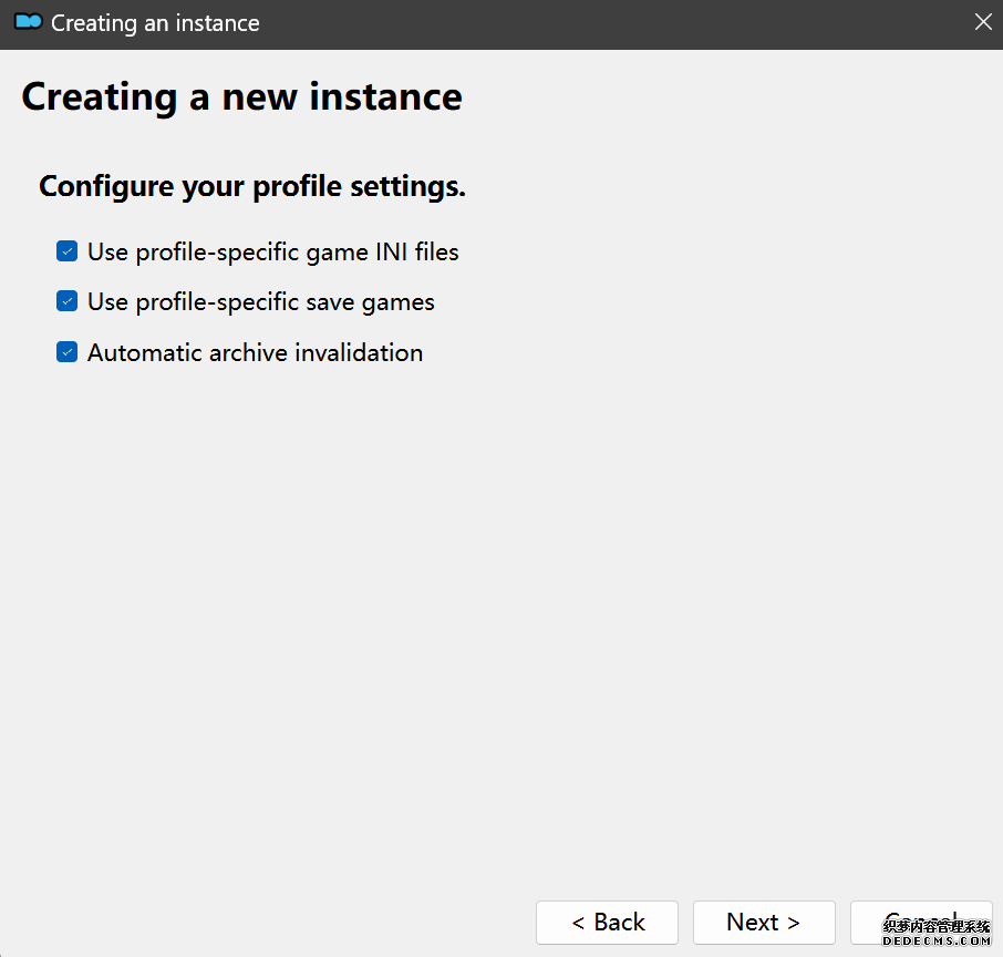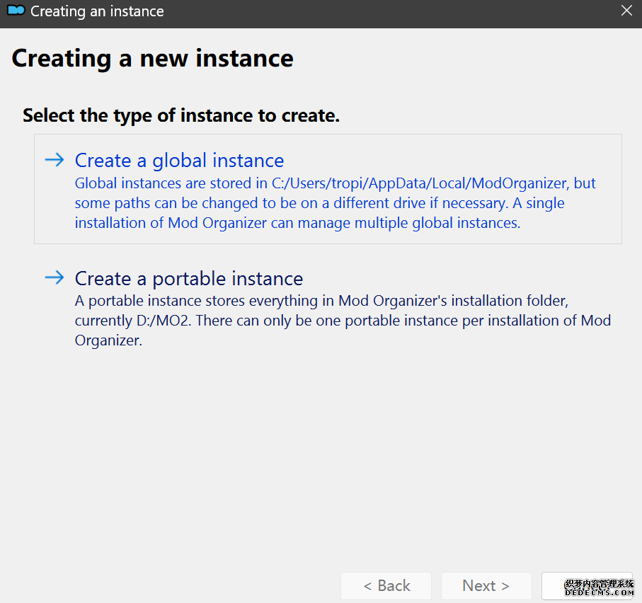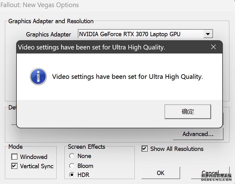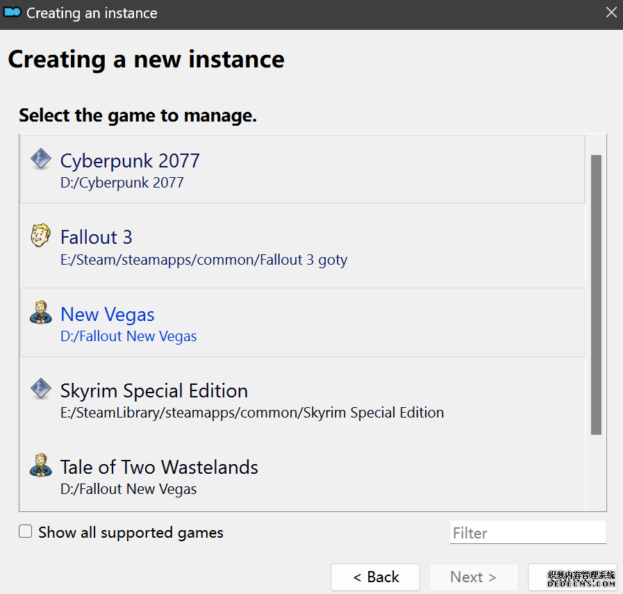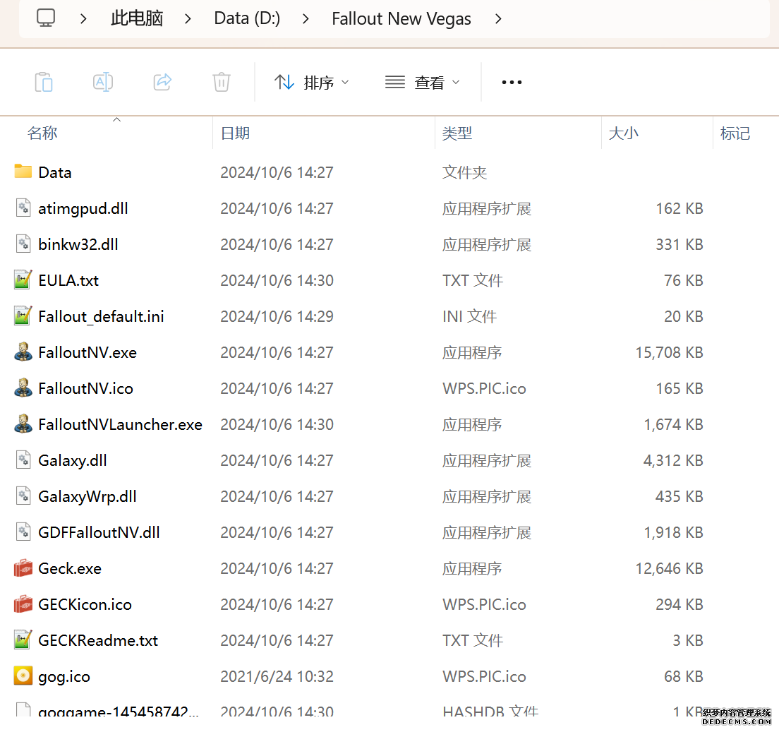 确保已安装全部VC++运行库的最新版(尤其是这三个里最后一个链接): https://aka.ms/vs/17/release/vc_redist.x64.exe https://aka.ms/vs/17/release/vc_redist.x86.exe https://www.techpowerup.com/downloa 另外也要确保已安装.NET Framework 4运行库: https://www.microsoft.com/zh-cn/download/details.aspx?id=17851 在游戏平台安装,安装前确认已拥有全部DLC,并将游戏安装在C盘等系统盘之外 ![]() 游戏安装完成后,在游戏平台启动游戏或双击FalloutNVLauncher.exe(即游戏启动器),此时应该弹出这一窗口 如果没有弹出窗口,请确保已删除我的文档\My Games内的FalloutNV文件夹 ![]() 首先点击“确定”,游戏将自动生成配置文件并提示,只需再次点击“确定” ![]() 随后点击“OPTIONS”,启动器将弹出这一窗口 ![]() 首先在Detail一栏点击“Ultra”(如果电脑配置真的非常、非常、非常低,可以选择Medium代替),弹出如图所示的窗口,点击确定 ![]() 然后在Resolution一栏选择屏幕的原生分辨率(我的屏幕是16:10的2560x1600) 不要忽略这一步骤,否则游戏分辨率将出现问题 ![]() 随后点击OK并点击EXIT退出,不要更改其他选项(尤其不要取消选择HDR,即使屏幕不是HDR也得选择HDR),游戏本体安装的部分就此结束 本教程将要使用大量来自N网(即nexusmods,B社游戏最大的Mod托管网站)的资源,接下来将介绍N网使用的基本方法 ![]() 想要下载N网资源,首先需要有一个N网账号。进入N网(Nexus Mods :: Home),点击右上角Register字样 ![]() 填写邮箱、验证邮箱、创建账号,出现该页时直接点击右上角CLOSE字样,下载Mod不需要付费 ![]() 注册完成后回到主页,此时右上角应如图所示,代表注册已完成 ![]() 接下来介绍Mod下载步骤,以下面即将下载的MO2为例,打开Mod页面后应如图所示,注意中间的DESCRIPTION,FILES等栏目。本教程涉及的MOD只需按教程说明进行下载即可。 (如要安装教程外MOD,请仔细阅读DESCRIPTION页面及FILES页面文件注释,同时注意POSTS页面红框置顶评论!) ![]() 打开FILES一栏,可能会有不同文件分类(MAIN FILES即主文件,UPDATE FILES即升级文件 OPTIONAL FILES即选装文件 MISCELLANEOUSL FILES即杂项文件),按教程说明选择文件,点击MANUAL DOWNLOAD ![]() 点击SLOW DOWNLOAD,读秒完成后即可开始下载,推荐使用IDM等多线程下载工具,对N网的简单介绍到此结束 MOD管理器只推荐使用Mod Organizer 2即MO2[1] 首先下载MO2。如果你此前已经使用过MO2,可以跳过该步骤。 原址: Mod Organizer 2 下载主文件:Mod Organizer 2 本指南只支持最新版MO2(2.5.2及以上),请自行检查版本!!! ![]() 下载完成后打开安装exe,选择同意协议、Next ![]() 选择安装位置,注意把安装位置从默认的C盘目录更改到其他盘内,点击Next ![]() 安装配置不需要更改,直接点击Next ![]() 创建一个桌面快捷方式方便打开,点Next ![]() 再次确认安装目录位于系统盘之外,点Install安装 ![]() 安装完成后点Finish,自动启动MO2 ![]() MO2启动,此时应该出现一个名为“Creating an instance”的窗口。(如果已安装MO2,则点击左上角第一个大按钮,点击Create New instance/创建新实例),点击“Create a global instance”(中文版则为创建全局实例),来到下一个窗口 ![]() 检查此处的“New Vegas”选项是否与游戏的安装目录相符合,如符合则选择该选项,如不符合则点击“Browse...”手动选择游戏目录(Steam可右击游戏-管理-浏览本地文件查看) ![]() 选择对应游戏版本,此处我用的是GOG版所以选GOG,Steam版选Steam,Epic版选Epic Games ![]() 保持此处的实例名称栏目不动,点击Next ![]() 此处全部勾选,开启实例专用INI、实例专用INI存档、封装包无效化,点击Next ![]() 在一个非C盘、仍有较多空间的磁盘建立名为FNVData的空文件夹(不要把实例创建在MO2文件夹或游戏文件夹里!!!),在此处窗口的Location一栏中选择该文件夹,结果应如图所示。(如有Warning则无视)点击Next ![]() 点击Finish ![]() 如此时弹出该窗口,则先选择"Remember my choice" 再选择"Clear the read-only flag",无则忽略 ![]() 若出现此窗口则选择"Do Nothing" ![]() 如继续弹出该窗口,选择“No,don`t ask again”,无则忽略(如弹出“Show tutorial?”窗口,选择“No”,无则忽略) ![]() 进入MO2后,首先点击被红圈圈中的该按钮打开设置 ![]() 在此处的Language一栏中选择“Chinese(Simplified)”,切换为简体中文 ![]() 在Theme一栏的Style可选择自己喜欢的主题,我用的是最下面的vs15 Dark,点击OK保存 ![]() MO2界面下方Log一栏没有什么重要信息,可以直接关掉 ![]() MO2管理器主界面说明,来自KYK的Fallout:New Vegas一站式问题解决教程(里面有些mod目前不推荐安装) ![]() 在右侧插件一栏中,拖动可改变插件加载顺序,请确保游戏本体的插件排列始终保持该顺序,无论如何都不要变更,日后添加新插件只能排列在此之下。 如果你像我一样,在底下多了一个名为“FalloutNV_lang.esp”[2]的插件,需要按照以下步骤手动删除(没有则忽略): ![]() 点击该按钮,打开游戏根目录文件夹 ![]() 找到与FalloutNV.exe处于同一文件夹内的Data子文件夹,打开 ![]() 找到FalloutNV_lang.esp,删除 ![]() 回到MO2按F5刷新,可以看到FalloutNV_lang.esp已经被删除 ![]() 随后点击档案的Default字样,点击管理,将弹出新窗口 ![]() 在新窗口中,确保下面使用专属存档、使用专属INI、自动去封装包核验[3](也就是材质无效化,以后不需要额外进行材质无效化操作)三项均已勾选,点击关闭 ![]() 随后点击左上倒数第二个按钮即插件按钮,选择ini编辑器,此时将弹出ini编辑窗口 ![]() 选择第三项falloutcustom.ini(此时该项应该为空