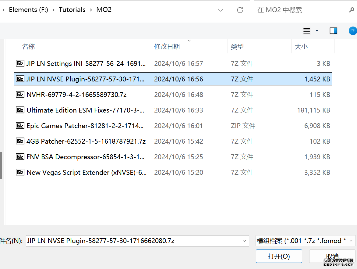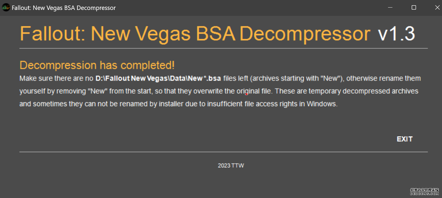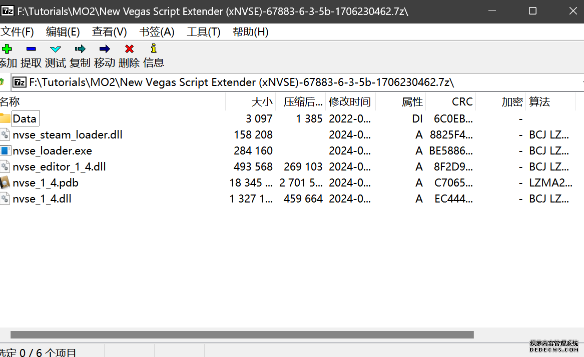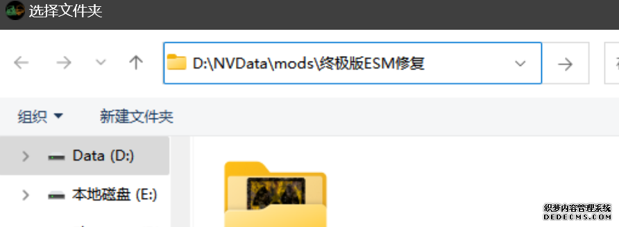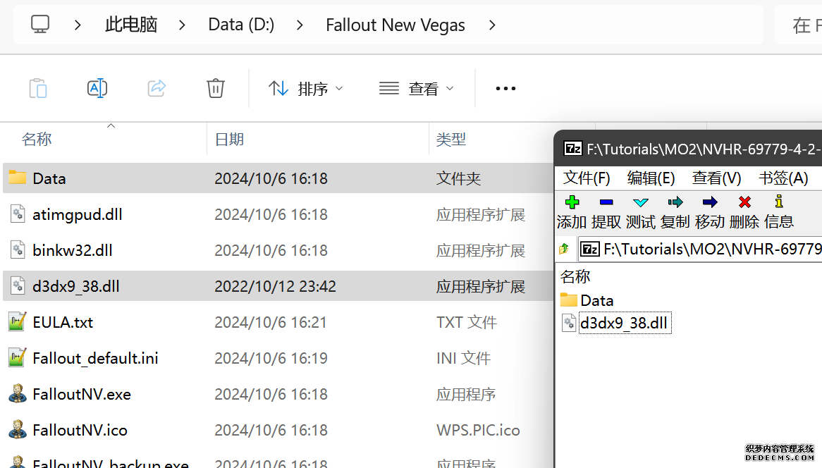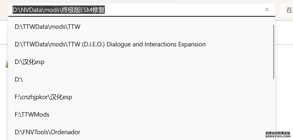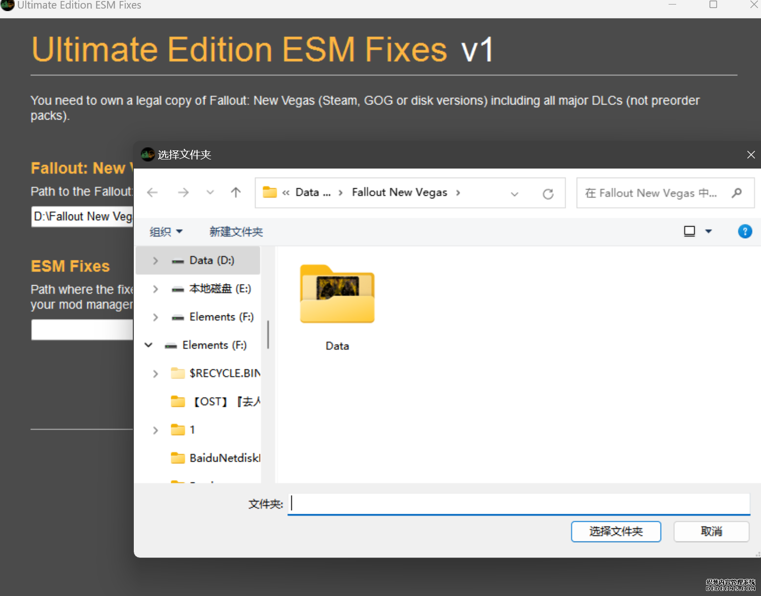 大多数mod使用MO2安装,少部分Mod(下面要安装的xNVSE、NVHR等)使用根目录安装,我们将首先进行根目录安装 ![]() MO2安装一般方法:点击MO2界面左上角第二个大按钮(图中被红圈圈中的按钮) ![]() 选择Mod的压缩包(此处以JIP LN NVSE插件的本体为例)并点击打开 ![]() 点击确定安装 ![]() 最后点击前面方框勾选即可 根目录安装一般方法:手动将文件复制到游戏根目录内[4] 首先安装的是xNVSE,即NVSE的最新版本,也是许多Mod正常运行所需的框架。 接下来正式开始安装,首先下载文件 原址: https://www.nexusmods.com/newvegas/mods/67883?tab=files 下载主文件:New Vegas Script Extender (NVSE) ![]() 下载完成后打开压缩包,此时应如图所示 ![]() 然后回到MO2,首先点击此处打开游戏文件夹 ![]() 游戏根目录文件夹应如图所示。(由于版本区别,部分文件略有不同属正常现象,只要看到FalloutNV.exe即代表正确) ![]() 将压缩包内所有内容(包括压缩包内的Data文件夹)拖动解压到根目录内,如图所示(图没截全)。 GOG、Epic等非Steam版也需要nvse_steam_loader.dll xNVSE安装完毕,这也是根目录安装Mod的一般方法 ![]() 重新启动MO2时,在启动选项里可能会出现NVSE,但按照本指南正确配置将不使用此选项启动游戏,后续启动游戏仍使用New Vegas启动选项(完成基础部分之前请不要启动游戏!!!) 接下来安装4GB补丁,原本新维加斯的exe只能调用2GB内存,使用这个补丁后能将调用内存扩充到4GB,减少闪退卡顿,并且和JIP配合可以做到直接用FalloutNV.exe挂载NVSE启动 4GB补丁分为两种,一种仅供Steam版和GOG版使用(GOG版也需要4GB补丁),一种仅供Epic版使用 两种补丁不能混用,也不能用在错误的游戏版本上,请注意选择正确的4GB补丁!!! Steam版、GOG版(Epic平台的游戏请直接跳到下方Epic版): 原址: https://www.nexusmods.com/newvegas/mods/62552?tab=files 下载主文件:4GB Patcher(第一个) ![]() 打开下载的文件,将FNVpatch.exe解压到游戏根目录,并以管理员身份运行 ![]() 此时应弹出如图所示的窗口,按任意键继续 如未提示"FalloutNV.exe patched!" 则为4GB补丁和游戏exe不匹配导致安装失败,请检查选择的4GB补丁版本、游戏exe是否为原版 ![]() 查看根目录,应出现FalloutNV_backup.exe,此时针对Steam版和GOG版的4GB补丁安装成功 Epic版(Steam版和GOG版请跳过此部分): 原址: https://www.nexusmods.com/newvegas/mods/81281?tab=files 下载主文件:Epic Games Patcher ![]() 打开下载的文件,将其中内容解压到游戏根目录(FalloutNV.exe所在处),并以管理员身份运行Patcher.exe ![]() 此时应弹出如图所示的窗口,按任意键继续 如未提示"Patching completed successfully"和"Registry key created"则为4GB补丁和游戏exe不匹配导致安装失败,请检查选择的4GB补丁版本、游戏exe是否为原版 ![]() 查看根目录,应出现FalloutNV_backup.exe,此时针对Epic版的4GB补丁安装成功 按照不同游戏版本安装完4GB补丁后继续安装其他基础mod,首先是FNV BSA Decompressor,即针对新维加斯的BSA解压器,这个Mod将原本被压缩的游戏文件解压缩并重新打包,提高读取速度、修复声音Bug 打算自行安装TTW的不需要进行此步骤 首先下载该Mod 原址: https://www.nexusmods.com/newvegas/mods/65854?tab=files 下载主文件:FNV BSA Decompressor ![]() 下载后不要直接使用MO2安装,而是将压缩包里面的内容解压到C盘、MO2实例和游戏目录之外的一个单独空文件夹内,如图所示 ![]() 双击FNV BSA Decompressor.exe启动,应弹出如图所示的窗口 ![]() 点击上面一栏的Browse,并选择游戏根目录文件夹 ![]() 再点击下面一栏的Browse,选择游戏根目录里的的Data文件夹 ![]() 选择完成后点击下方DECOMPRESS字样开始解压 ![]() 此时应弹出如图所示的进度条,等待读条完成 ![]() 读条完成后窗口应如图所示,点击EXIT关闭,FNV BSA Decompressor安装完成 接下来安装汉化ESM修复,通过清理游戏本体的ESM提高游戏性能、修复错误 打算自行安装TTW的不需要进行此步骤 ![]() 首先,为了方便日后管理Mod,需要创建一个分隔符来标注Mod类型。 右键MO2左侧的空白位置,选择创建分隔符 ![]() 将分隔符命名为"基础"并确定 ![]() 效果如图所示 ![]() 然后右键-创建空模组 ![]() 命名为终极版ESM修复,并确定 ![]() 效果如图所示 随后下载终极版ESM修复的mod文件 原址: Ultimate Edition ESM Fixes 下载主文件:Ultimate Edition ESM Fixes ![]() 和新维加斯BSA解压器一样,解压到C盘、MO2实例和游戏目录之外的一个单独空文件夹内,如图所示 ![]() 打开Installer.exe,将弹出如图所示的窗口 ![]() 点击上面的Browse,选择游戏根目录 ![]() 回到MO2,右键刚才新创建的终极版ESM修复,选择在资源管理器中打开 ![]() 复制新弹出窗口的这一地址 ![]() 再回到终极版ESM修复的窗口,点击第二个Browse,并将地址粘贴在上方地址栏内,点击回车 ![]() 确认已经选中终极版ESM修复文件夹,再点击选择文件夹 ![]() 此时终极版ESM修复窗口应如图所示,点击INSTALL开始安装 ![]() 等待读条结束 ![]() 随后终极版ESM修复窗口应如图所示,点击EXIT退出 ![]() 回到MO2,勾选终极版ESM修复并按F5刷新,就能看到这一mod已经覆盖了dlc的esm插件,说明终极版esm修复安装成功 NVHR重写了新维加斯内存处理所调用的的堆,提高游戏内存使用效率,有助于改善各种跳出卡顿问题。 原址: New Vegas Heap Replacer 下载主文件:NVHR ![]() 下载完成后,将压缩包内文件解压到游戏根目录,如图所示,NVHR安装完成 ![]() 今后在启动游戏时会弹出如图所示的窗口,这是正常现象 根据软硬件及mod环境的不同,最新版本的NVHR可能