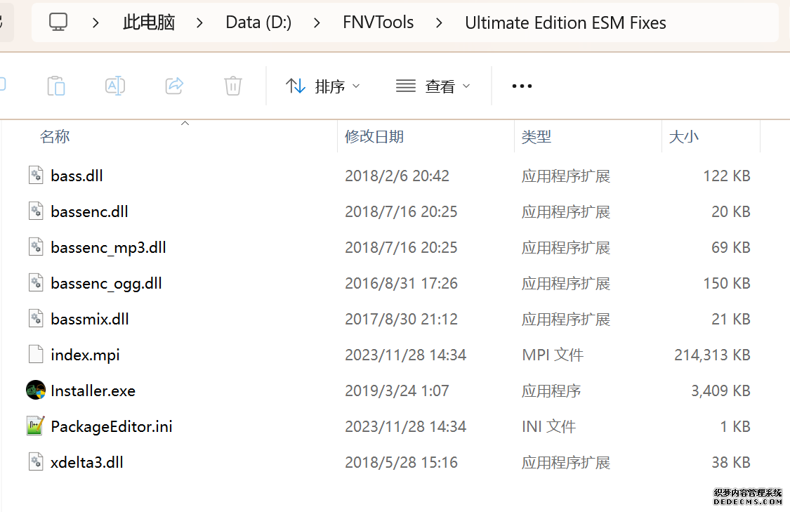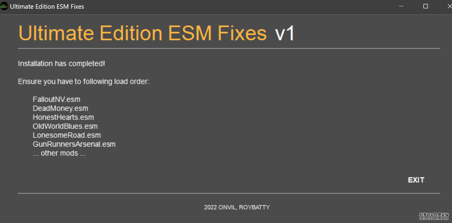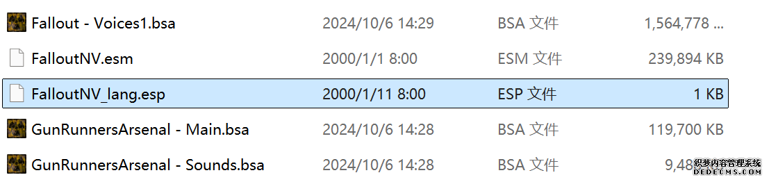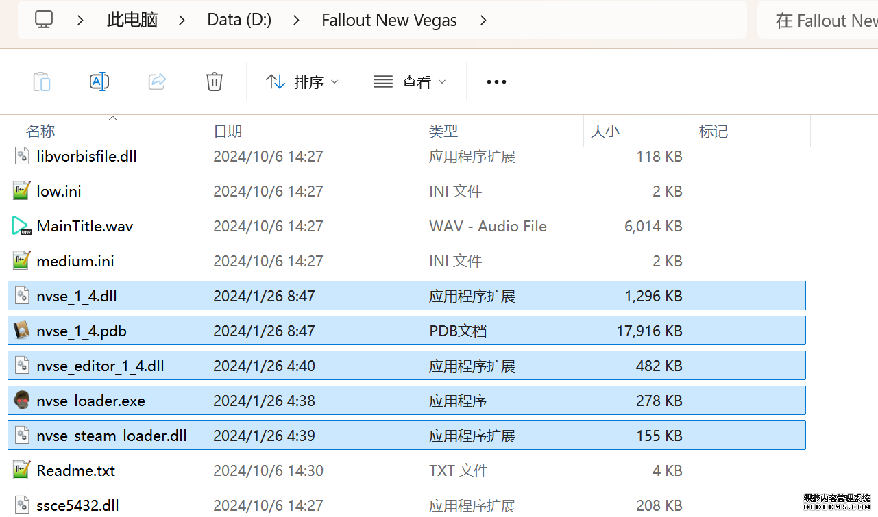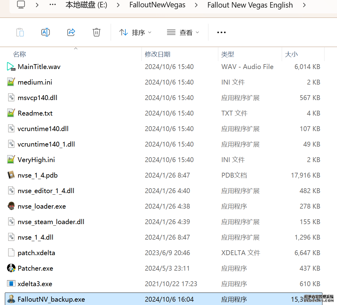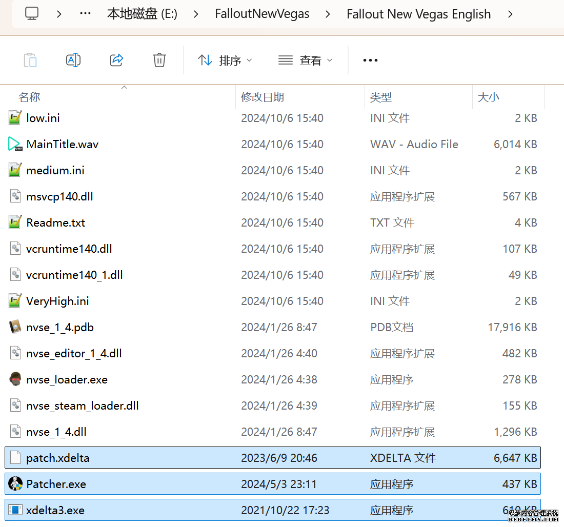 大多数mod使用MO2安装,少部分Mod(下面要安装的xNVSE、NVHR等)使用根目录安装,我们将首先进行根目录安装 ![]() MO2安装一般方法:点击MO2界面左上角第二个大按钮(图中被红圈圈中的按钮) ![]() 选择Mod的压缩包(此处以JIP LN NVSE插件的本体为例)并点击打开 ![]() 点击确定安装 ![]() 最后点击前面方框勾选即可 根目录安装一般方法:手动将文件复制到游戏根目录内[4] 首先安装的是xNVSE,即NVSE的最新版本,也是许多Mod正常运行所需的框架。 接下来正式开始安装,首先下载文件 原址: https://www.nexusmods.com/newvegas/mods/67883?tab=files 下载主文件:New Vegas Script Extender (NVSE) ![]() 下载完成后打开压缩包,此时应如图所示 ![]() 然后回到MO2,首先点击此处打开游戏文件夹 ![]() 游戏根目录文件夹应如图所示。(由于版本区别,部分文件略有不同属正常现象,只要看到FalloutNV.exe即代表正确) ![]() 将压缩包内所有内容(包括压缩包内的Data文件夹)拖动解压到根目录内,如图所示(图没截全)。 GOG、Epic等非Steam版也需要nvse_steam_loader.dll xNVSE安装完毕,这也是根目录安装Mod的一般方法 ![]() 重新启动MO2时,在启动选项里可能会出现NVSE,但按照本指南正确配置将不使用此选项启动游戏,后续启动游戏仍使用New Vegas启动选项(完成基础部分之前请不要启动游戏!!!) 接下来安装4GB补丁,原本新维加斯的exe只能调用2GB内存,使用这个补丁后能将调用内存扩充到4GB,减少闪退卡顿,并且和JIP配合可以做到直接用FalloutNV.exe挂载NVSE启动 4GB补丁分为两种,一种仅供Steam版和GOG版使用(GOG版也需要4GB补丁),一种仅供Epic版使用 两种补丁不能混用,也不能用在错误的游戏版本上,请注意选择正确的4GB补丁!!! Steam版、GOG版(Epic平台的游戏请直接跳到下方Epic版): 原址: https://www.nexusmods.com/newvegas/mods/62552?tab=files 下载主文件:4GB Patcher(第一个) ![]() 打开下载的文件,将FNVpatch.exe解压到游戏根目录,并以管理员身份运行 ![]() 此时应弹出如图所示的窗口,按任意键继续 如未提示"FalloutNV.exe patched!" 则为4GB补丁和游戏exe不匹配导致安装失败,请检查选择的4GB补丁版本、游戏exe是否为原版 ![]() 查看根目录,应出现FalloutNV_backup.exe,此时针对Steam版和GOG版的4GB补丁安装成功 Epic版(Steam版和GOG版请跳过此部分): 原址: https://www.nexusmods.com/newvegas/mods/81281?tab=files 下载主文件:Epic Games Patcher ![]() 打开下载的文件,将其中内容解压到游戏根目录(FalloutNV.exe所在处),并以管理员身份运行Patcher.exe ![]() 此时应弹出如图所示的窗口,按任意键继续 如未提示"Patching completed successfully"和"Registry key created"则为4GB补丁和游戏exe不匹配导致安装失败,请检查选择的4GB补丁版本、游戏exe是否为原版 ![]() 查看根目录,应出现FalloutNV_backup.exe,此时针对Epic版的4GB补丁安装成功 按照不同游戏版本安装完4GB补丁后继续安装其他基础mod,首先是FNV BSA Decompressor,即针对新维加斯的BSA解压器,这个Mod将原本被压缩的游戏文件解压缩并重新打包,提高读取速度、修复声音Bug 打算自行安装TTW的不需要进行此步骤 首先下载该Mod 原址: https://www.nexusmods.com/newvegas/mods/65854?tab=files 下载主文件:FNV BSA Decompressor ![]() 下载后不要直接使用MO2安装,而是将压缩包里面的内容解压到C盘、MO2实例和游戏目录之外的一个单独空文件夹内,如图所示 ![]() 双击FNV BSA Decompressor.exe启动,应弹出如图所示的窗口 ![]() 点击上面一栏的Browse,并选择游戏根目录文件夹 ![]() 再点击下面一栏的Browse,选择游戏根目录里的的Data文件夹 ![]() 选择完成后点击下方DECOMPRESS字样开始解压 ![]() 此时应弹出如图所示的进度条,等待读条完成 ![]() 读条完成后窗口应如图所示,点击EXIT关闭,FNV BSA Decompressor安装完成 接下来安装汉化ESM修复,通过清理游戏本体的ESM提高游戏性能、修复错误 打算自行安装TTW的不需要进行此步骤 ![]() 首先,为了方便日后管理Mod,需要创建一个分隔符来标注Mod类型。 右键MO2左侧的空白位置,选择创建分隔符 ![]() 将分隔符命名为"基础"并确定 ![]() 效果如图所示 ![]() 然后右键-创建空模组 ![]() 命名为终极版ESM修复,并确定 ![]() 效果如图所示 随后下载终极版ESM修复的mod文件 原址: Ultimate Edition ESM Fixes 下载主文件:Ultimate Edition ESM Fixes ![]() 和新维加斯BSA解压器一样,解压到C盘、MO2实例和游戏目录之外的一个单独空文件夹内,如图所示 ![]() 打开Installer.exe,将弹出如图所示的窗口 ![]() 点击上面的Browse,选择游戏根目录 ![]() 回到MO2,右键刚才新创建的终极版ESM修复,选择在资源管理器中打开 ![]() 复制新弹出窗口的这一地址 ![]() 再回到终极版ESM修复的窗口,点击第二个Browse,并将地址粘贴在上方地址栏内,点击回车 ![]() 确认已经选中终极版ESM修复文件夹,再点击选择文件夹 ![]() 此时终极版ESM修复窗口应如图所示,点击INSTALL开始安装 ![]() 等待读条结束 ![]() 随后终极版ESM修复窗口应如图所示,点击EXIT退出 ![]() 回到MO2,勾选终极版ESM修复并按F5刷新,就能看到这一mod已经覆盖了dlc的esm插件,说明终极版esm修复安装成功 NVHR重写了新维加斯内存处理所调用的的堆,提高游戏内存使用效率,有助于改善各种跳出卡顿问题。 原址: New Vegas Heap Replacer 下载主文件:NVHR ![]() 下载完成后,将压缩包内文件解压到游戏根目录,如图所示,NVHR安装完成 ![]() 今后在启动游戏时会弹出如图所示的窗口,这是正常现象 根据软硬件及mod环境的不同,最新版本的NVHR可能
