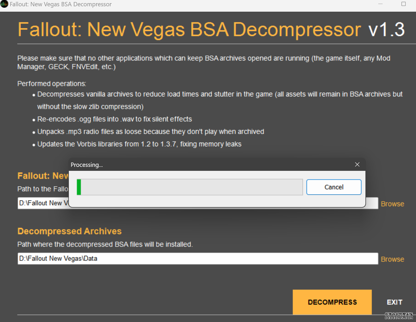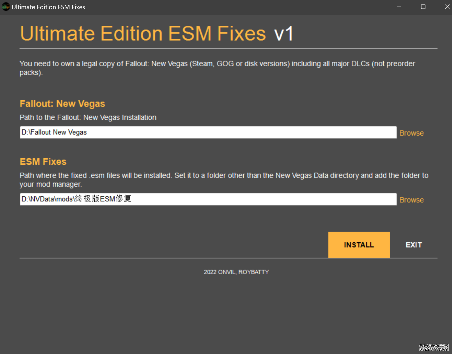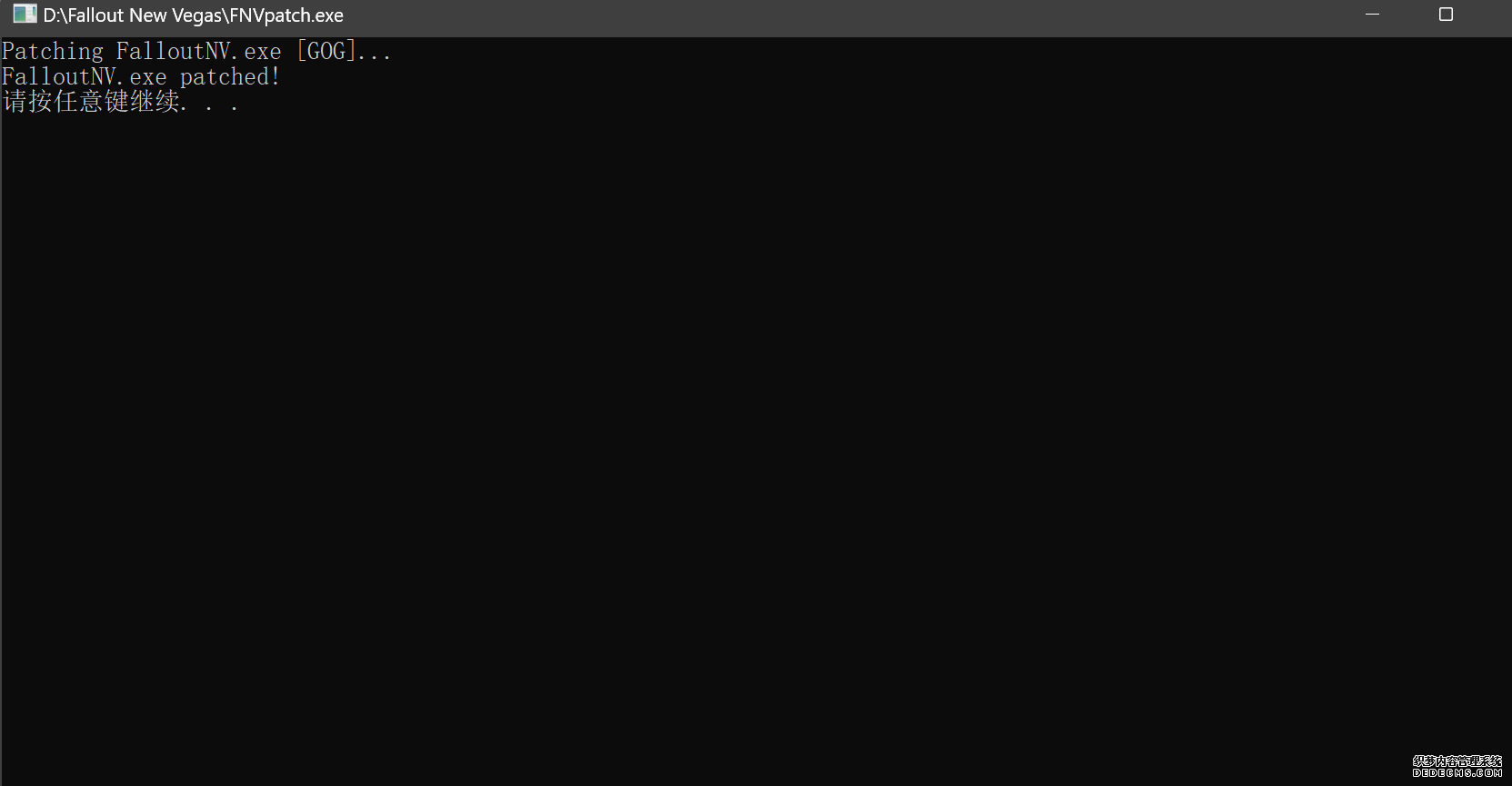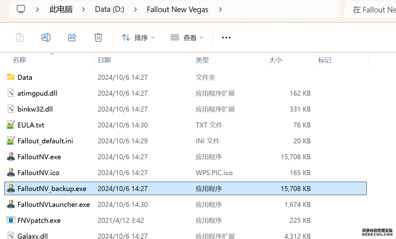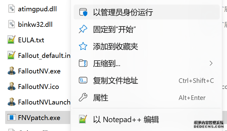 大多数mod使用MO2安装,少部分Mod(下面要安装的xNVSE、NVHR等)使用根目录安装,我们将首先进行根目录安装 ![]() MO2安装一般方法:点击MO2界面左上角第二个大按钮(图中被红圈圈中的按钮) ![]() 选择Mod的压缩包(此处以JIP LN NVSE插件的本体为例)并点击打开 ![]() 点击确定安装 ![]() 最后点击前面方框勾选即可 根目录安装一般方法:手动将文件复制到游戏根目录内[4] 首先安装的是xNVSE,即NVSE的最新版本,也是许多Mod正常运行所需的框架。 接下来正式开始安装,首先下载文件 原址: https://www.nexusmods.com/newvegas/mods/67883?tab=files 下载主文件:New Vegas Script Extender (NVSE) ![]() 下载完成后打开压缩包,此时应如图所示 ![]() 然后回到MO2,首先点击此处打开游戏文件夹 ![]() 游戏根目录文件夹应如图所示。(由于版本区别,部分文件略有不同属正常现象,只要看到FalloutNV.exe即代表正确) ![]() 将压缩包内所有内容(包括压缩包内的Data文件夹)拖动解压到根目录内,如图所示(图没截全)。 GOG、Epic等非Steam版也需要nvse_steam_loader.dll xNVSE安装完毕,这也是根目录安装Mod的一般方法 ![]() 重新启动MO2时,在启动选项里可能会出现NVSE,但按照本指南正确配置将不使用此选项启动游戏,后续启动游戏仍使用New Vegas启动选项(完成基础部分之前请不要启动游戏!!!) 接下来安装4GB补丁,原本新维加斯的exe只能调用2GB内存,使用这个补丁后能将调用内存扩充到4GB,减少闪退卡顿,并且和JIP配合可以做到直接用FalloutNV.exe挂载NVSE启动 4GB补丁分为两种,一种仅供Steam版和GOG版使用(GOG版也需要4GB补丁),一种仅供Epic版使用 两种补丁不能混用,也不能用在错误的游戏版本上,请注意选择正确的4GB补丁!!! Steam版、GOG版(Epic平台的游戏请直接跳到下方Epic版): 原址: https://www.nexusmods.com/newvegas/mods/62552?tab=files 下载主文件:4GB Patcher(第一个) ![]() 打开下载的文件,将FNVpatch.exe解压到游戏根目录,并以管理员身份运行 ![]() 此时应弹出如图所示的窗口,按任意键继续 如未提示"FalloutNV.exe patched!" 则为4GB补丁和游戏exe不匹配导致安装失败,请检查选择的4GB补丁版本、游戏exe是否为原版 ![]() 查看根目录,应出现FalloutNV_backup.exe,此时针对Steam版和GOG版的4GB补丁安装成功 Epic版(Steam版和GOG版请跳过此部分): 原址: https://www.nexusmods.com/newvegas/mods/81281?tab=files 下载主文件:Epic Games Patcher ![]() 打开下载的文件,将其中内容解压到游戏根目录(FalloutNV.exe所在处),并以管理员身份运行Patcher.exe ![]() 此时应弹出如图所示的窗口,按任意键继续 如未提示"Patching completed successfully"和"Registry key created"则为4GB补丁和游戏exe不匹配导致安装失败,请检查选择的4GB补丁版本、游戏exe是否为原版 ![]() 查看根目录,应出现FalloutNV_backup.exe,此时针对Epic版的4GB补丁安装成功 按照不同游戏版本安装完4GB补丁后继续安装其他基础mod,首先是FNV BSA Decompressor,即针对新维加斯的BSA解压器,这个Mod将原本被压缩的游戏文件解压缩并重新打包,提高读取速度、修复声音Bug 打算自行安装TTW的不需要进行此步骤 首先下载该Mod 原址: https://www.nexusmods.com/newvegas/mods/65854?tab=files 下载主文件:FNV BSA Decompressor ![]() 下载后不要直接使用MO2安装,而是将压缩包里面的内容解压到C盘、MO2实例和游戏目录之外的一个单独空文件夹内,如图所示 ![]() 双击FNV BSA Decompressor.exe启动,应弹出如图所示的窗口 ![]() 点击上面一栏的Browse,并选择游戏根目录文件夹 ![]() 再点击下面一栏的Browse,选择游戏根目录里的的Data文件夹 ![]() 选择完成后点击下方DECOMPRESS字样开始解压 ![]() 此时应弹出如图所示的进度条,等待读条完成 ![]() 读条完成后窗口应如图所示,点击EXIT关闭,FNV BSA Decompressor安装完成 接下来安装汉化ESM修复,通过清理游戏本体的ESM提高游戏性能、修复错误 打算自行安装TTW的不需要进行此步骤 ![]() 首先,为了方便日后管理Mod,需要创建一个分隔符来标注Mod类型。 右键MO2左侧的空白位置,选择创建分隔符 ![]() 将分隔符命名为"基础"并确定 ![]() 效果如图所示 ![]() 然后右键-创建空模组 ![]() 命名为终极版ESM修复,并确定 ![]() 效果如图所示 随后下载终极版ESM修复的mod文件 原址: Ultimate Edition ESM Fixes 下载主文件:Ultimate Edition ESM Fixes ![]() 和新维加斯BSA解压器一样,解压到C盘、MO2实例和游戏目录之外的一个单独空文件夹内,如图所示 ![]() 打开Installer.exe,将弹出如图所示的窗口 ![]() 点击上面的Browse,选择游戏根目录 ![]() 回到MO2,右键刚才新创建的终极版ESM修复,选择在资源管理器中打开 ![]() 复制新弹出窗口的这一地址 ![]() 再回到终极版ESM修复的窗口,点击第二个Browse,并将地址粘贴在上方地址栏内,点击回车 ![]() 确认已经选中终极版ESM修复文件夹,再点击选择文件夹 ![]() 此时终极版ESM修复窗口应如图所示,点击INSTALL开始安装 ![]() 等待读条结束 ![]() 随后终极版ESM修复窗口应如图所示,点击EXIT退出 ![]() 回到MO2,勾选终极版ESM修复并按F5刷新,就能看到这一mod已经覆盖了dlc的esm插件,说明终极版esm修复安装成功 NVHR重写了新维加斯内存处理所调用的的堆,提高游戏内存使用效率,有助于改善各种跳出卡顿问题。 原址: New Vegas Heap Replacer 下载主文件:NVHR ![]() 下载完成后,将压缩包内文件解压到游戏根目录,如图所示,NVHR安装完成 ![]() 今后在启动游戏时会弹出如图所示的窗口,这是正常现象 根据软硬件及mod环境的不同,最新版本的NVHR可能