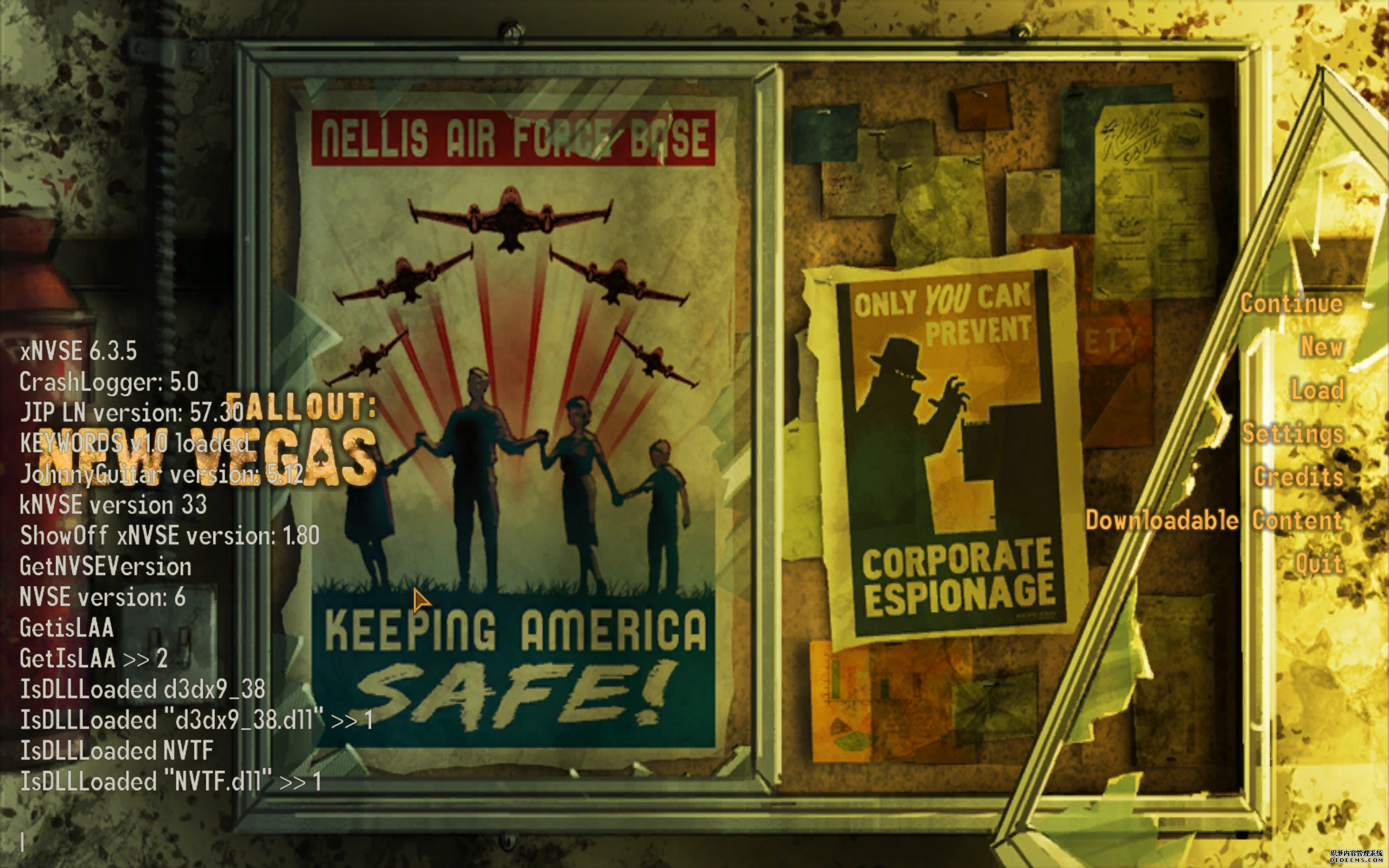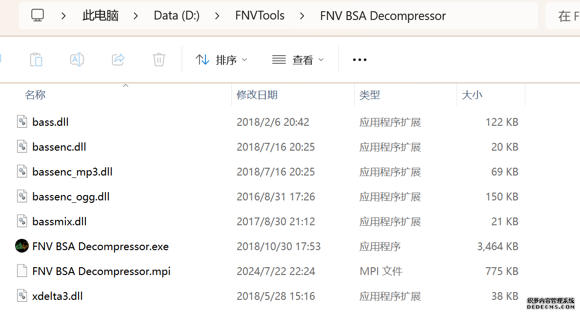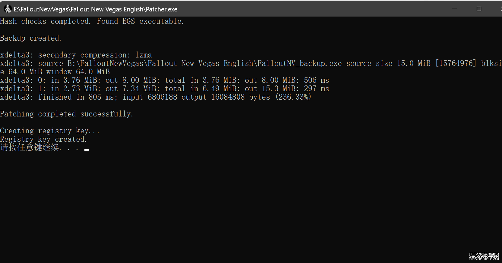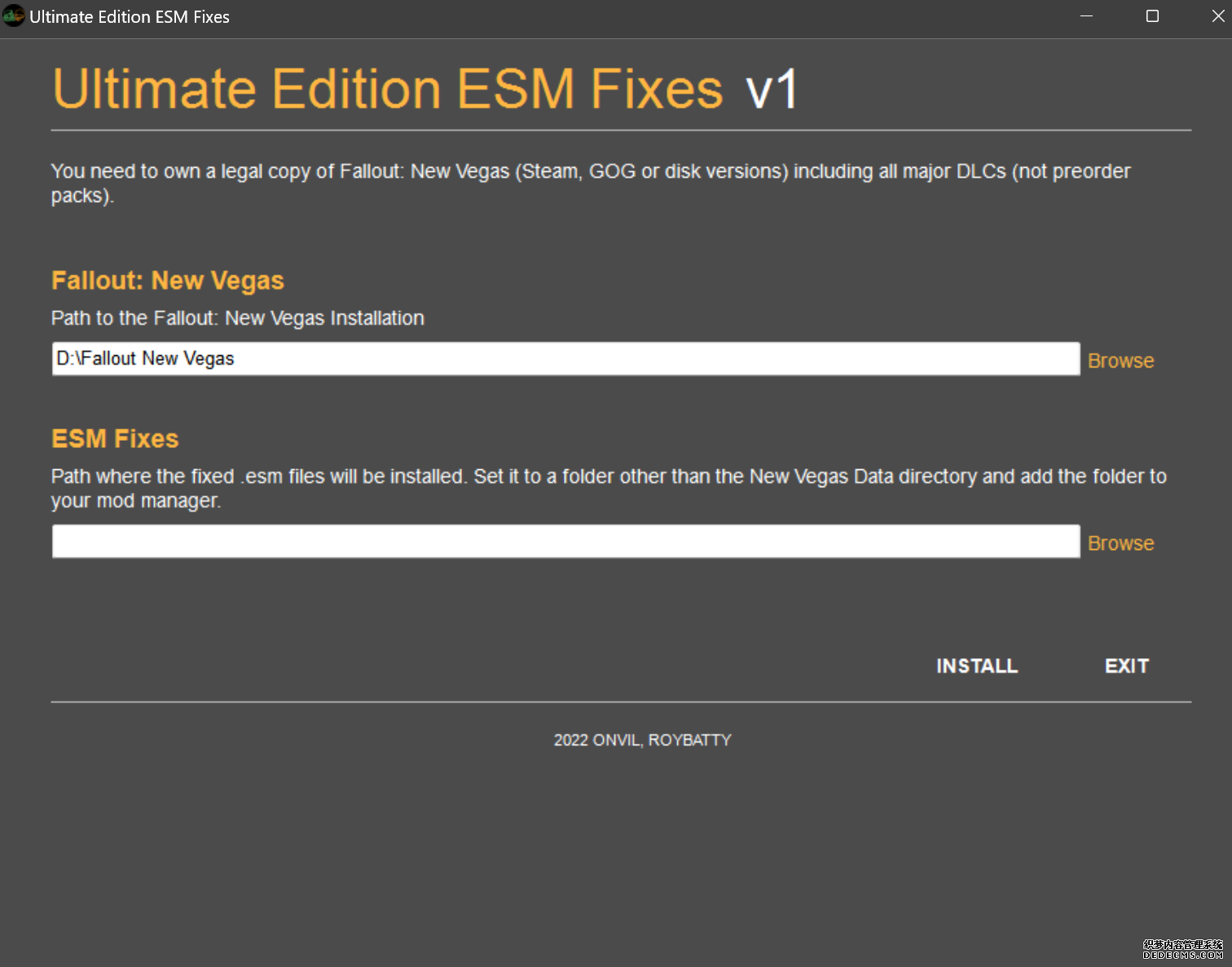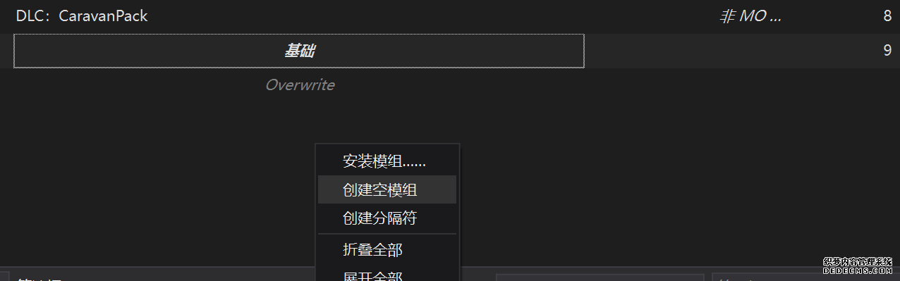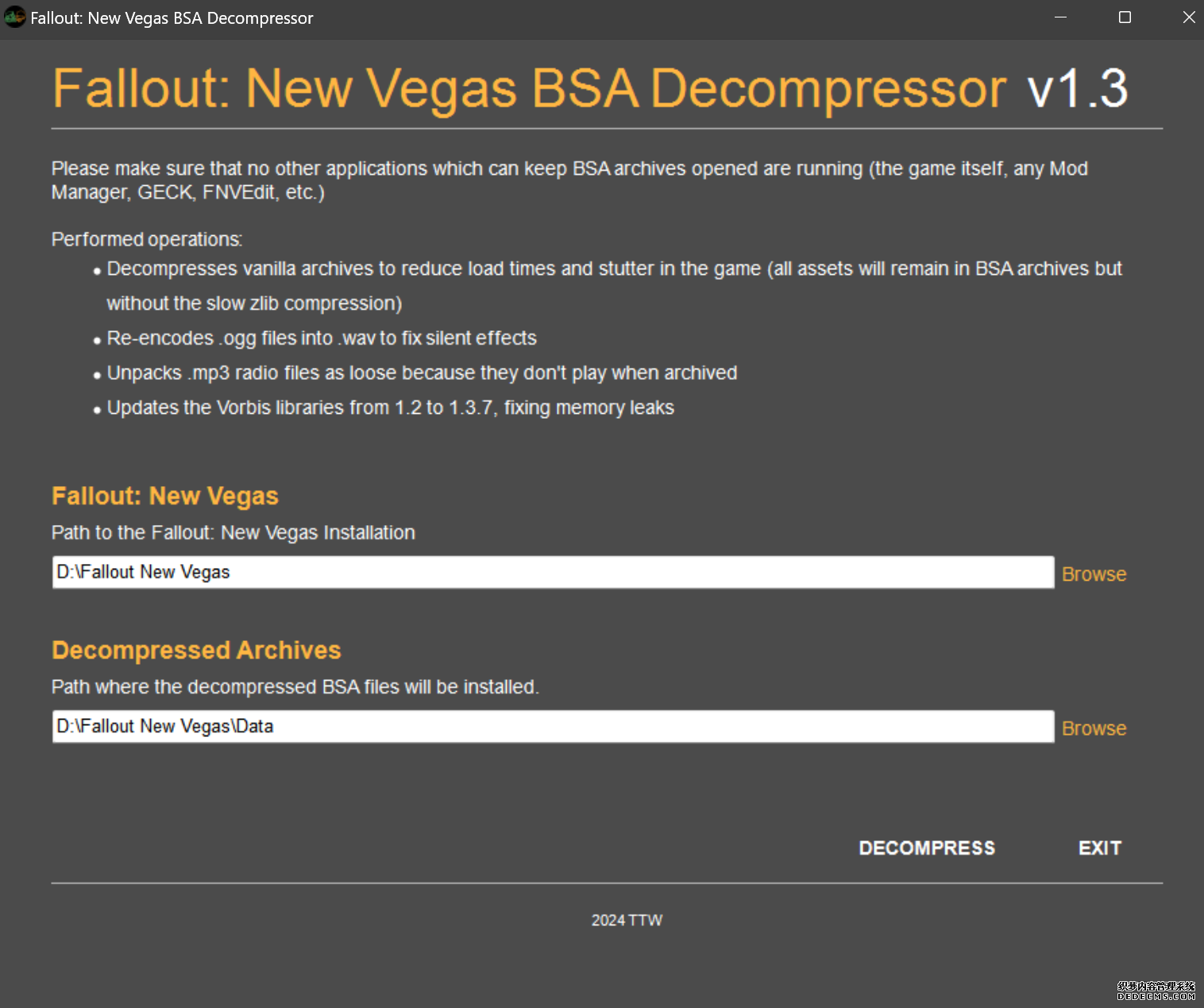 大多数mod使用MO2安装,少部分Mod(下面要安装的xNVSE、NVHR等)使用根目录安装,我们将首先进行根目录安装 ![]() MO2安装一般方法:点击MO2界面左上角第二个大按钮(图中被红圈圈中的按钮) ![]() 选择Mod的压缩包(此处以JIP LN NVSE插件的本体为例)并点击打开 ![]() 点击确定安装 ![]() 最后点击前面方框勾选即可 根目录安装一般方法:手动将文件复制到游戏根目录内[4] 首先安装的是xNVSE,即NVSE的最新版本,也是许多Mod正常运行所需的框架。 接下来正式开始安装,首先下载文件 原址: https://www.nexusmods.com/newvegas/mods/67883?tab=files 下载主文件:New Vegas Script Extender (NVSE) ![]() 下载完成后打开压缩包,此时应如图所示 ![]() 然后回到MO2,首先点击此处打开游戏文件夹 ![]() 游戏根目录文件夹应如图所示。(由于版本区别,部分文件略有不同属正常现象,只要看到FalloutNV.exe即代表正确) ![]() 将压缩包内所有内容(包括压缩包内的Data文件夹)拖动解压到根目录内,如图所示(图没截全)。 GOG、Epic等非Steam版也需要nvse_steam_loader.dll xNVSE安装完毕,这也是根目录安装Mod的一般方法 ![]() 重新启动MO2时,在启动选项里可能会出现NVSE,但按照本指南正确配置将不使用此选项启动游戏,后续启动游戏仍使用New Vegas启动选项(完成基础部分之前请不要启动游戏!!!) 接下来安装4GB补丁,原本新维加斯的exe只能调用2GB内存,使用这个补丁后能将调用内存扩充到4GB,减少闪退卡顿,并且和JIP配合可以做到直接用FalloutNV.exe挂载NVSE启动 4GB补丁分为两种,一种仅供Steam版和GOG版使用(GOG版也需要4GB补丁),一种仅供Epic版使用 两种补丁不能混用,也不能用在错误的游戏版本上,请注意选择正确的4GB补丁!!! Steam版、GOG版(Epic平台的游戏请直接跳到下方Epic版): 原址: https://www.nexusmods.com/newvegas/mods/62552?tab=files 下载主文件:4GB Patcher(第一个) ![]() 打开下载的文件,将FNVpatch.exe解压到游戏根目录,并以管理员身份运行 ![]() 此时应弹出如图所示的窗口,按任意键继续 如未提示"FalloutNV.exe patched!" 则为4GB补丁和游戏exe不匹配导致安装失败,请检查选择的4GB补丁版本、游戏exe是否为原版 ![]() 查看根目录,应出现FalloutNV_backup.exe,此时针对Steam版和GOG版的4GB补丁安装成功 Epic版(Steam版和GOG版请跳过此部分): 原址: https://www.nexusmods.com/newvegas/mods/81281?tab=files 下载主文件:Epic Games Patcher ![]() 打开下载的文件,将其中内容解压到游戏根目录(FalloutNV.exe所在处),并以管理员身份运行Patcher.exe ![]() 此时应弹出如图所示的窗口,按任意键继续 如未提示"Patching completed successfully"和"Registry key created"则为4GB补丁和游戏exe不匹配导致安装失败,请检查选择的4GB补丁版本、游戏exe是否为原版 ![]() 查看根目录,应出现FalloutNV_backup.exe,此时针对Epic版的4GB补丁安装成功 按照不同游戏版本安装完4GB补丁后继续安装其他基础mod,首先是FNV BSA Decompressor,即针对新维加斯的BSA解压器,这个Mod将原本被压缩的游戏文件解压缩并重新打包,提高读取速度、修复声音Bug 打算自行安装TTW的不需要进行此步骤 首先下载该Mod 原址: https://www.nexusmods.com/newvegas/mods/65854?tab=files 下载主文件:FNV BSA Decompressor ![]() 下载后不要直接使用MO2安装,而是将压缩包里面的内容解压到C盘、MO2实例和游戏目录之外的一个单独空文件夹内,如图所示 ![]() 双击FNV BSA Decompressor.exe启动,应弹出如图所示的窗口 ![]() 点击上面一栏的Browse,并选择游戏根目录文件夹 ![]() 再点击下面一栏的Browse,选择游戏根目录里的的Data文件夹 ![]() 选择完成后点击下方DECOMPRESS字样开始解压 ![]() 此时应弹出如图所示的进度条,等待读条完成 ![]() 读条完成后窗口应如图所示,点击EXIT关闭,FNV BSA Decompressor安装完成 接下来安装汉化ESM修复,通过清理游戏本体的ESM提高游戏性能、修复错误 打算自行安装TTW的不需要进行此步骤 ![]() 首先,为了方便日后管理Mod,需要创建一个分隔符来标注Mod类型。 右键MO2左侧的空白位置,选择创建分隔符 ![]() 将分隔符命名为"基础"并确定 ![]() 效果如图所示 ![]() 然后右键-创建空模组 ![]() 命名为终极版ESM修复,并确定 ![]() 效果如图所示 随后下载终极版ESM修复的mod文件 原址: Ultimate Edition ESM Fixes 下载主文件:Ultimate Edition ESM Fixes ![]() 和新维加斯BSA解压器一样,解压到C盘、MO2实例和游戏目录之外的一个单独空文件夹内,如图所示 ![]() 打开Installer.exe,将弹出如图所示的窗口 ![]() 点击上面的Browse,选择游戏根目录 ![]() 回到MO2,右键刚才新创建的终极版ESM修复,选择在资源管理器中打开 ![]() 复制新弹出窗口的这一地址 ![]() 再回到终极版ESM修复的窗口,点击第二个Browse,并将地址粘贴在上方地址栏内,点击回车 ![]() 确认已经选中终极版ESM修复文件夹,再点击选择文件夹 ![]() 此时终极版ESM修复窗口应如图所示,点击INSTALL开始安装 ![]() 等待读条结束 ![]() 随后终极版ESM修复窗口应如图所示,点击EXIT退出 ![]() 回到MO2,勾选终极版ESM修复并按F5刷新,就能看到这一mod已经覆盖了dlc的esm插件,说明终极版esm修复安装成功 NVHR重写了新维加斯内存处理所调用的的堆,提高游戏内存使用效率,有助于改善各种跳出卡顿问题。 原址: New Vegas Heap Replacer 下载主文件:NVHR ![]() 下载完成后,将压缩包内文件解压到游戏根目录,如图所示,NVHR安装完成 ![]() 今后在启动游戏时会弹出如图所示的窗口,这是正常现象 根据软硬件及mod环境的不同,最新版本的NVHR可能