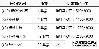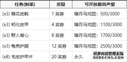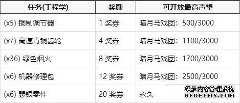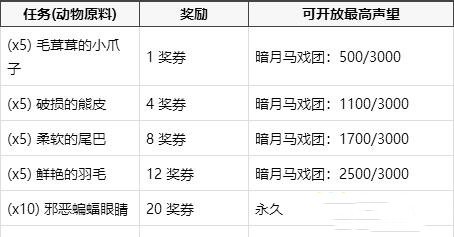 魔兽世界怀旧服暗月马戏团奖券可兑换什么?暗月马戏团即将在魔兽世界怀旧服第三阶段上线,其中有着奖券系统,玩家可以通过奖券来获取相应的奖励,感兴趣的玩家快来了解一下吧。 暗月马戏团奖券: 通过完成一些帮助暗月马戏团的商贩收集所需物品的任务以及特有的专业技能任务,你可以得到一定的奖励,并在暗月马戏团里兑换到两个稀有项链,以及其他一些小奖励。 目前这里不能取得的专业技能任务有:附魔,炼金术,草药学,裁缝,剥皮和采矿。 如果没有相应的专业技能,你无法取得暗月马戏团里的专业技能任务。 奖券是 灵魂绑定 的,所以你无法交易它们。 所有人均可以做收集物品的任务。你可以积攒着赢得的奖券,每一组奖券可堆垒到200张。 完成每项任务都将得到 100点暗月马戏团声望 。随着你的阵营声望渐涨,低于你声望等级的任务也将不再出现了。 等级1任务 - 当暗月马戏团声望达到 500/3000 后不再出现。(完成5个任务) 等级2任务 - 当暗月马戏团声望达到 1100/3000 后不再出现。(完成11个任务) 等级3任务 - 当暗月马戏团声望达到 1700/3000 后不再出现。(完成17个任务) 等级4任务 - 当暗月马戏团声望达到 2500/3000 后不再出现。(完成26个任务,人类只须完成23个) 等级5任务 - 永久开放。
